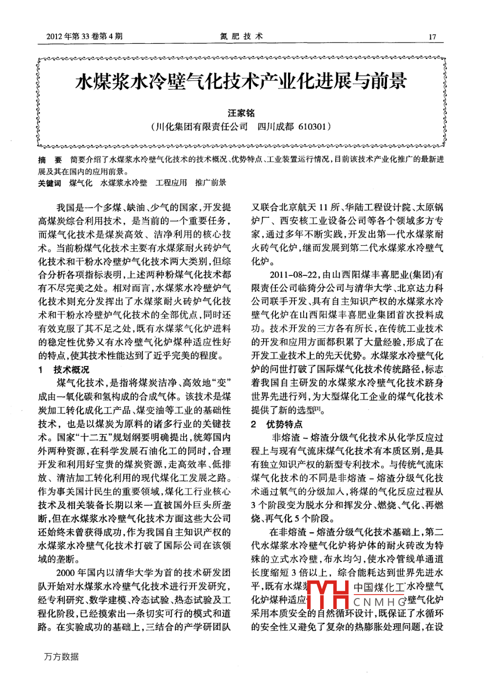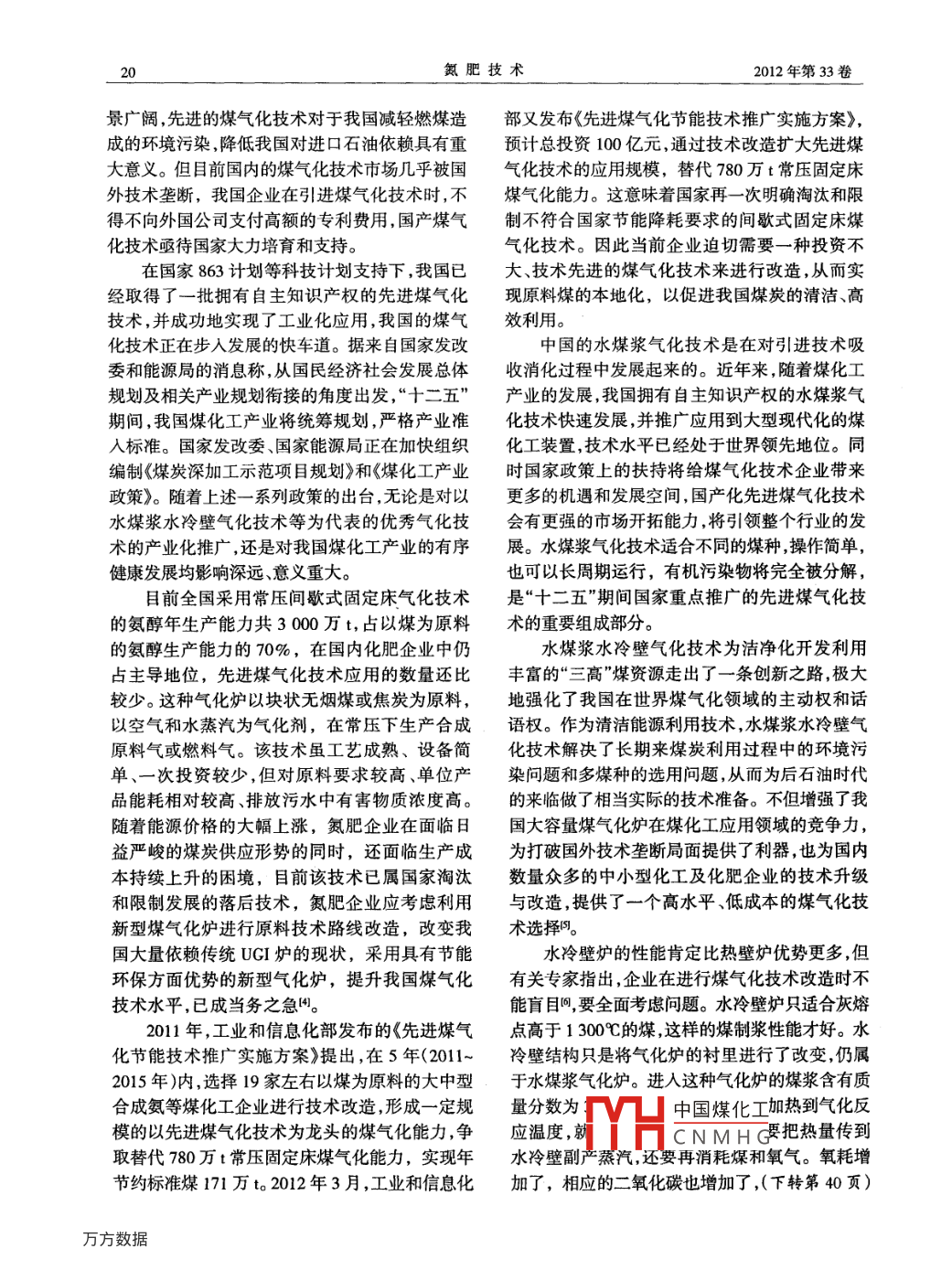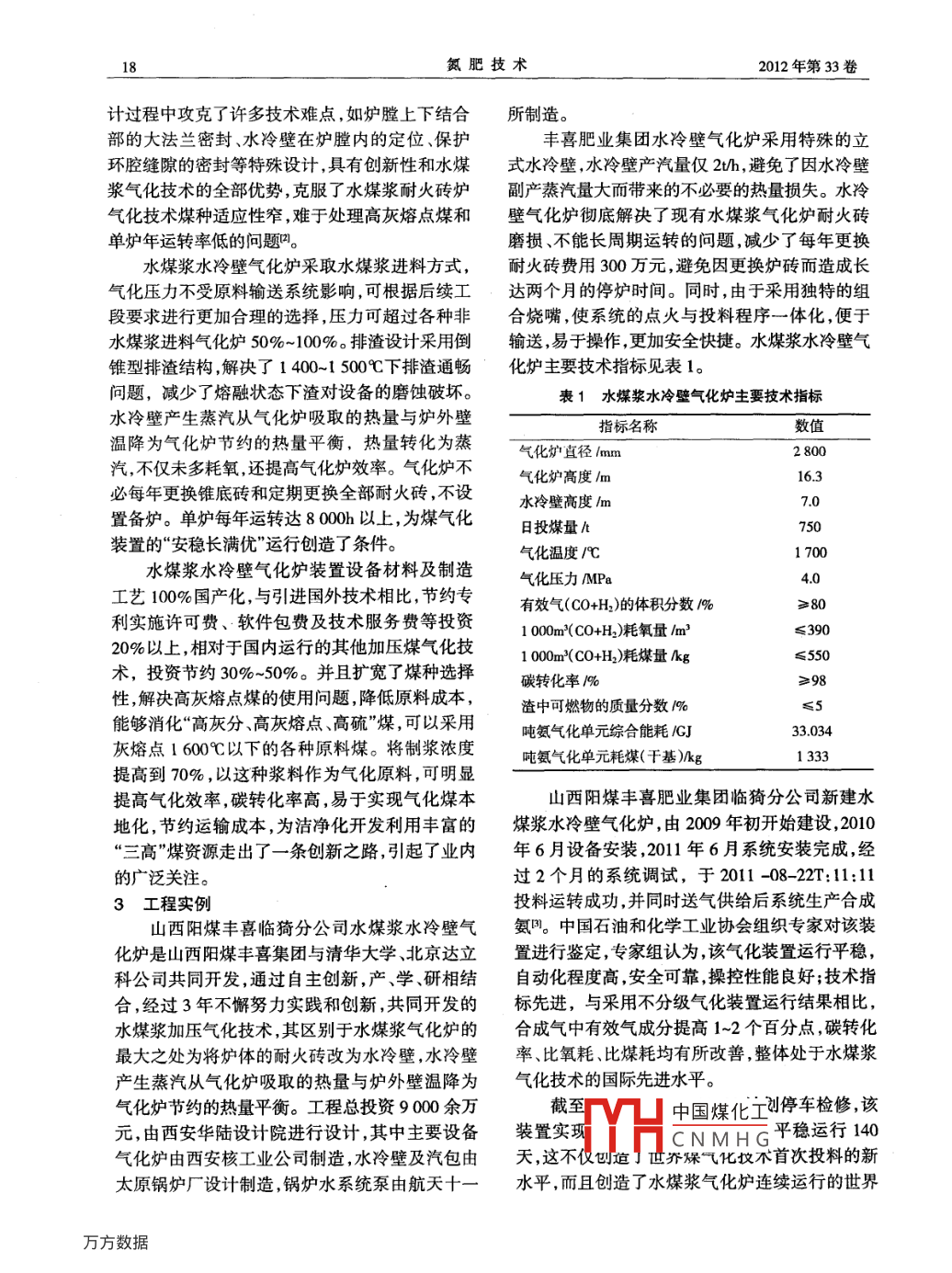 2012年第33卷第4期氮肥技術(shù)/esesesesesesescsesescesescsesesessccccscscs水煤漿水冷壁氣化技術(shù)產(chǎn)業(yè)化進(jìn)展與前景汪家銘(川化集團(tuán)有限責(zé)任公司四川成都610301)摘要簡(jiǎn)要介紹了水煤漿水冷壁氣化技術(shù)的技術(shù)概況優(yōu)勢(shì)特點(diǎn)、工業(yè)裝置運(yùn)行情況,目前該技術(shù)產(chǎn)業(yè)化推廣的最新進(jìn)展及其在國(guó)內(nèi)的應(yīng)用前景。關(guān)鍵詞煤氣化水煤漿水冷壁工程應(yīng)用推廣前景我國(guó)是一個(gè)多煤、缺油、少氣的國(guó)家,開發(fā)提又聯(lián)合北京航天11所、華陸工程設(shè)計(jì)院、太原鍋高煤炭綜合利用技術(shù),是當(dāng)前的一個(gè)重要任務(wù),爐廠、西安核工業(yè)設(shè)備公司等各個(gè)領(lǐng)域多方專而煤氣化技術(shù)是煤炭高效、潔凈利用的核心技家,通過(guò)多年不斷實(shí)踐,開發(fā)出第一代水煤漿耐術(shù)。當(dāng)前粉煤氣化技術(shù)主要有水煤漿耐火磚爐氣火磚氣化爐,繼而發(fā)展到第二代水煤漿水冷壁氣化技術(shù)和干粉水冷壁爐氣化技術(shù)兩大類別,但綜化爐合分析各項(xiàng)指標(biāo)表明,上述兩種粉煤氣化技術(shù)都2011-08-22,由山西陽(yáng)煤豐喜肥業(yè)(集團(tuán))有有不盡完美之處。相對(duì)而言,水煤漿水冷壁爐氣限責(zé)任公司臨猗分公司與清華大學(xué)、北京達(dá)力科化技術(shù)則充分發(fā)揮出了水煤漿耐火磚爐氣化技公司聯(lián)手開發(fā)、具有自主知識(shí)產(chǎn)權(quán)的水煤漿水冷術(shù)和干粉水冷壁爐氣化技術(shù)的全部?jī)?yōu)點(diǎn),同時(shí)還壁氣化爐在山西陽(yáng)煤豐喜肥業(yè)集團(tuán)首次投料成有效克服了其不足之處,既有水煤漿氣化爐進(jìn)料功。技術(shù)開發(fā)的三方各有所長(zhǎng),在傳統(tǒng)工業(yè)技術(shù)的穩(wěn)定性優(yōu)勢(shì)又有水冷壁氣化爐煤種適應(yīng)性好的開發(fā)和應(yīng)用方面都積累了大量經(jīng)驗(yàn),形成了在的特點(diǎn),使其技術(shù)性能達(dá)到了近乎完美的程度。開發(fā)工業(yè)技術(shù)上的先天優(yōu)勢(shì)。水煤漿水冷壁氣化1技術(shù)概況爐的問(wèn)世打破了國(guó)際煤氣化技術(shù)傳統(tǒng)路徑,標(biāo)志煤氣化技術(shù),是指將煤炭潔凈、高效地“變”著我國(guó)自主研發(fā)的水煤漿水冷壁氣化技術(shù)躋身成由一氧化碳和氫構(gòu)成的合成氣體。該技術(shù)是煤世界先進(jìn)行列,為大型煤化工企業(yè)的煤氣化技術(shù)炭加工轉(zhuǎn)化成化工產(chǎn)品、煤變油等工業(yè)的基礎(chǔ)性提供了新的選型技術(shù),也是以煤炭為原料的諸多行業(yè)的關(guān)鍵技2優(yōu)勢(shì)特點(diǎn)術(shù)。國(guó)家“十二五”規(guī)劃綱要明確提出,統(tǒng)籌國(guó)內(nèi)非熔渣-熔渣分級(jí)氣化技術(shù)從化學(xué)反應(yīng)過(guò)外兩種資源,在科學(xué)發(fā)展石油化工的同時(shí),合理程上與現(xiàn)有氣流床煤氣化技術(shù)有本質(zhì)區(qū)別,是具開發(fā)和利用好寶貴的煤炭資源,走高效率、低排有獨(dú)立知識(shí)產(chǎn)權(quán)的新型專利技術(shù)。與傳統(tǒng)氣流床放、清潔加工轉(zhuǎn)化利用的現(xiàn)代煤化工發(fā)展之路。煤氣化技術(shù)的不同是非熔渣-熔渣分級(jí)氣化技作為事關(guān)國(guó)計(jì)民生的重要領(lǐng)域,煤化工行業(yè)核心術(shù)通過(guò)氧氣的分級(jí)加人,將煤的氣化反應(yīng)過(guò)程從技術(shù)及相關(guān)裝備長(zhǎng)期以來(lái)一直被國(guó)外巨頭所壟3個(gè)階段變?yōu)槊撍趾蛽]發(fā)分、燃燒、氣化、再燃斷,但在水煤漿水冷壁氣化技術(shù)方面這些大公司燒、再氣化5個(gè)階段。還始終未曾獲得成功,作為我國(guó)自主知識(shí)產(chǎn)權(quán)的在非熔渣-熔渣分級(jí)氣化技術(shù)基礎(chǔ)上,第二水煤漿水冷壁氣化技術(shù)打破了國(guó)際公司在該領(lǐng)代水煤漿水冷壁氣化爐將爐體的耐火磚改為特域的壟斷。殊的立式水冷壁,布水均勻,使水冷管線單通道2000年國(guó)內(nèi)以清華大學(xué)為首的技術(shù)研發(fā)團(tuán)長(zhǎng)度縮短3倍以上,綜合能耗達(dá)到世界先進(jìn)水隊(duì)開始對(duì)水煤漿水冷壁氣化技術(shù)進(jìn)行開發(fā)研究,平既有水煤中國(guó)煤化工水冷壁氣經(jīng)專利研究、數(shù)學(xué)建模冷態(tài)試驗(yàn)、熱態(tài)試驗(yàn)及工化爐煤種適應(yīng)CNMHG壁氣化爐程化階段,已經(jīng)摸索出一條切實(shí)可行的模式和道采用本質(zhì)安全的自然循環(huán)設(shè)計(jì),既保證了水循環(huán)路。在實(shí)驗(yàn)成功的基礎(chǔ)上,三結(jié)合的產(chǎn)學(xué)研團(tuán)隊(duì)的安全性又避免了復(fù)雜的熱膨脹處理問(wèn)題,在設(shè)18氮肥技術(shù)2012年第33卷計(jì)過(guò)程中攻克了許多技術(shù)難點(diǎn),如爐膛上下結(jié)合所制造。部的大法蘭密封、水冷壁在爐膛內(nèi)的定位、保護(hù)豐喜肥業(yè)集團(tuán)水冷壁氣化爐采用特殊的立環(huán)腔縫隙的密封等特殊設(shè)計(jì),具有創(chuàng)新性和水煤式水冷壁,水冷壁產(chǎn)汽量?jī)H2h,避免了因水冷壁漿氣化技術(shù)的全部?jī)?yōu)勢(shì),克服了水煤漿耐火磚爐副產(chǎn)蒸汽量大而帶來(lái)的不必要的熱量損失。水冷氣化技術(shù)煤種適應(yīng)性窄,難于處理高灰熔點(diǎn)煤