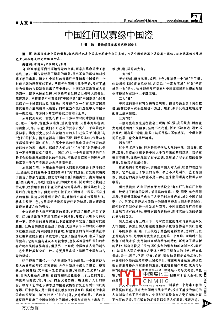 人文E-mail:zfsdzzs@126.comwww.zfsdzzs.com中國紅何以寡緣中國瓷口雷潔黃淮學院美術系藝設0704B摘要:瓷器代表著中國的形象,紅色同樣也是中國在世界舞臺上閃亮的??墒侵袊拇善髦惺菦]有中國紅。追溯瓷器的發(fā)展歷史貴、潤和祥是紅瓷的魁力所在關鍵詞:中國紅;中國陶瓷;寡緣自3000年前原商代原始青瓷的出現(xiàn)到辛亥革命后清王朝難,貴,潤祥的四大奇。壽終正寢,中國古瓷經(jīng)歷了微弱的萌芽,層出不窮的輝煌和對沒落王朝的殉葬。歷史對中國紅的青睞終于伴隨著中國最后一個無論配料,溫度掌握,成形,上色,都怎是一個“難”字了得封建王朝的沒落戛然而止。從道光年間鴉片戰(zhàn)爭開始沒有了盛紅瓷須經(jīng)1310度高溫燒制,古話說:“十窯九不成”,可謂“千窯世為依托的古瓷制造退出了歷史舞臺,中國紅終究沒有在古瓷難得一寶”是也。這樣即便沒有皇家對中國紅在民間出現(xiàn)的限制的潤體上留下永恒的足跡,可它稀有的足跡足以引得人們駐足,也使得民間在制作上步履維艱。流連忘返。同樣都是不可置疑的“中國創(chuàng)造”加“中國制造”;同都二為“貴記載了一個民族的歷史與發(fā)展;同樣都作為一個古老東方國度中國紅的制作材料為稀有金屬鉭。鉭價格甚至貴于黃金數(shù)的代表符合展現(xiàn)在世人眼前;同樣在當今流行總想中為中國爭倍故譽紅瓷用黃金燒制也不為過。想來,似乎只有這般境地才得一席之地。卻為何不知怎樣將此二物結合起來。配的上皇家擺放從商代到東漢,古瓷花費了一千多年的時間才掙脫原始形三為“潤”態(tài),此一千年中,古瓷多以暗黃,重灰色為主,且基本為單色調(diào)一般陶瓷在發(fā)光是往往會出現(xiàn)脆爍,強,亮的缺點,而紅瓷無圖案,花飾。畢竟,我們不可過高的要求古瓷在三千年前就大發(fā)光則是潤而不失溫和溫而不乏穩(wěn)重沉而不缺剔透,透而不放異彩。畢競歷史還沒有布置給當時的人們過多關于“審美”與少雅致,頗有柔中帶剛,剛柔并濟的品格。不禁感嘆,一個看似張“色彩”的任務。拋開瓷器與中國紅不說,即便只是紅,氣勢與態(tài)揚的色彩中竟會有此般境地度都遠弱于中國紅的紅,在那個悠遠的年代也只會在特定的場四為“祥合以特定的理由出現(xiàn)。那時的人們將“禮”與“美”劃的很遠,但紅中雖不乏飛揚,但亦是君子恢弘大氣的體現(xiàn)。對吉樣,寬又分不清界限究竟在哪里。中國紅,作為一個奔放而飛揚的存在厚,富貴,呂盛的體現(xiàn)史是中國人千百年來的夢寐以求。君子重是不會輕易出現(xiàn)在那遙遠的年代的。不論是貴族家中的陳列,還德而不避功,紅既體現(xiàn)出了君子之德,又彰顯了君子所望的美好是墓室中千百年不愿退去色澤的陪葬品境界,自是君子收藏佳品。三國至隋,不知是戰(zhàn)爭使得人們的哀嘆拂去了厚厚的塵看來是四個簡單的字,實則是中國人對人品,社會的理想與土,還是社會的發(fā)展不自覺的推動了“美”的進程,古瓷的發(fā)展終需求。它早巳超出了審美的范疇,早已不只是制作工藝上的困于出現(xiàn)了體系與派別。如北方邢窯白瓷「類銀類雪」南方越窯青難。而是它的高貴與厚重不是一種心血來潮的嗜美之情可以承瓷「類玉類冰」。形成「北白南青的兩大窯系。同時唐代還燒制出載的。雪花釉、紋胎釉和釉下彩瓷及貼花裝飾等品種。但觀其色彩,仍明代從洪武35年開始在景德鎮(zhèn)設立“御窯廠”,御窯廠似導是以白,青色為主。但此時我們似乎吏可理解這一現(xiàn)象,不必過師一般促進了民窯的發(fā)展。景德鎮(zhèn)的青花、白瓷、彩瓷、單色釉等多的解釋,從建安風骨到正始之風,曹植嘆出落觼與孤鷲齊飛,品種,使得景德鎮(zhèn)似乎成為了古瓷的標志性產(chǎn)地,成為全國的制秋水共長天一色,也終是無法挽回孤苦終老的結局。歷史還沒做瓷中心。但不知是否是八股取士的瓶頸已經(jīng)深入到古瓷的制作,好迎接繁盛之紅的到來即使是T藝制作的進一步發(fā)展與完善,中國紅依然沒有在瓷器也許這便是大唐不可磨滅的盛績它終結了很多,開啟了更上展現(xiàn)它該有的風采,獲得它該有的地位,即使它所代表的是如多。紅,雖還沒有孕育出濃盛的中國風骨,卻成了大唐不可磨滅此敦厚的含義。的一筆。賞李白的清月清酒也不妨在古瓷中發(fā)現(xiàn)了盛唐對紅的滿人雖在馬背上得天下,可對漢文化的繼承與發(fā)展是令漢迎接。但歷史的態(tài)度總是過于吝嗇,大唐兩百年年的時間不夠中人汗顏的,再加上滿人豁達的性格似乎更容易體會中國紅埋藏國紅破繭而出,特別到晚唐的衰敗封建制度的苛刻與繁瑣讓中了千年的期待,康、雍、干三代趨于鼎盛的瓷器發(fā)展,達到訂歷史國紅被緊緊的所在了皇城之中。它成了盛唐的靈魂,也成了皇家上的最高水平,是中國陶瓷發(fā)展史上的第二個高峰??滴鯐r不但的獨有。它的至盛與魂靈不可被褻瀆,皇權不可能允許他們的私恢復了明代永樂,宣德朝以來所有精品的特色,還創(chuàng)燒了很多新有產(chǎn)物在民間輕易出現(xiàn)。但從另一個角度,中國紅在古瓷的制作的品種郎窯還恢復了失傳200多年的制紅釉的燒制技術,郎窯工藝中是極其復雜的一種。這更是從客觀上掐斷了中國紅與古紅、缸紅入雨后春筍在占瓷體上吸引了所有人的H光。還有孔瓷的機緣雀綠、天蘭、灑蘭、仿定、豆青嬌黃、