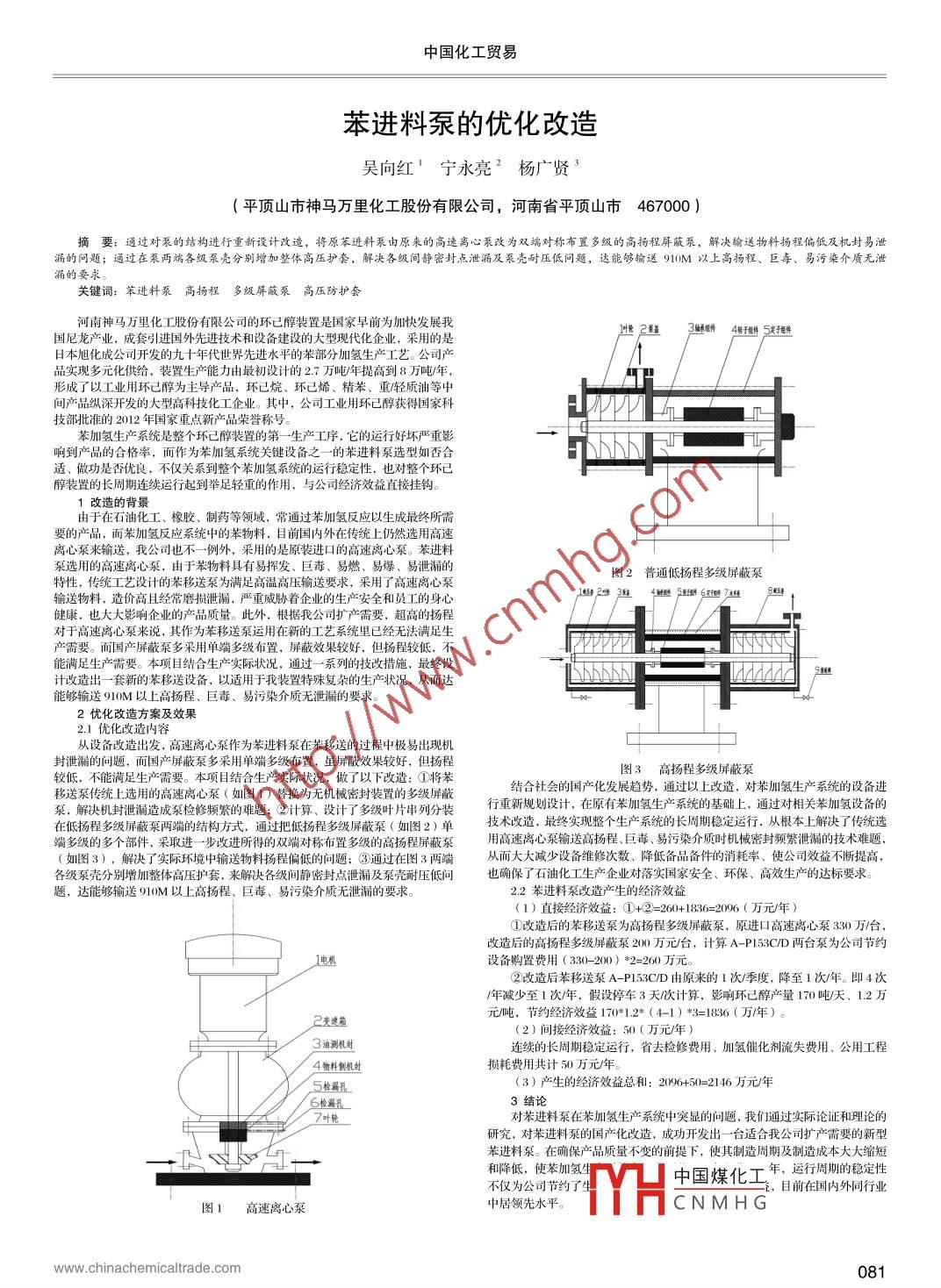 中國化工貿(mào)易苯進料泵的優(yōu)化改造吳向紅寧永亮2楊廣賢(平頂山市神馬萬里化工股份有限公司,河南省平頂山市467000)摘要:通過對泵的結(jié)構(gòu)進行重新設(shè)計改造,將原苯進料泵由原來的高速離心泵改為雙端對稱布置多級的高揚程屏蔽泵,解決輸送物料揚程偏低及機封易泄漏的問題;通過在泵兩端各級泵殼分別増加整體高壓護套,解決各級間諍密封點泄漏及泵殼耐壓低問題,達能夠輸送刂1M以上高揚程、巨毒、易污染介質(zhì)無泄漏的要求。關(guān)鍵詞:苯進料泵高揚程多級屏蔽泵高壓防護套河南神馬萬里化工股份有限公司的環(huán)已醇裝置是國家早前為加快發(fā)展我系組件4子繼件5定子組件國尼龍產(chǎn)業(yè),成套引進國外先進技術(shù)和設(shè)備建設(shè)的大型現(xiàn)代化企業(yè),采用的是日本旭化成公司開發(fā)的九十年代世界先進水平的苯部分加氫生產(chǎn)工藝。公司產(chǎn)品實現(xiàn)多元化供給,裝置生產(chǎn)能力由最初設(shè)計的2.7萬噸/年提高到8萬噸形成了以工業(yè)用環(huán)己醇為主導(dǎo)產(chǎn)品,環(huán)己烷、環(huán)已烯、精苯、重輕質(zhì)油等中刂產(chǎn)品縱深開發(fā)的大型高科技化工企業(yè)。其中,公司工業(yè)用環(huán)己醇獲得國家科技部批準(zhǔn)的2012年國家重點新產(chǎn)品榮譽稱號苯加氫生產(chǎn)系統(tǒng)是整個環(huán)己醇裝置的第一生產(chǎn)工序,它的運行好壞嚴(yán)重影響到產(chǎn)品的合格率,而作為苯加氫系統(tǒng)關(guān)鍵設(shè)備之一的苯進料泵選型如否合適、做功是否優(yōu)良,不僅關(guān)系到整個苯加氫系統(tǒng)的運行穩(wěn)定性,也對整個環(huán)已醇裝置的長周期連續(xù)運行起到舉足輕重的作用,與公司經(jīng)濟效益直接掛鉤。1改造的背景由于在石油化工、橡膠、制藥等領(lǐng)域,常通過苯加氫反應(yīng)以生成最終所需要的產(chǎn)品,而苯加氫反應(yīng)系統(tǒng)中的苯物料,目前國內(nèi)外在傳統(tǒng)上仍然選用高速離心泵來輸送,我公司也不一例外,采用的是原裝進口的高速離心泵。苯進料泵選用的高速離心泵,由于苯物料具有易揮發(fā)、巨毒、易燃、易爆、易泄漏的特性,傳統(tǒng)工藝設(shè)計的苯移送泵為滿足高溫高壓輸送要求,采用了高速離心泵圖2普通低揚程多級屏蔽泵輸送物料,造價高且經(jīng)常磨損泄漏,嚴(yán)重威脅著企業(yè)的生產(chǎn)安全和員工的身健康,也大大影響企業(yè)的產(chǎn)品質(zhì)量。此外,根據(jù)我公司擴產(chǎn)需要,超高的揚程對于高速離心泵來說,其作為苯移送泵運用在新的工藝系統(tǒng)里已經(jīng)無法滿足生產(chǎn)需要。而國產(chǎn)屏蔽泵多采用單端多級布置,屏蔽效果較好,但揚程較低,不能滿足生產(chǎn)需要。本項目結(jié)合生產(chǎn)實際狀況,通過一系列的技改措施,最終設(shè)十改造出一套新的苯移送設(shè)備,以適用于我裝置特殊復(fù)雜的生產(chǎn)狀況,從而達能夠輸送9l0M以上高揚程、巨毒、易污染介質(zhì)無泄漏的要求2優(yōu)化改造方案及效果2I優(yōu)化改造內(nèi)容從設(shè)備改造出發(fā),高速離心泵作為苯進料泵在苯移送的過程中極易出現(xiàn)機封泄漏的問題,而國產(chǎn)屏蔽泵多采用單端多級布置,雖屏蔽效果較好,但揚程較低,不能滿足生產(chǎn)需要。本項目結(jié)合生產(chǎn)實際狀況,做了以下改造:①將苯圖3高揚程多級屏蔽泵移送泵傳統(tǒng)上選用的高速離心泵(如圖1)替換為無機械密封裝置的多級屏蔽結(jié)合社會的國產(chǎn)化發(fā)展趨勢,通過以上改造,對苯加氫生產(chǎn)系統(tǒng)的設(shè)備進泵,解決機封泄漏造成泵檢修頻繁的難題;②計算、設(shè)計了多級葉片串列分裝行重新規(guī)劃設(shè)計,在原有苯加氫生產(chǎn)系統(tǒng)的基礎(chǔ)上,通過對相關(guān)苯加氫設(shè)備的在低揚程多級屏蔽泵兩端的結(jié)構(gòu)方式,通過把低楊程多級屏技術(shù)改造,最終實現(xiàn)整個生產(chǎn)系統(tǒng)的長周期穩(wěn)定運行,從根本上解決了傳統(tǒng)選端多級的多個部件,采取進一步改進所得的雙端對稱布置多級的高揚程屏蔽泵用高速離心泵輸送高揚程、巨毒、易污染介質(zhì)時機楲密封頻繁泄漏的技術(shù)難題(如圖3),解決了實際環(huán)境中輸送物料揚程偏低的問題;③通過在圖3兩端從而大大減少設(shè)備維修次數(shù)、降低備品備件的消耗率、使公司效益不斷提高各級泵殼分別増加整體高壓護套,來解決各級間靜密封點泄漏及泵殼耐壓低問也確保了石油化工生產(chǎn)企業(yè)對落實國家安全、環(huán)保、高效生產(chǎn)的達標(biāo)要求。題,達能夠輸送910M以上高揚程、巨毒、易污染介質(zhì)無泄漏的要求22苯進料泵改造產(chǎn)生的經(jīng)濟效益(1)直接經(jīng)濟效益:①+②=260+1836=2096(萬元/年)①改造后的苯移送泵為高揚程多級屏蔽泵,原進口高速離心泵330萬冶臺改造后的高揚程多級屏蔽泵200萬元冶臺,計算A-Pl53CD兩臺泵為公司節(jié)約設(shè)備購置費用(330-200)*2=260萬元。②改造后苯移送泵A-P153CD由原來的1次季度,降至1次/。即4次/年減少至1次年,假設(shè)停車3天次計算,影響環(huán)已醇產(chǎn)量170噸厭、1.2萬元聞噸,節(jié)約經(jīng)濟效益170*1.2*(4-1)*3=1836(萬庳連續(xù)的長周期穩(wěn)定運行,省去檢修費用、加氫催化劑流失費用、公用工程4物料側(cè)機