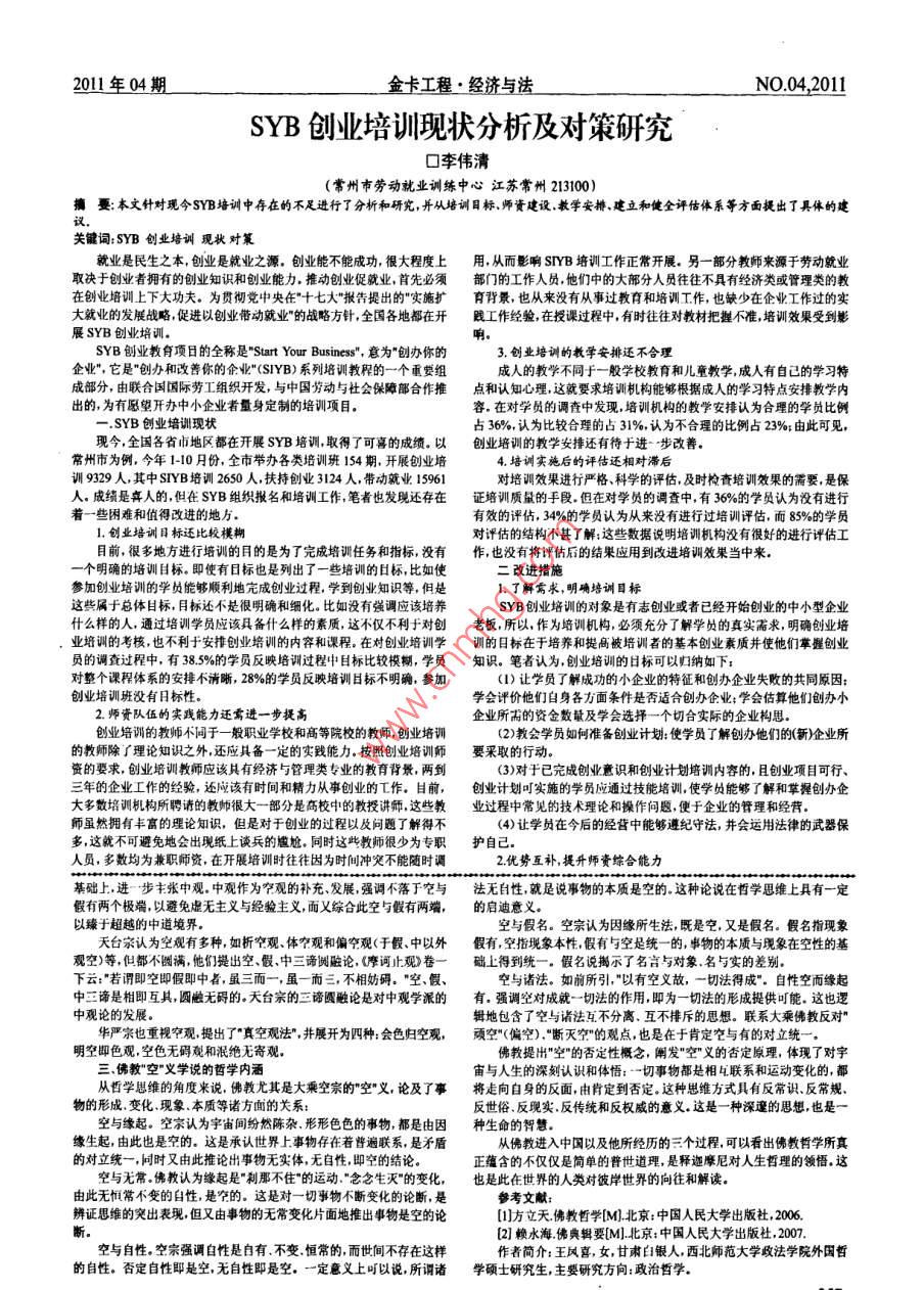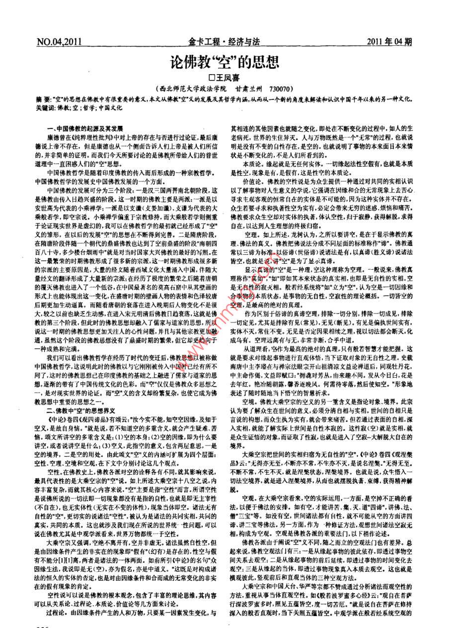 NO.04,20l1金卡工程·經(jīng)濟與法2011年04期論佛教空”的思想口王鳳喜(西北師范大學政法學院甘肅蘭州730070)摘要:“空”的思想在佛教中有很重要的意義本文從佛教”空”義的發(fā)展及其哲學內(nèi)涵從而從一個新的角度來解讀和認識中國千年以來的另一種文化關鍵詞:佛教;空;哲學;中國文化中國佛教的起源及其發(fā)展其相連的其他因素也就隨之變化,即處在不斷變化的過程中,如人的生康德曾在《純粹理性批判》中對上帝的存在與否進行過論證,最后康老病死,世界的生住異滅。人與萬物既然是一個”無常的過程,也就說德說上帝不存在,但是康德也從一個側面告訴人們上帝是被人們所信明是沒有不變的自性存在,是空的。也就說明了事物的本來面目本來情的,并非簡單的證明。而我們今天所要討論的是佛教所帶給人們的普世狀是不斷變化的,不是人們所看到的道理中一直困感人們的空"思想本質論。緣起就是無任何實體。一切緣起法性空假有也就是本質中國佛教哲學是隨著印度佛教的傳入而后形成的一種宗教哲學,是性空,現(xiàn)象是有,是假有,這是性空的本質論中國佛教哲學的發(fā)展史中國佛教發(fā)展的一個方面價值論。佛教的空性說是為眾生提供一種通過對共同的實相認識中國佛教的發(fā)展可分為三個階段:一是漢三國兩畀南北朝階段,這以了解事物對人生意義的學說它強調(diào)在因緣和合的無?,F(xiàn)象上去苦心是佛教由傳入日趨興盛的階段,這一時期的佛教主要是兩派:派是以尋求主觀客觀的恒常自在的實體是不可能的因為這種實體并不存在安世高為代表的小乘禪學:一派是以支謙(攴婁加讖).攴謙為代表的大眾生若要尋求和執(zhí)著性空為實有,必定會帶來無窮的迷惑煩惱和痛苦乘般若學,即空宗說。小乘禪學偏重于宗教修持,而大乘般若學則側重佛教要求眾生空卻對實體的執(zhí)著,體認空性,歸于寂靜,獲得解脫,求得于論證現(xiàn)實世界是虛幻的,我可以在佛教哲學的最初就己經(jīng)形成了空”自在,以達到人生理想的終極歸宿義的雛形,在以后的發(fā)展空的思想在不斷得到完善。二是隋唐階段空理。如上所述,龍樹認為,之所以要講空,是在于顯示佛教的真在隋唐階段伴隨一個朝代的鼎盛佛教也達到了空前鼎盛的階段“南朝四理、佛法的真義,佛教把佛說法分成不同層面的標準稱作”諦”。佛教通百八十寺,多少樓臺煙雨中就是對當時因家大興佛教的最好的寫照在常以三諦為標準,以俗諦(世俗諦)說諸法是有以真諦(勝義諦)說諸法這一最繁榮的時期佛教形成了很多新的宗派這一時期佛教形成很多新皆空,也就是說,講空"是為了顯小真諦的宗派的主要原因是,大量的經(jīng)文隨著西域文化大量涌入中國,伴隨大顯小真諦的空"是一種理,空這種理稱為空理。一般說來,佛教真量經(jīng)文的翻譯形成了大量新的宗派在經(jīng)歷了極度的繁榮之后隨若唐朝理稱作真如”,“如即如其本來狀態(tài)的真實相,也即是無自性的實相??盏母矞绶鸾桃策M入了一個低谷,在中國最著名的莫高石窟中從其壁畫的是無白性的寂滅相。般若經(jīng)系統(tǒng)將”如"立為空”認為空是一切因緣和形式上也能體現(xiàn)出這一變化,在盛唐時期的壁畫人物的表情和色澤較唐合事物的本質狀態(tài),是事物的無自性,空寂性的理論概括,一切皆空的后期吏加生動通真,而隨著唐朝的衰落在進入晚期后人物變化不是很空理,是最高的絕對的真理大,較之以前也缺乏生動感在進入末元明清后佛教趨衰落,這就是佛作為區(qū)別于俗諦的真諦空理,排除一切分別,排除一切成見,排除教的第三個階段,但此時的佛教思想?yún)s融入了儒家與道家的思想,所以一切定見,尤其是排除有見(常見),無見(斷見),有見是偏執(zhí)世間實有說這一時期的佛教思想更加關注人的心性問題,并與其他宗教更加融實體不滅,常住不變。無見是否定因果相續(xù)之理視以切法都會斷滅化通,雖然這個階段的佛教思想沒有了鼎盛時期的繁榮但它卻更趨向于成烏有空理遠離有與無,非常非斷,合乎中道一種成熟和完滿。從道理看,空作為最高的絕對的真理,只有般若智慧才能把捏。這我們可以看出佛教哲學在經(jīng)歷了時代的變遷后,佛教思想以被稱做就是要求對緣起事物進行直觀體悟,當下證取刈象的無自性之理。史載中國佛教哲學這說明此時的佛教以與它剛剛被傳入中國時已經(jīng)有所不南唐中主李璟在與禪宗法眼宗開山祖清涼文益論禪道后,同觀牡丹花同了,這時的佛教思想已在印度佛教的基礎之上融進了儒家與道家的思中主命作偈文益即賦口:“擁魂對芳叢,由來趣不同。發(fā)從今日白,花是想逐漸的帶有了中國傳統(tǒng)文化的色彩。而空僅僅是佛教眾多思想之去年紅。艷冶隨朝露,馨香逐晚風。何需待零落然后使知空。形象地,是對現(xiàn)實世界的論證。而空義的含義卻紛繁復雜,也使它成為佛表述了隨時隨地當下悟空的智慧祈求教思想中重要的思想之空境。佛教大乘空宗的空義的另一重含義是指論對象境界。此宗二佛教中"空"的思想界義認為要∫解眾生在世間的意義,必須分清自相與實相。世間的自相只是《中論》卷四《觀四諦品》有頌云:“汝今實不能知空空因緣,及知于言說的構想,而眾生執(zhí)為實有,就會帶來痛苦,但若通過表面的自相深空義,是故自身惱?!本褪钦f,若不知道空的多