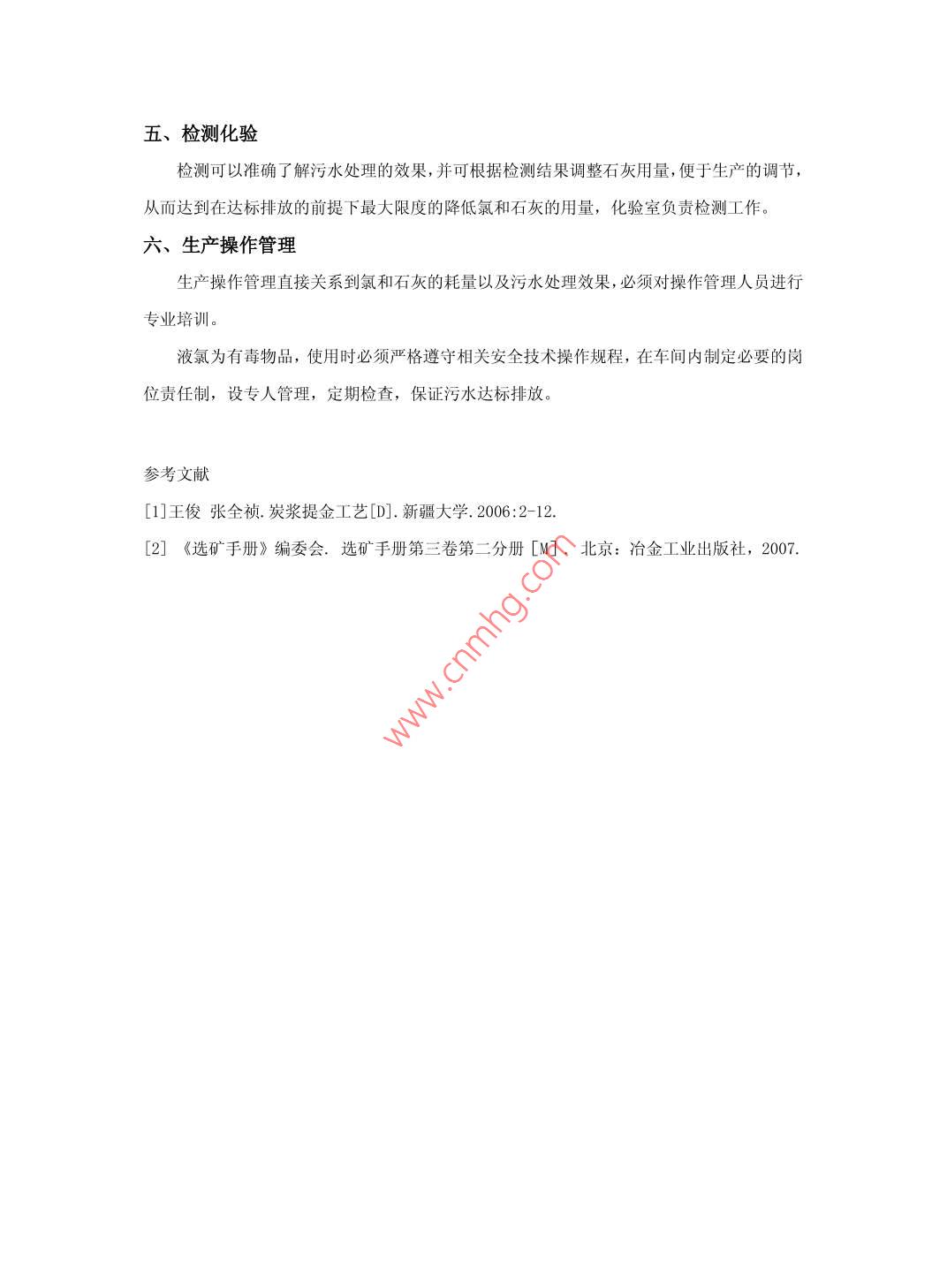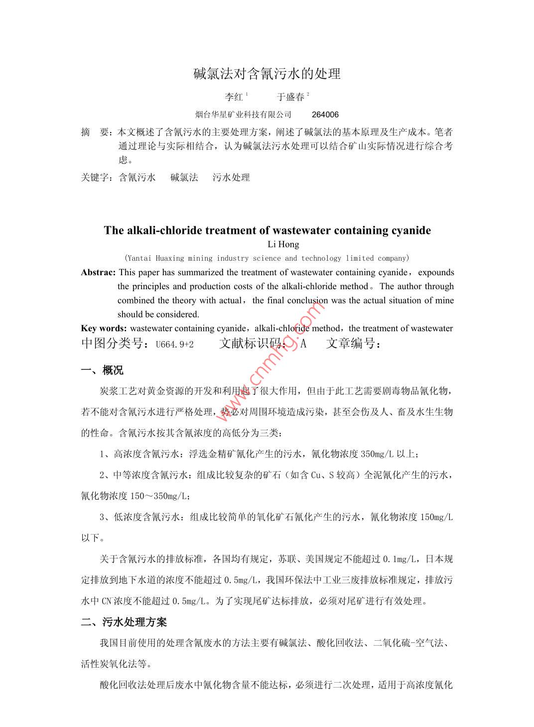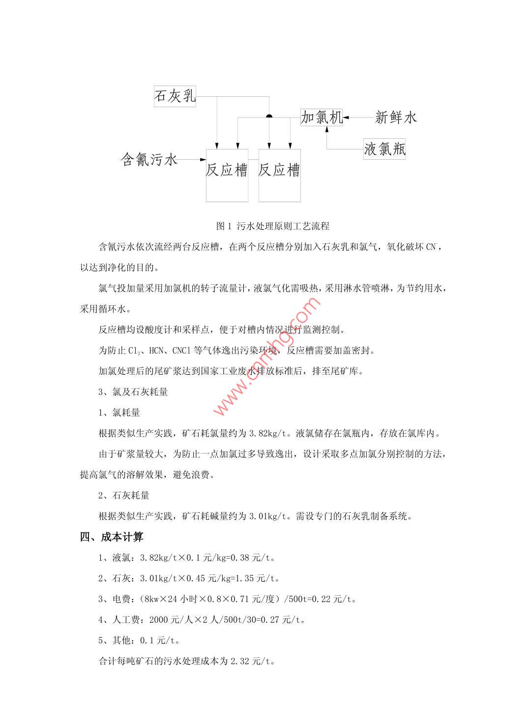 堿氯法對(duì)含氰污水的處理李紅于盛春2煙臺(tái)華星礦業(yè)科技有限公司264006摘要:本文概述了含氰污水的主要處理方案,闡述了堿氯法的基本原理及生產(chǎn)成本。筆者通過(guò)理論與實(shí)際相結(jié)合,認(rèn)為堿氯法污水處理可以結(jié)合礦山實(shí)際情況進(jìn)行綜合考關(guān)鍵字:含氰污水堿氯法 污水處理The alkali-chloride treatment of wastewater containing cyanideLi Hong(Yantai Huaxing mining industry science and technology 1 imited company)Abstrac: This paper has summarized the treatment of wastewater containing cyanide, expoundsthe principles and production costs of the alkali-chloride method。The author throughcombined the theory with actual, the final conclusion was the actual situation of mineshould be considered.Key words: wastewater containing cyanide,alkali-chloride method, the treatment of wastewater中圖分類號(hào): U664.9+2 文獻(xiàn)標(biāo)識(shí)碼: A文 章編號(hào):一、概況炭漿工藝對(duì)黃金資源的開(kāi)發(fā)和利用起了很大作用,但由于此工藝需要?jiǎng)《疚锲非杌?,若不能?duì)含氰污水進(jìn)行嚴(yán)格處理,勢(shì)必對(duì)周?chē)h(huán)境造成污染,甚至?xí)叭恕⑿蠹八锏男悦?。含氰污水按其含氰濃度的高低分為三?1、高濃度含氰污水:浮選金精礦氰化產(chǎn)生的污水,氰化物濃度350mg/L以上;2、中等濃度含氰污水:組成比較復(fù)雜的礦石(如含Cu、S較高)全泥氰化產(chǎn)生的污水,氰化物濃度150~350mg/L;3、低濃度含氰污水:組成比較簡(jiǎn)單的氧化礦石氰化產(chǎn)生的污水,氰化物濃度150mg/L以下。關(guān)于含氰污水的排放標(biāo)準(zhǔn),各國(guó)均有規(guī)定,蘇聯(lián)、美國(guó)規(guī)定不能超過(guò)0. 1mg/L,日本規(guī)定排放到地”下水道的濃度不能超過(guò)0. 5mg/L,我國(guó)環(huán)保法中工業(yè)三廢排放標(biāo)準(zhǔn)規(guī)定,排放污水中CN濃度不能超過(guò)0.5mg/L。為了實(shí)現(xiàn)尾礦達(dá)標(biāo)排放,必須對(duì)尾礦進(jìn)行有效處理。二、污水處理方案我國(guó)目前使用的處理含氰廢水的方法主要有堿氯法、酸化回收法、二氧化硫空氣法、活性炭氧化法等。酸化回收法處理后廢水中氰化物含量不能達(dá)標(biāo),必須進(jìn)行二次處理,適用于高濃度氰化物廢水處理:二氧化硫空氣法適用于處理亞鐵氰化物含量高的廢水,但是不能氧化硫氰化物;活性炭氧化法投資少、成本低、易操作,不但能吸附和氧化廢水中的氧化物,還可回收廢水中的貴金屬,但不能處理礦"漿,適用于處理組成簡(jiǎn)單、氰化物濃度低的廢水,可作為深度處理時(shí)的最后一級(jí)處理方法;堿氯法既能處理廢液,又能處理礦漿,而且適用于處理各種濃度的氰化物廢水,具有投資少、成本低、操作簡(jiǎn)單等優(yōu)點(diǎn),近年在國(guó)內(nèi)外礦山得到了廣泛應(yīng)用。三、堿氯法處理含氰污水1、反應(yīng)機(jī)理(1)在堿性介質(zhì)中,氯氣將氰化物氧化成氰酸鹽,此過(guò)程為局部氧化階段,反應(yīng)如下:NaCN+Cl.→CNCl+NaCl(I )2CNCl+Ca (OH)z→Ca (CNO) .+CaCl2+2H.0反應(yīng)(I )為瞬時(shí)反應(yīng),反應(yīng)速度與PH值無(wú)關(guān)。反應(yīng)(II)對(duì)PH值十分敏感,當(dāng)PH=10~11, 反應(yīng)在5~7min完成;當(dāng)PH<8.5, 反應(yīng)在10~30min完成。在此條件下,反應(yīng)( I)可能產(chǎn)生劇毒性氯化氫(CNC1) 和氰化氫(HCN)氣體,因此,PH值要控制在10以上。(2)在PH=7左右,氯氣進(jìn)- -步將氰酸鹽氧化成氮?dú)夂吞妓釟潲},此過(guò)程為完全氧化階段,反應(yīng)如下:Ca (CNO) 2+4H0-→2C02↑+2NH3↑+Ca (0H)2(I)Ca (CNO) :+3C1.+4H20→3Cl2+ (NH) 2CO.+CaCO,(IV)(NH) 2C0.+3Cl.+3Ca (OH)2+CaCO-→Ca (HC0) z+N2↑+3CaCl2+6H20(V )在酸性條件下,主要是反應(yīng)(II)進(jìn)行,屬于瞬時(shí)水解反應(yīng),不耗氯;在堿性條件下,反應(yīng)(IV) 將氰酸鹽(CNO) 轉(zhuǎn)變成銨(NH)和碳酸鹽(C0,3), 反應(yīng)(V)進(jìn)一步轉(zhuǎn)變?yōu)榈獨(dú)?N2)和碳酸氫鹽(HC03), 在PH=8. 5時(shí),反應(yīng)在30min完成。.由上述反應(yīng)機(jī)理看,堿氯法反應(yīng)分兩個(gè)階段,第- -階段PH>10,第二階段PH<8.5.總.反應(yīng)式為:2NaCN+5C12+5Ca (OH)2- +Ca (HCO3)。+N2↑+4CaC12+2NaC1+4H202、工藝流程為滿足反應(yīng)機(jī)理所需條件,并做到流程操作簡(jiǎn)單,污水處理原則工藝流程如圖1。石灰乳加氯機(jī)一新鮮水.液氯瓶含氰污水-反應(yīng)槽反應(yīng)槽圖1污水處理原則工藝流程含氰污水依次流經(jīng)兩臺(tái)反應(yīng)槽,在兩個(gè)反應(yīng)槽分別加入石灰乳和氯氣,氧化破壞CN,以達(dá)到凈化的目的。氯氣投加量采用加氯機(jī)的轉(zhuǎn)子流量計(jì),液氯氣化需吸熱,采用淋水管?chē)娏埽瑸楣?jié)約用水,采用循環(huán)水。反應(yīng)槽均設(shè)酸度計(jì)和采樣點(diǎn),便于對(duì)槽內(nèi)情況進(jìn)行監(jiān)測(cè)控制。為防止Cl2、HCN、CNC1 等氣體逸出污染環(huán)境,反應(yīng)槽需要加蓋密封。加氯處理后的尾礦漿達(dá)到國(guó)家工業(yè)廢水排放標(biāo)準(zhǔn)后,排至尾礦庫(kù)。3、氯及石灰耗量1、氯耗量根據(jù)類似生產(chǎn)實(shí)踐,礦石耗氯量約為3. 82kg/t.液氯儲(chǔ)存在氯瓶?jī)?nèi),存放在氯庫(kù)內(nèi)。由于礦漿量較大,為防止-一點(diǎn)加氯過(guò)多導(dǎo)致逸出,設(shè)計(jì)采取多點(diǎn)加氯分別控制的方法,提高氯氣的溶解效果,避免浪費(fèi)。2、石灰耗量根據(jù)類似生產(chǎn)實(shí)踐,礦石耗堿