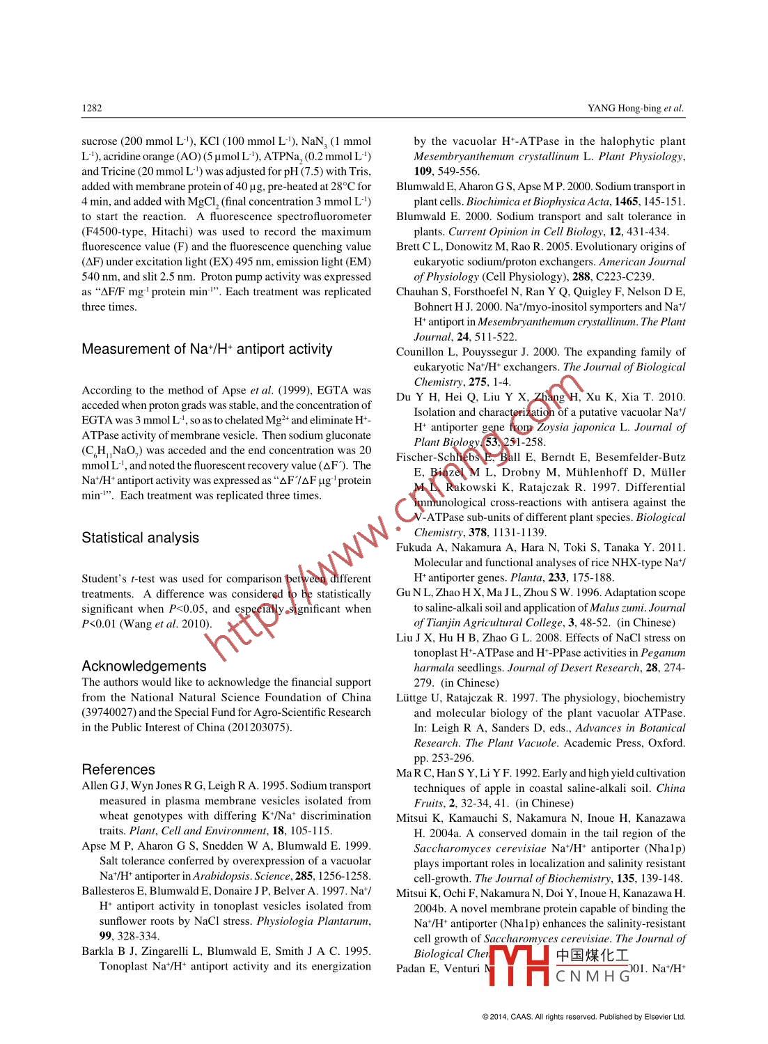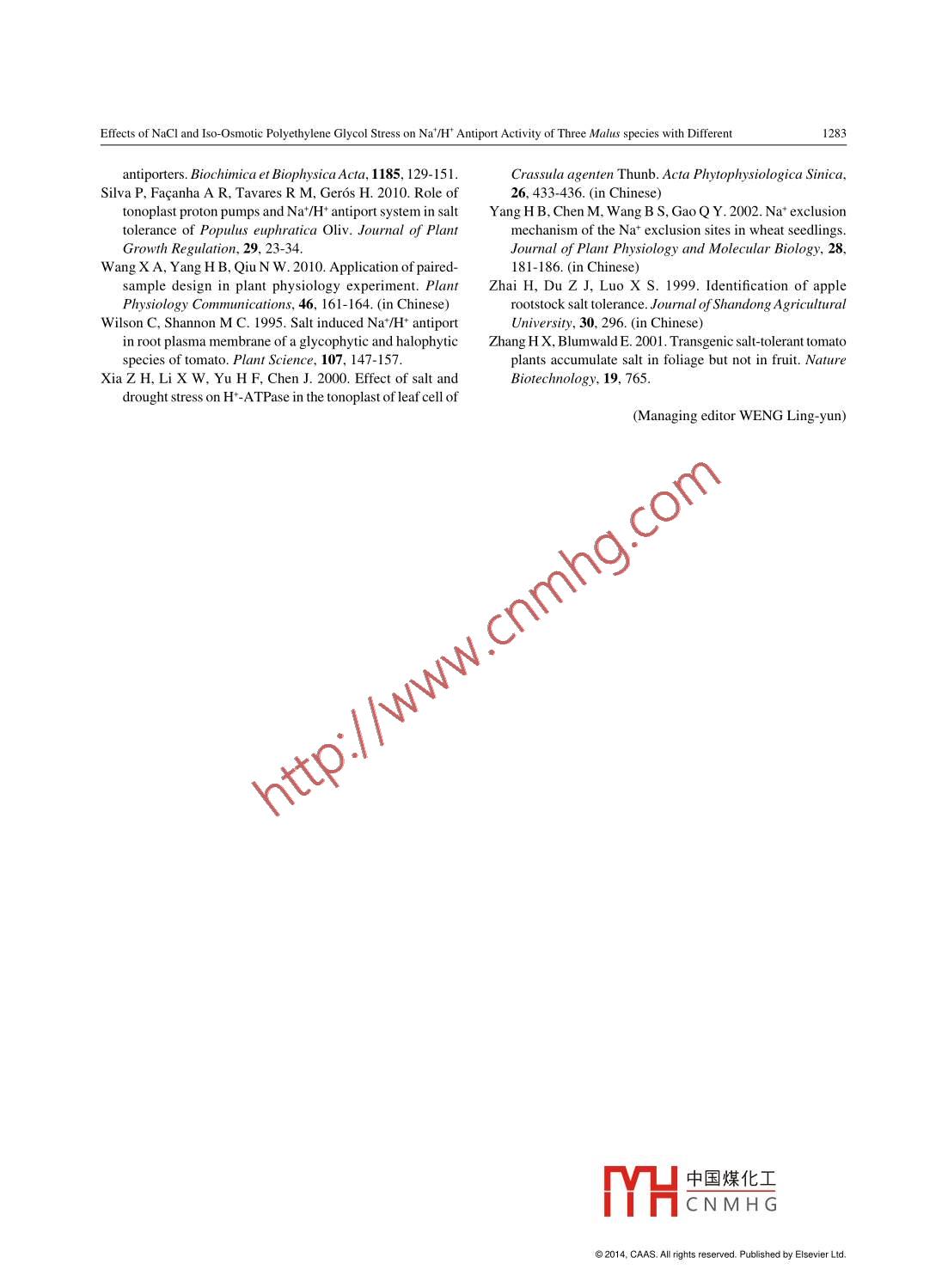Available online at www. sciencedirect.comJournal of Integrative Agriculture2014, 13(6): 1276- 1283。ScienceDirectJune 2014RESEARCH ARTICLEEffects of NaCl and lso-Osmotic Polyethylene Glycol Stress on Na+/H+Antiport Activity of Three Malus species with Different Salt ToleranceYANG Hong -bing' , DONG Chun-hai, XU Xue feng, WANG Yi2 and HAN Zhen-hai?'Key Lab of Plant Biotechnology in Universities of Shandong/ollege of Life Sciences, Qingdao Agriculural University, Qingdao 266109,P.R.China'Stress Plhysiology and Molecular Biology Laboratory of Fruit Trees, China Agricultural University, Bejing 100193, P.R.ChinaAbstractSalt stress contains osmotic and ionic stress, while iso-osmotic polyethylene glycol (PEG) has only osmotic stress. This studyaimed to compare the different effects on the activity of H-ATPase, proton pump and Na+/H+ antiport in Malus seedlings betweenosmotic and ionic stress. Species of salt tolerant Malus zumi, middle salt tolerant Malus xiaojinensis and salt sensitive Malusbaccata were used as experimental materials. Malus seedlings were treated with NaCl and iso-osmotic PEG stress. The activityof H+-ATPase, proton pump and Na+/H+ antiport of plasmolemma and tonoplast in Malus seedlings were obviously increasedunder salt stress, and those in salt-tolerant species increased more. Under the same NaCl concentration, the activity of H+-ATPase, proton pump and Nat/H+ antiport of plasmolemma and tonoplast in salt-tolerant species were all obviously higher thanthose in salt- sensitive one. Higher Na+/H+ antiport activity of plasmolemma and tonoplast in salt. tolerant species could help toextrude and compartmentalize sodium in roots under salt stress. The ascent rate of activity of H+- ATPase, proton pump and Na+/H+ antiport in Malus seedlings under the three salt concentration stress was all obviously higher than that under the iso-osmoticPEG stress. It indicated that the sodium ion effect had more stimulation on the activity of H*-ATPase, proton pump and Na+/H+antiport in salt-tolerant species, and salt-tolerant species has higher capability of sodium extrusion and compartmentalization inroots and is therefore more salt tolerant.Key words: Malus, NaCl, polyethylene glycol (PEG), Na+/H+ antiport activity, salt toleranceor compartmentalize sodium of cytoplasm under saltstress and enhanced the salt tolerance of cell (Littge andINTRODUCTIONRatajczak 1997; Mitsui et al.2004a, b). Du et al. (2010)cloned a vacuolar Na+/H+ antiporter gene from ZoysiaNa+/H+ antiporters were found from the plasmolemma japonica (ZjNHX1), and found that the vacuolar Na+/as well as the organelle membranes of cells in species of H+ antiporter played an important role in ion homeosta-bacteria and higher plants (Blumwald 2000; Counillonsis and salt tolerance and in Zoysia japonica. Fukudaand Pouyssegur 2000; Padan et al. 2001; Brett et al. et al. (201 1) cloned a vacuolar Na*/H+ antiporter gene2005). Nat exclusion of cell was mainly controlled by(OsNHX1) from rice and found that the expression ofplasmolemma and tonoplast. Through Na+/H+ antiport of OsNHX1 was upregulated by salt stress. The activity ofplasmolemma and tonoplast, cell could extrude sodiumH+-ATPase and proton pump of plasmolemma (WilsonReceived 28 May, 2013 Accepted 7 August, 2013中國煤化工YANG Hong-bing, Tel: +86-532-88030995. E-mail: hbyang@qau.edu.cn; Correspondence HAN Zhen-hai, Tel:.YHCN M H G-edu.cn◎2014, CAAS. All rights reserved. Published by Elsevier Ltd.doi: 10.1016/S2095-3119(13)60627-9Effects of NaCl and Iso-Osmotic Polyethylene Glycol Stress on Na /H* Antiport Activity of Three Malus species with Different1277and Shannon 1995) and tonoplast (Liu et al. 2008) were on salt damage and salt tolerant mechanism in plants.all obviously increased under salt stress; moreover, thatof tonoplast were also increased in some degree underRESULTSwater osmotic stress (Xia et al.2000). Silvaet al. (2010)found that the tonoplast Na+/H+ exchange system ofPopulus euphratica was upregulated and the tonoplastEffects of NaCI and iso-osmotic PEG stressH*-ATPase activity was increased by salt stress. Theon plasmolemma H+-ATPase activity of threeincrease of activity of H+- ATPase and proton pump couldMalus specieshelp to construct the proton electrochemical grads andbecome the basis of Nat/H+ antiport of plasmolemmaTreated with increasing concentration of NaCl andand tonoplast under environmental stress.iso- osmotic PEG, the plasmolemma H+- ATPase activityPeople have found that the tonoplast of CAM plantf M. zumi and M. xiaojinensis was increased (Fig. 1), butMesembryanthemum crsalliumn (Chauhan et al.2000) that of M. baccata was lte increased, especiallyl underand sweet soil plants (Zhang and Blumwald 2001) havethe stress of PEG at 18.8 and 28.5 mmol L'. Under theNa+/H+ antiport activity. And it is believed that the saltsame NaCl concentration, the H+-ATPase activity oftolerance of plants is correlated with the Na+/H+ antiportM. zumi was the highest, followed by M. xiaojinensissactivity. The Na*/H+ antiport activity of plasmolemma and M. baccata, respectively. Bot M. zumi andM. xiao-and tonoplast was found increased under salt stressjinensis increased more than M. baccata under the stress(Allen et al. 1995; Apse et al. 1999).of NaCl at 100 and 150 mmol L and iso-osmotic PEGMalus zumi can maintain normal growth under the sa-(P<0.01). In addition, the H+-ATPase activity of M. xiao-linity of 0.6% of saline alkali soil, which is a salt tolerantjinensis under the stress of NaCl at 150 mmol L' andMalus (Gu et al. 1996). Malus xiaojinensis can bear thethat of M. zumi under the three salt concentration stresssalinity of 0.3% (Zhai et al. 1999), which is a middle saltwas higher than that under the iso-osmotic PEG stress.tolerant Malus; while Malus baccata is a salt sensitiveMalus, and not suitable for saline- alkali soil cultivation(Ma et al. 1992). Salt stress includes osmotic stress andionic stress, while the iso osmotic PEG has only osmoticon tonoplast H+-ATP