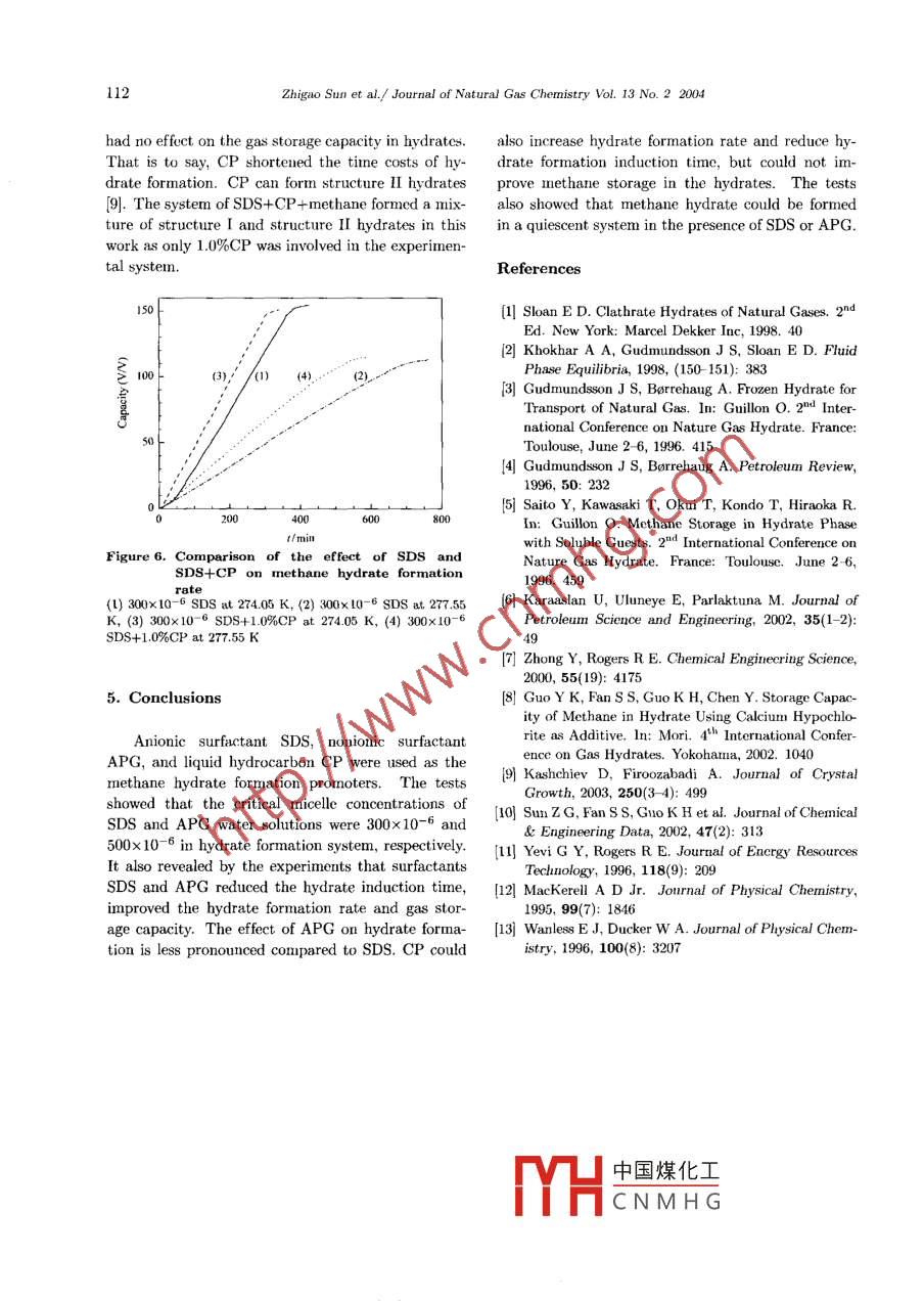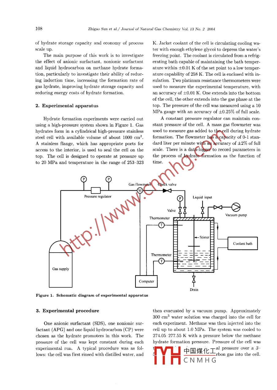 Journal of Natural Gas Chemistry 13(2004)107-112CIENCE PRESSInvestigation on Gas Storage in Methane HydrateZhigao Sun", Rongsheng Ma, Shuanshi Fan2, Kaihua Guo2, Ruzhu WangiI. School of Envirommental Science and Engineering, Yangzhou University, Yangzhou 225009, China;2. Guangzhou Institute of Energy Conversion, Guangzhou 570010, Ch3. Institute of Refrigeration and Cryogenics, Shanghai Jiaotong University, Shanghai 200090, ChinaManuscript received April 05, 2004; revised April 23, 2004Abstract: The effect of additives(anionic surfactant sodium dodecyl sulfate(SDS), nonionic surfactantalkyl polysaccharide glycoside(APG), and liquid hydrocarbon cyclopentane(CP)on hydrate inductiontime and formation rate, and storage capacity was studied in this work. Micelle surfactant solutions werefound to reduce hydrate induction time, increase methane hydrate formation rate and improve methanetorage capacity in hydrates. In the presence of surfactant, hydrate could form quickly in a quiescentsystem and the energy costs of hydrate formation were reduced. The critical micelle concentrations of SDSand APG water solutions were found to be 300x 10-6 and 500x10-6 for methane hydrate formation systemrespectively. The effect of anionic surfactant(SDS)on methane storage in hydrates is more pronouncedcompared to a nonionic surfactant(APG). CP also reduced hydrate induction time and improved hydrateformation rate, but could not improve methane storage in hydrates.Key words: methane hydrate, surfactant, cyclopentane, gas storage1. IntroductionGas hydrates have drawn much attention today as notonly a new natural energy resource but also a newNatural gas is a kind of clean fuel. As the main means for natural gas storage and transportcomponent of natural gas is methane whose boilingNatural gas storage in hydrates has been investi-point is about"C under 0.1 MPa, it is difficult gated because hydrates store large quantities of nat-to store and transport. There are two main methods ural gas 2. Gudmundsson et al. 3) showed that hyfor natural gas storage and transport today. One is drate could be stored at -15oC under atmosphericliquefied natural gas (LNG), and the other is natural pressure for 15 days, retaining almost all the gasgas storage and transport by pipeline, and both the Their study [4] also showed that a substantial costmethods are costly. In order to enlarge naturalsaving(24%)for the transport of natural gas in hyconsumers in China, economic method for natural gas drates compared to LNG from the northern Northstorage and transport should be foundSea to Central Europe. The hydrate formation withNatural gas hydrates are crystalline inclusion additives for the purpose of natural gas storage andcompounds composed of water and natural gas. There transport has been reported recently[2,5-8. How-are three known structures(structure I, structure II ever, industrial applications of hydrate storage pro-and structure H) in which water molecules arrange cesses have been hindered by some problems, such asthemselves around guest molecules, depending prin- slow formation rates, unreacted interstitial water as acipally on the molecular size of guest molecules [1, 2. large percentage of the hydrate mass, the reliabilityCorrespondingauthor.E-mail:szgyzu@163.com;Tel:0514-7863852Supported by Chinese Jiangsu Province Education Committee Progra中國(guó)煤化工 Science Foundation(50176051)YHaCNMHGZhigao Sun et al. /Journal of Natural Gas Chemistry Vol. 13 No 220(4of hydrate storage capacity and economy of process K Jacket coolant. of the cell is circulating cooling wath enough ethylene glycol to depress theThe main purpose of this work is to investigate freezing point. The coolant is circulated from a refrig.the effect of anionic surfactant, nonionic surfactant erating bath capable of maintaining the bath temper-and liquid hydrocarbon on mcthane hydrate forma- ature within +0.01 K of the set point to a low tempertion, particularly to investigate their ability of reduc- ature capability of 258 K. The cell is enclosed with in-ing induction time, increasing the formation rate of sulation. Two platinum resistance thermometers weregas hydrate, improving hydrate storage capacity and used to measure the experimental temperature, withreducing energy costs of hydrate formationan accuracy of +0. 01 K One extends into the bottomof the cell, the other extends into the gas phase at the2. Experimental apparatusp. The pressure of the cell was measured using a 10MPa gauge with an accuracy of +0. 25% of full scale.Hydrate formation experiments were carried outA constant pressure regulator can maintain conng a high-pressure system shown in Figure 1. Gas stant pressure of the cell. a mass gas flowmeter washydrates form in a cylindrical high-pressure stainless used to measure gas added to the cell during hydratesteel cell with available volume of about 1000 cm. formation. The flowmeter has a capacity of 0-1 stana stainless flange, which has appropriate ports for dard liter per minute with an accuracy of +2% of fullaccess to the interior, is used to seal the cell on the scale. There is a data-logger to record parameters intop. The cell is designed to operate at pressurethe process of hydrate formation as the function ofto 20 MPa and temperature in the range of 253-323 timePressure regulatorThermometeracuum pumpCoolantThermometerGas supplyComputertic diagram3. Experimental procedurehen evacuated by a vacuum pump. Approximately00 cmwater solution was charged into the cell forOne anionic surfactant(SDS), one nonionic sur- each experiment. Methane was then injected into thefactant(AG)and one liquid hydrocarbon(CP)wereell up to about 1.0 MPa. The system was cooled tochosen as the hydrate promoters in this work. The 274.05- 277. 55 K with a pressure below the methanepressure of the cell was kept constant during each hydrate formation pressure, Pressure of the cell wasexperimental run. A typical procedure was as folal pressure over a 3ows: the cell was fi