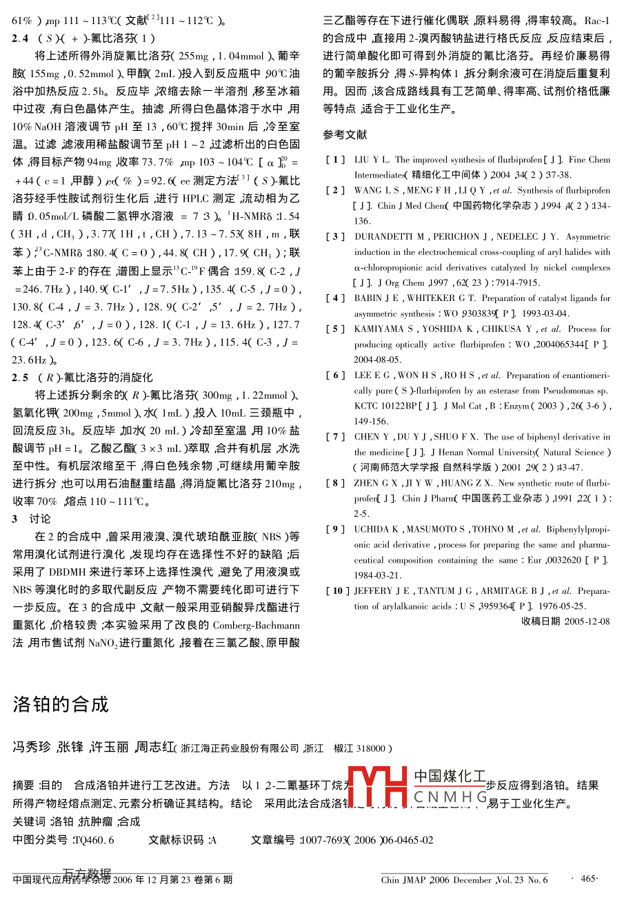 61% ) ,mp111 ~1139(文獻(xiàn)2111 ~112C )。.三乙酯等存在下進(jìn)行催化偶聯(lián),原料易得得率較高。Rac-12.4 (S)( + )~氟比洛芬( 1 )的合成中,直接用2-溴丙酸鈉鹽進(jìn)行格氏反應(yīng),反應(yīng)結(jié)束后,將.上述所得外消旋氟比洛芬(255mg,1.04mmol)葡辛進(jìn)行簡單酸化即可得到外消旋的氟比洛芬。再經(jīng)價(jià)廉易得胺( 155mg ,0. 52mmol )甲醇( 2mL )投入到反應(yīng)瓶中90C油的葡辛胺拆分得s-異構(gòu)體1拆分剩余液可在消旋后重復(fù)利浴中加熱反應(yīng)2.5h。反應(yīng)畢濃縮去除一半溶劑移至冰箱用。因而,該合成路線具有工藝簡單、得率高、試劑價(jià)格低廉中過夜,有白色晶體產(chǎn)生。抽濾所得白色晶體溶于水中用等特點(diǎn)適合于工業(yè)化生產(chǎn)。10%Na0H溶液調(diào)節(jié)pH至13,60C攪拌30min后冷至室參考文獻(xiàn)溫。過濾濾液用稀鹽酸調(diào)節(jié)至pH 1 ~2過濾析出的白色固體得目標(biāo)產(chǎn)物94mg收率73.7% mp 103~104C [a]=[1] LIU Y L. The improved synthesis of flurbiprofen[ J ] Fine ChemIntermediate( 精細(xì)化工中間體) 2004 34(2 ) 37-38.+44(c=1 ,甲醇)e( % )=92.6( ee 測定方法了(S)-氟比洛芬經(jīng)手性胺試劑衍生化后,進(jìn)行HPLC測定流動(dòng)相為乙[2] WANG LS ,MENGF H ,L1Q Y ,et al. Synthesis of flurbiprofen[ J] Chin J Med Chen(中國藥物化學(xué)雜志) 1994 A( 2) 134-睛D. 05mol/L磷酸二氫鉀水溶液= 7 3 )。'H-NMRδ :1.54136.(3H ,d ,CH3 ),3.77(1H ,t ,CH),7.13~7.53( 8H ,m ,聯(lián)[3] DURANDETTI M , PERICHON J , NEDELEC J Y. Asymmetric .苯)"C~NMRδ :180. 4(C=0),44.8( CH),17.9( CH, );聯(lián)induction in the electrochemical cross-coupling of aryl halides with苯上由于2-F的存在譜圖上顯示"C-"°F偶合159. 8( C-2 ,Ja-chloropropionic acid derivatives catalyzed by nickel complexes[J] J Org Chem 1997 ,62( 23 ) :7914-7915.=246. 7Hz),140.9 C-1' ,J=7.5Hz),135.4( C-5 ,J=0),[4] BABINJ E , WHITEKER G T. Preparation of catalyst ligands for130.8( C4 ,J =3.7Hz), 128. 9( C-2' ,5’,J =2.7Hz ),asymmetric synthesis : wo 9303839[ P] 1993-03-04.128.4(C-3' 6',J=0),128. I( C-1 ,J= 13.6Hz ), 127.7[5] KAMIYAMA s , YOSHIDA K , CHIKUSA Y ,et al. Process for(C4' ,J=0),123.6( C-6,J=3.7Hz),115.4( C-3 ,J=producing opically acive furbiprofen: WO ,2004065344 P ]23. 6Hz )。2004 08-05.2.5 ( R)-氟比洛芬的消旋化[6] LEEEG,WON HS ,ROHS ,et al. Preparation of enantiomeri-將上述拆分剩余的( R )-氟比洛芬( 300mg , 1.22mmol )allly pure( S )-furbiprofen by an esterase from Pseudononas sp.KCTC 10122BP[J] J Mol Cat ,B :Enzym( 2003) ,26( 3-6),氫氧化鉀( 200mg , 5mmol )水( 1mL )投入10mL三頸瓶中,149-156.回流反應(yīng)3h。反應(yīng)畢加水( 20 mL)冷卻至室溫用10%鹽[7] CHEN Y ,DU YJ ,SHUO F X. The use of biphenyl dervative in酸調(diào)節(jié)pH=1。乙酸乙酯( 3x3 mL )萃取合并有機(jī)層水洗the medicine[ J ] J Henan Normal University( Natural Science )至中性。有機(jī)層濃縮至干得白色殘余物,可繼續(xù)用葡辛胺(河南師范大學(xué)學(xué)報(bào)自然科學(xué)版) 200129(2)4347.進(jìn)行拆分也可以用石油醚重結(jié)晶得消旋氟比洛芬210mg,[8] ZHENGX ,JIY w ,HUANG z X. New syuthetice route of fubi-收率70%熔點(diǎn)110~111C。profer[ J] ChinJ Pharm(中國醫(yī)藥工業(yè)雜志) ,1991 22( 1 ):2-5.3討論在2的合成中,曾采用液溴、溴代琥珀酰亞胺( NBS )等[9] UCHIDA K , MASUMOTO s ,TOHNO M ,et al. Biphenylylpropi-onic acid derivative , process for preparing the same and pharma-常用溴化試劑進(jìn)行溴化發(fā)現(xiàn)均存在選擇性不好的缺陷后ceutical composition containing the same : Eur ,0032620[ P ]采用了DBDMH來進(jìn)行苯環(huán)上選擇性溴代避免了用液溴或1984-03-21.NBS等溴化時(shí)的多取代副反應(yīng)產(chǎn)物不需要純化即可進(jìn)行下[ 10] JEFERY J E ,TANTUM J G , ARMITAGE B J ,et al. Prepara--步反應(yīng)。在3的合成中文獻(xiàn)-般采用亞硝酸異戊酯進(jìn)行.tion of arylalkanoic acids :U S 3959364[ P ] 1976-05-25.收稿日期2005-12-08重氮化價(jià)格較貴;本實(shí)驗(yàn)采用了改良的Comberg- Bachmann法用市售試劑NaNO2進(jìn)行重氮化接著在三氯乙酸、原甲酸洛鉑的合成馮秀珍張鋒許玉麗周志紅(浙江海正藥業(yè)股份有限公司浙江椒江 318000 )中國煤化工摘要:目的合成洛鉑并進(jìn)行工藝改進(jìn)。 方法以1 2-二氰基環(huán)丁烷步反應(yīng)得到洛鉑。 結(jié)果所得產(chǎn)物經(jīng)熔點(diǎn)測定、元素分析確證其結(jié)構(gòu)。結(jié)論采用此法合 成洛釧.MYH.CN MH G易于工業(yè)化生產(chǎn)。關(guān)鍵詞洛鉑抗腫瘤合成中圖分類號(hào):TQ460. 6.文獻(xiàn)標(biāo)識(shí)碼:A文章編號(hào):1007-7693( 2006 )06-0465-02中國現(xiàn)代應(yīng)禰藥檠據(jù)206年12月第23卷第6期Chin JMAP 2006 December ,Vol. 23 No.6, 465.Synthesis of lobaplatinFENG Xiu-zheng ,ZHANG Feng ,XU Yu-li ,ZHOU Zhi-hong( Zhejing Hisun Pharmaceutical Co. ,LTD Jiaojiang 318000,China )ABSTRACT :OBJECTTVE To synthesze lobaplatin and optimize the process. METHODS The compound was synthesize by stepsof reduction condensation and cyclic condensation from 1 2-dicyanocyclobutane. RESULTS Chermical structure of the product wasconfirmed by melting point and element analysis. CONCLUSION This synthetic method is feasible simple and suitable for industrial-ization. .KEY WORDS lobaplatin antineoplastic aynthesis洛鉑化學(xué)名為1 2二氨甲基~環(huán)丁烷乳酸合鉑( I )是3二氯-1 2-二甲胺基環(huán)丁胺合鉑IV )的制備由德國ZentarisAG公司研制'的又一個(gè)第三代鉑類抗腫瘤將四氯鉑酸鉀3. 05g( 0. 0073mol )溶解在水10mlL中加藥物。研究表明,該藥的抗腫瘤效果與順鉑和卡鉑