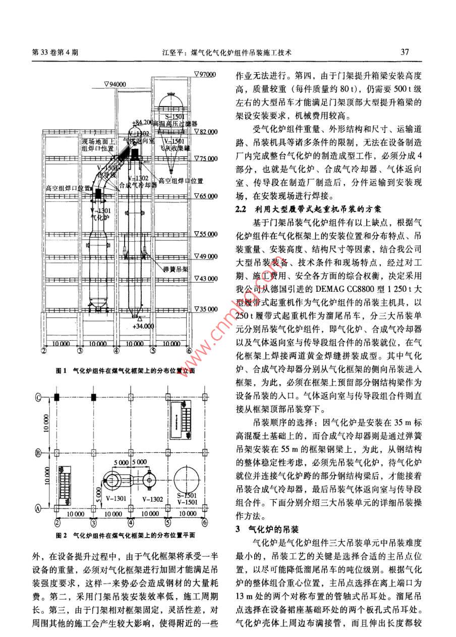 石油工程建設(shè)2007年8月煤氣化氣化爐組件吊裝施工技術(shù)卡方K分水方冰方水方長分水分長方規(guī)分長方X方水分長方水分長方水分水2K分水萬水方K分K》長刀長方長長方水》*分*分*K分*)長》*》*》K》)長》K分K分K》華江堅平(中國石化集團寧波工程有限公司,浙江寧波315207)摘要:煤氣化關(guān)鍵設(shè)備--- 氣化爐組件,其整體形狀呈倒“y”字形,不僅結(jié)構(gòu)復(fù)雜,重量大,吊裝位置高,而且要安裝在煤氣化框架鋼結(jié)構(gòu)內(nèi)部,吊裝難度大。文章結(jié)合湖南岳陽、湖北枝江和安徽安慶三套煤氣化項目的吊裝實踐,介紹了采用1250t大型履帶式起重機作為吊裝主機具,采用250t履帶式起重機作為溜尾吊車,將氣化爐組件分為三大吊裝單元,分別吊裝就位的施工方法。實踐證明,該方法與利用傳統(tǒng)的門架吊裝相比,工期短,更方便,更快捷,安全性更高。關(guān)鍵詞:煤氣化;氣化爐組件;吊裝;施工技術(shù)中圖分類號: TQ545文獻標識碼: B文章編號: 1001-2206 (2007) 04-0036-051工程概況裝標高),質(zhì)量為540t。作為中國石化集團公司“十五”期間重大工程(3)氣體返向室:內(nèi)直徑為D3 400 mm,長的湖南岳陽、湖北枝江、安徽安慶三套煤氣化項9 700 mm,安裝基礎(chǔ)標高為74.5m (即合成氣冷卻目,是中國石化調(diào)整能源結(jié)構(gòu)、實現(xiàn)化肥企業(yè)扭虧器就位后上口標高),質(zhì)量為250t。其兩道口分別為盈的重要戰(zhàn)略舉措,是中國石化化肥企業(yè)的希望與合成氣冷卻器、傳導段上口對接。工程。由我公司實行EPC總承包,于2003年開工(4)傳導段:內(nèi)直徑為D3 020 mm,安裝基礎(chǔ).建設(shè),目前正處在建設(shè)收尾、試車階段。標高為65.9 m (即氣化爐就位后上口標高),質(zhì)量該項目主要設(shè)備都集中在氣化框架與磨煤框架為98t。其兩道口分別與氣化爐上口、氣體返向室這兩大煤氣化框架內(nèi)。氣化框架總高度為97 m,對接。其中35m標高以下為鋼筋混凝土結(jié)構(gòu),35m標高氣化爐組件在氣化框架上的分布位置見圖1和以上為鋼結(jié)構(gòu),本項目氣化爐這一-關(guān)鍵設(shè)備就位于圖2。氣化框架內(nèi)。磨煤框架總高度為82m,其中35 m2總體吊裝方 案選擇標高以下也為鋼筋混凝土結(jié)構(gòu),35 m標高以上為2.1傳統(tǒng)的門架吊裝方法存在的問題鋼結(jié)構(gòu)。在國外已經(jīng)建成的所有煤氣化裝置中,氣化爐在以上三套煤氣化項目中,各有1臺關(guān)鍵設(shè)組件的吊裝都是利用傳統(tǒng)的門架采用液壓提升吊裝備一 氣化爐組件。該組件由氣化爐、合成氣冷卻工藝吊裝就位的。即在氣化框架頂部設(shè)置兩根鋼立器、氣體返向室和傳導段4部分組成,其結(jié)構(gòu)形狀柱桅桿,氣化框架邊的地面上再樹立兩根鋼立柱桅呈倒“y”字形,整體質(zhì)量為1 398t。各件設(shè)備的桿,在桅桿頂部架設(shè)4根大箱形梁作為提升承重基本吊裝參數(shù)如下:梁,在門架承重梁上設(shè)立提升機具進行設(shè)備的提(1)氣化爐:內(nèi)直徑為D3020/D4630mm,升。長30900mm,安裝在氣化框架35m標高層的鋼第一,由于門架立柱高度高(根據(jù)氣化框架的筋混凝土基礎(chǔ)上,質(zhì)量為510t??傮w高度,門架高度至少應(yīng)在100m以上),要提(2)合成氣冷卻器:內(nèi)直徑為D3 400mm,長升的設(shè)備重量大,考慮到立柱的壓桿穩(wěn)定性,應(yīng)設(shè)40500mm,安裝基礎(chǔ)標高為55m(彈簧吊架的安計出龐大的桅桿結(jié)構(gòu)才能滿足安全承載要求。另第33卷第4期江堅平:煤氣化氣化爐組件吊裝施工技術(shù)37又97000作業(yè)無法進行。第四,由于門架提升箱梁安裝高度V94000高,質(zhì)量較重(每件質(zhì)量約80t),仍需要500t級左右的大型吊車才能滿足門架頂部大型提升箱梁的架設(shè)安裝要求,機械費用較高。+84200高溫高壓過湖器5782000受氣化爐組件重量、外形結(jié)構(gòu)和尺寸、運輸?shù)垃F(xiàn)場地面上. V1501路、吊裝機具等諸多條件的限制,無法在設(shè)備制造組焊口包置飛天收集峰.75.000廠內(nèi)完成整臺氣化爐的制造成型工作,必須分成4部分,也就是氣化爐、合成氣冷卻器、氣體返向。1102高空組焊中位置室、傳導段在制造廠制造后,分件運輸?shù)桨惭b現(xiàn)高空組焊口尊置合成氣帝卻幕765000場,在安裝現(xiàn)場進行焊接。2.2利用大型履帶式起重機吊 裝的方案基于門架吊裝氣化爐組件有以上缺點,根據(jù)氣55000化爐組件在氣化框架上的安裝位置和分布特點、吊裝重量、安裝高度、結(jié)構(gòu)尺寸等因素,結(jié)合我公司V49 000大型吊裝裝備、技術(shù)條件和現(xiàn)場特點,經(jīng)過對工彈簧吊架743000期、施工費用、安全各方面的綜合權(quán)衡,決定采用我公司從德國引進的DEMAGCC8800型1250t大735 000型履帶式起重機作為氣化爐組件的吊裝主機具,以250t履帶式起重機作為溜尾吊車,分三大吊裝單34.000元分別吊裝氣化爐組件,即氣化爐、合成氣冷卻器1000 10000 1000 510000以及氣體返向室與傳導段組合件的吊裝就位,在氣256化框架上焊接兩道黃金焊縫拼裝成型。其中氣化圈1氣化爐組件在煤氣化框架上的分布位置立面爐、合成氣冷卻器分別從氣化框架的側(cè)向吊裝進入框架,為此,必須在框架上預(yù)留部分鋼結(jié)構(gòu)梁作為設(shè)備吊裝的入口。氣體返向室與傳導段組合件則直接從框架頂部吊裝穿下。吊裝順序的選擇:因氣化爐是安裝在35 m標高