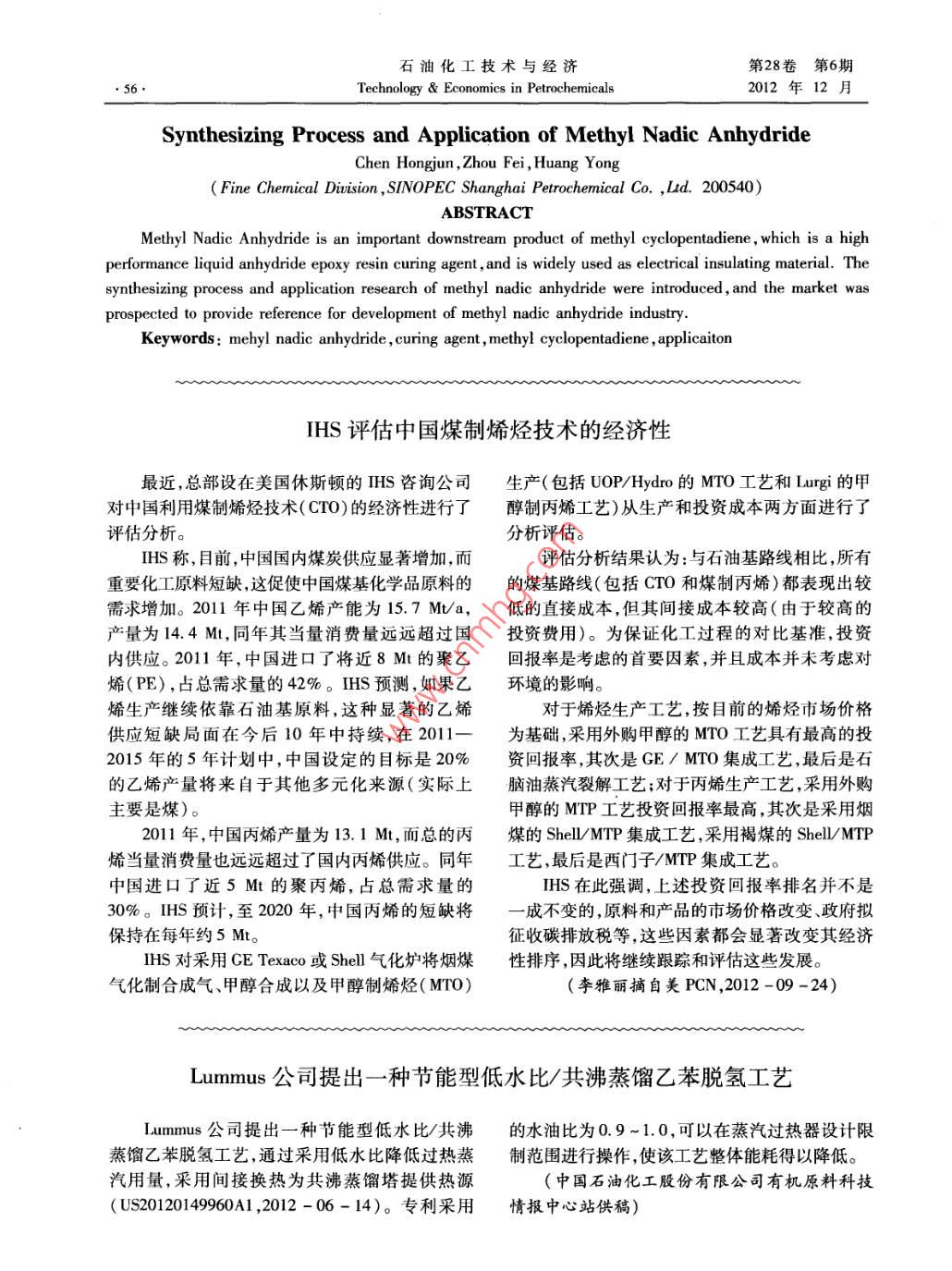 石油化工技術與經濟第28卷第6期 .●56Technology & Economics in Petrochemicals2012年12月Synthesizing Process and Application of Methyl Nadic AnhydrideChen Hongjun ,Zhou Fei , Huang Yong( Fine Chemnical Duision , SINOPEC Shanghai Petrochemical Co. ,Ltd. 200540)ABSTRACTMethyl Nadic Anhydride is an important downstream product of methyl cyclopentadiene , which is a highperformance liquid anhydride epoxy resin curing agent , and is widely used as electrical insulating material. Thesynthesizing process and application research of methyl nadic anhydride were introduced , and the market wasprospected to provide reference for development of methyl nadic anhydride industry.Keywords: mehyl nadic anhydride , curing agent , methyl cyclopentadiene , applicaitonIHS評估中國煤制烯烴技術的經濟性最近,總部設在美國休斯頓的IHS咨詢公司生產(包括UOP/Hydro的MTO工藝和Lurgi的甲對中國利用煤制烯烴技術( CTO)的經濟性進行了醇制丙烯工藝)從生產和投資成本兩方面進行了評估分析。分析評估。IHS稱,目前,中國國內煤炭供應顯著增加,而評估分析結果認為:與石油基路線相比,所有重要化工原料短缺,這促使中國煤基化學品原料的的煤基路線(包括CTO和煤制丙烯)都表現出較需求增加。2011 年中國乙烯產能為15.7 Mt/a,低的直接成本,但其間接成本較高(由于較高的產量為14.4Mt,同年其當量消費量遠遠超過國投資費用)。為保證化工過程的對比基準,投資內供應。2011年,中國進口了將近8 Mt的聚乙回報率是考慮的首要因索,并且成本并未考慮對烯(PE),占總需求量的42%。IHS 預測,如果乙環(huán)境的影響。烯生產繼續(xù)依靠石油基原料,這種顯著的乙烯對于烯烴生產工藝,按目前的烯烴市場價格供應短缺局面在今后10年中持續(xù),在2011-為基礎,采用外購甲醇的MTO工藝具有最高的投2015年的5年計劃中,中國設定的目標是20%:資回報率,其次是GE/ MTO集成工藝,最后是石的乙烯產量將來自于其他多元化來源(實際上腦油蒸汽裂解工藝;對于丙烯生產工藝,采用外購主要是煤)。甲醇的MITP工藝投資回報率最高,其次是采用煙2011年,中國丙烯產量為13.1Mt,而總的丙.煤的Shell/MTP集成I藝,采用褐煤的Shell/MTP烯當量消費量也遠遠超過了國內丙烯供應。同年工藝,最后是西門子/MTP集成工藝。中國進口了近5 Mt的聚丙烯,占總需求量的IHS在此強調,上述投資回報率排名并不是30%。IHS預計,至2020年,中國丙烯的短缺將一成不變的,原料和產品的市場價格改變、政府擬保持在每年約5 Mt。征收碳排放稅等,這些因素都會顯著改變其經濟IHS對采用GE Texaco或Shell氣化爐將煙煤性排序,因此將繼續(xù)跟蹤和評估這些發(fā)展。氣化制合成氣、甲醇合成以及甲醇制烯烴(MTO)(李雅麗摘自美PCN ,2012 -09 -24)Lummus公司提出一種節(jié)能型低水比共沸蒸餾乙苯脫氫工藝Lummus公司提出一種節(jié)能型低水比/共沸的水油比為0.9~1.0,可以在蒸汽過熱器設計限蒸餾乙苯脫氫工藝,通過采用低水比降低過熱蒸制范圍進行操作,使該工藝整體能耗得以降低。汽用量,采用間接換熱為共沸蒸餾塔提供熱源(中國石油化工股份有限公司有機原料科技(US20120149960A1 ,2012 -06-14)。專利采用情報中心站供稿)