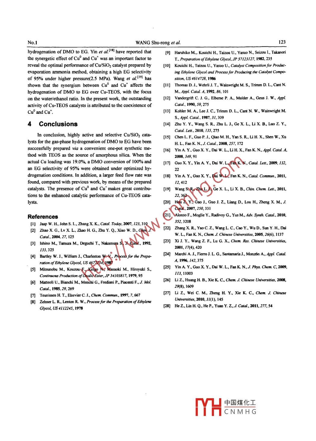 CHEM. RES. CHINESE UNIVERSITES 2012, 28(1), 119- -123Catalytic Performance and Texture of TEOS Based Cu/SiO2Catalysts for Hydrogenation of DimethylOxalate to Ethylene GlycolWANG Shu-rong , YIN Qian-qian and LI Xin-baoState Key Laboratory of Clean Energy Uilization, Zhejiang University, Hangzhou 310027, P. R. ChinaAbstract Highly active and selective Cu/SiO2 catalysts for hydrogenation of dimethyl oxalate(DMO) to ethyleneglycol(EG) were successfully prepared by means of a convenient one-pot synthetic method with tetraethoxysi-lane(TEOS) as the source of silica. XRD, H2-TPR, SEM, TEM, XRF and N2 physisorption measurements wereperformed to characterize the texture and structure of Cu/SiO2 catalysts with different copper loadings. The activecomponents were highly dispersed on SiO2 supports. Furthermore, the coexistence of Cu' and Cu* contributed a lot tothe excellent performance of Cu-TEOS catalysts. The DMO conversion reached 100% and the EG selectivity reached95% at 498 K and 2 MPa with a high liquid hourly space velocity over the 27-Cu-TEOS catalyst with an actual cop-per loading of 19.0%(mass fraction).Keywords Cu/SiO2; TEOS; Hydrogenation; Dimethyl oxalate; Ethylene glycolArticle ID 1005-9040(2012)-01-119-051 Introductioninfluence of SiO2 carriers(such as HMS and SBA-15) and theEthylene glycol(EG) is an important chemical product,deposition-precipitation temperature on the texture, structurewhich is widely used in polyester manufacture. At present, EGand catalytic performance of Cu/SiO2 for the hydrogenation ofis mainly synthesized by ethylene oxide hydrolysis, a routedimethyl oxalate to ethylene.which is significantly influenced by the price of crude oil andAmong the researches on the hydrogenation of dimethylconstrained by the accompanying huge energy consumptionoxalate(DMO) to EG, CwSiO2 catalysts were rarely reported,and the huge requirement for water'l. As a result, there hassynthesized by convenient one-pot method with tetraethoxysi-been considerable searches for an altermative and sustainablelane(TEOS) as the source of amorphous SiO2 support, whichapproach, namely, the synthesis of EG from syngasl2.31.was a widely used cheap material. In the present work, one-potThe indirect synthesis process has two steps, the couplingsynthetic method was adopted to prepare the CwSiO2 catalystsof CO with nitrite esters to oxalates and then the hydrogenationwith different Cu loadings. And then the catalytic performanceof oxalates to EGI4.5]. However, the catalysts used for the oxa-of the gas-phase hydrogenation of DMO to EG over these ca-late hydrogenation have been considered to be the main restric-talysts was evaluated by means of a continuous-flow fixed-bedtion on the industrial synthesis of EG from syngas and a greatreactor. XRD, H2-TPR, SEM, TEM, XRF and N2 physisorptiondeal of work has been carried out to improve their performance.vere performed to characterize the textural and structuralIn the early technology, ruthenium-based homogeneous cata-properties of the catalysts.lysts were used for the hydrogenation of oxalatesh.1. However,owing to the dificulties of separating the catalyst from product2 Experimentaland serious corrosion resulting from the use of homogeneouscatalysts, Cu-based heterogeneous catalysts have been more2.1 Preparation of Catalystsreccently investigated for the hydrogenation of dialkyl oxalates.Cw/SiOz catalyst was prepared via a onc-pot synthesis. AnAlthough scientists have developed a series of Cu-Cr/SiO2appropriate quantity of Cu(NO3)2:3H2O(A.R. grade, Sinopharmbased catalysts for the hydrogenation of oxalatesl&9, theChemical Reagent Ltd.) was dissolved in deionized water andtoxicity of Cr has limited the wide application of them. There-ethanol, as a co-solvent, was added to it while strring. Then thefore, researches into oxalate hydrogenation catalysts have beenrequired amount of 28%(mass fraction) aqueous ammoniafocused on the development of Cr-free Cu based catalystsl0- -14.solution was added drop by drop with continuous siring until*Corresponding author. E-mail: srwang@zju.cdu.cnRceived June 15, 2011; accepted October 10, 2011.中國煤化工,Supported by the National Science and Technology Supporting Plan ThrougAD22B06), theZhejiang Provincial Natural Science Foundation, China(No. 1110089), the Fundan:MYHC N M H Gcentral Univer-sities of China(No.2011FZA4012), the Research Fund for the Doctoral Program of Higher Education of China(No.200901011 10034), and the Zhejiang Provincial Key Science and Technology Innovation Team, China(No.2009R50012).120CHEM. RES. CHINESE UNIVERSITIESVol.28the pH value of the mixture reached 12- -13, thus forming acopper ammonia complex solution. The required amounts of3 Results and DiscussionTEOS and copper ammonia complex solution were mixedand stired for 4 h at room temperature, and then aged for 24 h.3.1 Catalytic Activity of Prepared CatalystsThe suspension was transferred to an oil bath, preheated at 363The reaction scheme for the hydrogenation ofDM0 to EGK, for the evaporation of ammonia, water and ethanol, andis shown below:then filtered. The filtrate was washed with 500 mL of deionizedwater five times then dried at 393 K overmight. The catalystHOCH2COOCH;+2H2- +HOCH2CH2OH+CHzOH (1)precursors were calcined in static air at 723 K for 4 h, palle-HOCH2CH2OH+H2-→CHzCH2OH+H2Otized, crushed and seived to 40- -60 mesh. The prepared cata-The hydrogenation of DMO to EG proceeds via methyllysts were designated as w-Cu-TEOS,where w showed theglycolate(MG), and the EG can be further dehydrated to etha-nominal copper loading(mass fraction, %).nol.The catalytic performance2.2 Characterization of Catalystsin the gas-phase hydrogenation of DM0 to EG are summarizedN2 adsorption-desorption isotherms were recorded at 77 Kin Table 1. These tests were carried out under fixed conditions:)n a Quantachrom-Autosorb-l-C apparatus. Before thethe reaction temperature was 498 K, the system pressure was 2measurement, the sample was degassed at 573 K for 3 