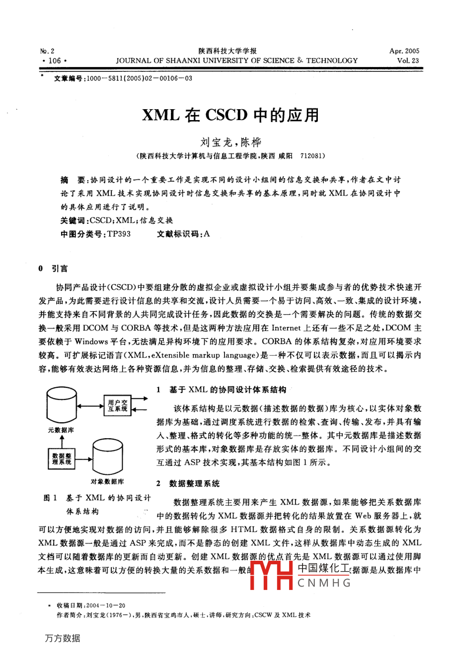 陜西科技大學(xué)學(xué)報(bào)·106JOURNAL OF SHAANXI UNIVERSITY OF SCIENCE TECHNOLOGY文章編號(hào):1000-5811(2005)02-00106-03XML在CSCD中的應(yīng)用劉寶龍,陳樺(陜西科技大學(xué)計(jì)算機(jī)與信息工程學(xué)院,陜西咸陽712081)摘要:協(xié)同設(shè)計(jì)的一個(gè)重要工作是實(shí)現(xiàn)不同的設(shè)計(jì)小組間的信息交換和共享,作者在文中討論了釆用XML技術(shù)實(shí)現(xiàn)協(xié)同設(shè)計(jì)時(shí)信息交換和共享的基本原理,同時(shí)就XML在協(xié)同設(shè)計(jì)中的具體應(yīng)用進(jìn)行了說明。關(guān)鍵詞:CSCD;XML;信息交換中圖分類號(hào):TP393文獻(xiàn)標(biāo)識(shí)碼:A引言協(xié)同產(chǎn)品設(shè)計(jì)(CSCD)中要組建分散的虛擬企業(yè)或虛擬設(shè)計(jì)小組并要集成參與者的優(yōu)勢技術(shù)快速開發(fā)產(chǎn)品,為此需要進(jìn)行設(shè)計(jì)信息的共享和交流,設(shè)計(jì)人員需要一個(gè)易于訪問、高效、一致、集成的設(shè)計(jì)環(huán)境,并能支持來自不同背景的人共同完成設(shè)計(jì)任務(wù),因此數(shù)據(jù)的交換是一個(gè)需要解決的問題。傳統(tǒng)的數(shù)據(jù)交換一般采用DCOM與 CORBA等技術(shù),但是這兩種方法應(yīng)用在 Internet上還有一些不足之處,DCOM主要依賴于 Windows平臺(tái),無法滿足異構(gòu)環(huán)境下的應(yīng)用要求。 CORBA的體系結(jié)構(gòu)復(fù)雜,對(duì)應(yīng)用環(huán)境要求較高??蓴U(kuò)展標(biāo)記語言(XML, eXtensible markup language)是一種不僅可以表示數(shù)據(jù),而且可以揭示內(nèi)容,能夠有效表達(dá)網(wǎng)絡(luò)上各種資源信息,并為信息的整理、存儲(chǔ)、交換、檢索提供有效途徑的技術(shù)。1基于XML的協(xié)同設(shè)計(jì)體系結(jié)構(gòu)系該體系結(jié)構(gòu)是以元數(shù)據(jù)(描述數(shù)據(jù)的數(shù)據(jù))庫為核心,以實(shí)體對(duì)象數(shù)據(jù)庫為基礎(chǔ),通過調(diào)度系統(tǒng)進(jìn)行數(shù)據(jù)的檢索、查詢、傳輸、發(fā)布,并具有輸元數(shù)據(jù)庫入整理、格式的轉(zhuǎn)化等多種功能的統(tǒng)一整體。其中元數(shù)據(jù)庫是描述數(shù)據(jù)形式的基本庫,對(duì)象數(shù)據(jù)庫是存放實(shí)體的數(shù)據(jù)庫。不同設(shè)計(jì)小組間的交互通過ASP技術(shù)實(shí)現(xiàn),其基本結(jié)構(gòu)如圖1所示。對(duì)象數(shù)據(jù)庫2數(shù)據(jù)整理系統(tǒng)圖1基于ⅩML的協(xié)同設(shè)計(jì)數(shù)據(jù)整理系統(tǒng)主要用來產(chǎn)生XML數(shù)據(jù)源,如果能夠把關(guān)系數(shù)據(jù)庫體系結(jié)構(gòu)中的數(shù)據(jù)轉(zhuǎn)化為XML數(shù)據(jù)源并把轉(zhuǎn)化的結(jié)果放置在Web服務(wù)器上,就可以方便地實(shí)現(xiàn)對(duì)數(shù)據(jù)的訪問,并且能夠解除很多HTML數(shù)據(jù)格式自身的限制。關(guān)系數(shù)據(jù)源轉(zhuǎn)化為XML數(shù)據(jù)源一般是通過ASP來完成,而不是靜態(tài)的創(chuàng)建XML文件,這樣從數(shù)據(jù)庫中動(dòng)態(tài)生成的XML文檔可以隨著數(shù)據(jù)庫的更新而自動(dòng)更新。創(chuàng)建XML數(shù)據(jù)源的優(yōu)點(diǎn)首先是XML數(shù)據(jù)源可以通過使用腳本生成,這意味著可以方便的轉(zhuǎn)換大量的關(guān)系數(shù)據(jù)和一般中國煤化工據(jù)源是從數(shù)據(jù)庫中CNMHG收稿日期:2004-10-20作者簡介:劉寶龍(1976-),男,陜西省寶雞市人,碩士,講師,研究方向:CSCW及XML技術(shù)第2期劉寶龍等:XML在CSCD中的應(yīng)用研究·107·的數(shù)據(jù)動(dòng)態(tài)生成的因此隨著數(shù)據(jù)庫數(shù)據(jù)的更新XML數(shù)據(jù)源也在自動(dòng)更新這樣可以通過數(shù)據(jù)庫管理系統(tǒng)(如: MS-SQL, ACCESS, ORACLE)來維護(hù)和管理數(shù)據(jù),而此時(shí)XML數(shù)據(jù)源也自動(dòng)進(jìn)行了更新,無需再單獨(dú)維護(hù)?,F(xiàn)有一個(gè) Design關(guān)系數(shù)據(jù)庫,在這個(gè)數(shù)據(jù)庫中有一個(gè) Partner數(shù)據(jù)表(表1),包含如下信息表1數(shù)據(jù)表PartneridPartnerNameCity10000孫朋陜西科技大學(xué)陜西減陽09103564458袁偉西北工業(yè)大學(xué)陜西西安0298021743weizi@tom.comASP文件通常開始于腳本語言的聲明,所使用的XML版本格式如下:<%@LANGUAGE=VBScript%>><? xml version=“1.0”