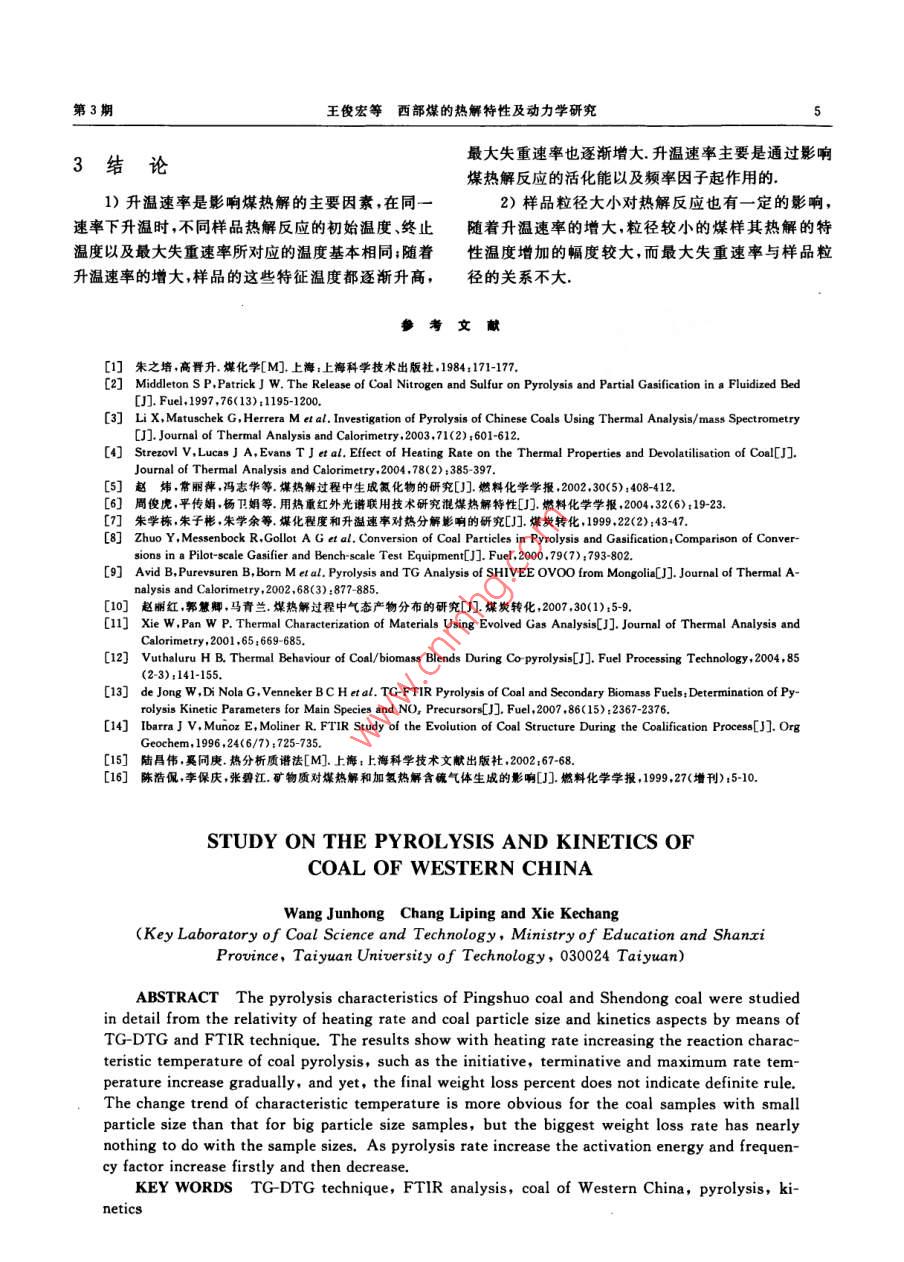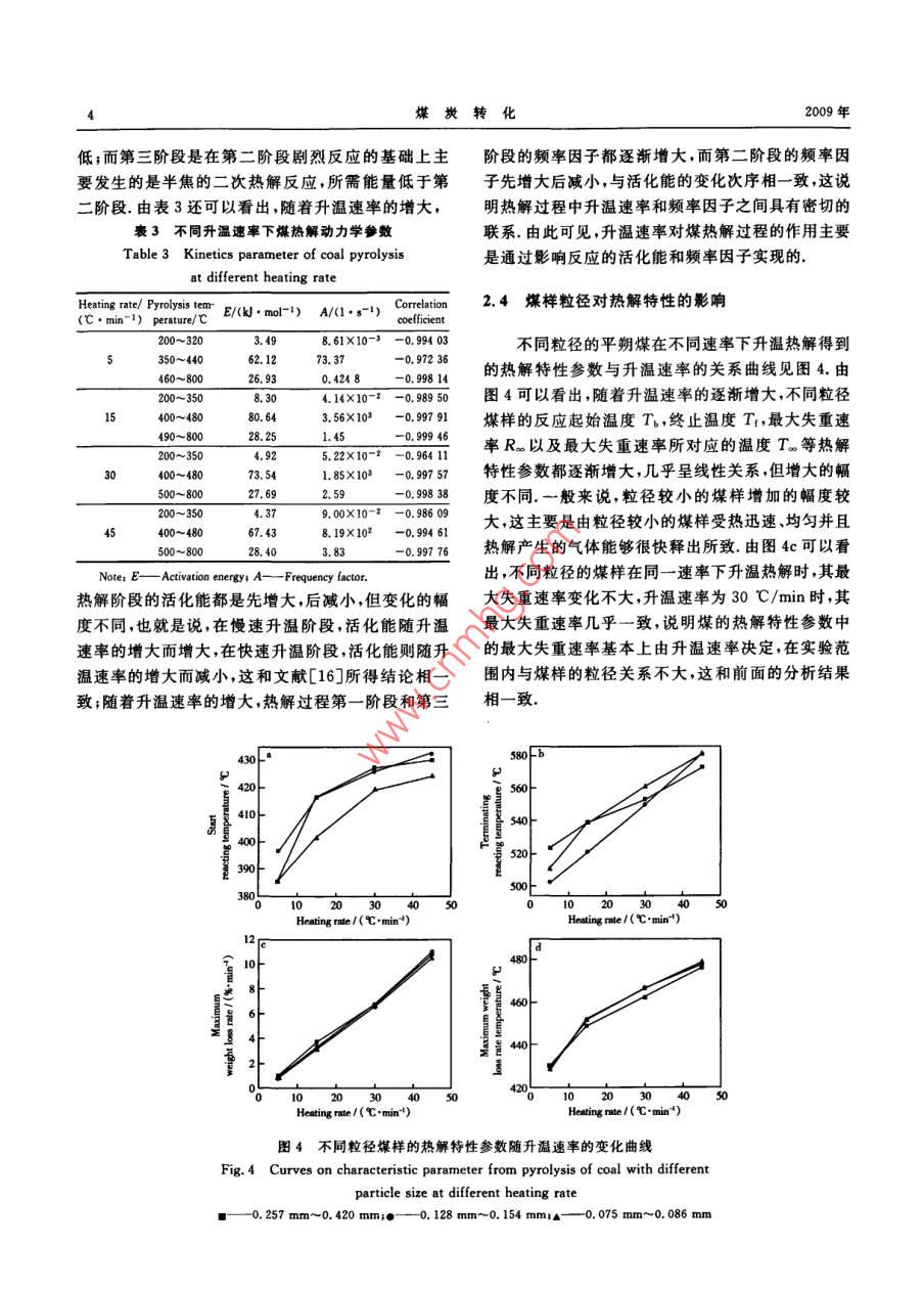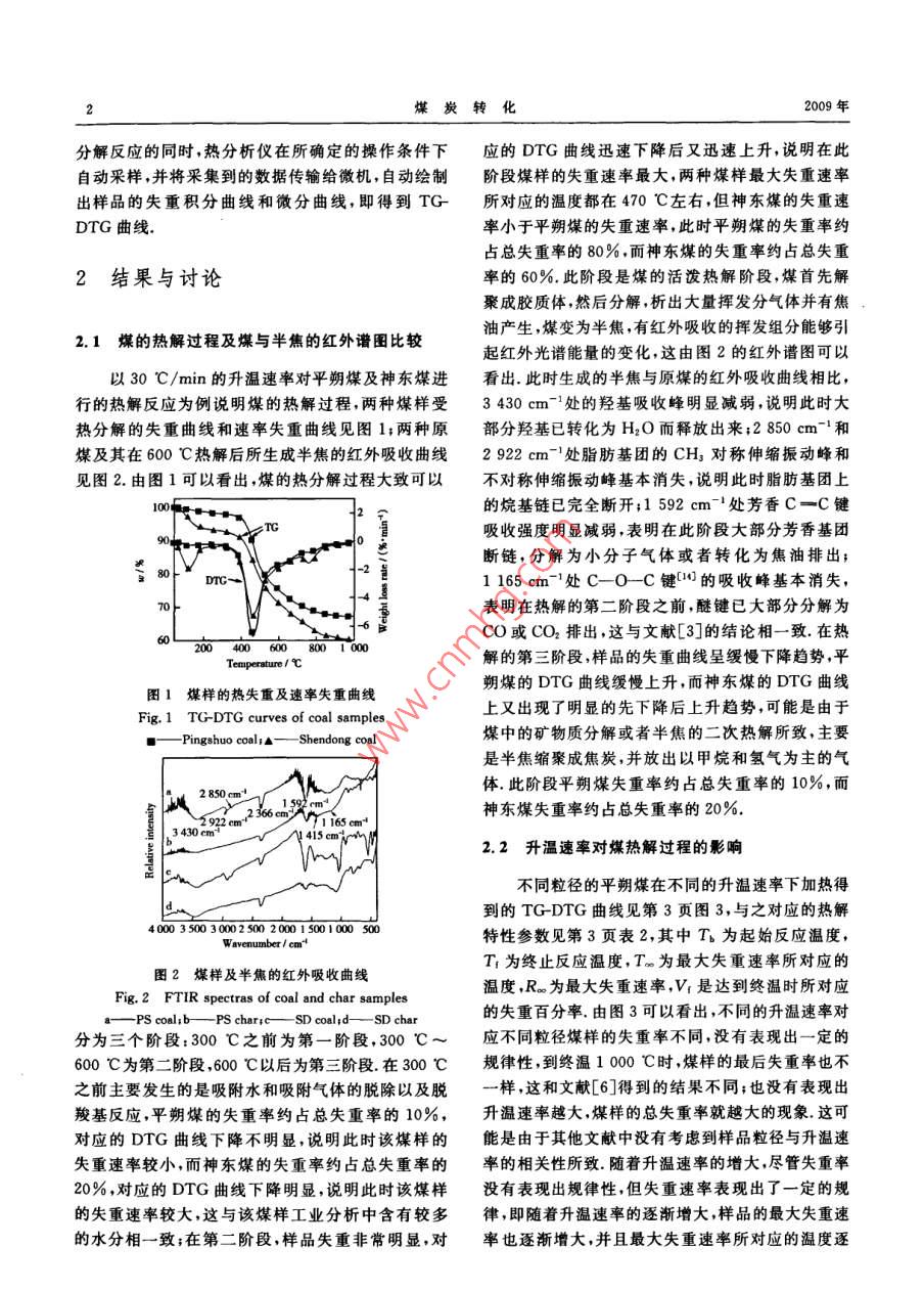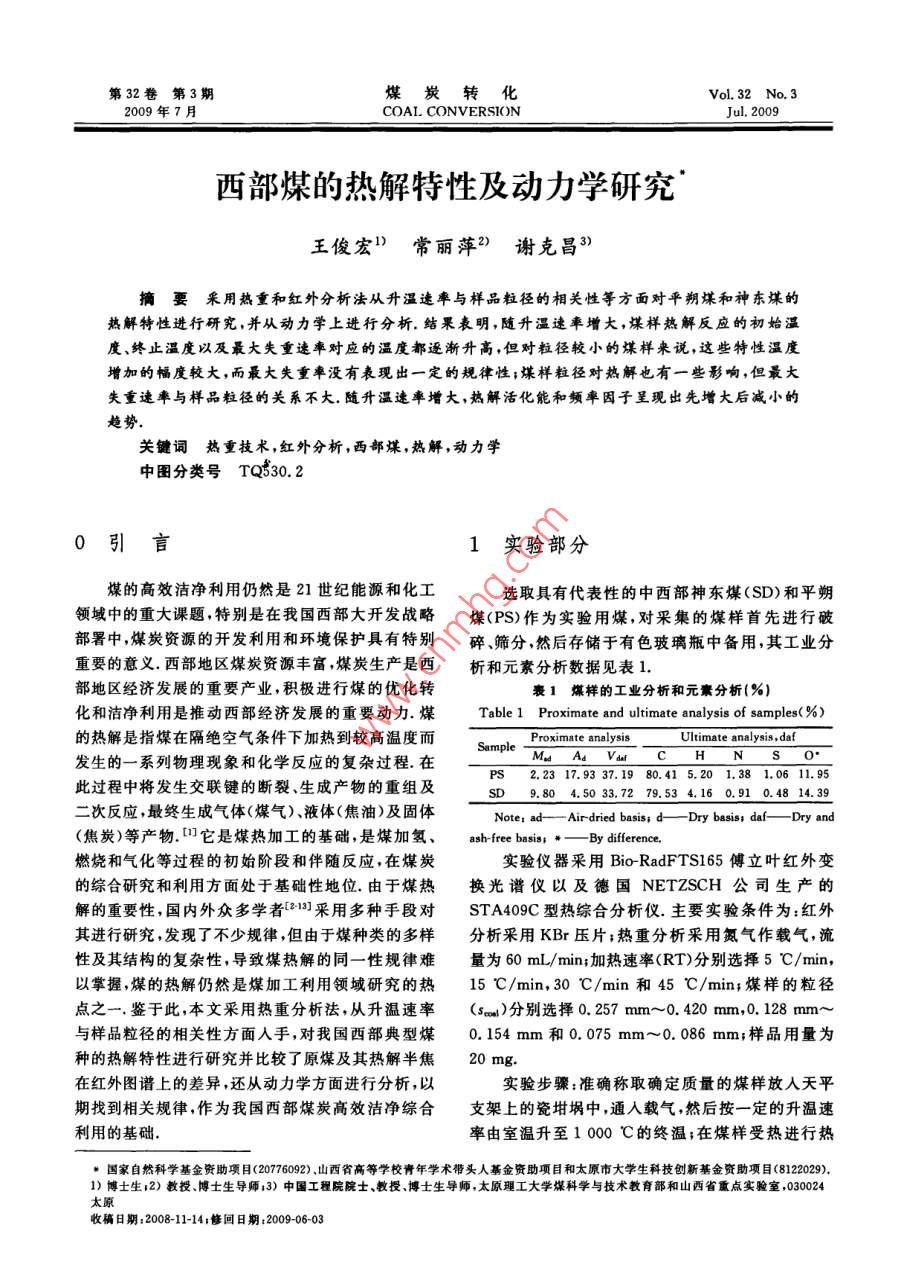 第32卷第3期煤炭轉(zhuǎn)化Vol, 32 No. 32009年7月COAL CONVERSIONJul. 2009西部煤的熱解特性及動力學(xué)研究’王俊宏"常麗萍2)謝克昌3)摘要采用熱重和紅外分析法從升溫速率與樣品粒徑的相關(guān)性等方面對平朔煤和神東煤的熱解特性進行研究,并從動力學(xué)上進行分析.結(jié)果表明,隨升溫速率增大,煤樣熱解反應(yīng)的初始溫度、終止溫度以及最大失重速率對應(yīng)的溫度都逐漸升高,但對粒徑較小的煤樣來說,這些特性溫度增加的幅度較大,而最大失重率沒有表現(xiàn)出一定的規(guī)律性;煤樣粒徑對熱解也有一些影響,但最大失重速率與樣品粒徑的關(guān)系不大.隨升溫速率增大,熱解活化能和頻率因子呈現(xiàn)出先增大后減小的趨勢.關(guān)鍵詞熱重技術(shù),紅外分析,西部煤,熱解,動 力學(xué)中圖分類號TQ530. 20引言1實驗部分煤的高效潔凈利用仍然是21世紀能源和化工選取具有代表性的中西部神東煤(SD)和平朔領(lǐng)域中的重大課題,特別是在我國西部大開發(fā)戰(zhàn)略煤(PS)作為實驗用煤,對采集的煤樣首先進行破部署中,煤炭資源的開發(fā)利用和環(huán)境保護具有特別碎、篩分,然后存儲于有色玻璃瓶中備用,其工業(yè)分重要的意義.西部地區(qū)煤炭資源豐富,煤炭生產(chǎn)是西析和元素分析數(shù)據(jù)見表1.部地區(qū)經(jīng)濟發(fā)展的重要產(chǎn)業(yè),積極進行煤的優(yōu)化轉(zhuǎn)表1煤樣的工業(yè)分析和元素分析(%)化和潔凈利用是推動西部經(jīng)濟發(fā)展的重要動力.煤Table 1 Proximate and ultimate analysis of samples( %)的熱解是指煤在隔絕空氣條件下加熱到較高溫度而SampleProximate analysisUltimate analysis,daf發(fā)生的一系列物理現(xiàn)象和化學(xué)反應(yīng)的復(fù)雜過程.在.MAdVatCHNS0*PS2.23 17.93 37.19 80.41 5.20 1.38 1.06 11.95此過程中將發(fā)生交聯(lián)鍵的斷裂.生成產(chǎn)物的重組及SD.80 4.50 33.72 79.53 4.16 0.91 0.48 14.39二次反應(yīng),最終生成氣體(煤氣)液體(焦油)及固體Note: ad-- Airdried basis; d-- -Dry basis; dafDry and(焦炭)等產(chǎn)物.[川它是煤熱加工的基礎(chǔ),是煤加氫、ash- free basis; * 一By dfference燃燒和氣化等過程的初始階段和伴隨反應(yīng),在煤炭實驗儀器采用Bio-RadFTS165 傅立葉紅外變的綜合研究和利用方面處于基礎(chǔ)性地位.由于煤熱換光譜儀以及德國NETZSCH公司生產(chǎn)的解的重要性,國內(nèi)外眾多學(xué)者([:18]采用多種手段對STA409C型熱綜合分析儀.主要實驗條件為:紅外其進行研究,發(fā)現(xiàn)了不少規(guī)律,但由于煤種類的多樣分析采用KBr壓片;熱重分析采用氮氣作載氣,流性及其結(jié)構(gòu)的復(fù)雜性,導(dǎo)致煤熱解的同一性規(guī)律難量為60 mL/ min;加熱速率(RT)分別選撣5 C/min,以掌握,煤的熱解仍然是煤加工利用領(lǐng)域研究的熱15 "C/min,30 C/min和45 C/min;煤樣的粒徑點之一.鑒于此,本文采用熱重分析法,從升溫速率(sn)分別選擇0. 257 mm~0. 420 mm,0. 128 mm~與樣品粒徑的相關(guān)性方面人手,對我國西部典型煤0.154mm和0.075mm~0.086mm;樣品用量為種的熱解特性進行研究并比較了原煤及其熱解半焦20 mg.在紅外圖譜上的差異,還從動力學(xué)方面進行分析,以實驗步驟:準(zhǔn)確稱取確定質(zhì)量的煤樣放人天平期找到相關(guān)規(guī)律,作為我國西部煤炭高效潔凈綜合支架上的瓷坩堝中,通人載氣,然后按一定的升溫速利用的基礎(chǔ).率由室溫升至1 000 C的終溫;在煤樣受熱進行熱.國家自然科學(xué)基金資助項月(20776092) .山西省高等學(xué)校青年學(xué)術(shù)帶頭人基金資助項目和太原市大學(xué)生科技創(chuàng)新基金資助項目(8122029).1)博士生:2)教授、博士生導(dǎo)師:3)中國工程院院士、教授、博士生導(dǎo)師.太原理工大學(xué)煤科學(xué)與技術(shù)教育部和山西省重點實驗室,030024收確日期:2008-11-141修回8期:2009-06-032煤炭轉(zhuǎn)化2009年分解反應(yīng)的同時,熱分析儀在所確定的操作條件下應(yīng)的DTG曲線迅速下降后又迅速上升,說明在此自動采樣,并將采集到的數(shù)據(jù)傳輸給微機,自動繪制階段煤樣的失重速率最大,兩種煤樣最大失重速率出樣品的失重積分曲線和微分曲線,即得到TG所對應(yīng)的溫度都在470 C左右,但神東煤的失重速DTG曲線.率小于平朔煤的失重速率,此時平朔煤的失重率約占總失重率的80%,而神東煤的失重率約占總失重2結(jié)果與討論率的60%.此階段是煤的活潑熱解階段,煤首先解聚成膠質(zhì)體,然后分解,析出大量揮發(fā)分氣體并有焦2.1煤的熱解過程及煤與半焦的紅外譜圍比較油產(chǎn)生,煤變?yōu)榘虢?,有紅外吸收的揮發(fā)組分能夠引起紅外光譜能量的變化,這由圖2的紅外譜圖可以以30C/min的升溫速率對平朔煤及神東煤進看出.此時生成的半焦與原煤的紅外吸收曲線相比,行的熱解反應(yīng)為例說明煤的熱解過程,兩種煤樣受3430cm-1處的羥基吸收峰明顯減弱,說明此時大熱分解的失重曲線和速率失重曲線見圖1;兩種原部分羥基已轉(zhuǎn)化為H2O而釋放出來;2 850 cm~'和煤及其在600C熱解后所生成半焦的紅外吸收曲線2922cm-'處脂肪基團的CH,對稱伸縮振動峰和見圖2.由圖1可以看出,煤的熱分解過程大致可以不對稱伸縮振動峰基本消失,說明此時脂肪基團上的烷基鏈已完全斷開;1 592 cm~'處芳香C一C鍵zTG吸收強度明顯減弱,表明在此階段大部分芳香基團斷鏈,分解為小分子氣體或者轉(zhuǎn)化為焦油排