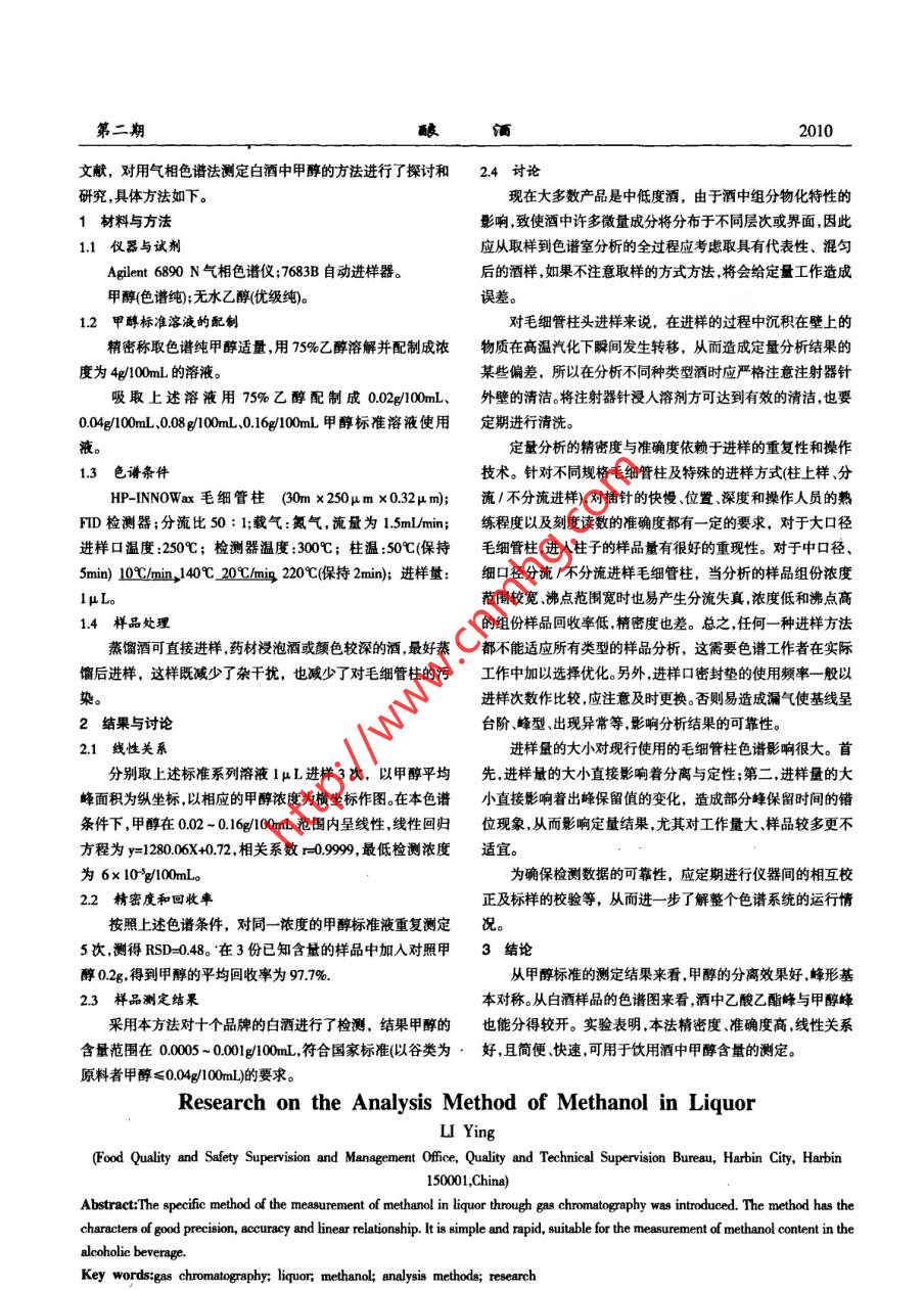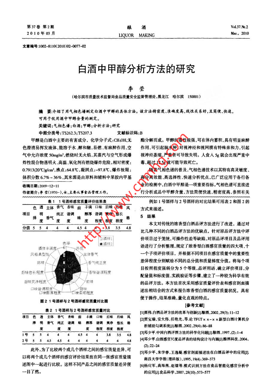 第37卷第2期釀酒VOlL37.N.22010年03月.Mar., 2010LIQUOR MAKING文章編1002-8110202-077-02白酒中甲醇分析方法的研究李瑩(哈爾濱市質(zhì)量技術(shù)監(jiān)督局食品質(zhì)量安全監(jiān)督管理處,黑龍江哈爾濱150001)摘要:介紹了 用氣相色譜測(cè)定白酒中甲醇的具體方法。該方法精密度、準(zhǔn)確度高,線性關(guān)系好,且簡(jiǎn)便、快速,可用于飲用酒中甲醇含量的測(cè)定。關(guān)鍵詞:氣相色譜;白酒;甲醇;分析方法;研究中圖分類(lèi)號(hào):TS262.3;TS207.3文獻(xiàn)標(biāo)識(shí)碼:B甲醇是白酒中主要的有害成分,化學(xué)分子式:CH,0H,無(wú)酯分解而成。甲醇的毒性極強(qiáng),可在體內(nèi)蓄積,具有明顯麻醉色澄清易揮發(fā)液體,能溶于水、醇和醚,易燃.有麻醉作用,空作用,可引起腦水腫,對(duì)視神經(jīng)和視網(wǎng)膜有特殊親和力,引起.氣中允許濃度50mgm'燃燒時(shí)無(wú)火焰,其蒸汽與空氣形成爆視神經(jīng)萎縮,嚴(yán)重者可導(dǎo)致失明。人食人5g就會(huì)出現(xiàn)嚴(yán)重中炸性混合物遇明火、高溫氧化劑有燃燒爆炸危險(xiǎn)。相對(duì)密度:毒,超過(guò)12.5g就可能導(dǎo)致死亡。0.7913(20C)/em',沸點(diǎn):64.8C,凝固點(diǎn): _97.8C ,爆炸極限:隨著氣相色譜的普及,氣相色譜技術(shù)以其特有高靈敏度、體積分?jǐn)?shù)6.7% ~ 36% ,其來(lái)源是由原料和輔料中果膠內(nèi)甲基高分離效能、高選擇性、快速分析優(yōu)點(diǎn),已廣泛應(yīng)用于各行各收稿日期:2009-12-11業(yè)的檢測(cè)中,白酒中甲醇是一項(xiàng)重要指標(biāo)。氣相色譜可直接進(jìn)作者簡(jiǎn)介:李營(yíng)(1970-),女, 主要從事會(huì)品管理工作。行分析成品中甲醇含量,方法簡(jiǎn)便快速,精密度高,參照有關(guān)表11 號(hào)酒樣感官質(zhì)評(píng)價(jià)結(jié)果表例如1號(hào)酒樣與2號(hào)酒樣的對(duì)比結(jié)果可用表2和圖2的色透主體香氣香味前豐滿口昧后味后味風(fēng)方式來(lái)描述。項(xiàng)目;香純正諧味醇厚諧調(diào)夷凈悠長(zhǎng)5結(jié)果“度度度程度程度程度本文對(duì)傳統(tǒng)的濃香型白酒品評(píng)方法進(jìn)行了改進(jìn),通過(guò)對(duì)分值554444.54 3.8 3.5 4.8比幾種不同的白酒品評(píng)方法的優(yōu)缺點(diǎn),針對(duì)原品評(píng)方法中評(píng)石酒樣1]價(jià)項(xiàng)目過(guò)于籠統(tǒng),可操作性差等缺陷,對(duì)原品評(píng)項(xiàng)目及品評(píng)用.色澤■酒樣2]語(yǔ)進(jìn)行了分析整理,規(guī)定了濃香型白酒感官質(zhì)量的四大項(xiàng).十清體豐滿度一6個(gè)>處觀風(fēng)格典型性>主體香氣一個(gè)子項(xiàng)評(píng)價(jià)項(xiàng)目,并根據(jù)不同項(xiàng)目在感官質(zhì)量中的重要性陳味香氣純正度差異程度分別賦給不同的總分值和質(zhì)量梯度分值。將每個(gè)項(xiàng)目按照程度強(qiáng)弱分為5個(gè)等級(jí).品評(píng)用語(yǔ)、確立評(píng)價(jià)項(xiàng)目,分后味悠長(zhǎng)程度香味諧調(diào)程度配量值和標(biāo)度值、實(shí)踐驗(yàn)證等步驟,建立了-種較為科學(xué)有效后味爽凈程度.前味的品評(píng)方法。本方法首次采用感官質(zhì)量評(píng)價(jià)表和感官剖面描口味諧調(diào)程度“甜味述法相結(jié)合的方式來(lái)報(bào)告濃香型白酒的感官質(zhì)量狀況,具有口味醉厚程度一口味 柔順程度便于操作,結(jié)果準(zhǔn)確,量化直觀的特點(diǎn)。圈2 1號(hào)酒樣與2號(hào)酒樣感官質(zhì)對(duì)比圈[參考文獻(xiàn)]表2 1號(hào)酒樣與2號(hào)酒樣感官質(zhì)對(duì)比[1|栗偉.白酒品評(píng)方法的改革與創(chuàng)新|]釀酒,2002, 29(3):11-12目色透主體香氣喬味前豐瀵口味后味后味風(fēng)[2賈寶瑞,安大偉,任艷光,等.論TFCTx x-x x新型白酒計(jì)算機(jī)分澤明香氣純正諧調(diào)味醇厚諧調(diào)爽凈悠長(zhǎng)格析輔助勾調(diào)系統(tǒng)[|小.釀酒, 2002 ,29(4):86-88(3)鄧少平.中國(guó)白酒評(píng)酒方法的科學(xué)化問(wèn)題小.釀酒, 19.,2);142號(hào) 5[4|鄧少平.白酒感官尺度品評(píng)表的結(jié)構(gòu)設(shè)計(jì)與內(nèi)涵|兒釀酒科技,2004,(2):22-24此外,為了比較兩個(gè)或幾個(gè)酒樣之間的感官質(zhì)量差異,可[5]鄧少平,朱學(xué)春,王逸凝感官剖面描述法在白酒品評(píng)中的應(yīng)用辦以將兩個(gè)或幾個(gè)酒樣的感官評(píng)價(jià)結(jié)果放在同- -張感官質(zhì)量描南昌大學(xué)學(xué)報(bào)(理科版), 1995,5 19(4):369 -373述圖中- -起進(jìn)行比較。這樣不同產(chǎn)品之間的感官質(zhì)量差異便[6|楊應(yīng)軍,高海燕,趙鐳等.模式識(shí)別方法在食品智能化感官分析中一目了然。的應(yīng)用J.食品科學(xué),2007.28(1):573. -57777第二期眼酉2010文獻(xiàn),對(duì)用氣相色譜法測(cè)定白酒中甲醇的方法進(jìn)行了探討和2.4討論.研究,具體方法如下。現(xiàn)在大多數(shù)產(chǎn)品是中低度酒,由于酒中組分物化特性的1材料與方法影響,致使酒中許多微量成分將分布于不同層次或界面,因此1.1儀器與試劑應(yīng)從取樣到色譜室分析的全過(guò)程應(yīng)考慮取具有代表性、混勻Agilent 6890 N氣相色譜儀;7683B自動(dòng)進(jìn)樣器。后的酒樣,如果不注意取樣的方式方法,將會(huì)給定量工作造成甲醇(色譜純);無(wú)水乙醇(優(yōu)級(jí)純)。誤差。1.2甲醇標(biāo)準(zhǔn)溶液的配制對(duì)毛細(xì)管柱頭進(jìn)樣來(lái)說(shu