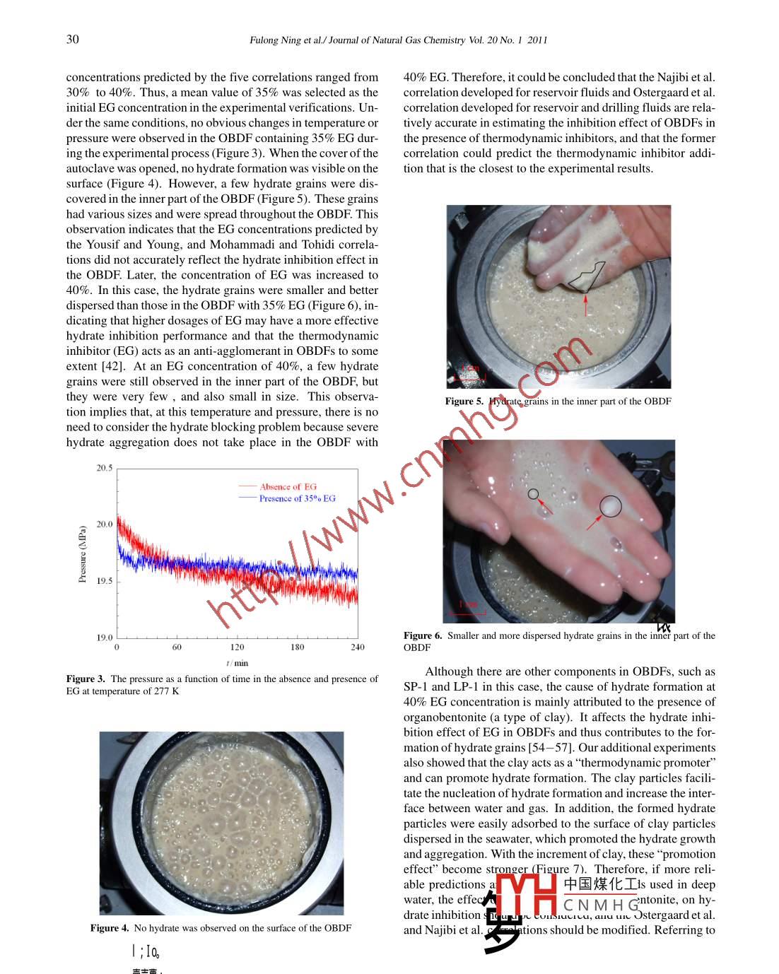 Available online at www.sciencedirect.com| Joumal ofScienceDirect7I Natural GasChemistryEL SEVIERJournal of Natural Gas Chemistry 20(2011)25-33www.elsevier.com/locate/jngcComparison and application of different empirical correlationsfor estimating the hydrate safety margin of oil-baseddrilling fluids containing ethylene glycolFulong Ning1,2*,Ling Zhangl, Guosheng Jiangl*,Yunzhong Tu',Xiang Wu',Yibing Yu'1. Faculty of Engineering, China Universily of Geosciences, Wuhan 430074, Hubei, China;2. Department of Chemistry; Norwegian University of Science and Technology, Trondheim NO-7491, Norway;3. National Laboratory on Scientific Drilling, China University of Geosciences at Beijing, Bejing 100083, ChinaJomd[ Manuscript received October 13, 2010; revised December 19, 2010 ]AbstractAstheoiland! gas idutries contiue to increase thactivity indetp water. a | hydrate hazardsboth at present and in the future. Accurate predictids of the hyprate- free zonChd the suitable addition of salts and/or alcohols in preparingdrilling fluids are particularly important both in prevanting hydnpatcroblsmsanl decreasing the cost of drilling operations. In this paper, wecompared several empirical correlations commonly used o estipa thA ne nhibition effect of aqueous organic and electrolyte solutio$ 1using experiments with ethylene glycol (EG) al a hy ate inhiblc.1hoy that he Najibi et al. correlation (for single and mixetQ[ | 1thermodynamic inhibitors) and the Ostergaard et al. fempirial (reltoind leMt enodynamic inhibitors) are suitable for estimatin V 0|the hydrate safety margin of oil-based drilling fluids (OBDFs) il theptetepee pf thellogynamic hydrate inhibitors. According to the twocorrelations, the OBDF, composed of 1.6 L vaporizin g oil, 2% enpulityih Egqobentonite, 0.5% SP-1, 1% LP-1, 10% water and40% EG, can be safely used at a water depth of up tq 1 900 m. Hdw weryotro nccl urt et tdictions for drilling fluids, the effects of the solidphase, especially bentonite, on hydrate inhibition nled in the application of these two empirical correlations.Key wordsoil-based drilling fluid; gas hydrates; ethylene glycol; inhibition prediction1. Introduction[25,26]. In fact, hydrate formation in offshore drilling opera-tions, which involves both flow assurance and safety, is a sGas hydrate is a crystalline compound formed by waterrious concern in the petroleum industry. If shallow sedimenthat contain natural gas are encountered during deep-watmolecules) under low temperature (normally ≤300 K) anddrilling, this gas will enter the wellbore. Thus, gas hydrateshigh pressure (≥38 bar at 277 K) conditions [1]. Gas hydrates .will be formed easily under low temperature and high pres-became a major concern of the oil and gas industry, the gov-sure conditions. These hydrates will block the pipe, annularernment, and academia when it was found formed in naturalclearance or blowout preventer (BOP), obstruct the movementof the drill string and drilling fluids, and cause serious oper-experienced explosive growth [1]. So far, the research areas ofational and safety problems [27- 29]. Particularly, with thegas hydrates extensively involve flow assurance [3,4], safetyincreasing activity of the oil and gas industries in deep wa-[5], energy sources [6- 8], geological hazards [9,10], carbonter, these hazards will become more serious and challengingcycle and climate change [11,12], carbon dioxide sequestra-at present and in the future. For example, recently the BP oilspill in the Gulf of Mexico, which is the largest offshore spilland transportation [17,18], cool storage application [19,20]in the United States history and among the largest oil spillsand even outer-space hydrates [21,22]. Most of these researchin all history, was not stopped by closing the BOP which wasareas have been referredto in reviews [23,24] and monographsspeculated to be blocked by gas hydrates.“Corresponding author. E-mail: nflzx @ cug edu.cn, jianggs65 @ vip.sina.comThis work is supported by the National Natural Science Foundation (No. 50704028, 50904053), the Praiert 8623 (No 2006A A097 316) and the FundamentalResearch Funds for the Central Universities (No. CUGL1004 10), and also partially supported by the中國煤化Iatory on ScienificDrilling, China University of Geosciences at Beijing (No. NLSD200901).YHCNM HGopyright@201 1, Dalian Institute of Chemical P, ChineAcademy of Sciences. All rights reserved.doi:10.1016/S 10039953(10)60161-226Fulong Ning et al./ Joumal of Natural Gas Chemistry Vol. 20No. 1 2011ation. These works mainly focused on the thermodynamicpipelines uses certain chemical compounds called “hydrate and kinetic characteristics of gas hydrate formation and dis-inhibitors" as additives in pipeline fluids to inhibit the for-sociation in W/O emulsions, and demonstrated that they aremation of gas hydrates. These compounds can be generallydifferent from those in pure water and WBDFs. Few stud-classified as thermodynamic inhibitors and low-dosage hy-ies have been specifically aimed at estimating the inhibitiondrate inhibitors (LDHIs). The LDHIs can be further dividedeffect of thermodynamic hydrate inhibitors in OBDFs andinto kinetic hydrate inhibitors (KHIs) and anti-agglomerantsfurther predicting a suitable amount of salt and/or alcohol to(AAs) [30]. In most cases, thermodynamic inhibitors, suchuse in preparing OBDFs. In our previous work [42], we alsoas salts and alcohols, are added into drilling fluids used inused a large-volume hydrate experimental system to study thedeep- water drilling, but the effects of LDHIs are still undercharacteristics of gas hydrate formation and agglomeration ininvestigation [31-33]. Therefore, accurately predicting theOBDFs and to validate the hydrate shell formation model thathydrate-free zone and adding a suitable amount of salts and/orwas previously proposed by Palermo et al. [43] and Turneralcohols during the preparation of drilling fluids are very im-[44]. In addition, the hydrate inhibition of ethylene glycolp