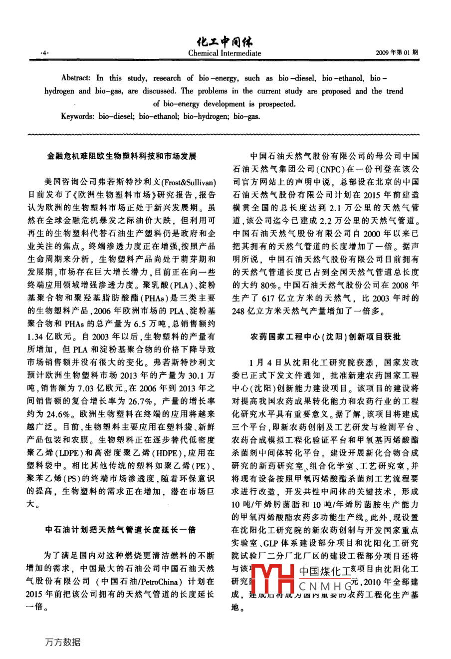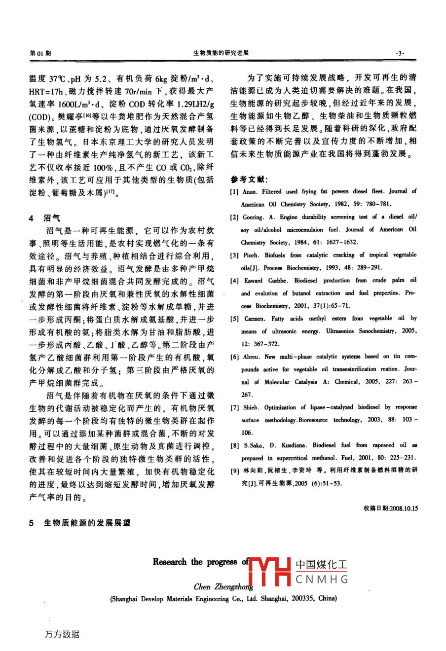 第01期生物質(zhì)能的研究進(jìn)展綜述專論生物質(zhì)能的研究進(jìn)展陳正中(上海迪普材料工程有限公司,上海20035)摘要:介紹了生物質(zhì)能研究現(xiàn)狀包括生物柴油生物乙醇和生物制氫和沼氣4個(gè)方面提出了目前研究中存在的問題展望了今后生物能源的發(fā)展方向關(guān)字:生物柴油;生物乙醉;生物制氫;沼氣中圈分類號(hào)TQ文獻(xiàn)標(biāo)識(shí)碼A文章編號(hào):1672-8114200901-00010隨著世界經(jīng)濟(jì)的快速發(fā)展和人口的迅速增生物柴油的主要制備方法有:直接混合法、微加,大量開采和使用礦物能源帶來的能源短缺和乳液法、高溫裂解法和酯交換法環(huán)境污染問題,已促使人類更多地關(guān)注對(duì)可再生直接混合法就是將天然油脂與柴油或醇類混能源和清潔能源的開發(fā)和利用。尋找新的可替代合直接使用,但產(chǎn)品粘度較高。Anon在柴油中摻能源和開發(fā)可再生能源體系是實(shí)現(xiàn)社會(huì)可持續(xù)發(fā)了95%的回收煎炸油,發(fā)現(xiàn)每運(yùn)行4-415km展的必然選擇就必須更換潤滑油,這是因?yàn)橹参镉偷母哒扯纫锬茉词侵咐蒙锟稍偕霞疤柲芷鹆瞬伙柡统煞值木酆?使?jié)櫥褪艿轿廴径兩a(chǎn)的能源,包括生物質(zhì)能、生物液體燃料及利用質(zhì)。微乳液法是指用植物油、水、乳化劑等配制出生物質(zhì)生產(chǎn)的能源,如燃料酒精、生物柴油、生物乳液,可降低產(chǎn)品粘度。 Goering{2用50%的0#柴質(zhì)氣化及液化燃料、生物制氫、沼氣等。生物能源油,25%的大豆油,20%的正丁醇和5%的乙醇制所需的原料是由能源植物通過光合作用固定二氧成的微乳狀液體系通過了EMA( Engine Manufac化碳和水,將太陽能以化學(xué)能形式儲(chǔ)藏在植物中, turers' Association)200小時(shí)的測試,可以用在柴油是一種可再生的環(huán)保型新能源。因此,開發(fā)生物能機(jī)上代替柴油使用。乳液中正丁醇含量愈高,其粘源是解決能源危機(jī)和保護(hù)生態(tài)環(huán)境的有效途徑。度愈低,分散性愈好。高溫裂解法是指在常壓、快本文主要介紹生物質(zhì)能中具有代表性的生物柴速加熱、超短反應(yīng)時(shí)間的條件下,使生物質(zhì)中的有油、生物乙醇、生物制氫和沼氣的研究進(jìn)展。機(jī)高聚物迅速斷裂為短鏈分子,從而最大限度地獲得燃料油。 Pioch采用熱解的方法以椰子油和1生物柴油棕櫚油為原料,以SiO2/AlAO3為催化劑,在450℃生物柴油是以動(dòng)植物油原料,通過與甲醇進(jìn)裂解。裂解得到的產(chǎn)物分為氣液固三相,其中液相行酯交換生成脂肪酸甲酯而制成的液體燃料。最的成分為生物汽油和生物柴油。分析表明,該生物早的生物柴油由德國聶爾公司發(fā)明,它是以菜籽柴油與普通柴油的性質(zhì)非常相近。高溫?zé)崃呀夥ㄓ蜑樵?經(jīng)提煉而成的潔凈燃油。突出的環(huán)保性所得的主要產(chǎn)品是生物汽油,而生物柴油只是其和可再生性,引起了世界發(fā)達(dá)國家尤其是資源貧副產(chǎn)品。酯交換法是當(dāng)前制備生物柴油的常用方乏國家的高度重視。法,通常使用甲醇和動(dòng)植物油進(jìn)行反應(yīng)而得。根據(jù)反應(yīng)所需的不同催化劑,可將反應(yīng)分為酸催化、堿催中國煤化工 Edward Crabbe以作者簡介陳正中,男,工程師,從事能源方面研究。HSOCNMHG料生產(chǎn)生物柴油通訊聯(lián)系人得到的最優(yōu)永仵是:漢厘溫度為95℃、反應(yīng)時(shí)間9小時(shí)、甲醇與油的摩爾比為40:1、HSO4為5%(質(zhì)化工中間體2Chemical intermediate200年第01期量比),在此條件下的轉(zhuǎn)化率為卯7%。 Stavarache可直接把淀粉發(fā)酵成乙醇。公司用此法獲得約等人用超聲波法,油醇比6:1,堿作催化劑,用92%的理論乙醇產(chǎn)率,由此大大降低了生產(chǎn)成本40kHz的超聲波反應(yīng)10-20分鐘,不需攪拌,所得,而纖維素原料生產(chǎn)燃料乙醇的實(shí)用性關(guān)鍵在產(chǎn)率可達(dá)99%。 Abreu等以Sn(3-羥基-2-甲基-于木糖發(fā)酵,因此找出發(fā)酵的優(yōu)良菌種成了必須4-吡喃酮)2(HO2)2為催化劑,植物油為原料,在首先解決的問題。中國科學(xué)院化工冶金研究所生60℃下反應(yīng)3小時(shí),產(chǎn)率可達(dá)93%,且催化劑經(jīng)回化工程國家重點(diǎn)實(shí)驗(yàn)室的劉健、陳洪章、李佐虎等收后性能沒有減弱。 Shieh以固定化脂肪酶為催篩選出樹干畢赤酵母菌7124木糖發(fā)酵乙醇的優(yōu)化劑,用大豆油進(jìn)行生物柴油的研制,通過五因素良菌種,并優(yōu)化了利用純木糖培養(yǎng)條件。崔凌飛(反應(yīng)溫度、反應(yīng)時(shí)間酶用量、甲醇和大豆油的摩等選用青霉菌研究纖維素酶二級(jí)和三級(jí)液體深層爾比、水用量)的正交試驗(yàn)確定了最佳反應(yīng)條件。發(fā)酵條件,確定了種子液和發(fā)酵液的配方。通過海saka發(fā)現(xiàn)用超臨界甲醇的方法可以使菜籽油在藻酸鈉固定化樹干畢赤酵母菌增殖細(xì)胞,使乙醇4min內(nèi)轉(zhuǎn)化成生物柴油,轉(zhuǎn)化率大于95%。其反發(fā)酵濃度提高到20%,但該技術(shù)尚未進(jìn)人生產(chǎn)階應(yīng)的最佳條件為:反應(yīng)溫度350℃、壓力30MPa、醇段叫。 DuPont公司一直在研究開發(fā)一種由谷物秸油比為421、反應(yīng)時(shí)間為4min。稈與葉制成的復(fù)合糖基質(zhì)進(jìn)行分解的新技術(shù),有以上各種制備方法都有優(yōu)缺點(