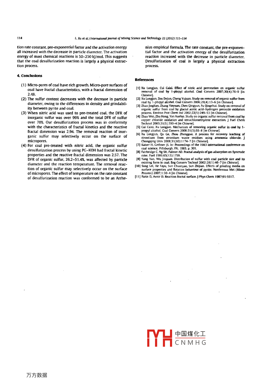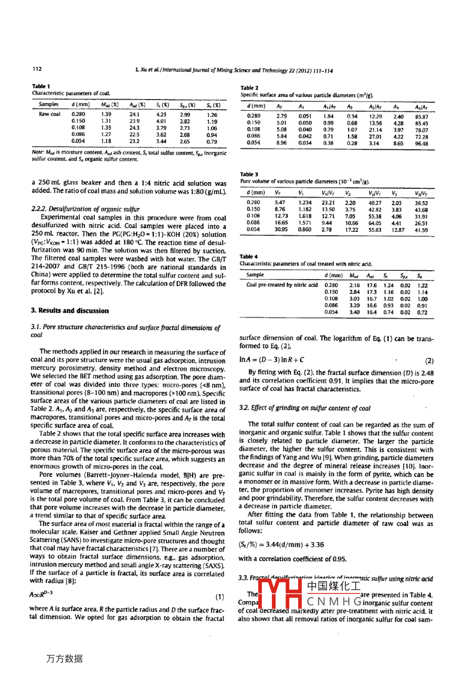 International Joumal of Mining Science and Technology 22(2012)111-114燃到Contents lists available at Sciverse Science Direct氵容International Journal of Mining Science and TechnologyELSEVIERjournalhomepagewww.elsevier.com/locate/ijmstfractal desulfurization kinetics of high-sulfur coalXu Longjun**, Peng Tiefeng a b, Zhang Dingyue Zhang Fukaia.State Key Laboatory of Coai Mine Disaster Dynamos and Control Chongqing University, Chongqing 40004, chinaSChool of Chemical Engineering University of Queensland, Brisbane, QLD 4072, AustraliaARTICLE INFOABSTRACTThe pore structure characteristics of high-sulfur coal from Wansheng in Chongqing have been studiedved 11 May 2011a nitrogen adsorption method(BET) The effects of grinding and prerm 4 June 2011of coal have been investigated. Organic sulfur in coal pretreated with nitric acidAvailable online 9 March 2012was desulfurized by using propylene-glycol-KOH (PG-KOH) Fractal kinetic properties of these twodesulfurization procedures were investigated by using fractal geometric theory. the results show thatoth the specific surface area and pore volume increased with the decrease in particle diameter. TheKeywords:spore surface of coal had fractal characteristics: the fractal dimension was 2. 48. The sulfur contentDesulfurization kineticsdecreased with the decrease in particle diameter by grinding. After pretreatment with nitric acid, thedesulfurization ratio(DFR)of inorganic sulfur increased to over 99% and the DFR of total sulfur to over70%, The desulfurization procedure of inorganic sulfur had fractal kinetic characteristicsctive fracNirric acidtal dimension was 294. The organic sulfur desulfurization procedure by PG-KOH was also tallied withPropylene-plycol-KOHractal kinetic properties: the reactive fractal dimension was 2.57. The effect of temperature on the desul-furcation ratio of organic sulfur can be described with an arrhenius empirical equation. the rateconstant, pre-exponential factor and the activation energy of the reaction increased with the decreasein particle diameterD 2012 Published by Elsevier B V. on behalf of China University of Mining Technology1. Introductiokinetic equation and tuned out to be a physical extraction process[5] Based on desulfurization by using propylene glycol-KOH to getThe coal industry could make an important contribution to sus- rid of organic sulfur, the effects of particle diameter on desulfurizetainable development of the energy resources of some countries. tion ratio and its kinetics were researched in this papHowever high-sulfur coal is not suitable for direct use because itcould lead to serious environmental pollution. Coal desulfurization 2 Samples and methodsprior to usage is a pre-process in order to achieve clean fuel whichcould be used in industry and reduce environmental impacts such 2.1. Preparation of coal samplesas acid rain. Therefore. it is essential to reduce sulfur and mineralmatter(ash) from coal prior to its use in many applications. InOur coal was obtained Igeneral, organic sulfur is fixed in the chemical structure of coal first crushed and groundand then screened. The average particlediam-and often much more difficult to remove than inorganic sulfur. eters(d) of the samples were 0.28, 0.15, 0.108, 0.0855 and 0.054Leaching is one of the mild methods for desulfurization of coal16] The characteristic parameters of coal are listed in Table 1Particle diameter is a basic and significant physical parameterThe chemical reagents were propylene-glycol (PG), potassiumfor coal, which has an important effect on other parameters such hydroxide, MgO Na2 CO3, BaCI, and nitric adid; all were analyticalas specific surface area and geometric shape. On the other hantreagents.its physical structure has a great effect on the desulfurization ratioThe experimental equipment consisted of a Rapid Infrared Coal(DFR)of organic sulfur, so it is useful to study the effect of particle Analyzer 5E-MACIlL, a muffle furnace and an analytical instrumentdiameter on the DFR from a fundamental aspect (1-4).for measuring specific surface areas and pore diameters(MicromIn a kinetic study. Cui and Xu investigated the effect of reaction critics ASAP2010, USA)time on the dfr when the reaction time was less then 90 min thedesulfurization process conformed to an apparent first-order 2.2. Experimental method and determination of DFR中國煤化工or.T:+862365106873h)of coal were removedocquedu. cn(L Xu),YHCN MHGsamples were placed in5-2686/s-see front matter 0 2012 Published by Elsevier B.V. on behalf of China University of Mining Technology112Technolog22(2012)1-114TableTable 2haracteristic parameters of coaL.Specihc surface area of various particle diameters(mig).npls d(mm) Man(8) Aa(s) S,(%) Spa(a) S(3) d(mm) Ar A, A, Ar A2 A,/A, A, A,Raw coal 0.28094325010050099004007926589600340.380283.14sture content, Ae ash content S, total sulfur content spa inorganisulfur content. and S, organic sulfur contentTable 3amL glass beaker and then a 1: 4 nitric acid solution was Pore volume of various particle diameters(10/g).The ratio of coal mass and solution volume was 1: 80(g/mL).123423212.22, Desulfurization of organic sulfurExperimental coal samples in this procedure were from coaldesulfurized with nitric acid, Coal samples were placed into a651.571944250 mL reactor. Then the PG(PG: H20=1: 1)-KOH(20%)solution005430950.8602781722556312874159(VpG: VKOH-1: 1)was added at 180C. The reaction time of desul-furization was 90 min the solution was then filtered by suction.214-2007 and GB/T 215-1996 (both are national standards in Chaiacteristic parameters of coal reated with nitric acidChina)were applied to determine the total sulfur content and suh-Sampld (mm) Mod A S Sps Sfur forms content, respectively the calculation of DFR followed theprotocol by Xu et al. [2].Coal pre-treated by nitric acid 0.280 2.16 17.6 1.24 0.D2 1.223. Results and discussion00863201660930020900543401640.740.023. 1. Pore structure characteristics and surface fractal dimensio