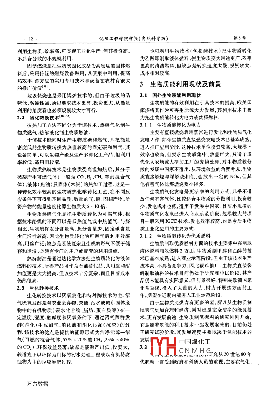 第5卷第1期沈陽工程學(xué)院學(xué)報(自然科學(xué)版)2009年1月Journal of Shenyang Institute of Engineering( Natural Science)Jan.2009生物質(zhì)能及應(yīng)用技術(shù)叢璐,徐有寧,韓作斌(沈陽工程學(xué)院動力工程系,沈陽110136)摘要:概逑了生物質(zhì)能的來源,包括農(nóng)作物秸稈、薪柴、禽畜糞便、城鎮(zhèn)垃圾和工業(yè)有機(jī)廢棄物等;與常規(guī)能源相比的特性如可再生性、潔凈性和溫室氣體CO2零排放效應(yīng);論述了生物質(zhì)能利用技術(shù)、國內(nèi)外利用現(xiàn)狀及發(fā)展前景,目前世界上生物質(zhì)能開發(fā)利用的前沿技術(shù)以熱解氣化和熱解制油為主,制取液體燃料乙醇的技術(shù)巳進(jìn)入商業(yè)示范階段關(guān)鍵詞:生物質(zhì)能;應(yīng)用技術(shù);熱解;氣化中圖分類號:S216文獻(xiàn)標(biāo)識碼:A文章編號:1673-1603(2009)01-0009-05我國現(xiàn)已初步形成以煤炭為主體,電力為中心,石1.1生物質(zhì)能的來源油天然氣、新能源和可再生能源全面發(fā)展的能源供給在世界能耗中,生物質(zhì)能約占14%,在不發(fā)達(dá)地格局2004年,能源生產(chǎn)總量達(dá)18.5億t標(biāo)準(zhǔn)煤,是世區(qū)占60%以上,全世界約25億人90%以上的生活能界第二大能源生產(chǎn)國;但能源消費總量達(dá)19.7億t標(biāo)源是生物質(zhì)能6準(zhǔn)煤,也是世界上僅次于美國的第二大能源消費生物質(zhì)能資源大致可分為2類—傳統(tǒng)生物質(zhì)能國和現(xiàn)代生物質(zhì)能傳統(tǒng)生物質(zhì)能的利用主要限于發(fā)展從我國的能源消費結(jié)構(gòu)看,煤(占72%)和石油中國家廣義上包括所有小規(guī)模使用的生物質(zhì)能現(xiàn)代(占15%)一直占主導(dǎo)地位口,眾所周知燃燒這些能生物質(zhì)能是可以大規(guī)模用于替代常規(guī)能源的各種生物源會使空氣中CO2、SO2、NOx、粉塵等有害氣體含量質(zhì)能包括林產(chǎn)品廢棄物(工業(yè)性的)、甘蔗渣(工業(yè)性急劇增加,在嚴(yán)重污染環(huán)境的同時也不可避免地帶來的)、城市廢棄物、生物燃料(包括沼氣和能源型作物)次性能源枯竭的災(zāi)難性后果.地球上蘊(yùn)藏的可開發(fā)等利用的煤、石油等化石燃料將分別在200年和30~40我國擁有豐富的生物質(zhì)資源,主要是農(nóng)業(yè)廢棄物年內(nèi)耗竭而天然氣按儲采比也只能用60年時.預(yù)計及農(nóng)林產(chǎn)品加工業(yè)廢棄物、薪柴、人畜糞便、城鎮(zhèn)生活到2010年,我國煤炭可以保障供給,石油供需差額近垃圾等,每年的生物質(zhì)能產(chǎn)量達(dá)6億多t標(biāo)煤,其中可1億t,天然氣缺口約367億m34.我國必須根據(jù)現(xiàn)有開發(fā)為能源的達(dá)3億多t標(biāo)煤能源資源條件,改變能源消費結(jié)構(gòu),在提高能源利用率1)秸稈.秸稈是我國農(nóng)村的傳統(tǒng)燃料,是以種植的同時,尋找、開發(fā)新能源和可再生能源業(yè)為主的農(nóng)業(yè)生產(chǎn)的副產(chǎn)品.目前,每年的秸稈產(chǎn)量約1生物質(zhì)能的來源及特點6.5億t,到2010年將達(dá)7.26億t,相當(dāng)于5億t標(biāo)煤現(xiàn)如今許多地區(qū)廢棄秸稈量逐年增大,已占秸稈產(chǎn)量地球上每年植物光合作用固定的碳達(dá)2×10t、的60%以上,但其中作為能源的秸稈消費量約2.86含能量3×10J,因此,每年通過光合作用貯存在植物億t,而且大多是低效利用方式即直接在柴灶上燃燒,中的太陽能相當(dāng)于全世界每年耗能量的10倍生物質(zhì)轉(zhuǎn)換效率僅為10%~20%.因此,加快秸稈的優(yōu)質(zhì)化能即太陽能以化學(xué)能形式貯存在生物中的一種能量,轉(zhuǎn)換利用勢在必行.是以生物質(zhì)為載體的唯一可再生碳源,它可轉(zhuǎn)化為常2)薪材薪柴屬于森林生長和林業(yè)生產(chǎn)過程提供規(guī)的固態(tài)、液態(tài)和氣態(tài)燃料,如煤、石油和天然氣的生物質(zhì)能源,來源于樹木生長過程中修剪的枝權(quán)、木[5材加中國煤化工柴的薪炭林目前發(fā)收稿日期:2008-10-10HCNMHG作者簡介:叢璐(1981-),女,大連人,助理工程師,碩土徐有寧(1962-),男,沈陽人,教授,博土,主要從事循環(huán)流化床鍋妒燃燒理論研究10沈陽工程學(xué)院學(xué)報(自然科學(xué)版)第5卷達(dá)國家生物質(zhì)資源利用的主要構(gòu)成均以林業(yè)廢棄物和等常規(guī)熱力設(shè)備因此在所有新能源中,生物質(zhì)能與現(xiàn)薪炭林為主許多發(fā)展中國家也依賴薪柴來滿足其對能代工業(yè)化技術(shù)的兼容性最大,不必對已有工業(yè)技術(shù)做源的大量需求,所以應(yīng)制定長期林業(yè)規(guī)劃,合理、有計劃大幅改進(jìn)即可替代常規(guī)能源.地進(jìn)行砍伐與造林,以解決供需矛盾及生態(tài)問題1.2.2潔凈性3)禽畜糞便,禽畜糞便也是一種重要的生物質(zhì)能生物質(zhì)的組成是碳?xì)浠衔?見圖2、表1),與常規(guī)源,其經(jīng)干燥可直接燃燒供應(yīng)熱能,主要是與秸稈混合礦物燃料如石油、煤等的內(nèi)部結(jié)構(gòu)和特性相似,可充分作為沼氣的發(fā)酵原料,起到改善農(nóng)村能源質(zhì)量和生存采用已發(fā)展起來的相同或相近的技術(shù)進(jìn)行處理和利用環(huán)境的作用.目前我國年糞便污水資源量達(dá)1.6億t折合1157.5萬t標(biāo)煤H4)城鎮(zhèn)垃圾.城鎮(zhèn)垃圾主要是由居民生活垃圾,商業(yè)、服務(wù)業(yè)垃圾和少量建筑垃圾等廢棄物構(gòu)成的混合物,成分