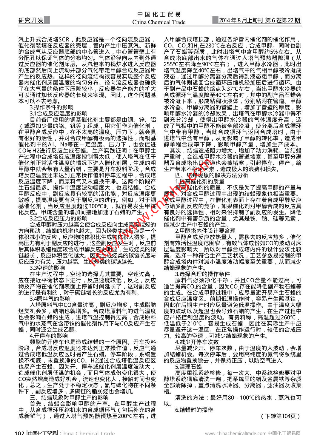 甲醇合成中結(jié)蠟現(xiàn)象的探討