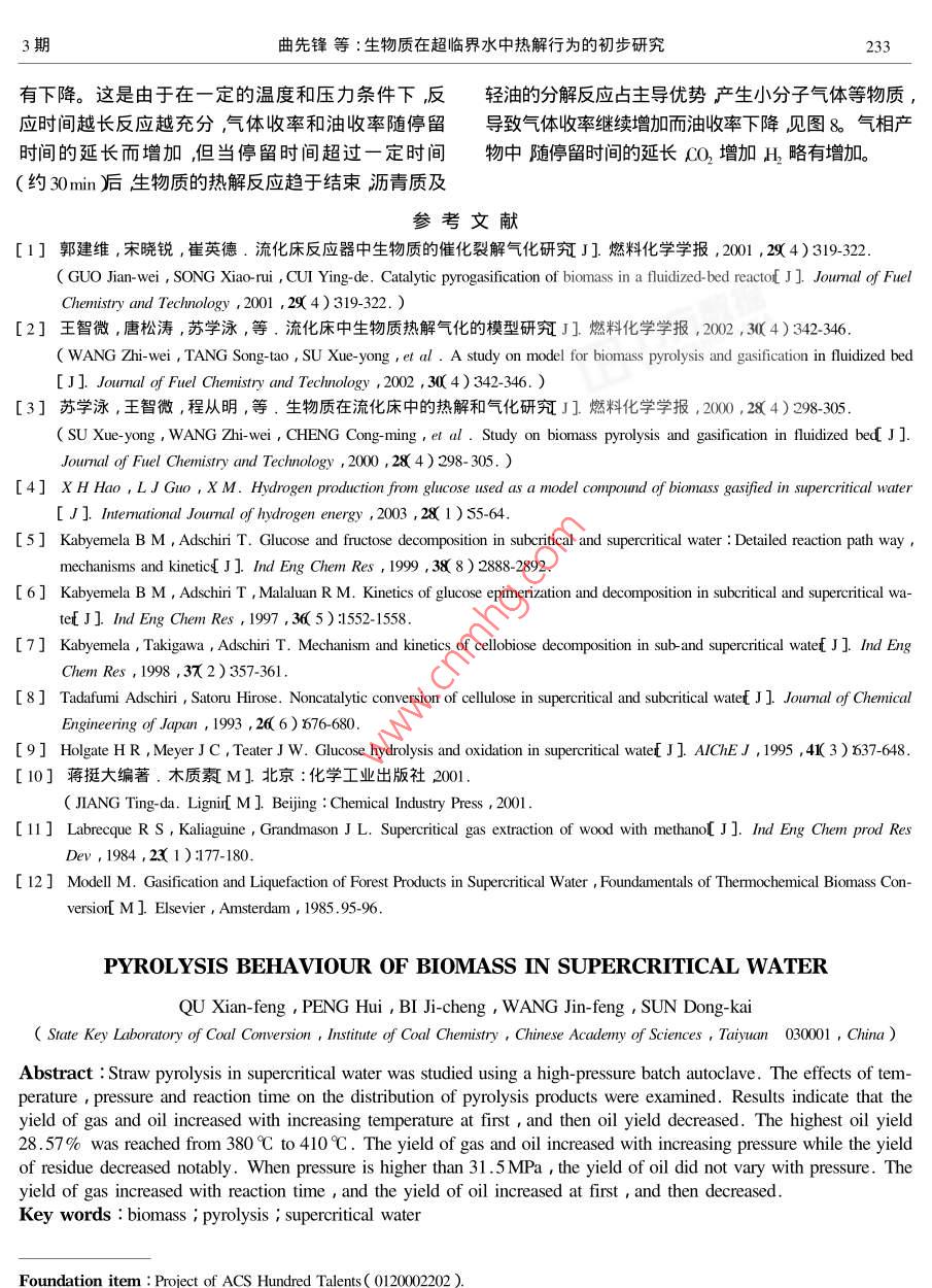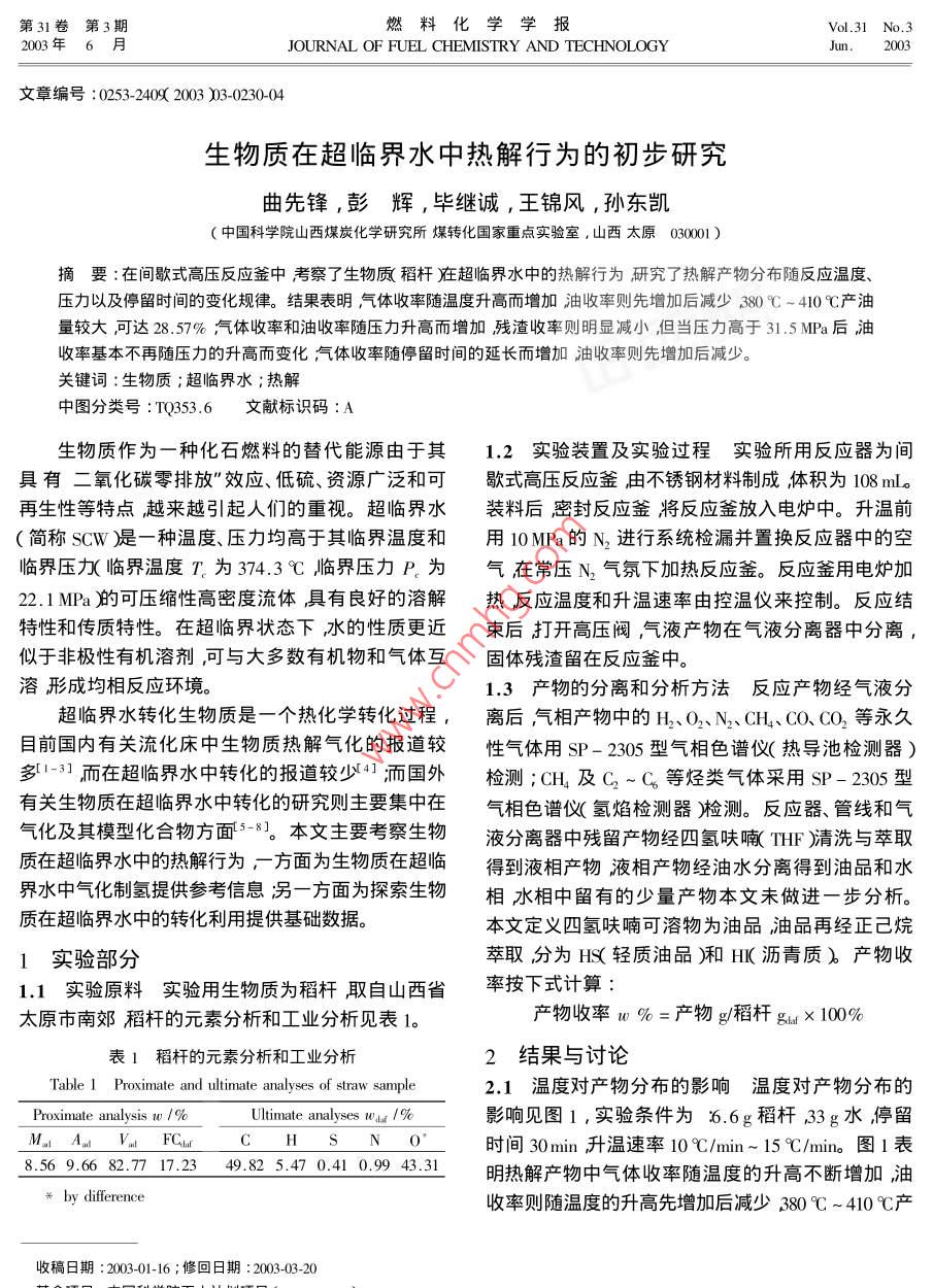 生物質(zhì)在超臨界水中熱解行為的初步研究