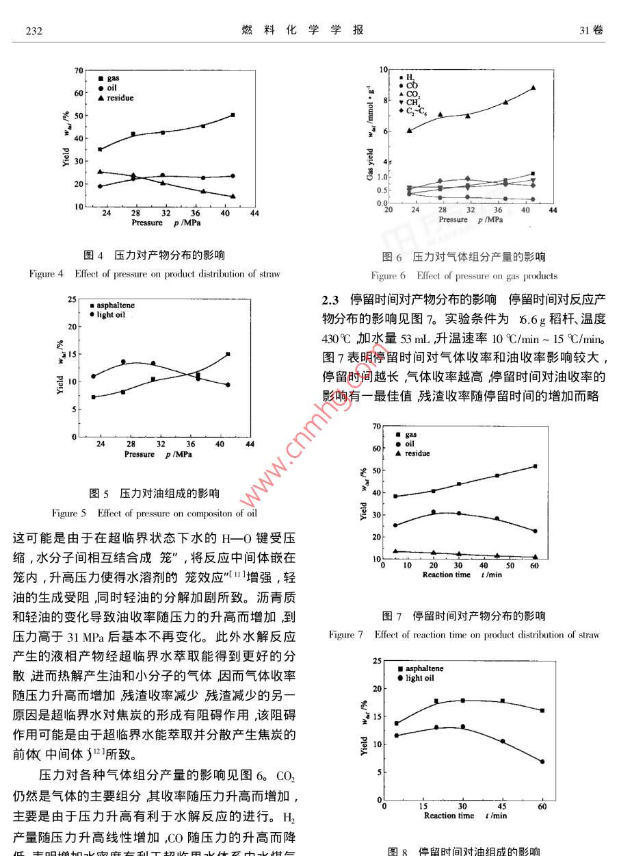 第31卷第3期燃料化學(xué)學(xué)報(bào)Vol.31 No.32003年6月JOURNAL OF FUEL CHEMISTRY AND TBCHNOLOGYJun.2003文章編號(hào):0253-2409 2003 )03-0230-04生物質(zhì)在超臨界水中熱解行為的初步研究曲先鋒,彭輝,畢繼誠,王錦風(fēng),孫東凱(中國科學(xué)院山西煤炭化學(xué)研究所煤轉(zhuǎn)化國家重點(diǎn)實(shí)驗(yàn)室,山西太原030001 )摘要:在間歇式高壓反應(yīng)釜中 考察了生物質(zhì)(稻桿在超臨界水中的熱解行為研究了熱解產(chǎn)物分布隨反應(yīng)溫度、壓力以及停留時(shí)間的變化規(guī)律。結(jié)果表明氣體收率隨溫度升高而增加油收率則先增加后減少380 C ~ 4I0C產(chǎn)油量較大,可達(dá)28.57%氣體收率和油收率隨壓力升高而增加殘?jiān)章蕜t明顯減小,但當(dāng)壓力高于31.5MPa后油收率基本不再隨壓力的升高而變化氣體收率隨停留時(shí)間的延長(zhǎng)而增加油收率則先增加后減少。關(guān)鍵詞:生物質(zhì);超臨界水;熱解中圖分類號(hào):TQ353.6文獻(xiàn)標(biāo)識(shí)碼:A生物質(zhì)作為-種化石燃料的替代能源由于其1.2實(shí)驗(yàn)裝置及實(shí)驗(yàn)過程 實(shí)驗(yàn) 所用反應(yīng)器為間具有二氧化碳零排放"效應(yīng)、低硫、資源廣泛和可歇式高壓反應(yīng)釜由不銹鋼材料制成體積為108 mL。再生性等特點(diǎn),越來越引起人們的重視。超臨界水裝料后密封反應(yīng)釜將反應(yīng)釜放入電爐中。升溫前(簡(jiǎn)稱scw)是一種溫度、壓力均高于其臨界溫度和用10MPa的N2進(jìn)行系統(tǒng)檢漏并置換反應(yīng)器中的空臨界壓力(臨界溫度T。為374.3C臨界壓力P。為.氣在常壓N2氣氛下加熱反應(yīng)釜。反應(yīng)釜用電爐加22.1 MPa )的可壓縮性高密度流體,具有良好的溶解熱反應(yīng)溫度和升溫速率由控溫儀來控制。反應(yīng)結(jié)特性和傳質(zhì)特性。在超臨界狀態(tài)下,水的性質(zhì)更近束后打開高壓閥,氣液產(chǎn)物在氣液分離器中分離,似于非極性有機(jī)溶劑,可與大多數(shù)有機(jī)物和氣體互.固體殘?jiān)粼诜磻?yīng)釜中。溶形成均相反應(yīng)環(huán)境。1.3 產(chǎn)物的分離和分析方法 反應(yīng)產(chǎn)物經(jīng)氣液分超臨界水轉(zhuǎn)化生物質(zhì)是一個(gè)熱化學(xué)轉(zhuǎn)化過程離后,氣相產(chǎn)物中的H、O2、N、CH、CO、CO2等永久目前國內(nèi)有關(guān)流化床中生物質(zhì)熱解氣化的報(bào)道較性氣體用SP- 2305型氣相色譜儀(熱導(dǎo)池檢測(cè)器)多1-31而在超臨界水中轉(zhuǎn)化的報(bào)道較少4]而國外檢測(cè);CH及C2~C等烴類氣體采用SP- 2305型有關(guān)生物質(zhì)在超臨界水中轉(zhuǎn)化的研究則主要集中在氣相色譜儀(氫焰檢測(cè)器)檢測(cè)。反應(yīng)器、管線和氣氣化及其模型化合物方面5-8]。本文主要考察生物液分離器中殘留產(chǎn)物經(jīng)四氫呋喃(THF)清洗與萃取質(zhì)在超臨界水中的熱解行為-方面為生物質(zhì)在超臨得到液相產(chǎn)物液相產(chǎn)物經(jīng)油水分離得到油品和水界水中氣化制氫提供參考信息另- -方面為探索生物相水相中留有的少量產(chǎn)物本文未做進(jìn)-步分析。質(zhì)在超臨界水中的轉(zhuǎn)化利用提供基礎(chǔ)數(shù)據(jù)。本文定義四氫呋喃可溶物為油品油品再經(jīng)正己烷1實(shí)驗(yàn)部分萃取分為HS(輕質(zhì)油品)和H(瀝青質(zhì))產(chǎn)物收1.1實(shí)驗(yàn)原料實(shí)驗(yàn)用生物質(zhì) 為稻桿取自山西省率按下式計(jì)算:太原市南郊稻桿的元素分析和工業(yè)分析見表1。產(chǎn)物收率w %=產(chǎn)物g稻桿8ur x 100%表1稻桿的元素分析和工業(yè)分析2結(jié)果與討論Table 1 Proximate and utimate analyses of straw sample2.1溫度對(duì)產(chǎn)物分布的影響溫度對(duì)產(chǎn)物分布的Proximate analysis w 1%Utimate analyses wad 1%影響見圖1 ,實(shí)驗(yàn)條件為6.6g稻桿 ,33g水停留M.A.VuFCuar__CHs_N0°時(shí)間30min升溫速率10C/min~15C/min。圖1表8.56 9.66 82.77 17.23 49.82 5.47 0.41 0.99 43.31明熱解產(chǎn)物中氣體收率隨溫度的升高不斷增加油* bydifference收率則隨溫度的升高先增加后減少,380 C ~ 410 C產(chǎn)收稿日期: 2003-01- 16 ;修回日期:2003-03-203期曲先鋒等:生物質(zhì)在超臨界水中熱解行為的初步研究231油量較大,可達(dá)28.57%。溫度對(duì)殘?jiān)章视绊懖淮蟆?5p■asphaltene生物質(zhì)的主成分為纖維素、半纖維素和木質(zhì)素,●light oil20|■纖維素、半纖維素是糖類高聚物木質(zhì)素是酚類高聚資物其在亞臨界、超臨界水中主要發(fā)生水解反應(yīng)和熱解反應(yīng)5-8]生物質(zhì)通過水解反應(yīng)主要形成液相產(chǎn)10物(主要為大分子物質(zhì))并且釋放出小分子氣體,而水解產(chǎn)物大分子物質(zhì))可進(jìn)-步經(jīng)過熱解反應(yīng)形成油和一些小分子氣體。低溫時(shí)(亞臨界區(qū)水解反應(yīng)為主反應(yīng)熱解反應(yīng)緩慢,因而油品中的瀝青質(zhì)(大300340380420460Temperature t/C分子物質(zhì)收率高輕油收率低。隨著反應(yīng)溫度的升高亞臨界區(qū)) ,水解反應(yīng)進(jìn)一步增強(qiáng),氣體收率增圖2溫度對(duì)油組成的影響加同時(shí)熱解反應(yīng)加劇導(dǎo)致瀝青質(zhì)收率下降而輕油Figure 2 Efect of temperature on composition of oil收率增加,兩者共同作用的結(jié)果是亞臨界區(qū)內(nèi)氣體收率和油收率隨反應(yīng)溫度的升高而增加。當(dāng)溫度繼續(xù)升高至超臨界溫度區(