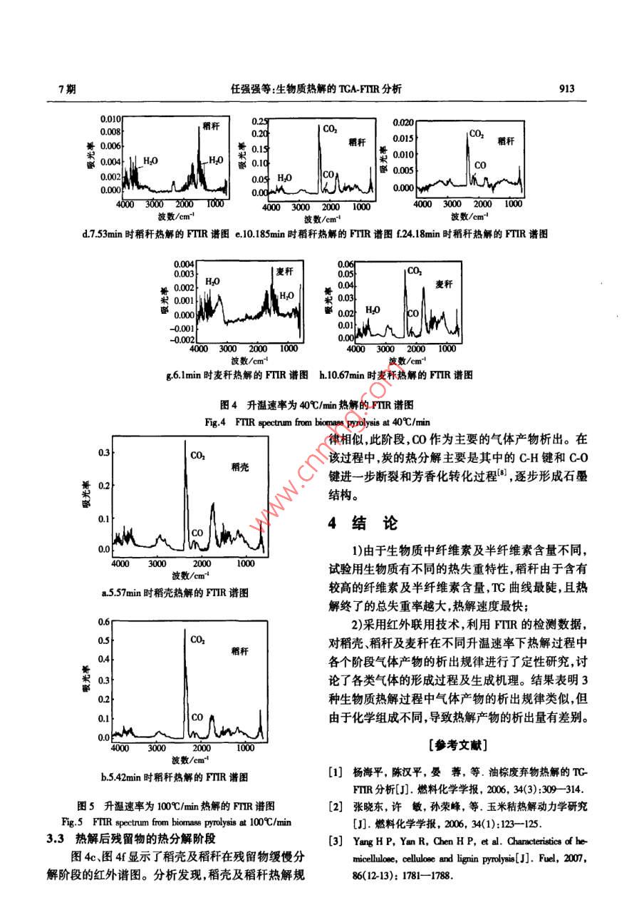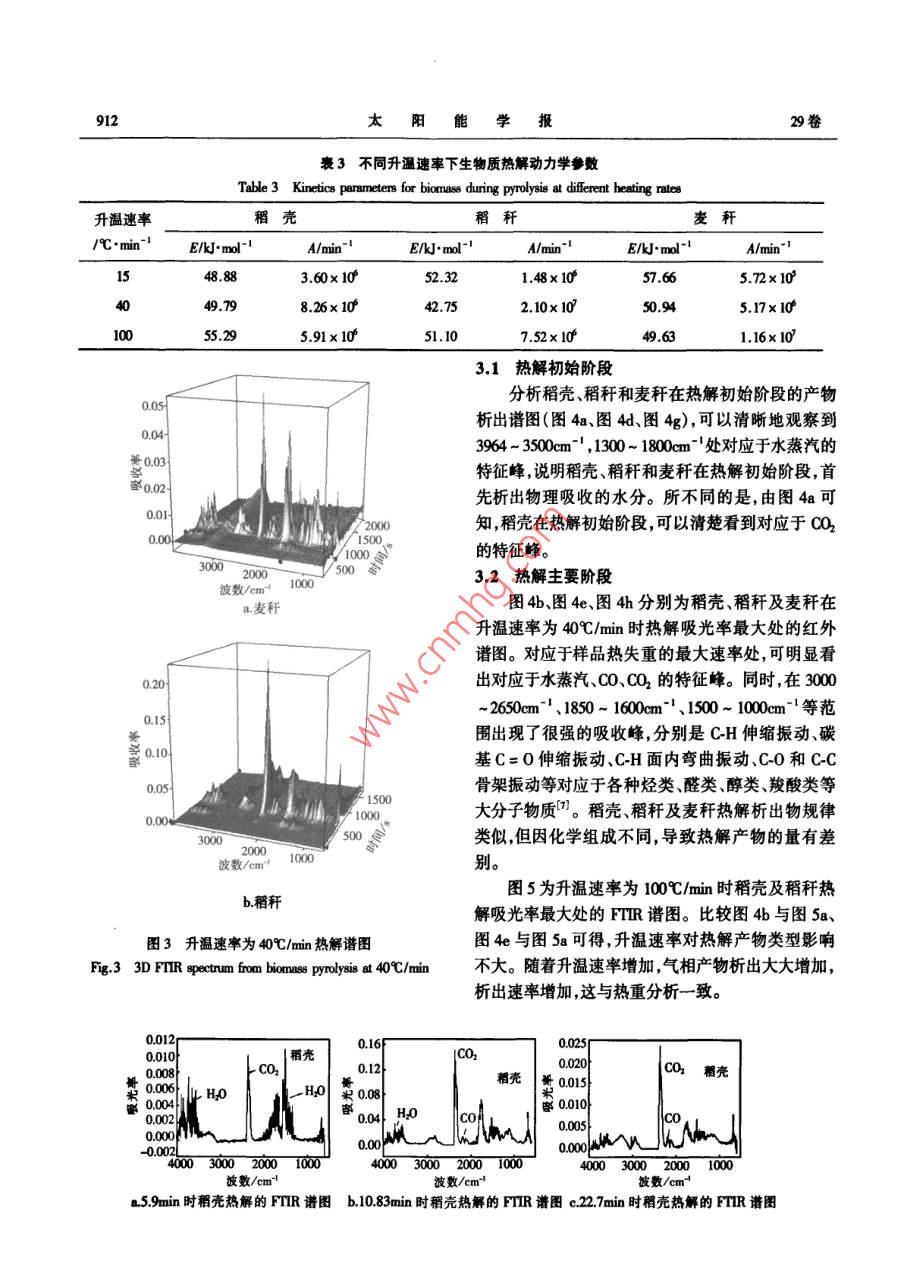 第29卷第7期太陽能學報vd.29,No.72008年7月ACTA ENERGIAE SOLARIS SINICAJl.,2008文章編號:02540096(2008)0701005生物質熱解的 TGA-FTIR分析任強強,趙長遂,龐克亮(東南大學潔凈煤發(fā)電及燃燒技術教育部重點實驗室,南京2100)摘要:基于 TGA-FTIR聯(lián)用技術,在線分析研究稻殼稻稈及麥稈3種典型生物質在不同升溫速率下的熱解特性。分析生物質種類及升溫速率對生物質的熱解動力學參數及熱解產物的影響。研究表明:由于生物質組成不同,其熱失重特性也不同,生物質熱解反應的活化能較低,為40-60kmll;紅外分析表明試驗用生物質熱解過程中產物的析出規(guī)律相似熱解初始階段先析出游離水隨后發(fā)生解豪和脫水反應生成各種烴類、醇類、醛類和酸類等物質。隨后,這些大分子物質又二次降解為一氧化碳為主的氣體產物關鍵詞:生物質;熱重分析;熱解;熱重紅外聯(lián)用中圖分類號:TK6文獻標識碼:A0引言聯(lián)用技術( TGA-FTIR)研究了3種典型生物質(稻殼稻稈及麥稈)在不同升溫速率下的熱解特性及熱解目前國內外對生物質及其組分(纖維素、半纖不同階段產物析出規(guī)律,為其利用提供理論依據。維素及木質素)的熱解動力學規(guī)律已研究了加熱速率、溫度等對熱解過程的影響,建立了秸稈類生物質1試驗的反應動力學方程并提出了相應的熱解機理3。11儀器熱重分析(TA)和傅里葉紅外光諧分析(FTR)聯(lián)用本試驗采用的儀器為法國 SETARAM公司TGA技術不僅可以分析樣品熱解過程的質量變化特性,9型常壓熱重分析儀及德國 BRUKER公司 VECTOR也能對熱解過程中氣體產物的形成和釋放特性進行2型傅里葉變換紅外光譜(FTR)分析儀快速在線分析為低升溫速率下樣品的熱解提供足1.2條件夠的動力學信息。試驗選用稻殼、稻稈及麥稈3種南京產生物質稻稈及麥稈等是我國主要的生物質資源,同時物料粒徑小于02m,其基本性質見表1也是秸稈電廠主要的燃料來源。本文利用熱重紅外表1生物質元素分析及工業(yè)分析Table 1 Proximate and ultimate analysis of biomass元素分析/%(w,ady)試樣工業(yè)分析/%(w,ar甸y)FC [C] [H] [O] [N]/M. kg稻殼98512.3663.3914.4038244.1134.720.580.1414.2868810.5878.544.0037814.7834.630.71l3.596925試驗時,通入80ml/mn的高純N2(>9999%)驗以消除系統(tǒng)誤差。樣品熱解過程中釋放的氣體產作為保護氣,采用3種升溫速率(即15、40及100℃/物由與T直接相連的TR進行在線檢測分析。min),熱解終溫為800℃C,停留時間為10min,試樣質量約為7mg試驗中,熱天平自動記錄重量的變化2生物質熱解特性分析信號。每個試驗完成后,做一個相同條件的空白試圖1為3種生物質在升溫速率為15、40及100/收稿日期:20070202通訊作者:趙長遂(145-),男教授博士生導師主要從事潔凈煤發(fā)電、生物質能利用及大氣污染控制研究。cha@s,d7期任強強等:生物質熱解的 TGA-FTIR分析911min下的熱失重曲線。生物質熱解主要可分為4個階熱分解失重的表現(xiàn)上基本一致。但稻稈的TG曲線段:干燥、預熱、揮發(fā)分析出和碳化。由圖可知,在200最陡且熱解終了的總失重率最大,熱解速度最快,達500℃范圍,稻殼稻稈及麥稈明顯失重有大量氣到最大熱失重率的溫度最低;相反,稻殼的TG曲線體(包括焦油)析出,物料重量急劇下降最緩,熱解速度最慢,達到最大熱失重率的溫度最高。這主要是因為3種生物質中,稻稈的揮發(fā)分含量最高,而稻殼的揮發(fā)分含量最低由文獻[5],稻殼與稻稈的化學組成如表2。由表可知,稻稈的纖維素及半纖維素含量明顯高于稻殼中的含量,而稻殼中的木質素含量高于稻稈中的含量。這也證實了上述結論。衰2原料的化學組成(%Table 2 Chemical constituents of biomass溫度Aa 15C/min試樣纖維素纖維素木質素稻殼28,6稻稈表3所示為試驗條件下稻殼稻稈及麥稈的熱解動力學參數。由表可知,生物質熱解反應的表觀活化能E較低,為40~60k·ml-,這說明生物質的熱解反應較易進行。3生物質熱解FTIR分析200400600800溫度℃圖2、圖3分別為稻殼、稻稈和麥稈熱解的紅外b40%/譜圖。由圖分析可知,生物質熱解大部分氣體的集中在200~500℃這一溫度區(qū)間釋放,這與熱重分析的失重趨勢是一致的。由紅外譜圖,可以清楚地看到,稻殼、稻稈和麥稈熱解都存在一個吸光率最大值,這是與樣品熱失重的最大速率相對應的,是熱解的主要階段。為此,我們將深入了解生物質在熱解不同階段的紅外譜圖。溫度c100℃C/min1-稻殼2-稻稈3-麥稈0.2圖1不同升溫速率下生物質熱重曲線Fig. I TG curves during biomass pyrolysis at different heating rates研究表明6,生物質主要由纖維素、半纖維素及木質素構成,組分的含量對生物質的熱解有較大的影響。在生物質的3種主要化學成分中纖維素300020001000半纖維素分解后主要生成揮發(fā)物,木質素熱解后主要生成碳。圖2升溫速率100℃/mn稻殼熱解譜圖比較3種生物質的T曲線發(fā)現(xiàn),不同生物質在Fg23 D FTIR spectrum from rice husk pyrolysis at00℃/min912太陽能學報29卷豪3不同升溫速率下生物質熱解動力學參數Table 3 Kine稻殼稻稈麥稈/℃·minE/k].molE/kJ·md-E/kmol-lA/min3.60x101.48x10557.66572×10549.7955.29591×107.52x1049.631.16×1073.1熱解初始階段分析稻殼稻稈和麥稈在熱解初始階段的產物析出譜圖(圖4a、圖4d圖4g),可以清晰地觀察到394-3500cm1,1300-1800cm處對應于水蒸汽的特征峰,說明稻殼、稻稈和麥稈在熱解初始階段,首先析出物理吸收的水分。所不同的是,由圖4a可知,稻殼在熱解初始階段,可以清