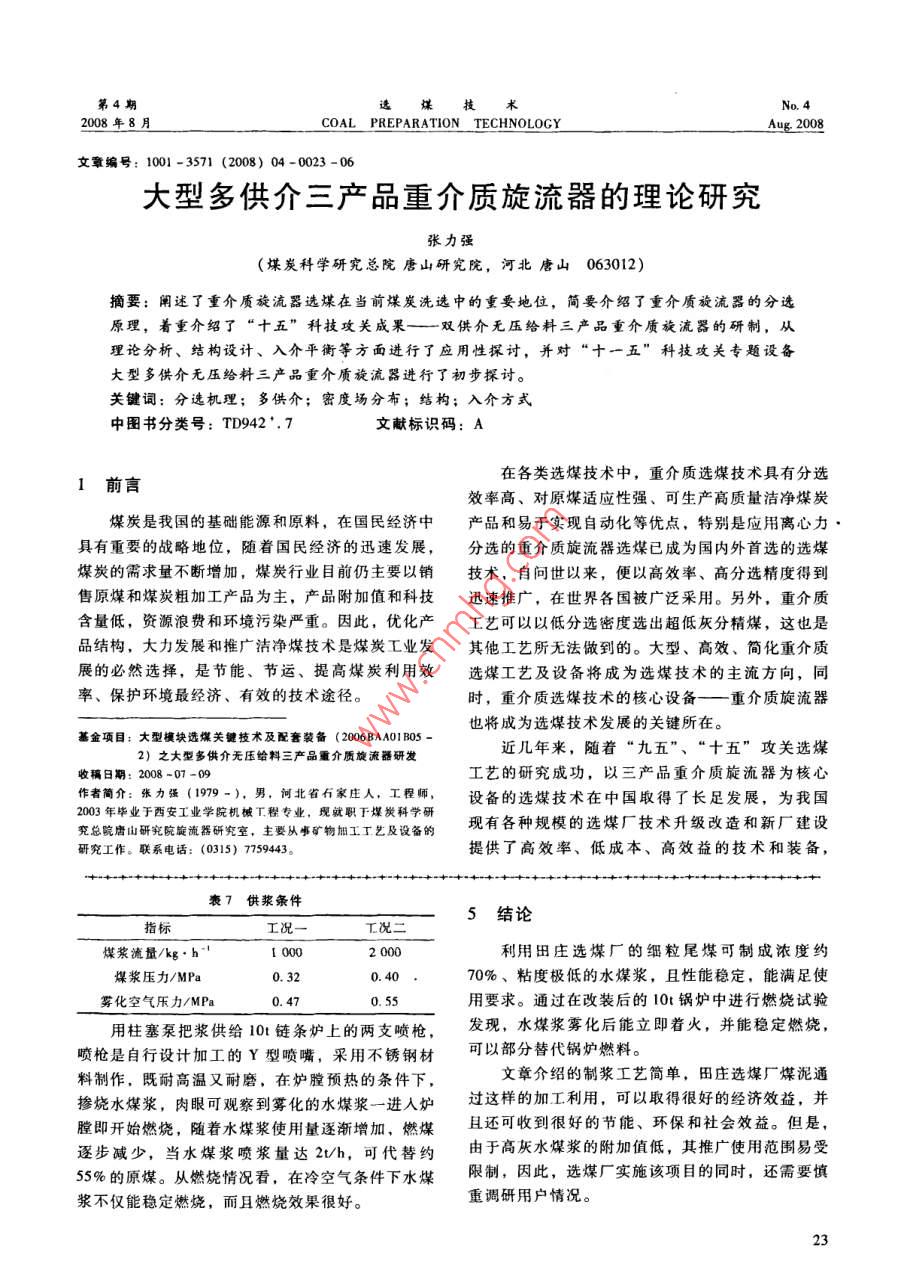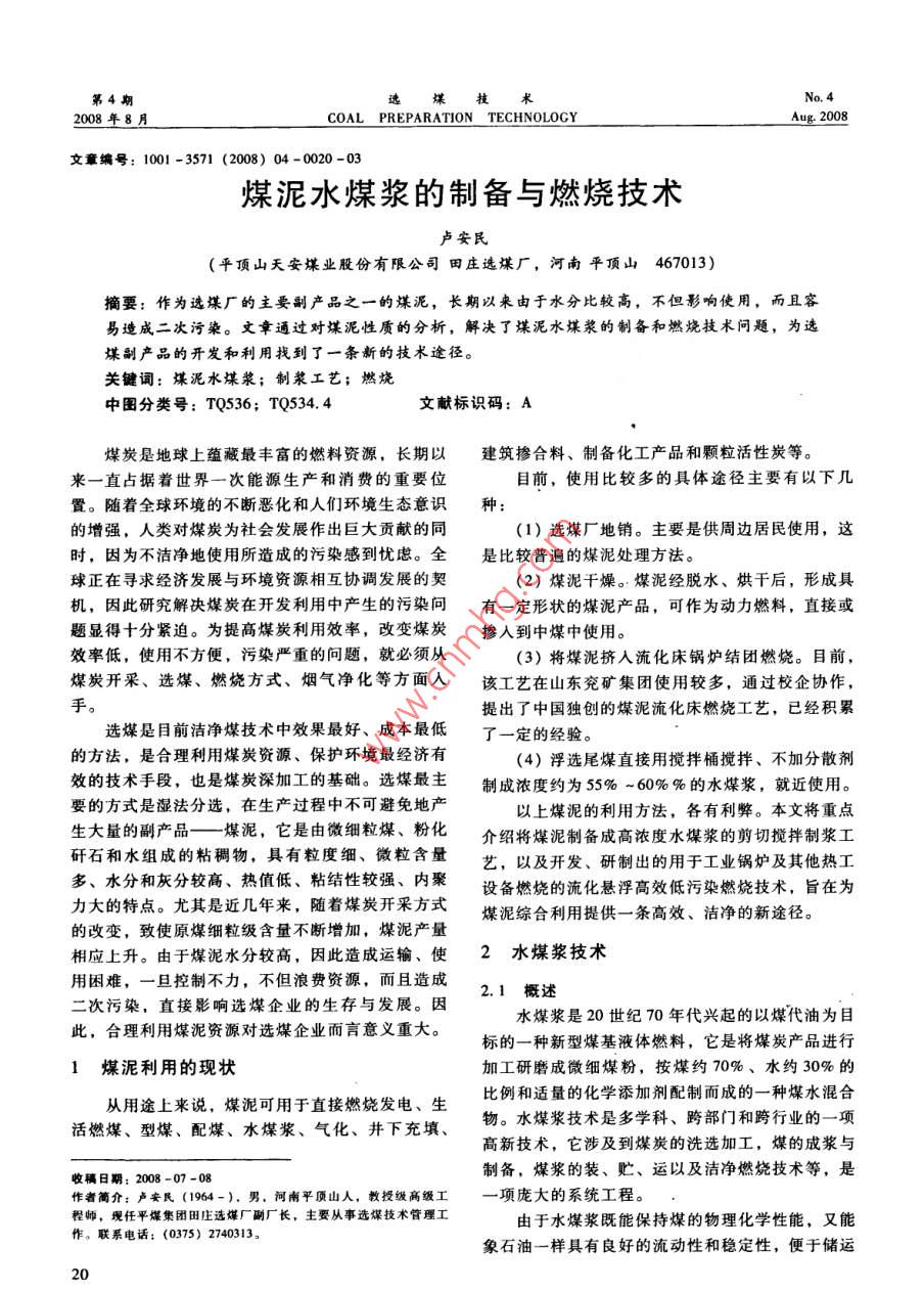 第4期選煤技2008年8月COAL PREPARATION TECHNOLOGYAug 2008文章編號(hào):1001-3571(2008)04-0020-0煤泥水煤漿的制備與燃燒技術(shù)盧安民(平頂山天安煤業(yè)股份有限公司田莊選煤廠,河南平頂山467013)摘要:作為選煤廠的主要副產(chǎn)品之一的煤泥,長(zhǎng)期以來(lái)由于水分比較高,不但影響使用,而且容易造成二次污染。文章通過(guò)對(duì)煤泥性質(zhì)的分析,解決了煤泥水煤漿的制備和燃燒技術(shù)問(wèn)題,為選煤副產(chǎn)品的開(kāi)發(fā)和利用找到了一條新的技術(shù)途徑。關(guān)鍵詞:煤泥水煤漿;制漿工藝;燃燒中圖分類號(hào);TQ536;TQ534.4文獻(xiàn)標(biāo)識(shí)碼:A煤炭是地球上蘊(yùn)藏最豐富的燃料資源,長(zhǎng)期以建筑摻合料、制備化工產(chǎn)品和顆?;钚蕴康?。來(lái)一直占據(jù)著世界一次能源生產(chǎn)和消費(fèi)的重要位目前,使用比較多的具體途徑主要有以下幾置。隨著全球環(huán)境的不斷惡化和人們環(huán)境生態(tài)意識(shí)種:的增強(qiáng),人類對(duì)煤炭為社會(huì)發(fā)展作出巨大貢獻(xiàn)的同(1)選煤廠地銷。主要是供周邊居民使用,這時(shí),因?yàn)椴粷崈舻厥褂盟斐傻奈廴靖械綉n慮。全是比較普遍的煤泥處理方法。球正在尋求經(jīng)濟(jì)發(fā)展與環(huán)境資源相互協(xié)調(diào)發(fā)展的契(2)煤泥干燥。煤泥經(jīng)脫水、烘干后,形成具機(jī),因此研究解決煤炭在開(kāi)發(fā)利用中產(chǎn)生的污染問(wèn)有一定形狀的煤泥產(chǎn)品,可作為動(dòng)力燃料,直接或題顯得十分緊迫。為提高煤炭利用效率,改變煤炭摻人到中煤中使用。效率低,使用不方便,污染嚴(yán)重的問(wèn)題,就必須從(3)將煤泥擠入流化床鍋爐結(jié)團(tuán)燃燒。目前,煤炭開(kāi)采、選煤、燃燒方式、煙氣凈化等方面入該工藝在山東兗礦集團(tuán)使用較多,通過(guò)校企協(xié)作,提出了中國(guó)獨(dú)創(chuàng)的煤泥流化床燃燒工藝,已經(jīng)積累選煤是目前潔凈煤技術(shù)中效果最好、成本最低了一定的經(jīng)驗(yàn)。的方法,是合理利用煤炭資源、保護(hù)環(huán)境最經(jīng)濟(jì)有(4)浮選尾煤直接用攪拌桶攪拌、不加分散劑效的技術(shù)手段,也是煤炭深加工的基礎(chǔ)。選煤最主制成濃度約為55%-60%%的水煤漿,就近使用。要的方式是濕法分選,在生產(chǎn)過(guò)程中不可避免地產(chǎn)以上煤泥的利用方法,各有利弊。本文將重點(diǎn)生大量的副產(chǎn)品—一煤泥,它是由微細(xì)粒煤、粉化介紹將煤泥制備成高濃度水煤漿的剪切攪拌制漿工矸石和水組成的粘稠物,具有粒度細(xì)、微粒含量藝,以及開(kāi)發(fā)、研制出的用于工業(yè)鍋爐及其他熱工多、水分和灰分較高、熱值低、粘結(jié)性較強(qiáng)、內(nèi)聚設(shè)備燃燒的流化懸浮高效低污染燃燒技術(shù),旨在為力大的特點(diǎn)。尤其是近幾年來(lái),隨著煤炭開(kāi)采方式煤泥綜合利用提供一條高效、潔凈的新途徑。的改變,致使原煤細(xì)粒級(jí)含量不斷增加,煤泥產(chǎn)量相應(yīng)上升。由于煤泥水分較高,因此造成運(yùn)輸、使2水煤漿技術(shù)用困難,一旦控制不力,不但浪費(fèi)資源,而且造成二次污染,直接影響選煤企業(yè)的生存與發(fā)展。因2.1概述水煤漿是20世紀(jì)70年代興起的以煤代油為目此,合理利用煤泥資源對(duì)選煤企業(yè)而言意義重大。標(biāo)的一種新型煤基液體燃料,它是將煤炭產(chǎn)品進(jìn)行1煤泥利用的現(xiàn)狀加工研磨成微細(xì)煤粉,按煤約70%、水約30%的從用途上來(lái)說(shuō),煤泥可用于直接燃燒發(fā)電、生比例和適量的化學(xué)添加劑配制而成的一種煤水混合活燃煤、型煤、配煤、水煤漿、氣化、井下充填、物。水煤漿技術(shù)是多學(xué)科、跨部門和跨行業(yè)的一項(xiàng)高新技術(shù),它涉及到煤炭的洗選加工,煤的成漿與收稿日期:2008-07-08制備,煤漿的裝、貯、運(yùn)以及潔凈燃燒技術(shù)等,是作者簡(jiǎn)介:盧安民(1964-).男,河南平頂山人,教授級(jí)高級(jí)工項(xiàng)龐大的系統(tǒng)工程。程師,現(xiàn)任平煤集團(tuán)田莊選煤廠副廠長(zhǎng),主要從事選煤技術(shù)管理工由于水煤漿既能保持煤的物理化學(xué)性能,又能作。聯(lián)系電話:(0375)2740313象石油一樣具有良好的流動(dòng)性和穩(wěn)定性,便于儲(chǔ)運(yùn)20盧安民:煤泥水煤漿的制備與燃燒技術(shù)8月25和調(diào)整,可以霧化燃燒,提高燃燒效率,降低環(huán)境劑特性、制漿設(shè)備性能和用戶對(duì)水煤漿質(zhì)量要求具有代油、節(jié)能、環(huán)保、綜合利用等多種效等。水煤漿制備的關(guān)鍵技術(shù)有煤種選擇、級(jí)配控制益,因此水煤漿技術(shù)是潔凈煤技術(shù)的重要組成部技術(shù)和添加劑技術(shù)分。同時(shí),我國(guó)豐富的煤炭資源為水煤漿制備在煤原料煤性質(zhì)是確定制漿工藝的基礎(chǔ),煤種不種方面提供了充足、可靠的煤源保證,而水煤漿制同,制漿的難易程度存在很大差異。從確定工藝的備技術(shù)的發(fā)展及各種水煤漿產(chǎn)品的應(yīng)運(yùn)而生又為水角度,要掌握的煤的主要性質(zhì)有:可磨性、粒度組煤漿的應(yīng)用開(kāi)拓了廣闊市場(chǎng)。成、成漿性等。2.2水煤漿制備技術(shù)添加劑技術(shù)在制漿工藝中非常重要,不同的煤水煤漿是一種新型煤基流體燃料,它除了具有種