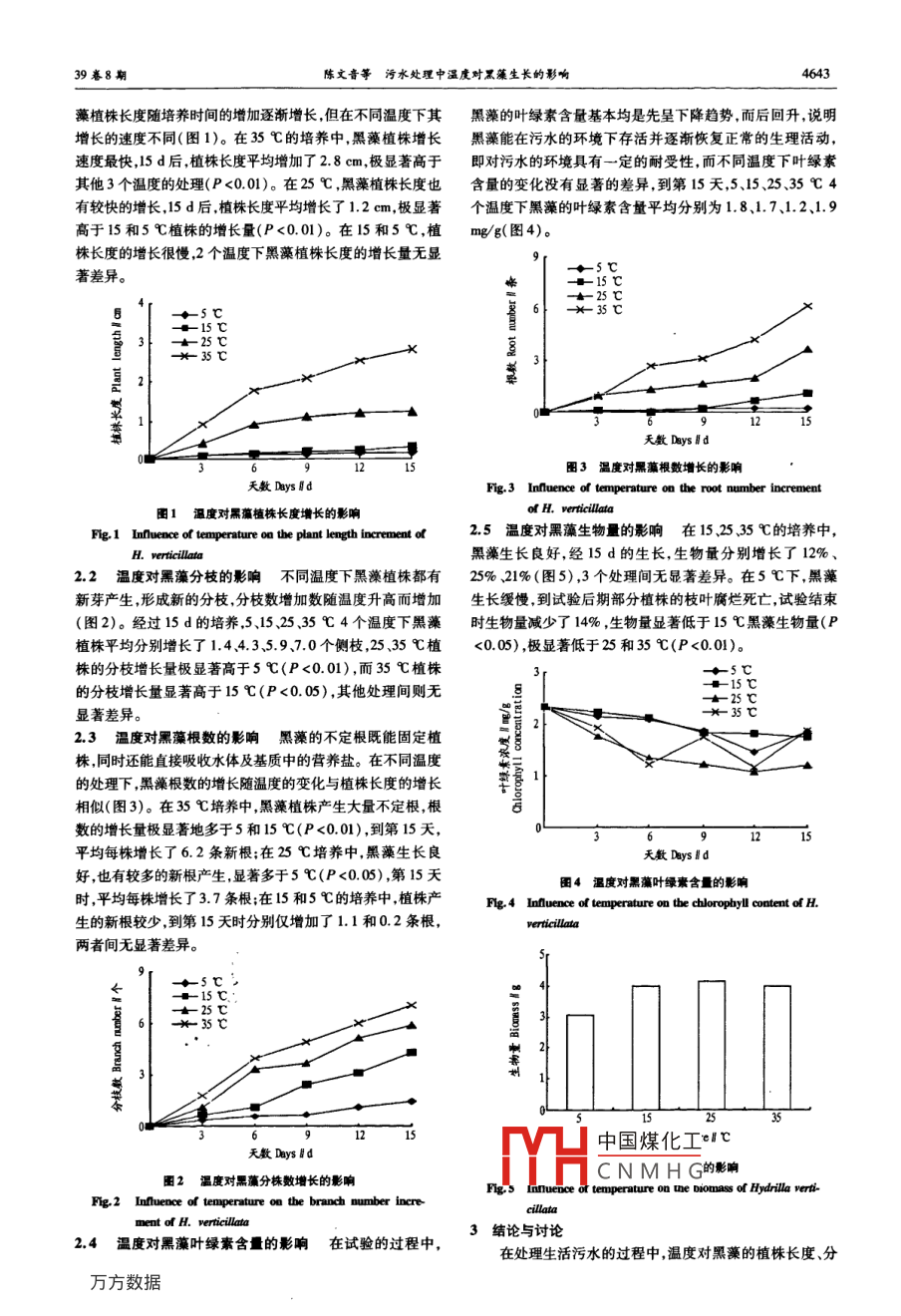 安徽農(nóng)業(yè)科學(xué),Joumal of Anhui Agi. Sci. 2011 ,39(8) :4642 -4644責(zé)任編輯黃小燕責(zé)任校對 盧瑤污水處理中溫度對黑藻生長的影響陳文音',2 ,袁少雄'2,陳章和2*(1.廣州地理研究所,廣東廣州510070;2.華南師范大學(xué)生命科學(xué)學(xué)院.東州510631)摘要[目的]研究污水處理過程中溫度對黑藻生長的影響。 [方法]采用單因素試驗設(shè)計,設(shè)置5.15.25 .35 C4個溫度,觀測在生活污水處理過程中各溫度下黑藻的生長情況。[結(jié)果]在35.25 C中黑藻生長校為旺盛,經(jīng)過15d的培養(yǎng),黑藻的植株長度、分枝數(shù)、根數(shù)以及生物量分別增長了2.8和1.2 cm.7.0和5.9個.6.2和3.7條.21%和25% ,均顯著或極顯著高于5 C下黑藻的生長情況;在15 C的培養(yǎng)中,黑藻的生長較慢,植株長度、分枝數(shù)、根數(shù)增長量高于5 C ,但兩者間無顯著差異。[結(jié)論]在5~35 C ,溫度的升高能促進污水處理過程中黑藻的生長。關(guān)鍵詞黑藻;生活污水;溫度;生 長情況中圖分類號X703文獻標識碼A文章編號0517 -611(2011 )08 -04642 -03Infuence of Temperature on the Growth of Hydrila vericiata in the Wastewater TreatmentCHEN Wen-yin et al ( Guangzhou Geography Institute, Guangzhou, Guangdong 510070)Abstract [ Objective ] The research aimed to study the infuence of temperature on the growth of Hydrilla pericillata in the wastewater treat-ment process. [ Method] By using the single factor experiment, the growth situation of H. verticllata in the different temperatures (5, 15, 25and 35 C) was observed in the treatment process of domestie sewerage. [ Result] H. ericllata grew luxuriantly in 35 and 25 C. After thecultivation of 15 days, the plant length , branch number, root number and biomass of H. terticillata in 35 and 25 C repectively inereased 2.8and 1.2 cm, 7.0 and5.9 branch, 6.2 and3.7 piece, 21% and 25% , which were all significanly higher than that in5 C. In the culivationcondition of 15 C , H. ricllata grew slowly. The increment of plant length, branch number and root number were high than that in5 C,but they had no sigificant difference. [ Conclusion ] During5 -35 C, the higher temperature could promote the growth of H. vericillata inwastewater treatment process.Key words Hyrilla vrticllata; Domestic sewerage ; Temperaure; Growth situation濕地植物是人工濕地系統(tǒng)中重要組成部分,在污水凈化4 個溫度,3次重復(fù)。過程中發(fā)揮了重要的作用"-31 ,沉水植物是濕地植物的一個1.4試驗用水參 照生活污水的濃度人工配制試驗污水,種類,具有較強的凈化能力[4) ,在污水處理中已經(jīng)有一定的配方如表1所示,化學(xué)需氧量( COD。)濃度為100 mg/L, 總研究和應(yīng)用15-9。但目前對沉水植物的研究主要集中在種氮(TN)為20 mg/L,總磷(TP)為2.5 mg/L。灌溉量為10 L, .類的篩選以及凈化污水的效果等方面,對植物在污水凈化過停留時間為15 d。程中的生長,特別是各種環(huán)境因子對其生長的影響的研究還表1人工污水配方門較少。筆者以黑藻為研究對象,研究在污水處理過程中溫度Table 1 The prescription of artincial wastewater對其生長的影響,從而為沉水植物特別是黑藥在污水處理中藥品名稱濃度//mg/L[藥品名稱濃度//mg/L的研究和應(yīng)用提供理論和實踐參考。Reagent nameConcentationReageent nameConcentration1材料與方法乙酸鈉Sodium acetale11.035.0 NaNO,16.01.1 材料與栽培 黑藁( Hydrilla vrticllata (Linn. f. )Royle)又名輪葉黑藻、水王蓀球絲草、燈籠草等,屬于單子蛋白胨Pepone17.556.5葡萄糖Glucoe尿素Urea7.9葉植物綱水鱉科黑藻屬,是一種多年生沉水植物,在我國南北各省的湖泊、池沼、水溝及水流緩慢的河中均有分布([0];1.5 測定方法①株高分枝數(shù)根數(shù):每培養(yǎng)箱中隨機標其適應(yīng)性強,生長迅速,對污染物吸收、富集能力強,具有較記3個植株,每3天測量其株高,計算新增分枝和根的數(shù)量。好的凈化污水能力1-14)。②葉綠素含量:測定采用分光光度法,準確稱取0.1 g黑藻葉試驗所用黑藻取自華南師范大學(xué)生命科學(xué)學(xué)院魚類養(yǎng)片于試管中,加入15 ml丙酮-乙醇(2:1) ,試管加塞放置于殖池中,取其頂枝10 cm,于室外預(yù)培養(yǎng)10d后,移栽于白色20 C培養(yǎng)箱內(nèi),在黑暗條件下提取葉綠素至肉眼觀察葉片塑料箱中,每箱移裁株數(shù)相同,鮮重約50 g,于光照培養(yǎng)箱中完全變白。以提取溶劑作空白,測定葉綠素提取液吸光度培養(yǎng)。Aos和Aas ,利用Amon公式計算提取液中葉綠素濃度,換算1.2 試驗裝置 栽培裝置為白色塑料箱,長33 cm,寬22.5為每克鮮葉葉綠素含量( mg/g)16] ,即葉綠素a濃度( mg/g):cm,高20 cm,底鋪2 cm厚的干凈細沙,構(gòu)成小型污水處理系C. =12.7 Ags-2. 69 As;葉綠素b濃度( mg/g):C, =22.9統(tǒng)。培養(yǎng)箱為PGX-330A-12H光照培養(yǎng)箱。Aas -4. 68 A6s ;葉綠素總濃度( mg/g):C..=C. +C。③生1.3因素水平設(shè)計 采用 單因素試驗設(shè)計研究溫度對黑物量:試驗結(jié)束時收割各培養(yǎng)箱中黑藻,稱鮮重,放入烘箱內(nèi)藻生長的影響。相同光照(4 000lx)下,設(shè)置5.15.25 35 C 80 q1.6中國煤化工和SPSS統(tǒng)計軟件進金項目國家自然科學(xué)基全(30470346);廣 東省自然科學(xué)基金行數(shù)MYHC N M H G準誤,利用單因素方作者簡介陳文音(1982-),女,廣東潮州人, 助理工程師,碩士,從事差分析|7] 進行差異顯著性的檢驗。環(huán)境生態(tài)學(xué)研究?!裢ㄓ嵶髡撸淌?,博士,博士生導(dǎo)師。從2結(jié)果與分析收稿日期2010-12-14事生態(tài)學(xué)和環(huán)境科學(xué)研究,E mail:che