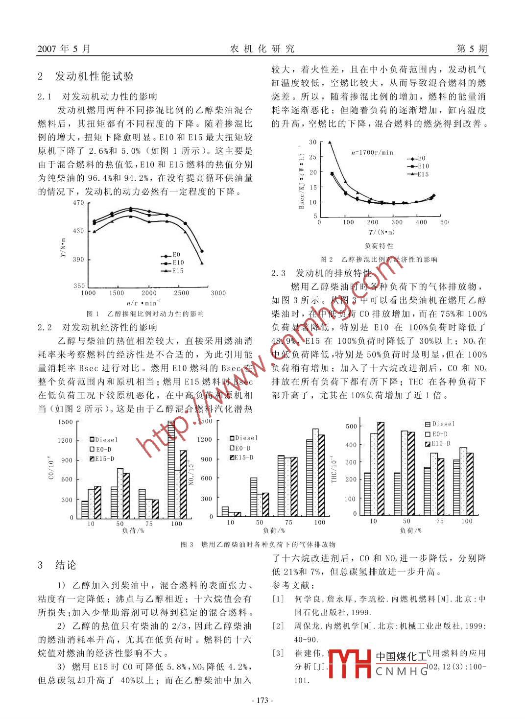 2007年5月農(nóng)機化研究柴油機燃用柴油/乙醇混合燃料的燃燒與排放特性吳小江(江蘇大學,江蘇鎮(zhèn)江212013)摘要:用醇類燃料作為石油的替代燃料是我國解決能源問題的一個重要途徑。為此,重點硏究了摻混10%和15%兩種不同比例乙醇的乙醇柴油混合燃料的主要理化特性,對燃用多種比例乙醇/柴油的柴油機燃燒與排放特性進行了試驗研究。試驗結果表明:混合燃料燃油消耗率較高,對經(jīng)濟性影響不大,加入十六烷改進劑后,C0和NO排放量進一步降低,但總碳氫排放量進一步升高。關鍵詞:能源與動力工程;乙醇/柴油;試驗;柴油機;燃燒;排放中圖分類號:TK428.9文獻標識碼:B文章編號:1003-188X(2007)05-0172-02燃料十六烷值直接影響著柴油機的著火性能0引言較高的十六烷值能夠改善發(fā)動機的冷起動性、降低進入21世紀以來,能源問題一直困擾著整個燃燒噪聲等。♂醇的十六烷值很低,因此柴油在加世界,因此尋找石油替代燃料越來越引起了廣泛的入乙醇后,混合燃料的十六烷值會隨著♂醇摻混比重視。根據(jù)我國生物質(zhì)資源豐富的特點及乙醇的物例的增大而逐漸降低。理化學特性,用醇類燃料作為石油的替代燃料將成1.3混合燃料的粘度和潤滑性我國能源規(guī)劃的重心。目前,各國對乙醇在汽油機柴油機的高壓噴射系統(tǒng)要求燃料具有良好的上的研究已有很多,也比較成熟;但是在柴油機上潤滑性,否則會加劇高壓油泵的偶件磨損,粘度在的研究并不多。定程度上反映了燃料的潤滑性。由于乙醇的粘度乙醇與柴油很難直接互溶。隨著科技的不斷進很低,僅為柴油的1/3左右,因此乙醇柴油混合燃步,各國相繼開發(fā)出低成本添加劑,解決了柴油與料的粘度也有所降低,并且隨著乙醇摻混比例的增乙醇的互溶性、潤滑性、腐蝕性等問題,使乙醇柴加粘度也逐漸下降。油混合燃料的大量應用成為可能。為此,著重研究1.4混合燃料的閃點了摻混10%(E10)和15%(E15)兩種不同比例乙醇閃點指燃料揮發(fā)的蒸汽與空氣形成混合物遇火的乙醇柴油混合燃料的主要理化特性以及燃燒混合源能夠閃燃的最低溫度,用于衡量燃油的揮發(fā)性及易燃料對發(fā)動機動力性、經(jīng)濟性和排放特性的影響燃程度,它影響燃料的運輸、存放和使用過程的安全1混合燃料的性質(zhì)性。乙醇的閃點相當?shù)?柴油的閃點較高,在柴油中加入乙醇后,混合燃料的閃點立即降低,與乙醇閃點1.Ⅰ混合燃料的相溶特性相當接近,它給混合燃料提出了較嚴格的防火要求純乙醇在常溫下理論上能夠以一定比例與無1.5混合燃料的表面張力水柴油互溶;但由于乙醇極強的親水性,當乙醇柴燃料的表面張力影響到燃料的流動性、噴射特油中水含量超過一定比例時混合液很容易分層,而性和霧化質(zhì)量。由于乙醇的表面張力比較小,因此且當溫度降低后乙醇與柴油的互溶性也會變差。在乙醇柴油混合燃料的表面張力隨乙醇摻混比例的増配制10%和15%乙醇柴油混合燃料時,加入了2%的加而減小,有利于改善燃料的噴射霧化效果。助燃劑后,發(fā)現(xiàn)助溶效果明顯,并使混合燃料的分1.6混合燃料的密度層溫度下降了5~~13℃,因此采用助溶劑是解決乙密度是燃料最重要的參數(shù)之一,通??商峁┐疾裼突ト軉栴}的可行途徑些很有用的關于燃油組分、點火質(zhì)量、功率輸出、1.2混合燃料的十六烷值排放煙度等信息。燃油密度越大燃油里的碳原子數(shù)收稿日期:2060-21目越多,意味著輸出功率越大,同時產(chǎn)生碳煙微粒作者簡介:吳小江(1958-),女,江蘇海安人,高級工程師,(E-的可能性也增中國煤化工低,因此混合mail)justxlz@ujs.edu.cn燃料的密度隨HHCNMHG縐勢。1722007年5月農(nóng)機化研究2發(fā)動機性能試驗較大,著火性差,且在中小負荷范圍內(nèi),發(fā)動機氣缸溫度較低,空燃比較大,從而導致混合燃料的燃2.1對發(fā)動機動力性的影響燒差。所以,隨著摻混比例的增加,燃料的能量消發(fā)動杋燃用兩種不同摻混比例的乙醇柴油混合耗率逐漸惡化;但隨著負荷的逐漸増加,缸內(nèi)溫度燃料后,其扭矩都有不同程度的下降。隨著摻混比的升髙,空燃比的下降,混合燃料的燃燒得到改善例的增大,扭矩下降愈明顯。E10和E15最大扭矩較原機下降了2.6%和5.0%(如圖1所示)。這主要是n=1700r/m一E0由于混合燃料的熱值低,E10和El5燃料的熱值分別為純柴油的96.4%和94.2%,在沒有提高循環(huán)供油量的情況下,發(fā)動機的動力必然有一定程度的下降。30040050430T/(N·m)負荷特性90●-E10圖2乙醇摻混比例對經(jīng)濟性的影響E152.3發(fā)動機的排放特性1000150025003000燃用乙醇柴油時時各種負荷下的氣體排放物,如圖3所示。從圖3中可以看出柴油機在燃用乙醇圖1乙醇摻混比例對動力性的影響柴油時,在中低負荷C0排放增加,而在75%和100%2.2對發(fā)動機經(jīng)濟性的影響負荷顯著降低,特別是E10在100%負荷時降低了乙醇與柴油的熱值相差較大,直接采用燃油消48.9%,E15在100%負荷時降低了30%以上;NOκ在耗率來考察燃料的經(jīng)濟性是不合適的,為此引用能中低負荷降低,特別是50%負荷時最明顯,但在100%量消耗率Bsec進行對比。燃用E10燃料的Bsec在負荷稍有增加;加入了十六烷改進劑后,CO和NO整個負荷范圍內(nèi)和原機相當;燃用E15燃料時Bsec排放在所有負荷下都有所下降;THC在各種負荷下在低負荷工況下較原機惡化,在中高負荷和原機相都升高了,尤其在10%負荷增
