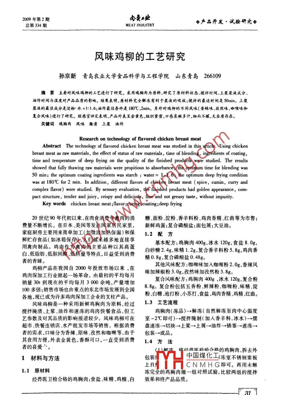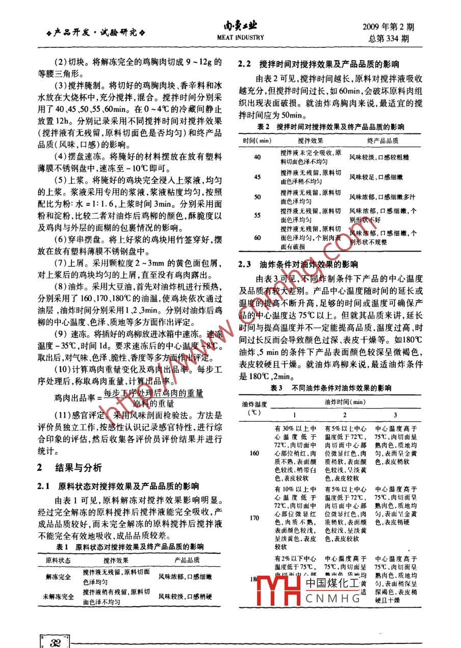 2009年第2期肉′賣◆產(chǎn)品開發(fā)·試驗研究◆總第34期MEAT INDUSTRY風味雞柳的工藝研究孫京新青島農(nóng)業(yè)大學食品科學與工程學院山東青島266109摘要主要對風味雞柳的工藝進行了研究。采用雞胸肉為原料,研究了原材料狀態(tài)、攪拌時間、上漿漿液成分、油炸時間與溫度對產(chǎn)品品質(zhì)的影響。結(jié)果表明,原材料完全解凍有利于漿液的吸收;攪拌的最適時間是50mn。上漿漿液的最佳成分是淀粉:水=l:1.6;油炸最佳條件是180℃,2min。另外對雞柳的不冋風味(香辣味、孜然味、咖喱味和復(fù)合風味)進行了研究。經(jīng)感官評定表明,產(chǎn)品外表呈金黃色,組織緊密,口感柔嫩多汁,細而不膩,無雜質(zhì)存在。關(guān)鍵詞雞胸肉風味腌漬上漿油炸Research on technology of flavored chicken breast meatAbstract The technology of flavored chicken breast meat was studied in this article. Using chickenbreast meat as raw materials, the effect of status of raw materials, time of blending, ingredients of coatingtime and temperature of deep frying on the quality of the finished products were studied. The resultsshowed that fully thawing raw materials were propitious to absorbance; the optimum time for blending was50 min; the optimum coating ingredients was starch: water= 1: 1. 6; the optimum deep frying conditionwas at 180C for 2 min. In addition, different flavors of chicken breast meat( spice, cumin, curry andcomplex flavor) were studied. By sensory evaluation, the finished products had golden appearance, com-pact structure, tender and juicy, crispy and delicious, fine and not greasy taste, without impurity.Key words chicken breast meat; flavor; curing; coating: deep frying20世紀90年代初以來,在肉食消費中禽肉的消糖、面粉、淀粉、香辛料粉、雞肉香精紅曲等為市售;費量不斷增長。在日本、美國等發(fā)達國家居民家里,新鮮雞蛋;復(fù)合磷酸鹽;面包屑;大豆油。家庭廚房主要用來簡單加工(如微波加熱保溫)和保1.2配方鮮貯存食品(如冰箱保存),人們越來越多地直接享用禽肉制品。雞肉作為禽肉的主要品種以其高蛋基本配方:雞胸肉400g,冰水120g,食鹽8.0g,白、低脂肪、低膽固醇、低熱量等特點,日益受到消費白砂糖2.4g,味精1.2g,復(fù)合香辛料粉5.8g,雞肉香者的青睞。精0.8g,復(fù)合磷酸鹽0.48g雞柳產(chǎn)品在我國自2000年投放市場以來,在其他風味配方:咖喱味加入咖喱粉2.0g,香辣風雞肉深加工行業(yè)掀起一場革命。由最初的平均每月味加辣椒粉30g,孜然味加孜然粉38銷量30到現(xiàn)在的平均每月3000余噸,產(chǎn)量增加復(fù)合風味配方:雞胸肉400g,冰水120g,復(fù)合粉100多倍;銷售市場也由重點的東北市場發(fā)展到全國8.8g。復(fù)合粉包括五香粉鮮辣粉、咖喱粉、味精、淀各地,現(xiàn)已成為許多雞肉深加工企業(yè)的支柱產(chǎn)品粉、白糖、泡打粉、小蘇打、食鹽、雞肉香精、雞精紅曲。風味雞柳是一種采用新鮮雞胸肉為原料,經(jīng)過13工藝流程攪拌腌漬、上漿、油炸和速凍的雞肉快餐食品,但工雞胸肉(凍品)→解凍(自然解凍至肉中心溫度藝參數(shù)及對其品質(zhì)的影響報道較少。風味雞柳可在至-2℃即可)→攪拌腌制(加入香辛料,冰水)→擺超市、快餐連鎖店、水產(chǎn)批發(fā)市場等銷售。根據(jù)消費盤速凍→切塊→上漿→上屑→油炸→插簽→速凍→者的需求,口味分為香辣、原味、孜然和咖喱等,由于包裝→成品。其食用方便外表金黃色,香酥可口,一直受到消費1.4方法者的喜愛。解在將級單厙松哈合格的雞胸肉拆去外1材料與方法包裝中國煤化工凍室不銹鋼案板上自CNMHG即可。再用未解1.1原材料凍完全的雞胸肉做一組對照試驗,比較兩組的攪拌經(jīng)獸醫(yī)衛(wèi)檢合格的雞胸肉;食鹽、味精、雞精、白效果和終產(chǎn)品品質(zhì)。31◆產(chǎn)品開發(fā)·試驗研究◆肉賣些業(yè)2009年第2期MEAT INDUSTRY總第334期(2)切塊。將解凍完全的雞胸肉切成9-12g的2.2攪拌時間對攪拌效果及產(chǎn)品品質(zhì)的影響等腰三角形。由表2可見,攪拌時間越長,原料對攪拌液吸收(3)攪拌腌制。將切好的雞胸肉塊、香辛料和冰水放在大燒杯中,充分攪拌,混合。攪拌時間分別采越充分,但攪拌時間過長,如60min,會破壞原料肉組用了40、4550、55、60mn。在0~4℃的冷藏間靜止織出現(xiàn)表面破損。就油炸雞胸肉來說,最適宜的攪放置12h分別記錄采用不同攪拌時間對攪拌效果拌時間應(yīng)為 amino(攪拌液有無殘留,原料切面色是否均勻)和終產(chǎn)表2攪拌時間對攪拌效果及終產(chǎn)品品質(zhì)的影響品質(zhì)(風味,口感)的影響時間(min)攪拌效果終產(chǎn)品品質(zhì)(4)擺盤速凍。將腌好的材料擺放在放有塑料攪拌液未完全吸收原料切面色澤不均勻風味較淡,口感較粗糙薄膜不銹鋼盤中,速凍至-10℃即可攪拌液無殘留,原料切(5)上漿。將腌好的雞塊完全浸入上漿液,均勻面色澤稍不均勻風味較足,口感細嫩的上漿。漿液采用專用的漿液,漿液粘度均勻,按照50攪拌液無殘留,原料切風味濃郁,口感細嫩多汁配比為粉:水=1:1.6,上漿時間3min。分別采用面粉和淀粉,比較二者對油炸后雞柳的顏色,酥脆度以攪拌液無殘留,原料切風味濃郁,口感細嫩,個面色澤均勻別形狀不好及雞肉與外層的面糊的包裹情況的影響。攪拌液無殘留,原料切(6)穿串擺盤。將上好漿的雞塊用竹簽穿好,擺60面色澤均勻,個別肉表風味濃郁,口感細嫩,個放在放有塑料薄膜不銹鋼盤中。面有破損別形狀不規(guī