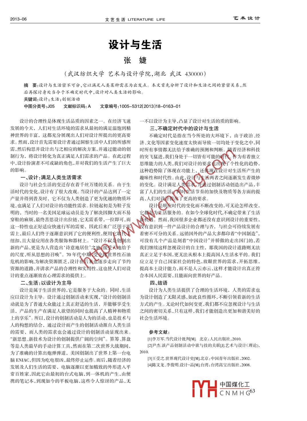 2013- -06文藝生活. LITERATURE LIFE藝術(shù)設(shè)計(jì)設(shè)計(jì)與生活張婕(武漢紡織大學(xué)藝術(shù)與設(shè)計(jì)學(xué)院,湖北武漢430000)商要:設(shè)計(jì)與生活密不可分,它以滿足人類某種需求為出發(fā)點(diǎn)。本文首先分析了設(shè)計(jì)和生活之間的緊密關(guān)系,然后再探討身處當(dāng)今于不確定時(shí)代中,設(shè)計(jì)對(duì)人類生活的影響。關(guān)鍵詞:設(shè)計(jì);生活;創(chuàng)制活動(dòng)中圖分類號(hào):J05文獻(xiàn)標(biāo)識(shí)碼:A文章編號(hào):1005- -5312(2013)18- -0163- -01設(shè)計(jì)的合理性是體現(xiàn)生活品質(zhì)的因素之一。在經(jīng)濟(jì)飛速-不以設(shè)計(jì)為主導(dǎo),凸顯了設(shè)計(jì)對(duì)生活的質(zhì)的影響。發(fā)展的今天,人們對(duì)生活環(huán)境的需求從最初的滿足溫飽到精三、不確定時(shí)代中的設(shè)計(jì)與生活神世界的豐富,這都充分展現(xiàn)出人們對(duì)設(shè)計(jì)所提出的更高要不確定時(shí)代是指在當(dāng)今所處的大環(huán)境下,由于政治、經(jīng)求。然而,設(shè)計(jì)首先需要設(shè)計(jì)者通過洞察生活中人們的所感所濟(jì)、文化等因素變化速度太快而導(dǎo)致一- 切均處于變化之中,同需,然后構(gòu)思并設(shè)計(jì)出與之相應(yīng)的解決方案,并通過能動(dòng)的創(chuàng)時(shí)所有事情都無法給予準(zhǔn)確的預(yù)測和判斷。隨著經(jīng)濟(jì)和科技制行為,將設(shè)計(jì)轉(zhuǎn)化為真正滿足人們需求的產(chǎn)品。在此過程的突飛猛進(jìn),我們身處于一切皆有可能的時(shí)代。作為有著獨(dú)立中,設(shè)計(jì)扮演者不可或缺的角色,并對(duì)我們的生活產(chǎn)生了巨大思維能力的人類,我們對(duì)設(shè)計(jì)的要求也出現(xiàn)了個(gè)性化的趨勢(shì),的影響。這種趨勢(shì)除了體現(xiàn)在功能上,還體現(xiàn)在設(shè)計(jì)對(duì)生活所產(chǎn)生的一、 設(shè)計(jì):滿足人類生活需求趣味性和時(shí)代性。由此,設(shè)計(jì)與生活兩者之間逐漸發(fā)生著微妙設(shè)計(jì)與社會(huì)生活的變遷存在著千絲萬縷的關(guān)系。由于生的變化。設(shè)計(jì)滿足人類需求,并通過創(chuàng)制活動(dòng)創(chuàng)造出產(chǎn)品,豐活時(shí)代的變化,設(shè)計(jì)有了很大改觀。當(dāng)設(shè)計(jì)的產(chǎn)品達(dá)到了一定富了人們的生活;同時(shí)生活節(jié)奏的加快及物質(zhì)等各方面的提產(chǎn)量并得到普及時(shí),它不僅為人類創(chuàng)造了更為優(yōu)越的物質(zhì)環(huán)高,人們對(duì)設(shè)計(jì)提出了更高的要求。境,也滿足了人們對(duì)設(shè)計(jì)的功能性需求。拉鏈起初是為鞋子發(fā)設(shè)計(jì)是順應(yīng)時(shí)代的變化而不斷改變的可無論怎樣改變,明的,當(dāng)時(shí)的一-名美國足球運(yùn)動(dòng)員是為了解決因腳大而不易它都是為生活服務(wù)的。在如今全球化時(shí)代,不確定帶來了生活穿鞋的麻煩,最終苦思設(shè)計(jì)出拉鏈,它無需系帶,- -拉即可,而新機(jī)遇。然而,我國很多企業(yè)都還沒有意識(shí)到設(shè)計(jì)的重要性,這一特性也正好適應(yīng)快速行軍的需要,因此后來廣泛用于軍沒有 意識(shí)到一件產(chǎn)品設(shè)計(jì)的合理與否,與社會(huì)可持續(xù)發(fā)展有需上,最后人們終于逐漸意識(shí)到了它的便利性,便用它取代了著密不可分的關(guān)系。遠(yuǎn)銷國外的產(chǎn)品大多都印著“中國制造”,紐扣,且大量應(yīng)用在各類服飾和器材上。“ 設(shè)計(jì)不僅是創(chuàng)制出可沒有幾個(gè)產(chǎn)品是刻著“中國設(shè)計(jì)”并驕傲的走出國門的,若新的產(chǎn)品,更是為人營造出‘詩意地居住’之地,接受天地給予我們繼續(xù)這樣忽視設(shè)計(jì)的自主性,那我國的設(shè)計(jì)道路則無法的尺度,聽從思想的召喚”。70年代中期,受全球世界性石油真正立足于本國,更無法從根本上提高國人生活水平的。我們危機(jī)的影響,為解決資源匱乏,設(shè)計(jì)在后來也逐步走向了節(jié)約應(yīng)立足于自己國家社會(huì)的特色,放眼世界的需求,開拓思維,資源的道路,并講求產(chǎn)品的合理性和實(shí)用性,這也使人們對(duì)設(shè)提高本土設(shè)計(jì)能力,而不是人云亦云,這樣才能設(shè)計(jì)出真正符計(jì)的重點(diǎn)逐漸放在心理需求的提供上。合本國人民需要,且能面向世界的好產(chǎn)品。二、生活:以設(shè)計(jì)為主導(dǎo)四、結(jié)語設(shè)計(jì)是屬于生活世界的,它是服務(wù)于大眾的。同時(shí),生活設(shè)計(jì)為人類生活提供了合理的生活環(huán)境,人類的需求也應(yīng)以設(shè)計(jì)為主導(dǎo)。設(shè)計(jì)通過創(chuàng)制活動(dòng)來實(shí)現(xiàn),“設(shè)計(jì)的創(chuàng)制活為設(shè)計(jì)創(chuàng)造了無限靈感,如此良性循環(huán),不斷引領(lǐng)著新的生活動(dòng)就是為了普通大眾能過上真正舒適的生活,并能夠享受生方式的產(chǎn)生。無論時(shí)代如何變更,我們都不應(yīng)忽視設(shè)計(jì)與生活活,產(chǎn)品的生產(chǎn)在滿足人欲望的同時(shí)也提高了人精神和物質(zhì)之間的密切關(guān)系,只有這樣,我們才能創(chuàng)造出更加和諧美好的上的享樂”。所以,設(shè)計(jì)的創(chuàng)制活動(dòng)是人為的活動(dòng),也是技