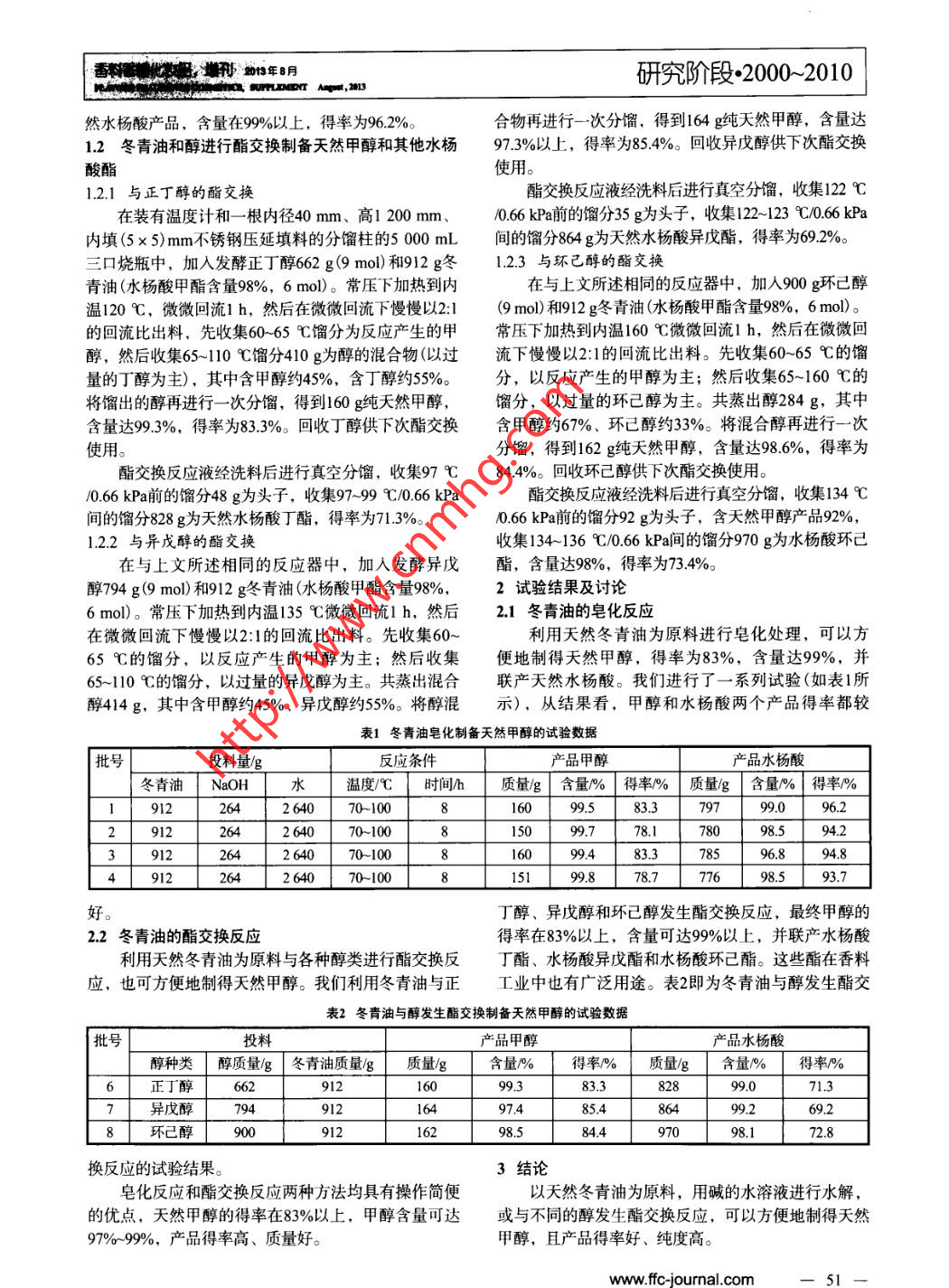 研究階段-2000-2010香料香精化妝品,增刊2013年8月FLAVOUR FRAGRANCE COSMETICS, SUPPLEMENT Augut, 2013一種天然甲醇的新來源作者昆山曼氏集團(tuán)香料開發(fā)中心,江蘇昆山215300谷運(yùn)璀張民錢婉珠摘要天然甲醇是制備天然麥芽酚、桂酸甲酯等許多重要天然香料的原料,目前主要來源于發(fā)酵法制乙醇的頭餾分,但由于該頭餾分中甲醇含量低、成分復(fù)雜,難以分離提純,無法完全滿足市場需要。為尋找可提取甲醇的其他天然產(chǎn)品,經(jīng)探索發(fā)現(xiàn)可從天然冬青油中利用非常簡單的方法提取天然甲醇。關(guān)鍵詞,甲醇冬青油水楊酸甲酯水楊酸皂化酯交換A New Resource for the Manufacture of Natural MethanolGU Yuncui ZHANG Min QIAN Wanzhu(R&D Center of Kunshan Maxim Group, Kunshan 215300, Jiangsu, China)Abstract Natural methanol is an important natural raw material for the manufacture of natural maltol, methyl cinnamate, etc. However,commonly the main resources for the preparation of these products were top fraction of fermented alcohol, as the content of methanol in thisfraction is very low and dificult to separate from its complex substrate, the production couldn't meet the requirement of market. To find outappropriated natural resources for extracting methanol, we investigated and developed a simple method to get it fom natural wintergreen oil.Key words methanol wintergreen oil methyl salicylate salicylic acid saponification ester exchange冬青油在我國是一種資源豐富、價(jià)格低廉的精COOCHCOOR油,它的主要成分為水楊酸甲酯。如果利用冬青油進(jìn)OH ROH,,OH+ CHOH行皂化或酯交換反應(yīng)可以同時(shí)制得天然甲醇以及天然水楊酸或是天然水楊酸的其他酯類。反應(yīng)途徑如圖1和圖2所示。酯交換CO0OCH3COONa圖2以冬青油為原料發(fā)生酯交換反應(yīng)制取天然甲醇的途徑NaOH)H1試驗(yàn)部分1.1冬青油皂化制備甲醇和水楊酸H0 .在裝有溫度計(jì)和一-根內(nèi)徑40 mm、高1 200 mm、內(nèi)填(5 x 5) mm不銹鋼壓延填料的分餾柱的5000 mL|HC三口燒瓶中,加入由264 g氫氧化鈉(6.6 mol)和2 640 g水配成的堿溶液,以及912 g冬青油(水楊酸甲酯含量98%,6 mol)。常壓下加熱回流1 h,然后在2:1~4:1的CooH回流比下出料,收集63- -68 C餾分177 g即為天然甲醇,含量為97%;將它再進(jìn)行- -次分餾,得到160 g純天然甲醇,含量在99%以上,得率為83.3%。皂化皂化液用50%硫酸酸化得到1 200 g水楊酸粗品,圖1以冬青油為 原料發(fā)生皂化反應(yīng)制取天然甲醇或水楊酸的途徑將它用1 200 g 50%乙醇水溶液重結(jié)晶一-次得到797 g天ww.ffc-journal.com.香軒頓優(yōu)裝機(jī)213年8明研究階段●2000~2010然水楊酸產(chǎn)品,含量在99%以上,得率為96.2%。合物再進(jìn)行-次分餾,得到164 g純天然甲醇,含量達(dá)1.2冬青油和醇進(jìn)行酯交換制備天然甲醇和其他水楊97.3%以上,得率為85.4%。回收異戊醇供下次酯交換酸酯使用。1.2.1 與正丁醇的酯交換酯交換反應(yīng)液經(jīng)洗料后進(jìn)行真空分餾,收集122 C在裝有溫度計(jì)和- -根內(nèi)徑40 mm、高l 200 mm、/0.66 kPa前的餾分35 g為頭子,收集122- ~123 C/0.66 kPa內(nèi)填(5 x 5) mm不銹鋼壓延填料的分餾柱的5000 mL間的餾分864 g為天然水楊酸異戊酯,得率為69.2%。三口燒瓶中,加入發(fā)酵正丁醇662 g(9 mol)和912 g冬1.2.3 與環(huán)已醇的酯交換青油(水楊酸甲酯含量98%,6 mo1)。常壓下加熱到內(nèi)在與上文所述相同的反應(yīng)器中,加入900 g環(huán)己醇溫120 C,微微回流1 h,然后在微微回流下慢慢以2:1(9mol)和912g冬青油(水楊酸甲酯含量98%,6mol)的回流比出料,先收集60- 65 C餾分為反應(yīng)產(chǎn)生的甲常壓下加熱到內(nèi)溫160 C微微回流l h,然后在微微回醇,然后收集65~110 C餾分410 g為醇的混合物(以過流下慢慢以2:1的回流比出料。先收集60~65 C的餾量的丁醇為主),其中含甲醇約45%,含丁醇約55%。分,以反應(yīng)產(chǎn)生的甲醇為主;然后收集65~160 C的將餾出的醇再進(jìn)行- -次分餾,得到160 g純天然甲醇,餾分,以過量的環(huán)己醇為主。共蒸出醇284g,其中含量達(dá)99.3%,得率為83.3%?;厥斩〈脊┫麓熙ソ粨Q含甲醇約67%、環(huán)已醇約33%。將混合醇再進(jìn)行一次分餾,得到162 g純天然甲醇,含量達(dá)98.6%,得率為酯交換反應(yīng)液經(jīng)洗料后進(jìn)行真空分餾,收集97心84.4%。回收環(huán)己醇供下次酯交換使用。/0.66 kPa前的餾分48 g為頭子,收集97~99 C/0.66 kPa酯交換反應(yīng)液經(jīng)洗料后進(jìn)行真空分餾,收集134 C間的餾分828 g為天然水楊酸丁酯,得率為71.3%。/0.66 kPa前的餾分92 g為頭子,含天然甲醇產(chǎn)品92%,.1.2.2與異戊醇的酯交換收集134~136 C/0.66 kPa間的餾分970 g為水楊酸環(huán)已在與上文所述相同的反應(yīng)器中,加人發(fā)酵異戊酯,含量達(dá)98%,得率為73.4%。醇794 g(9 mol)和912 g冬青油(水楊酸甲酯含量98%,2試驗(yàn)結(jié)果及討論6 mol)。常壓下加熱到內(nèi)溫135 C微微回流1 h,然后2.1冬青油的皂化反應(yīng)在微微回流下慢慢以2:1的回流比出料。先收集60~利用天然冬青油為原料進(jìn)行皂化處理,可以方65 C的餾分,以反應(yīng)產(chǎn)生的甲醇為主;然后收集便地制得天然甲醇,得率為83%,含量達(dá)99%,并65-110 C的餾分,以過量的異戊醇為主。共蒸出混合聯(lián)產(chǎn)天然水楊酸。我們進(jìn)行了一系列試驗(yàn)(如表1所醇414 g,其中含甲醇約45%、異戊醇約55%。將醇混示),從結(jié)果看,甲醇和水楊酸兩個(gè)產(chǎn)品得率都較表1冬青油皂化制備天然甲醇的試驗(yà