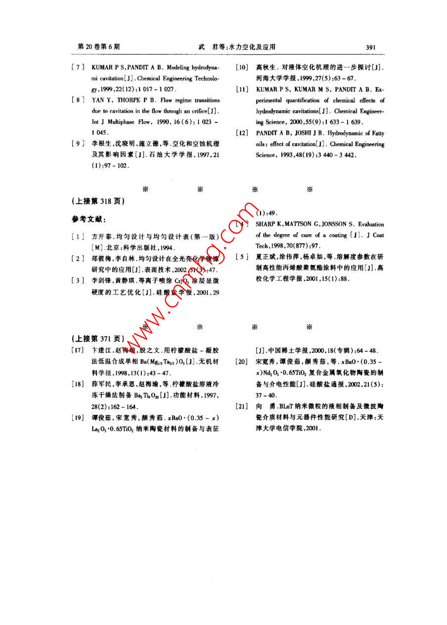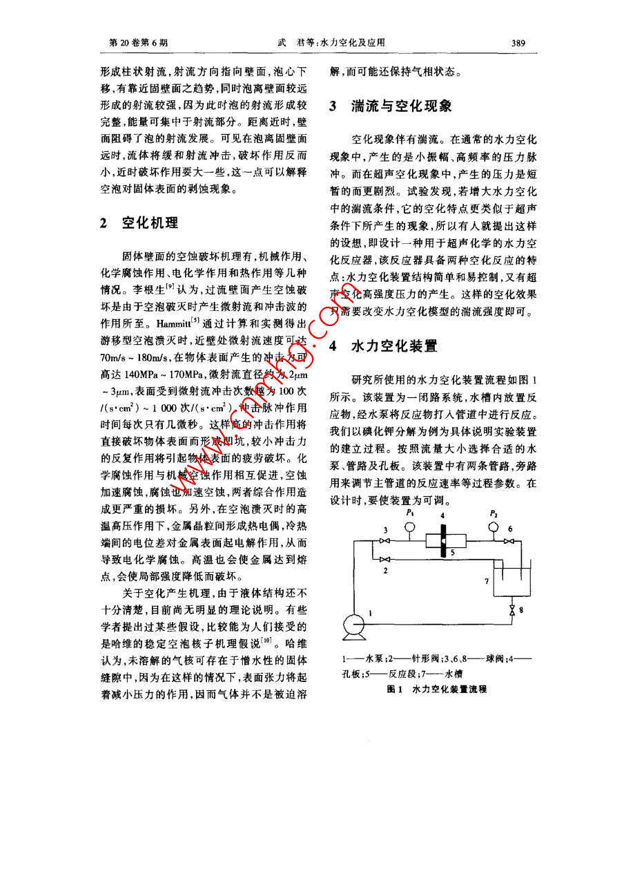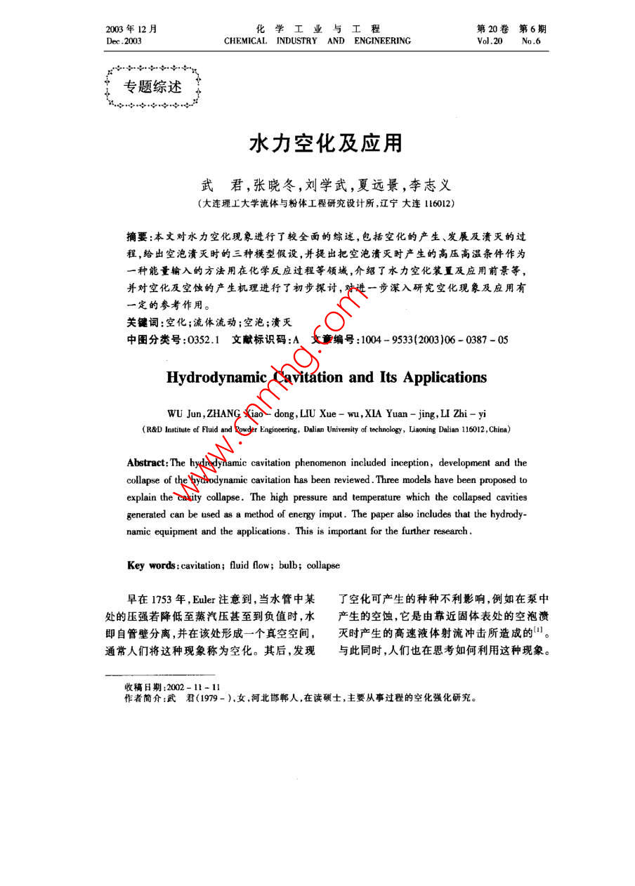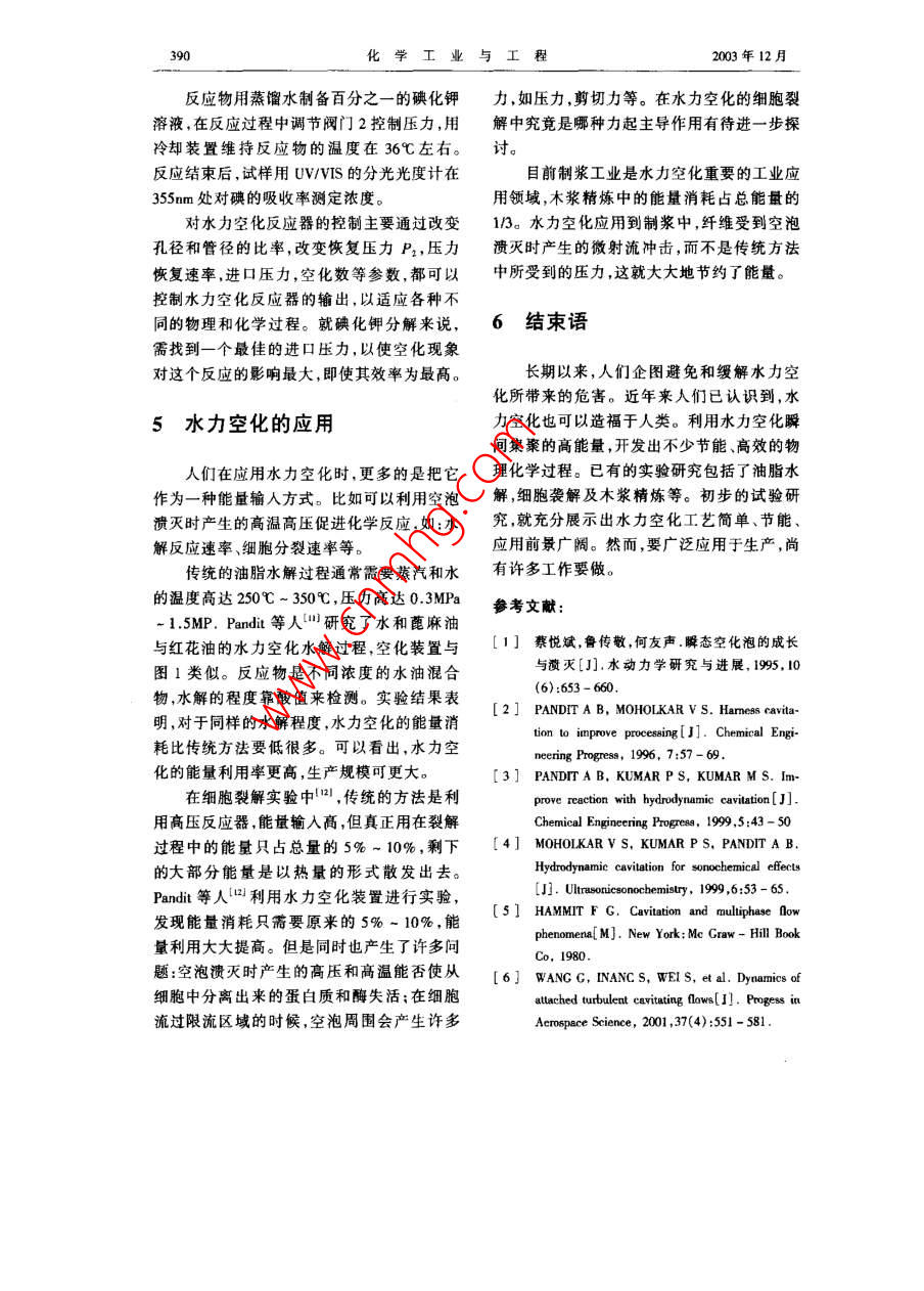 2003年12月化學(xué)工業(yè)與工程第20卷第6期Dec 2003CHEMICAL INDUSTRY AND ENGINEERING專題綜述水力空化及應(yīng)用武君,張曉冬,劉學(xué)武,夏遠(yuǎn)景,李志義(大連理工大學(xué)流體與粉體工程研究設(shè)計(jì)所,遼寧大連16012)摘要;本文對水力空化現(xiàn)象進(jìn)行了較全面的綜迷,包括空化的產(chǎn)生、發(fā)展及漬滅的過程,給出空泡潰滅時的三種模型假設(shè),并提出把空泡潰滅時產(chǎn)生的高壓高溫條件作為種能量輸入的方法用在化學(xué)反應(yīng)過程等領(lǐng)域,介紹了水力空化裝置及應(yīng)用前景等,并對空化及空蝕的產(chǎn)生機(jī)理進(jìn)行了初步探討,對進(jìn)一步深入研究空化現(xiàn)象及應(yīng)用有定的參考作用。關(guān)鍵詞:空化;流體流動;空泡;潰滅中圖分類號:0352.1文獻(xiàn)標(biāo)識碼:A文章編號:1004-9533(2003)06-0387-05Hydrodynamic Cavitation and Its ApplicationsWU Jun, ZHANG Xiao-dong, LIU Xue-wu, XIA Yuan-jing, LI Zhi- yi(R&D Institute of Fluid and Powder Engineening, Dalian University of technology, Liaoning Dalian 116012, China)Abstract: The hydrodynamic cavitation phenomenon included inception, development and thecollapse of the hydrodynamic cavitation has been reviewed. Three models have been proposed toexplain the cavity collapse. The high pressure and temperature which the collapsed cavitiesgenerated can be used as a method of energy imput. The paper also includes that the hydrodynamic equipment and the applications. This is important for the further researchKey words: cavitation; fluid now; bulb; collapse早在1753年, Euler注意到,當(dāng)水管中某空化可產(chǎn)生的種種不利影響,例如在泵中處的壓強(qiáng)若降低至蒸汽壓甚至到負(fù)值時,水產(chǎn)生的空蝕,它是由靠近固體表處的空泡漬即自管壁分離并在該處形成一個真空空間,滅時產(chǎn)生的高速液體射流沖擊所造成的通常人們將這種現(xiàn)象稱為空化。其后,發(fā)現(xiàn)與此同時,人們也在思考如何利用這種現(xiàn)象。收稿日期:2002-11-1作者簡介:武君(1979-),女,河北邯鄲人,在讀碩士,主要從事過程的空化強(qiáng)化研究化學(xué)工業(yè)與工程003年12月最初人們利用超聲波發(fā)生裝置來產(chǎn)生空化,就會首先在該處發(fā)生,這里的空化數(shù)稱為臨并把空化現(xiàn)象中空泡潰滅時產(chǎn)生的高聚能量界空化數(shù)或初生空化數(shù);2)可以描述設(shè)備對作為一種對化學(xué)反應(yīng)過程的能量輸入的方空化破壞的抵抗能力。各種水利機(jī)構(gòu)都有相法,已取得了很大進(jìn)展2。在實(shí)驗(yàn)室范圍內(nèi),應(yīng)的C值,C值越低,說明空化所需的壓力研究人員利用空化所產(chǎn)生的局部超高溫和超將越大,該設(shè)備抵抗空化破壞的能力越強(qiáng);3)高壓來促進(jìn)化學(xué)反應(yīng),表面除垢等。超聲空衡量不同流場空化現(xiàn)象的相似性。在Re大弊端是難以實(shí)現(xiàn)工業(yè)化。人們開數(shù),F數(shù),We數(shù)等相似準(zhǔn)數(shù)相等的情況下另一種產(chǎn)生空化的方法,即水力空化。當(dāng)兩種流動狀態(tài)的空化數(shù)相等時,可以認(rèn)為水力空化現(xiàn)象發(fā)生在很多場合,例如在有其空化現(xiàn)象也相似管徑急劇變化的管道中,水力機(jī)械中等。在研1.2空化的發(fā)展究中,水力空化現(xiàn)象通常這樣實(shí)現(xiàn):流體流過空化發(fā)生的過程可以分為以下幾個階一個限流區(qū)域(如幾何孔板文丘里管等)時產(chǎn)段6。初始空化:在初始空化階段,只有極微生壓降,當(dāng)壓力降至蒸汽壓甚至負(fù)壓時溶解小的氣泡出現(xiàn),邊界層也沒有明顯的分離現(xiàn)在流體中的氣體會釋放出來同時流體汽化而象;片狀空化:這時空化數(shù)降低開始出現(xiàn)連續(xù)產(chǎn)生大量空化泡空泡在隨流體進(jìn)一步流動的氣相,從外形上看,片狀空化像手指;云狀空過程中,遇到周圍的壓力增大時,體積將急劇化:空化數(shù)進(jìn)一步降低,出現(xiàn)大量空化泡,有縮小直至潰滅。空泡潰滅過程發(fā)生的瞬間(微大團(tuán)白霧狀;超空化:它是空化泡發(fā)展的最后秒級)會產(chǎn)生極高的壓強(qiáng)和溫度。階段,壓力降至極低。最后隨著壓力的恢復(fù)空泡漬滅空化的產(chǎn)生及發(fā)展空泡潰滅是一個極其復(fù)雜的物理過程,至于為何在潰滅時能夠產(chǎn)生如此高的能量,1.1空化數(shù)目前尚缺乏較權(quán)威的解釋,將多個空化泡視空化數(shù)是描述空化初生和空狀態(tài)的一個為泡群來研究,至今對空泡群潰滅過程有如重要參數(shù),其定義為下幾個模型”:單個空化泡潰滅的沖擊波疊C;=(P2-P、)5pob加成一個單個的高強(qiáng)度的破壞性沖擊波;多個空化泡同時發(fā)生潰滅構(gòu)成一個巨大的沖擊式中,P2—流體的恢復(fù)壓力,P波;基于能量傳遞的觀點(diǎn),潰滅的空泡將能量蒸汽壓力,P—流體的密度,—限流區(qū)傳遞給未破裂的。外部空泡的破裂導(dǎo)致其周域的平均流速。圍局部壓力增加,這個壓力使其內(nèi)部空泡破空化數(shù)主要有以下幾個特點(diǎn):空化數(shù)裂。因此,單個空泡的潛在破壞性或漬滅壓與管中的流體速度是獨(dú)立的,和孔的尺寸有力沿空化群中心逐漸增加。第三種模型更適定的關(guān)系;空化數(shù)隨R(B=d/D,d是限流于解釋現(xiàn)有的空泡潰滅時的情形。蔡悅斌區(qū)域的直徑,D是管徑)線性增加;實(shí)際的空等研究發(fā)現(xiàn),在柔性和剛性壁