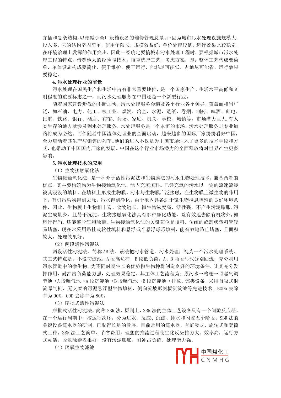 淺談污水處理技術(shù)的應(yīng)用郭新超博天環(huán)境集團(tuán)股份有限公司廣東廣州510610摘要:城市污水處理工藝選擇的水質(zhì)因素進(jìn)水水質(zhì)水量特性和出水水質(zhì)標(biāo)準(zhǔn)的確定是城市污水處理工藝選擇的關(guān)鍵環(huán)節(jié),也是我國當(dāng)前城市污水處理工程設(shè)計(jì)中存在的薄弱環(huán)節(jié)。同時(shí)針對在污泥處置、再生水利用方面普遍存在的技術(shù)問題,做出了研究分析。關(guān)鍵詞:污水處理技術(shù)運(yùn)用;特點(diǎn);應(yīng)用中圖分類號(hào): R123. 3文獻(xiàn)標(biāo)識(shí)碼: A1.引言隨著污水排放標(biāo)準(zhǔn)的不斷嚴(yán)格,對污水中氮、磷等營養(yǎng)物質(zhì)的排放要求較高,傳統(tǒng)的具有脫氮除磷功能的污水處理工藝多以活性污泥法為主,往往需要將多個(gè)厭氧和好氧反應(yīng)池串聯(lián),形成多級反應(yīng)池,通過增加內(nèi)循環(huán)來達(dá)到脫氨除磷的目的,這勢必增加基建投資的費(fèi)用及能耗,并且使運(yùn)行管理較為復(fù)雜;目前城市污水的處理多以集中處理為主,龐大的污水收集系統(tǒng)的投資遠(yuǎn)遠(yuǎn)超過污水處理廠本身的投資,因此建設(shè)大型的污水處理廠,集中處理生活污水,從污水再生回用的角度來說不一定是唯一可取的方案 。2.污水處理后的運(yùn)用(1)工業(yè)用水的回用經(jīng)處理的污水可以回用于各種不需要符合飲用水水質(zhì)要求的工業(yè)企業(yè)。各種工業(yè)生產(chǎn)過程中的冷卻水、鍋爐用水、生產(chǎn)和加工用水、清洗和輔助用水(如除塵和澆地)等,都可以利用經(jīng)處理的污水。可以使用經(jīng)過處理的污水的行業(yè)包括商業(yè)洗車、造紙廠、礦山、石油精煉廠、電站、商業(yè)洗衣、道路建設(shè)企業(yè)、旅游點(diǎn)、釀酒廠,以及混凝土、磚、紡織品、金屬及涂料的生產(chǎn)廠。日本近40%經(jīng)處理的市政污水被用于工業(yè)用途,而美國的佛羅里達(dá)州和加利福尼亞洲分別為2%和5%。(2)居民及社區(qū)的非飲用水回用對居民來說,污水回用可以用于沖洗馬桶、洗車、清洗和澆灌花園.從社區(qū)的角度來看,污水回用的非飲用水用途還包括室外的灌溉及各種娛樂場所用水。美國加利福尼亞洲早在1961年就將經(jīng)處理的污水用于有游船及可垂釣的湖泊。提供非飲用水的一-種有效辦法是建立分質(zhì)供水系統(tǒng)。美國佛羅里達(dá)州阿爾塔蒙特城的一項(xiàng)分質(zhì)供水工程, 解決了4.5萬人的非飲用水使用問題,其供水量占全城總供水量的30%。3.污水處理技術(shù)特點(diǎn)我國的污水治理工作是從工業(yè)廢水治理開始的,近30年來,我們建造和運(yùn)行了成千上萬座工業(yè)廢水處理站,這些技術(shù)和經(jīng)驗(yàn)在今后大規(guī)模的城市污水處理工程中是可以借鑒的。工業(yè)廢水處理的特點(diǎn)是:針對性強(qiáng),技術(shù)變化多。主要技術(shù)有隔油、氣浮、混凝、沉淀、重力過濾和膜過濾、活性炭吸附、臭氧氧化、離子交換、電解、電滲析、反滲透等專用技術(shù)來分離減少工業(yè)廢水中的油、色、重金屬、有毒有害物質(zhì),在工業(yè)廢水治理中也常常用到水解酸化、接觸氧化、表面曝氣、純氧曝氣、厭氧和好氧活性污泥法等生化技術(shù)。由于工業(yè)廢水處理設(shè)施一般規(guī)模小、 技術(shù)性強(qiáng),工藝組合靈活,結(jié)構(gòu)通常為鋼制,即使內(nèi)部管線穿插較多,運(yùn)行維護(hù)也不太困難。工業(yè)廢水處理在技術(shù)上是與城市污水處理類同的,但是如果把工業(yè)廢水處理設(shè)施的設(shè)計(jì)思路簡單地套用在城市污水處理工程中會(huì)帶來很多預(yù)想不到的問題。城市污水處理廠的特點(diǎn)是規(guī)模大、占地大、設(shè)施尺寸大、單元名外珊沿齒通黨為鋼筋混凝土結(jié)構(gòu),因此相應(yīng)地要求整體工藝構(gòu)成要簡單,單體設(shè)施中國煤化工鄉(xiāng)管線fHCNMHG穿插和復(fù)雜結(jié)構(gòu),以便減少全廠設(shè)施設(shè)備的維修管理總量。正因?yàn)槌鞘形鬯幚碓O(shè)施規(guī)模大,投入多,它的結(jié)構(gòu)堅(jiān)固簡單,使用年限長,規(guī)模效益好,單位處理較低,運(yùn)行效果比較穩(wěn)定,在環(huán)境治理上發(fā)揮的作用突出,因此一經(jīng)確定要搞城市污水處理工程時(shí),要根據(jù)城市污水處理工程的特點(diǎn),借鑒他人的經(jīng)驗(yàn)與技術(shù),慎重選擇工藝、考慮方案,即:整體工藝構(gòu)成要簡單,單體設(shè)施構(gòu)成要簡化,便于維護(hù),便于運(yùn)行,能耗盡可能低,占地盡可能省,運(yùn)行效果要穩(wěn)定。4.污水處理行業(yè)的前景污水處理在國民生產(chǎn)和生活中占有非常重要地位,是一- 個(gè)國家生產(chǎn)、生活水平高低和文明程度的重要標(biāo)志之一,而污水處理服務(wù)在中國還是-一個(gè)新型行業(yè)。隨著國家建設(shè)步伐的不斷加快,污水處理服務(wù)會(huì)遍及各個(gè)行業(yè)各個(gè)領(lǐng)導(dǎo),覆蓋面相當(dāng)廣泛,如石油、電力、化工、核工業(yè)、煤炭、冶金、水泥、造紙、卷煙、制藥、啤酒、郵電、民航、鐵路、銀行、酒店、賓館、商場、家庭、機(jī)關(guān)、學(xué)校、城鎮(zhèn)等,市場潛力巨大,有人類生存的地方就涉及到水處理服務(wù),水處理服務(wù)是--個(