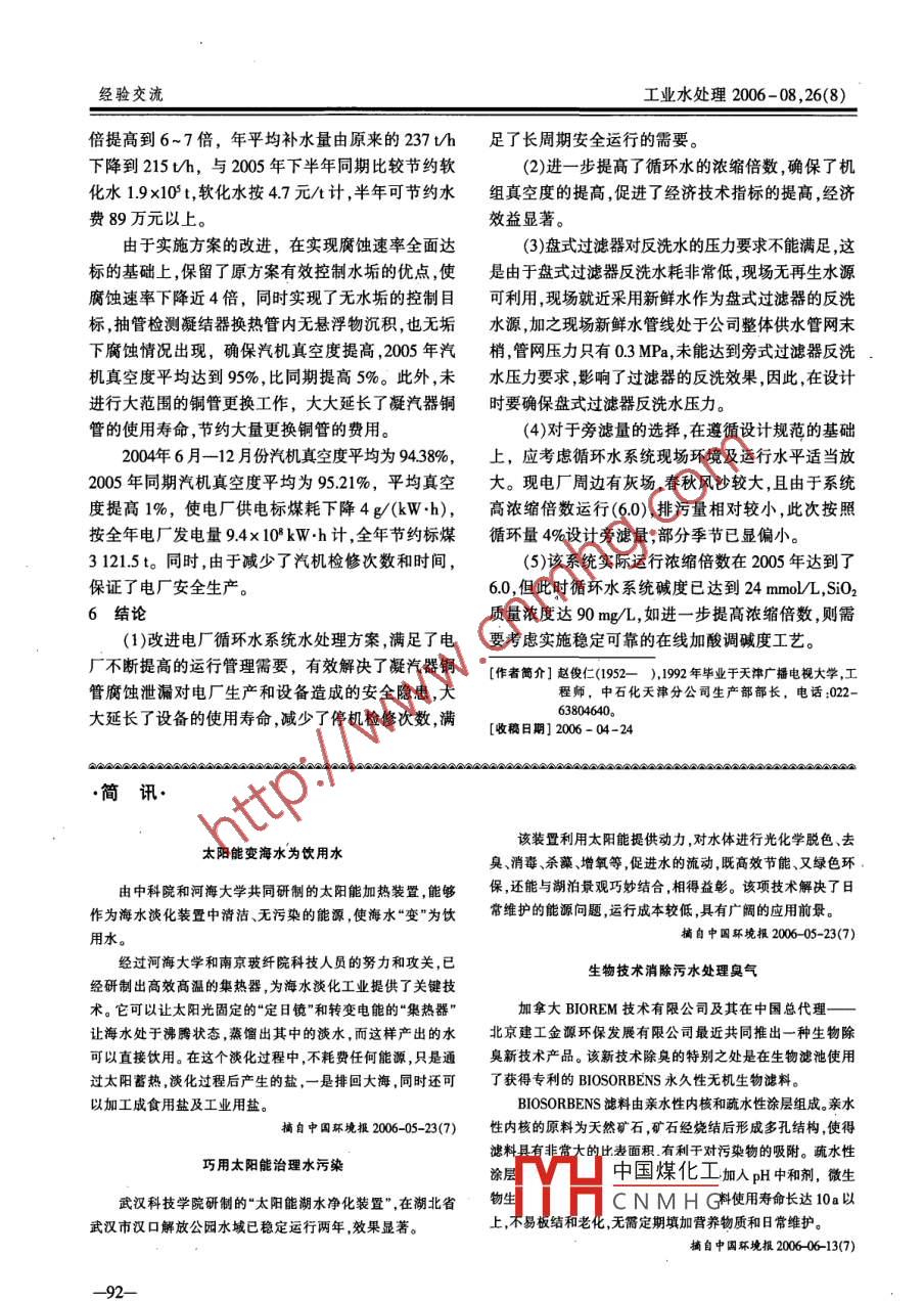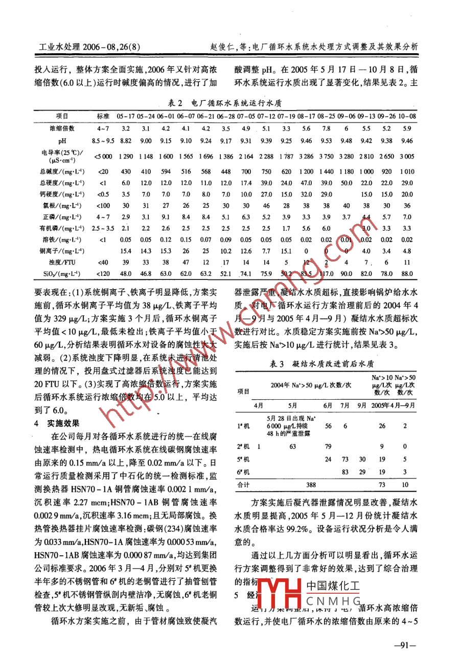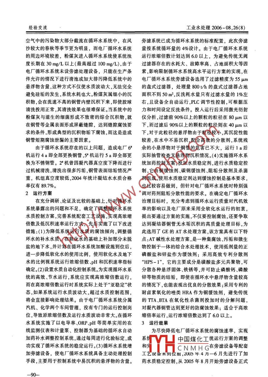 第26卷第8期工業(yè)水處理Vol.26 No.82006年8月Industrial Water TreatmentAug,2006電廠循環(huán)水系統(tǒng)水處理方式調(diào)整及其效果分析趙俊仁,楊志剛.(中石化天津分公司,天津300271)[摘要]針對(duì)電廠原循環(huán)水系統(tǒng)運(yùn)行過程中暴露出的不足和隱患,通過實(shí)施運(yùn)行方案調(diào)整和系統(tǒng)完善,有效地解決了凝汽器銅管腐蝕泄漏問題,延長了設(shè)備的使用壽命,滿足了電廠長周期安全運(yùn)行的需要。[關(guān)鍵詞]電廠;循環(huán)水;腐蝕;水質(zhì)控制;緩蝕阻垢;旁濾[中圖分類號(hào)] T0085*.412 [文獻(xiàn)標(biāo)識(shí)碼]B [文章編號(hào)] 1005 - 829X(2006)08 - 0089 -04中石化天津公司熱電廠有6臺(tái)發(fā)電機(jī)組,總裝機(jī)m2/h,溫差8~10%。凝汽器管材質(zhì)為海軍黃銅容量為200MW ,其中3.4號(hào)機(jī)為備用。原電廠循環(huán)水HSn70- 1A、HSn70- 1AB和不銹鋼。設(shè)計(jì)采用軟化系統(tǒng)采用全軟化水做補(bǔ)充水,未投加緩蝕阻垢藥劑進(jìn)水作為補(bǔ)充水,軟化水的水質(zhì)指標(biāo)見表1。行水質(zhì)穩(wěn)定處理,且系統(tǒng)未設(shè)旁濾設(shè)備。這種運(yùn)行方表1補(bǔ)水水質(zhì)式雖然運(yùn)行費(fèi)用相對(duì)較低,但也逐步暴露出影響電廠生產(chǎn)穩(wěn)定和設(shè)備安全的隱患和不足,主要表現(xiàn)在銅管電導(dǎo)率/總硬度(以總堿度(以Si0/ so,2/. Cl/ 濁度(us.cnm1)CGeCO,計(jì))/CaCO,計(jì))/(mg+L") (mg:L+) (mgL")(mg.L")腐蝕泄漏情況嚴(yán)重,銅管壽命短,檢修費(fèi)用高,機(jī)組真(mg+L*)_ (mg.L)空度無法保證,汽水水質(zhì)受到影響,機(jī)組無法及時(shí)備602225154:<1用等,隨著石化生產(chǎn)裝置運(yùn)行周期的不斷提高,對(duì)電由于電廠循環(huán)水系統(tǒng)直接關(guān)系到發(fā)電機(jī)組的運(yùn)廠的設(shè)備安全、長周期運(yùn)行及蒸汽水質(zhì)的依賴和要求行效率,因此,原電廠循環(huán)水系統(tǒng)采用了全部軟化水也越來越高,為此中石化天津分公司與熱電廠經(jīng)過廣作補(bǔ)充水可以有效避免在凝結(jié)器銅管結(jié)碳酸鈣、碳泛調(diào)研、技術(shù)交流和方案討論,確定了電廠循環(huán)水系酸鎂等水垢,確保凝結(jié)器的換熱效率,但水質(zhì)的腐蝕統(tǒng)新的運(yùn)行方案,并在2005年投人運(yùn)行,經(jīng)過近1a傾向增加。在中石化天津分公司采用在線腐蝕速率的運(yùn)行驗(yàn)證,調(diào)整后的運(yùn)行方案具有良好的效果,不檢測儀對(duì)11套循環(huán)水系統(tǒng)開展的月度腐蝕速率檢僅腐蝕速率、沉積速率全面達(dá)標(biāo),銅管內(nèi)未有水垢沉測中,電廠循環(huán)水系統(tǒng)在線腐蝕速率均在0.15 mm/a積,濃縮倍數(shù)也達(dá)到了6.0。以上,是其他循環(huán)水系統(tǒng)的8~ 10倍。1原系統(tǒng)問題另外,電廠原循環(huán)水系統(tǒng)懸浮物多、濁度高,冷循環(huán)冷卻水系統(tǒng)平均循環(huán)水量16000~24000卻塔在冷卻循環(huán)水過程中存在“洗滌"空氣效應(yīng),將通過實(shí)際使用證明,灰水分散劑NKC - 920A對(duì)于整了系統(tǒng)長周期穩(wěn)定運(yùn)行,經(jīng)濟(jì)效益顯著。個(gè)灰水系統(tǒng)具有非常明顯的阻垢效果,達(dá)到了工程建(2)灰水分散劑NKC- 920A是立足于分散為主,設(shè)之初預(yù)期的分散阻垢目的。灰水分散劑NKC-阻垢為輔而開發(fā)的藥劑。實(shí)踐表明藥劑對(duì)高濁度水920A在浩良河化肥分公司的成功應(yīng)用,為公司生產(chǎn)中懸浮顆粒分散性能的好壞,關(guān)系到系統(tǒng)中懸浮物系統(tǒng)長周期穩(wěn)定運(yùn)行發(fā)揮了重要的作用。投加灰水分沉積量及結(jié)垢趨勢的走向。散劑NKC-920A每年費(fèi)用僅為70萬元,而為企業(yè)帶(3)灰水分散劑NKC- 920A是低毒、無害、環(huán)保來的綜合經(jīng)濟(jì)效益近千萬元。的藥劑,具有良好的社會(huì)效益。4結(jié)論(1)NKC - 920A灰水分散劑專門針對(duì)高濁、高[作者簡中國煤化工畢業(yè)于齊齊哈爾輕工溫高硬度的德士古黑灰水特點(diǎn),于1994年7月開二司浩良河化肥分公司發(fā)成功,2004年7月應(yīng)用于浩良河化肥分公司德士fYHC N M H G1384581056.E-mal;zunglibin@126.com。古水煤漿加壓氣化黑灰水系統(tǒng),至今運(yùn)行良好,保證[收稿日期] 2006 - 04-28-89-經(jīng)驗(yàn)交流工業(yè)水處理2006 - 08 ,26(8)空氣中的污染物大部分截流在循環(huán)水系統(tǒng)中,在風(fēng)旁濾系統(tǒng)已成為循環(huán)水系統(tǒng)的標(biāo)準(zhǔn)配置,此次旁濾沙較大的春秋等季節(jié)更為明顯,而電廠循環(huán)水系統(tǒng)量按系統(tǒng)循環(huán)量的4%設(shè)計(jì)。由于電廠循環(huán)水系統(tǒng)的周邊環(huán)境較差,粉煤灰進(jìn)入循環(huán)水系統(tǒng)使系統(tǒng)濁運(yùn) 行濃縮倍數(shù)計(jì)劃達(dá)到6.0以上,為避免傳統(tǒng)無閥度長期在30mg/L以上(最高超過100mg/L),由于過濾器存在的水耗大、故障率高、占地面積大等因.電廠循環(huán)水系統(tǒng)未設(shè)旁濾處理設(shè)備,只能在生產(chǎn)條素,影響限制循環(huán)水系統(tǒng)高水平運(yùn)行方案的實(shí)現(xiàn),在件允許的情況下進(jìn)行清池或加大排污降低系統(tǒng)中的電廠循環(huán)水系統(tǒng)旁濾設(shè)備選用了過濾精度為55μm懸浮物含量,這種方式不僅使水質(zhì)波動(dòng)大,無法完全的盤式過濾器,處理量800t/h的盤式過濾器占地避免硅垢的發(fā)