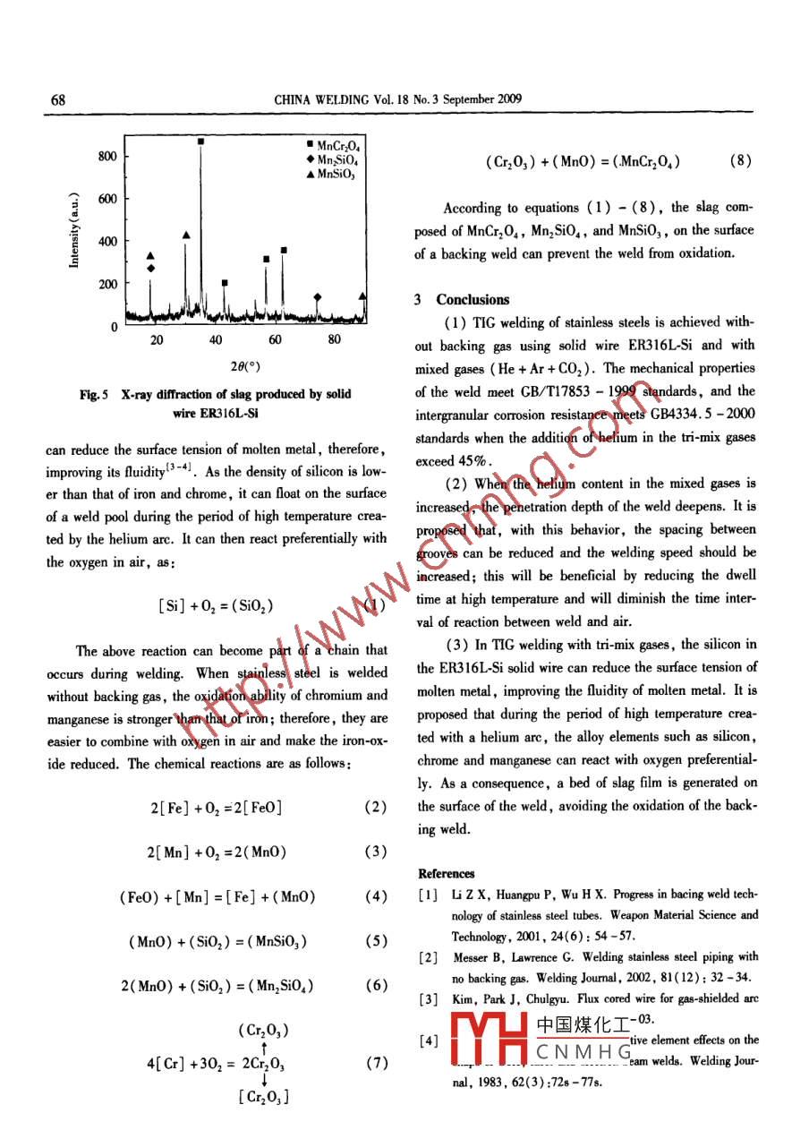 Study of properties and mechanisms of backing weld of stainless steel piping with no backing gasStudy of properties and mechanisms of backing weld of stainlesssteel piping with no backing gasLi guodong, LiWei Qi and Zheng Liji李國棟,栗卓新,魏琪,鄭麗君*Abstract This work inestigates the proposed welding of stainless steels with no backing gas by using solid wire ER316L-Siand mixed gases( He +Ar +C02). The protection mechanism was also discussed from the view of are physics and the alloyelements in the solid wire. The result shows that when the proportion of helium in the above-noted mixed gases excesses 45percent, the mechanical properties and the intergranular corrosion tendency meet corresponding Chinese standards, Furthethe alloy elements in the solid wire can react with oxygen during the period of high temperature boosted by helium are; thisresult in the formation of a bed of thin slag, which can avoid the oxidation of the backing weld and eliminate the need ofbacking gaKey words stainless steel, solid wire, no backing gas, mixed gases0 Introduction00Crl7Nil4 Mo2. Different shielding gases were used andWelding stainless steel piping with and without back- the compositions of these gases were 7.5%Ar+90%Heing gas are the two main technologies being used in appli- 2. 5% C0, (MI), 22. 5% Ar +75% He+2. 5%COcations. The former is used widely because no slag forma- (M2), 37.5% Ar +60% He +2. 5% C0, (M3), 52.5%tion occurs, and the welder can easily observe the degree Ar+45% He +2.5% CO2(M4)and pure argon(M5)(a)of fusion and the shaping of the backing weld. Howaeve' In order to examine the properties of the joint, a 133 mmthe preparation work of filling argon into the backing welddiameter )x 10 mm( thickness)x 200 mm length)welding process without backing Bagly a newly developeis tedious. Flux cored wire weldingstainless steel pipe with a V-shaped groove were preparedvantage of this technology is that the backing welds are not The groove angle was 60, at a root gap of 2 mm and a 2protected by gases, and this can simplify the welding pro- mm root face. TIG welding was performed using solid wirecedure. Due to an inherent characteristic of flux-cored ER316L-Si, and multi-pass SMaW was carried ouwire, this technology also has disadvantages; for example, electrode A022, with diameters of 2 mm and 4 mm. Thethe melted slag can flow onto the surface of the backing current and voltage were checked using a Hannover analyweld, which causes interference with the welders judgzer, and the picking time was 3 s. Line scanning using aent. In order to answer the above questions, weldingscanning electron microscope SEM) was performed onstainlessusing solid wirethe cross-section of joint welded with solid wire ER316L-SiER316Iielded by different mixed gases(Ar+ Heand tri-mix shielding gas(7. 5% Ar+90% He+2. 5%CO2). The slag film in the backing weld was analyzed1 Experimental methodsing X-ray diffractionThe brial chosen for the investigation was中國煤化工This work was supported by Funding Project for Academic Human ReHigher Education under theJurisdiction of Beijing Municipality.CNMHGLi Guodong, Li Zhuoxin, Wei Qi and Zheng Lijun, College of Materials Science and Engineering, Beijing University of TechnologyBeijing,100124.LiGuodong,Correspondingauthor,E-mail:guodongli@bjut.edu.cnCHINA WELDING Vol 18 No. 3 September 2009gas meets GB/T17853-1999 the intergranular corrosion2. 1 Properties of the welded jointtendency meets GB4334. 5-2000. Of the two specimensMechanical properties and the intergranular corrosion cut from the joint shielded by the M4 mixed gases,onetendency of welded joints are given in Table 1. It can be was found to have cracked. This result shows that the ad-een that the mechanical properties of joint welded by solid dition of helium gas in the tri -mix gases should not be lesswire ER316L-Si and tri- mix shielding gas without backing than 45%Table 1 Mechanical properties and intergranular corrosion tendency of welded jointsMixedTensile strengthFace bendroot bend testFracture positionCorrosion tendencyg/MPaBend angel80°Bend angle I80°550WeldAccepted615Accepted610WeldFailure2.2 Effect of mixed gases on the protection of the voltage increased with the addition of helium in the mixedbacking weldgases. This evidently was caused by the different physicalThe effect of helium on weld penetration is shown in properties of argon and helium. Compared with argon, theFig. 1. It can be seen that the penetration of the weld in- mass of a helium atom is smaller. It is proposed that undercreased with increasing helium content. The thermal con- the action of the arc force, the speed of helium particlesductivity of helium is greater than that of argon. There- increases. This may result in an increase of heat loss duefore, with an increase of the volume percent of helium in to the increased diffusion of helium particle from are col-the mixed gases, the cooling effect of gases on the arc umn to the periphery. Therefore, the heat input powershould increase; this should serve to intensify the arc and namely IE, becomes larger. According to the minimumto increase the plasma jet force. According to Bermoulli's are voltage rule, the electric potential gradient increaseslaw, the kinetic energy of the plasma jet that moves in the given the current and surrounding condition. This meanshigh speed in arc column will transform to pressure, gen- that when arc length is fixed, arc voltage increases witherating additional electromagnetic dynamic pressure on the the increasing of helium content. Therefore, it is proposedweld pool. This effect can cause pool excavating, resulting that as heat input increases and the are column enlargesin a sagging of the weld pool, consequently increasing the this leads to a broader fusion widthpenetration of the weld. A higher helium volume contentshould generate a stronger effect of this action, as is indicated in Fig. 1. It can be seen that when the proportion of1.8helium was more th