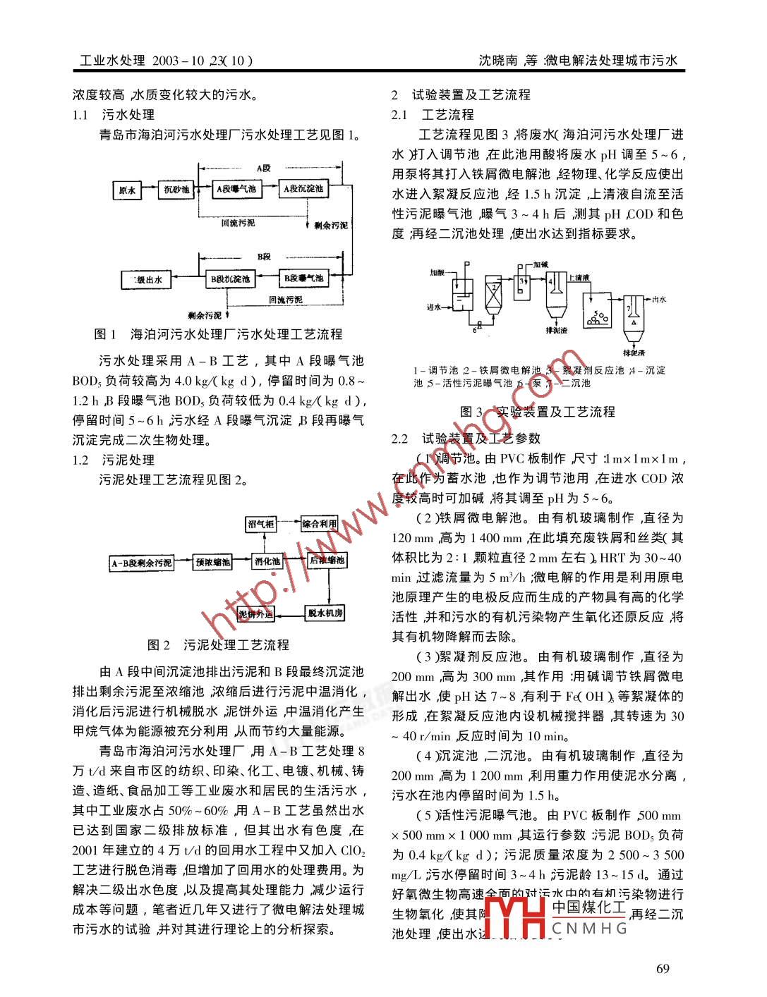第23卷第10期工業(yè)水處理Vol.23 No.102003年10月Industrial W ater TreatmentOct. ,2003微電解法處理城市污水沈曉南彭忠王福浩王強(qiáng),劉陽(yáng)(青島海泊河污水處理廠山東青島266021 )[摘要]針對(duì)青島市海泊河污水處理廠二級(jí)出水色度的問(wèn)題進(jìn)行了微電解法處理帶色城市污水的試驗(yàn)試驗(yàn)結(jié)果表明污水脫色率達(dá)78%,COD去除率達(dá)86.7%污水的可生化性提高。[關(guān)鍵詞]微電解法吸附-生物降解法污水處理. [中圖分類號(hào)]X703.1 [文獻(xiàn)標(biāo)識(shí)碼]B [文章編號(hào)] 1005 - 829X( 2003 )10- 0068 -04Application of micro-electrolysis to the treatment of urban wastewaterShen Xiaonan Peng Zhong ,Wang Fuhao ,Wang Qiang ,Liu Yang( Qingdao Haipohe Sewage Treatment Plant , Qingdao 266021 , China )Abstract :The application of micro-electrolysis to the treatment of urban wastewater with chroma has been stud-ied. The result shows that the removal rates of chroma and CODa could come up to 78% and 86.7%. The biodegr-adability of wastewater is improved respectively.Key words micro- electrolysis technology adsorption-biodegradation process wastewater treatment1青島市海泊河污水處理廠工藝簡(jiǎn)介學(xué)于20世紀(jì)70年代中期發(fā)明的,它是-種較高負(fù)青島市海泊河污水處理廠采用吸附-生物降解荷的新型活性污泥法其特點(diǎn)是:不設(shè)初沉池A- B(A-B)法處理工藝A-B工藝是聯(lián)邦德國(guó)亞琛大段污泥分流A段負(fù)荷高抗沖擊能力強(qiáng)適合處理.mg/L總堿度為11 mmol/L。原處理方法除塵效果不好濁水含塵量仍較高,不但增加了阻垢劑的消耗,而且影響了阻垢效果,管壁和文丘里噴嘴有白色硬遭清水陽(yáng)垢分觸想[回水池]一[課后水]垢即為證明。[粗糲粒去除器祖凝劑斜雄沉網(wǎng)板框壓團(tuán)在充分考慮現(xiàn)場(chǎng)濁水變化幅度的前提下,經(jīng)實(shí)驗(yàn)室試驗(yàn)我們最終決定采用有機(jī)絮凝劑<聚丙烯酰污妮外運(yùn)污犯外運(yùn)胺系列和無(wú)機(jī)絮凝劑(聚鐵)配合使用并輔以淤泥圖1轉(zhuǎn)爐煙氣除塵水處理工藝流程調(diào)節(jié)劑?,F(xiàn)場(chǎng)使用效果很好出水濁度一般可< 503處理效果mg/L甚至更低,水質(zhì)清澈為水質(zhì)穩(wěn)定處理奠定了(1 )轉(zhuǎn)爐除塵水經(jīng)絮凝處理后濁度可降至基礎(chǔ)。解決水質(zhì)穩(wěn)定問(wèn)題最常用的方法就是化學(xué)處< 50 mg/L。理,即加入緩蝕阻垢劑。針對(duì)轉(zhuǎn)爐除塵廢水高pH、高(2)噴嘴和水系統(tǒng)器壁表面不結(jié)新垢加藥處理硬度、結(jié)垢傾向嚴(yán)重的特點(diǎn)充分利用阻垢劑的絡(luò)合1個(gè)月以后,原運(yùn)行過(guò)程中水封溢流水盆側(cè)壁所有增容、分散、晶格畸變機(jī)理和協(xié)同效應(yīng),選擇阻垢分的約3 cm厚的軟垢逐漸脫落露出金屬表面。高架散性能好的復(fù)合配方可以獲得較好的效果。流槽出水端所結(jié)2~3cm硬垢全部去除。我們正是基于以上原則選定了化學(xué)穩(wěn)定性和阻(3較長(zhǎng)時(shí)間保持一文"" 二文”壓差穩(wěn)定。垢性能俱佳的全有機(jī)配方TM - 7006 ,該配方以含磺酸基團(tuán)的聚合物為主并輔以分散劑利用其協(xié)調(diào)效[作者簡(jiǎn)介]霍健彭1950一).1976 年畢業(yè)于天津大學(xué)現(xiàn)為天津化工研中國(guó)煤化工[程師電話:應(yīng)在不調(diào)pH的情況下運(yùn)行。現(xiàn)場(chǎng)應(yīng)用效果證明,022-8HCNMHG處理是成功的。系統(tǒng)處理工藝如圖1。.[收稿日期]2003-06工業(yè)水處理2003-10 23( 10)沈曉南等:微電解法處理城市污水濃度較高,水質(zhì)變化較大的污水。2試驗(yàn) 裝置及工藝流程1.1 污水處理2.1工 藝流程青島市海泊河污水處理廠污水處理工藝見(jiàn)圖1。工藝流程見(jiàn)圖3將廢水(海泊河污水處理廠進(jìn)水)打入調(diào)節(jié)池在此池用酸將廢水pH調(diào)至5~6,A用泵將其打入鐵屑微電解池經(jīng)物理、化學(xué)反應(yīng)使出[.}一就施十[人毒氣池] [人便沉淀施]水進(jìn)入絮凝反應(yīng)池經(jīng)1.5h沉淀上清液自流至活性污泥曝氣池曝氣3~4h后測(cè)其pH COD和色回流污犯,剩余污泥度再經(jīng)二沉池處理使出水達(dá)到指標(biāo)要求。Bp廠加堿加酸-“級(jí)出水B毆0淀池| B暇摹氣池上清違回沈污視剩余污泥↓圖1海泊河污水處理廠 污水處理工藝流程排論清污水處理采用A-B工藝,其中A段曝氣池1-調(diào)節(jié)池2-鐵屑微電解池3-絮凝劑反應(yīng)池4-沉淀BOD;負(fù)荷較高為4.0kg/(kg d),停留時(shí)間為0.8~池5-活性污泥曝氣池0-泵7-二沉池1.2h ,B段曝氣池BOD,負(fù)荷較低為0.4 kg/(kg d),圖3實(shí)驗(yàn)裝置及工藝流程停留時(shí)間5~6h污水經(jīng)A段曝氣沉淀B段再曝氣沉淀完成二次生物處理。2.2 試驗(yàn) 裝置及工藝參數(shù)1.2污泥處理(1 )j調(diào)節(jié)池。由PVC板制作尺寸:1mx1mx1m,污泥處理工藝流程見(jiàn)圖2。在此作為蓄水池,也作為調(diào)節(jié)池用在進(jìn)水COD濃度較高時(shí)可加堿將其調(diào)至pH為5~6。{留氣相一--“綜合利用(2 )鐵屑微電解池。由有機(jī)玻璃制作,直徑為120mm高為1400mm在此填充廢鐵屑和絲類(其A-B段剩余污泥一←頂濃縮旭- t 消化池后濃縫池體積比為2:1顆粒直徑2mm左右)。HRT為30~40min過(guò)濾流量為5m/h;微電解的作用是利用原電池原理產(chǎn)生的電極反應(yīng)而生成的產(chǎn)物具有高的化學(xué).泥餅外運(yùn)。- -脫水機(jī)房活性并和污水的有機(jī)污染