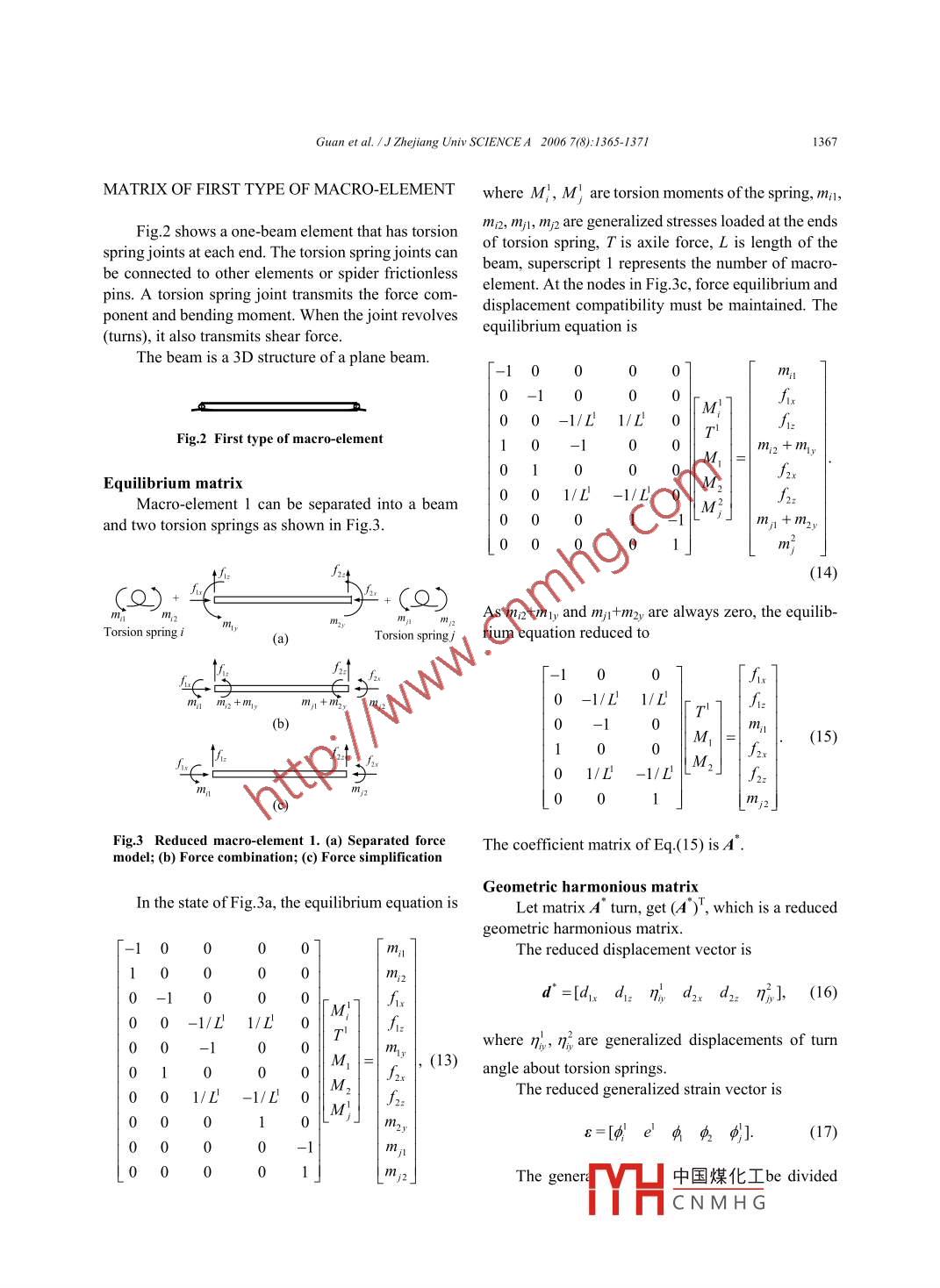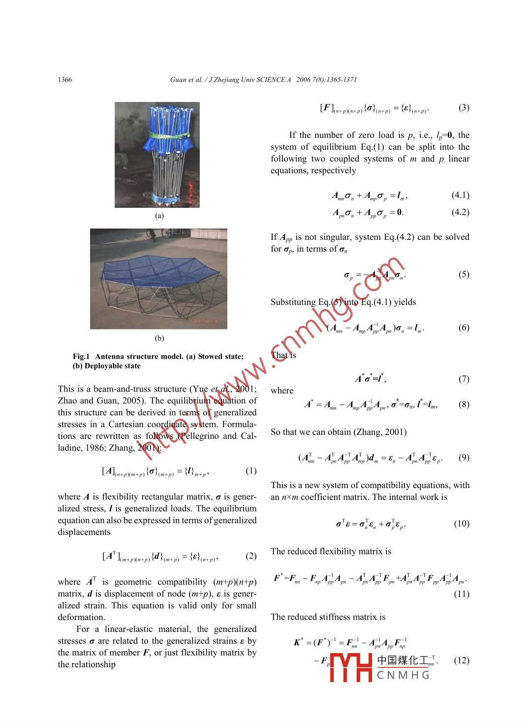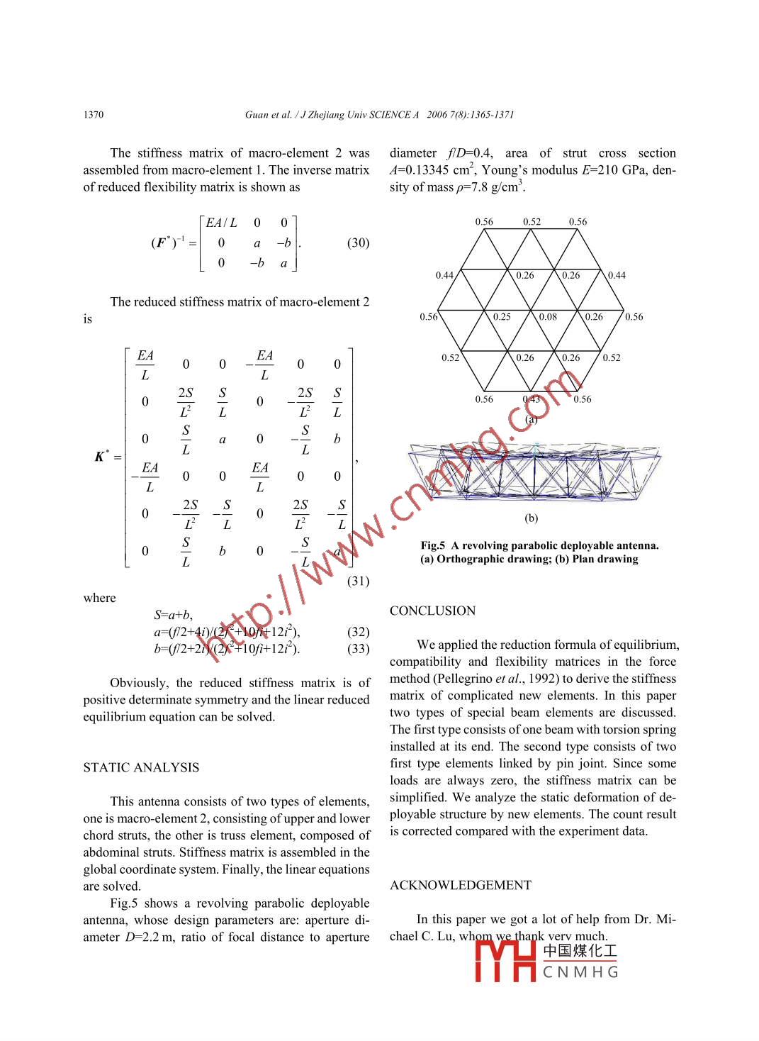 Guan et al.1J Zhejiang Univ SCIENCEA 2006 7(8):1365-13711365Jourmal of Zhejiang University SCIENCE AISSN 1009-3095 (Print); ISSN 1862-1775 (Online)www.zju.edu.cn/jzus; www.springerlink.comJzuSE-mail: jzus@zju.edu.cnStatic analysis of synchronism deployable antennaGUAN Fu-ling"', SHOU Jian-jun', HOU Guo-yong', ZHANG Jing-jie('Department of Civil Engering, Zhejiang Universiy, Hangzhou 310027, China)(Chongqing Research Institute of Building Science, Chongqing 400015, China)'E-mail: ciegfl@zju.edu.cnReceived Mar.17, 2006; revision accepted Apr. 23, 2006Abstract: A 3D synchronism deployable antenna was designed, analyzed, and manufactured by our research group. This an-tenna consists of tetrahedral elements from central element. Because there are springs at the ends of some of the rods, spider jointsare applied. For analysis purpose, the structure is simplified and modelled by using 2D beam elements that have no bendingstifness. Displacement vectors are defined to include two translational displacements and one torsional displacement. The stiff-ness matrix derived by this method is relatively simple and well defined. The analysis results generated by using software de-veloped by our research group agreed very well with available test data.Key words: Space deployable structures, Analysis design, Reflector antennadoi: 10.1631jzus.2006.A1365CLC number: V414.2INTRODUCTION .values using both finite difference and finite elementtechniques. Armero and Ehrlich (2006) proposedLarge antennas for space applications have some some new finite elements for thin Euler-Bernoullidifferences as compared to their counterparts de- beams that incorporate the softening hinges to de-signed and manufactured for ground usage. For a scribe the beam's deformation. Yau (2006) suggestedlarger space antenna, the applied loads in space canbe a finite element model for buckling analysis of ta-several orders of magnitude less than the gravity pered I-beams subjected to torsional moments. Maloading it is subjected to when being fabricated and (2006) analyzed the ideal displacement amplificationassembled on the ground. Since the effect of gravity ratio of a bridge-type flexure hinge based on the ki-cannot be removed from any experimental verifica- nematic theory.tion performed on the ground, we must rely on the useTwo types of special beam elements developedof efficient and highly accurate analysis methods for specifically for modelling and analyzing largedesigning and verifying large space antennas. Tibert 3D-synchronism deployable space antennas will be(2002) provided the state-of-the-art of deployable studied in this paper. The first type is a one-beamantenna. And many researches have been trying to element with torsion springs formed by two elementsanalyze the beam with torsion moments.of the first type that are linked by a pin joint. As someNa and Kim (2006) analyzed the deployment of loads are always zero, the stiffness matrices can bea multi-link flexible structure with the Timoshenko simplified and used to perform static and dynamicbeam theory and determined the equations of motion analyses of the antenna.using Hamilton's principle. Serna et al.(2006) pre-sented a set of equivalent uniform moment factorREDUCTION FORMULATIONProject (No. 863-2-4) supported by the National Basic ResearchFig.1 show中國(guó)煤化工。e analyzed.Program (863) of ChinaYHCNM HG.1366Guan et al. IJ Zhejiang Univ SCIENCE A 2006 7(8):1365-1371[In+ptp{}n+) = {}(+p),(3)If the number of zero load is p, i.e., l,=0, thesystem of equilibrium Eq.(1) can be split into thefollowing two coupled systems of m and p linearequations, respectivelyA.σ。+A.σp=lm,(4.1)A.σ+A.σ,=0.(4.2)a)If App is not singular, system Eq.(4.2) can be solvedfor σp, in terms of σnσ,=-ApAmσ。(5)Subtituting Eq.(5) into Eq.(4.1) yields .(Am-A.AbpA.m)σ,=Iw(6)b)Fig.1 Antenna structure model. (a) Stowed state;That is(b) Deployable stateA°o*=l',(7)This is a beam-and-truss structure (Yue et al., 2001; whereZhao and Guan, 2005). The equilibrium equation of(8)this structure can be derived in terms of generalizedstresses in a Cartesian coordinate system. Formula-So that we can obtain (Zhang, 2001)tions are rewritten as follows (Pellegrino and Cal-ladine, 1986; Zhang, 2001):(Am -AMATA)d. =8,-AAPTe。(9)[I0+pxp}m+t) = {)m+p,(1)This is a new system of compatibility equations, withwhere A is flexibility rectangular matrix, σ is gener- an nxm coefficient matrix. The internal work isalized stress, l is generalized loads. The equilibriumequation can also be expressed in terms of generalizedσ ε=σ%e, +σjep.(10)displacements[AT ]m+p)iqm8o8u8qmop) = E}a+p),)(2)The reduced flexibility matrix iswhere AT is gomeric compatibilit (m+p)(n+p) F"=Fm - rmAGAm -AAFm+AHATpACHAmmatrix, d is displacement of node (m+p), ε is gener-(11)alized strain. This equation is valid only for smalldeformation.The reduced sifness matrix isFor a linear-elastic material, the generalizedstresses σ are related to the generalized strains ε byK'=(F*)-'=Fml-AApFmpthe matrix of member F, or just flexibility matrix by中國(guó)煤化工(12)the relationshipYHCNMHG.Guan et al.1J Zhejiang Univ SCIENCEA 2006 7(8):1365-13711367MATRIX OF FIRST TYPE OF MACRO-ELEMENTwhere M;, M} are torsion moments of the spring, mi,Fig.2 shows a one-beam element that has torsionmi2, mjl, m;2 are generalized stresses loaded at the endsspring. joints at each end. The torsion spring joints canof torsion spring, T is axile force, L is length of thebe connected to other elements or spider frictionlessbeam, superscript 1 represents the number of macro-pins. A torsion spring joint transmits the force com-element. At the nodes in Fig.3c, force equilibrium andponent and bending moment. When the joint revolvesdisplacement compatibility must be maintained. Theequilibrium equation is(turns), it also transmits shear force.The beam is a 3D structure of a plane beam.0]nn0fix0 0 -1/L 1/LrlfFig.2 First type of macro-element-1Mm,2 + myEquilibrium matrixM,fx