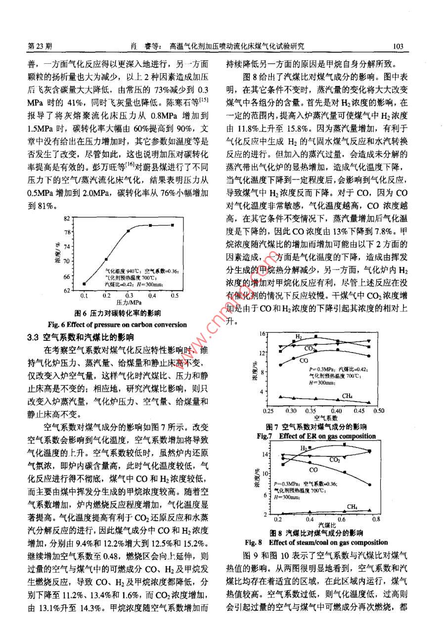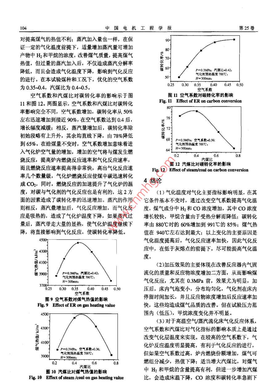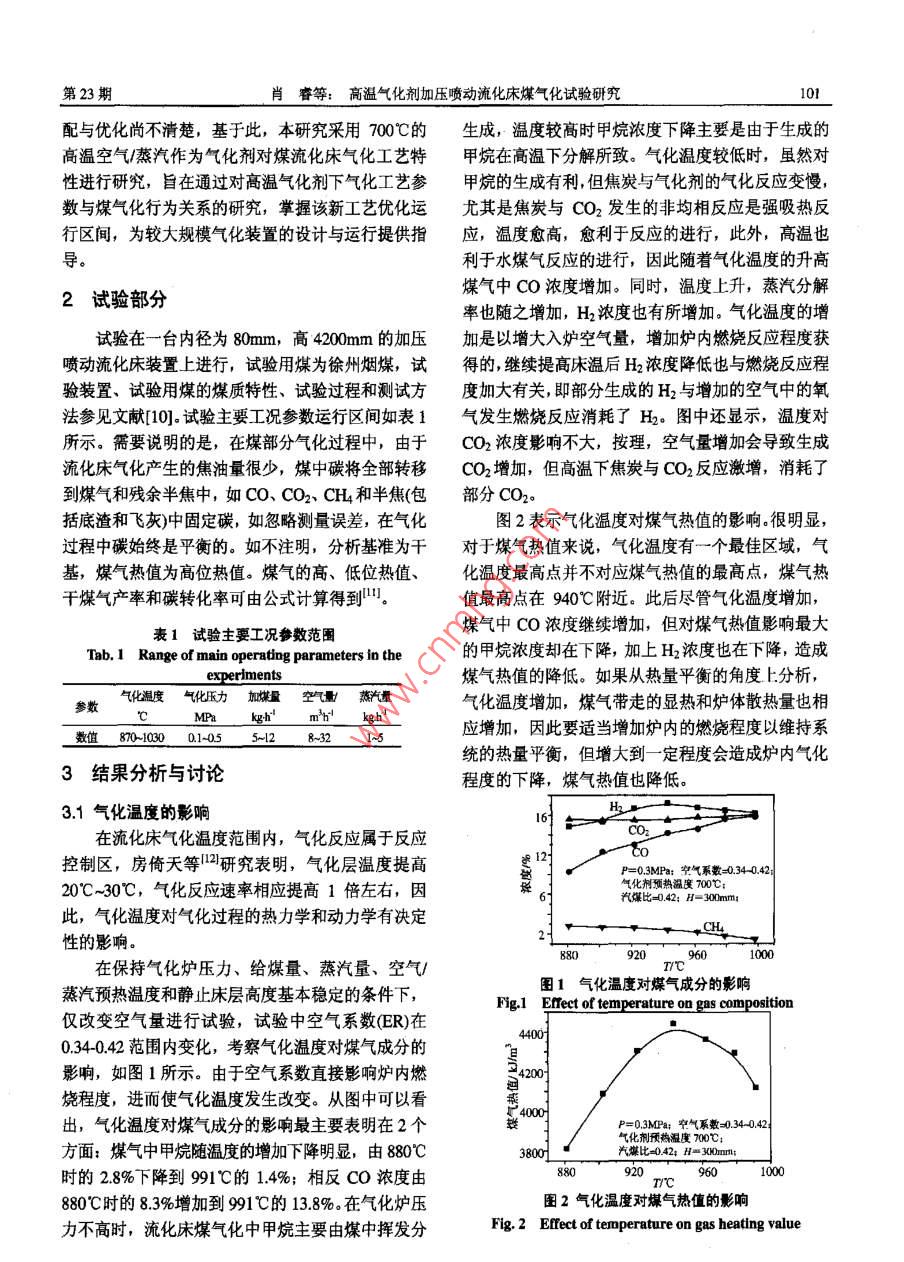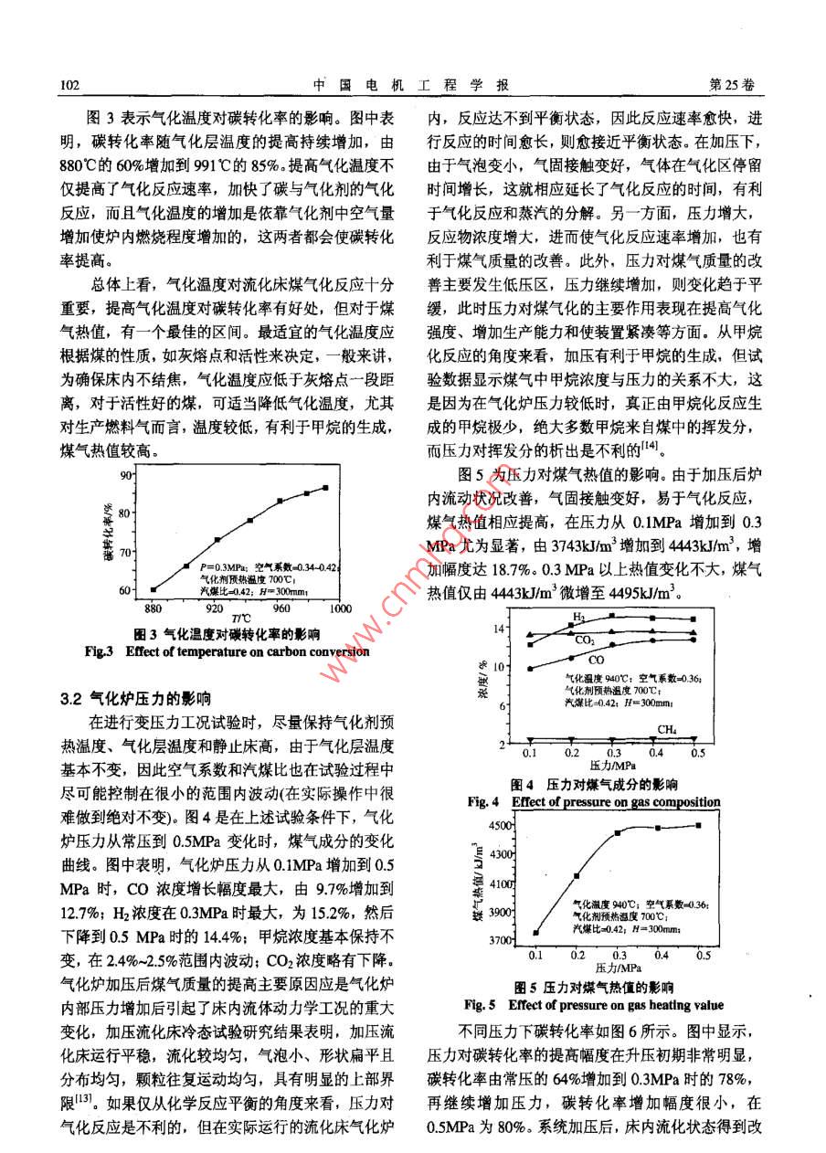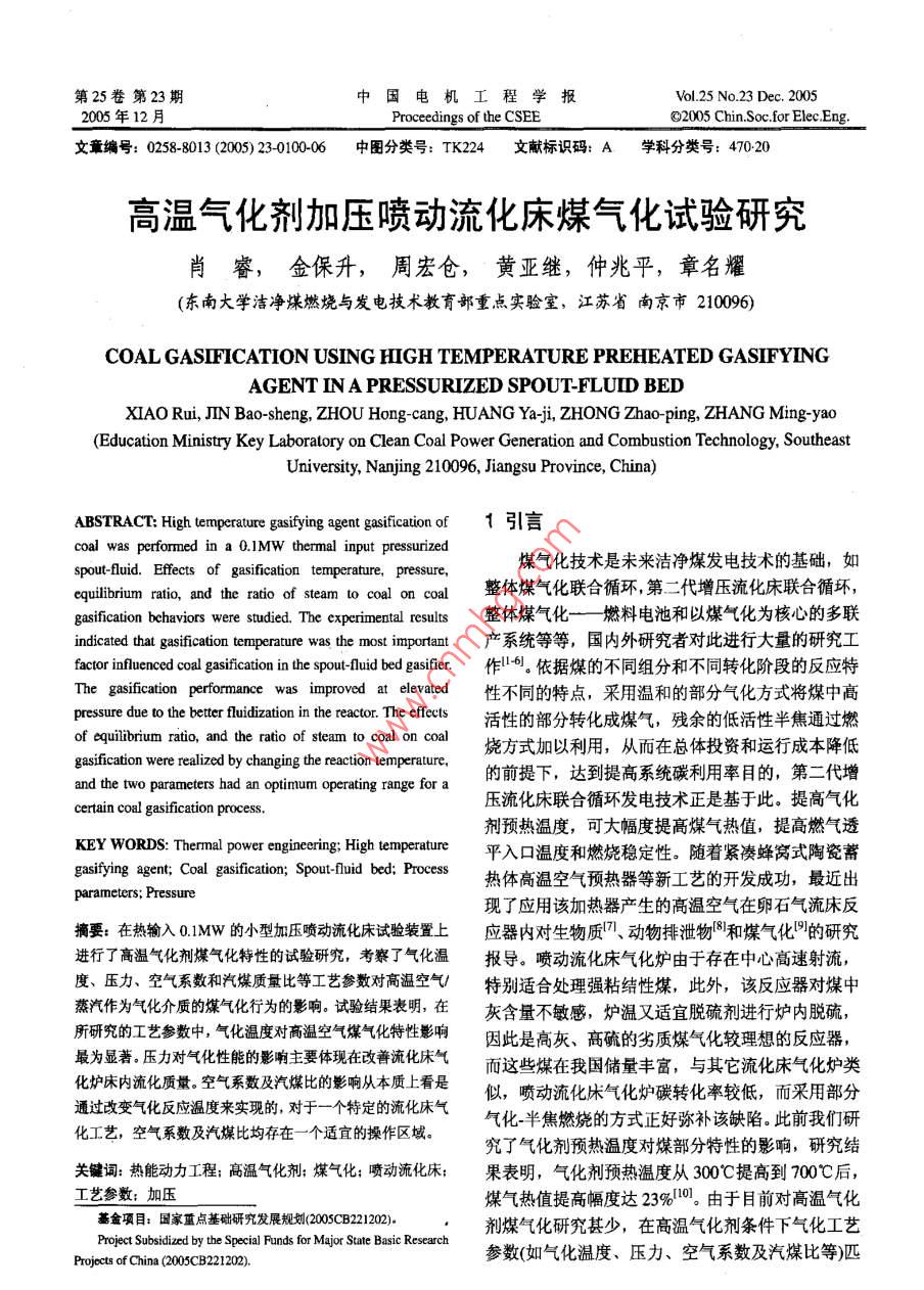 第25卷第23期中國(guó)電機(jī)工程學(xué)報(bào)Vol.25 No.23 Dec.20052005年12月Proceedings of the CSEE62005 Chin.Soc.for Ele Eng文章編號(hào): 0258-8013 (2005) 23-0100-06中團(tuán)分類號(hào): TK224文獻(xiàn)標(biāo)識(shí)碼: A學(xué)科分類號(hào): 470.20高溫氣化劑加壓噴動(dòng)流化床煤氣化試驗(yàn)研究肖睿,金保升,周宏倉(cāng),黃亞繼,仲兆平,章名耀(東南大學(xué)潔凈煤燃燒與發(fā)電技術(shù)教育部重點(diǎn)實(shí)驗(yàn)室,江蘇省南京市210096)COAL GASIFICATION USING HIGH TEMPERATURE PREHEATED GASIFYINGAGENT IN A PRESSURIZED SPOUT-FLUD BEDXIAO Rui, JIN Bao-sheng, ZHOU Hong-cang, HUANG Yaji, ZHONG Zhao-ping, ZHANG Ming-yao(Education Ministry Key Laboratory on Clean Coal Power Generation and Combustion Technology, SoutheastUniversity, Nanjing 210096, Jiangsu Province, China)ABSTRACT: High temperature gasifying agent gasification of1引言coal was performned in a 0.1MW thermal input pressurized煤氣化技術(shù)是未來(lái)潔凈煤發(fā)電技術(shù)的基礎(chǔ),如spout-fluid. Effects of gasification temperature, pressure,equilibrium ratio, and the ratio of steam to coal on coal整體煤氣化聯(lián)合循環(huán),第二代增壓流化床聯(lián)合循環(huán),gasification behaviors were studied. The experimental results整體煤氣化一燃料電池和以煤 氣化為核心的多聯(lián)indicated that gasification temperature was the most important產(chǎn)系統(tǒng)等等,國(guó)內(nèi)外研究者對(duì)此進(jìn)行大量的研究工factor influenced coal gasification in the spout-0luid bed gasifier.作"+6。依據(jù)煤的不同組分和不同轉(zhuǎn)化階段的反應(yīng)特The gasification performance was improved at elevated性不同的特點(diǎn),采用溫和的部分氣化方式將煤中高pressure due to the better fluidization in the reactor. The effects活性的部分轉(zhuǎn)化成煤氣,殘余的低活性半焦通過(guò)燃o(jì)f equilibrium ratio, and the ratio of steam to coal on coal燒方式加以利用,從而在總體投資和運(yùn)行成本降低gasification were realized by changing the reaction temperalure,and the two parameters had an optimum operating range for a的前提下,達(dá)到提高系統(tǒng)碳利用率目的,第二代增壓流化床聯(lián)合循環(huán)發(fā)電技術(shù)正是基于此。提高氣化certain coal gasification process.劑預(yù)熱溫度,可大幅度提高煤氣熱值,提高燃?xì)馔窴EY WORDS: Thermal power engineering; High temperature平入口溫度和燃燒穩(wěn)定性。隨著緊湊蜂窩式陶瓷蓄gasifying agent; Coal gasification; Spout-fluid bed; Process熱體高溫空氣預(yù)熱器等新工藝的開(kāi)發(fā)成功,最近出parameters; Pressure現(xiàn)了應(yīng)用該加熱器產(chǎn)生的高溫空氣在卵石氣流床反摘要:在熱輸入0.1MW的小型加壓噴動(dòng)流化床試驗(yàn)裝置上應(yīng)器內(nèi)對(duì)生物質(zhì)7、動(dòng)物排泄物8)和煤氣化的研究進(jìn)行了高溫氣化劑煤氣化特性的試驗(yàn)研究,考察了氣化溫報(bào)導(dǎo)。噴動(dòng)流化床氣化爐由于存在中心高速射流,度、壓力、空氣系數(shù)和汽煤質(zhì)量比等工藝參數(shù)對(duì)高溫空氣1特別適合處理強(qiáng)粘結(jié)性煤,此外,該反應(yīng)器對(duì)煤中蒸汽作為氣化介質(zhì)的煤氣化行為的影響。試驗(yàn)結(jié)果表明,在灰含量不敏感,爐溫又適宜脫硫劑進(jìn)行爐內(nèi)脫硫,所研究的工藝參數(shù)中,氣化溫度對(duì)高溫空氣煤氣化特性影響因此是高灰、高硫的劣質(zhì)煤氣化較理想的反應(yīng)器,最為顯著。壓力對(duì)氣化性能的影響主要體現(xiàn)在改善流化床氣而這些煤在我國(guó)儲(chǔ)量豐富,與其它流化床氣化爐類化爐床內(nèi)流化質(zhì)量??諝庀禂?shù)及汽煤比的影響從本質(zhì)上看是似,噴動(dòng)流化床氣化爐碳轉(zhuǎn)化率較低,而采用部分通過(guò)改變氣化反應(yīng)溫度來(lái)實(shí)現(xiàn)的,對(duì)于-一個(gè)特定的流化床氣氣化-半焦燃燒的方式正好彌補(bǔ)該缺陷。此前我們研化工藝,空氣系數(shù)及汽煤比均存在一個(gè)適宜的操作區(qū)域。究了氣化劑預(yù)熱溫度對(duì)煤部分特性的影響,研究結(jié)關(guān)鍵詞:熱能動(dòng)力工程;高溫氣化劑;煤氣化;噴動(dòng)流化床;果表明,氣化劑預(yù)熱溫度從300"C提高到700C后,工藝參數(shù):加壓煤氣熱值提高幅度達(dá)23%10]。由于目前對(duì)高溫氣化基金項(xiàng)目:國(guó)家重點(diǎn)基礎(chǔ)研究發(fā)展規(guī)劃(2005CB221202)。劑煤氣化研究甚少,在高溫氣化劑條件下氣化工藝Project Subsidized by the Special Funds for Major State Basic Research參數(shù)(如氣化溫度、壓力、空氣系數(shù)及汽煤比等)匹Projcts of China (2005CB221202).第23期肖睿等:高溫氣化劑加壓噴動(dòng)流化床煤氣化試驗(yàn)研究101配與優(yōu)化尚不清楚,基于此,本研究采用700°C的生成,溫度較高時(shí)甲烷濃度下降主要是由于生成的高溫空氣/蒸汽作為氣化劑對(duì)煤流化床氣化工藝特甲烷在高溫下分解所致。氣化溫度較低時(shí),雖然對(duì)性進(jìn)行研究,旨在通過(guò)對(duì)高溫氣化劑下氣化工藝參甲烷的生成有利,但焦炭與氣化劑的氣化反應(yīng)變慢,數(shù)與煤氣化行為關(guān)系的研究,掌握該新工藝優(yōu)化運(yùn)尤其是焦炭與CO2發(fā)生的非均相反應(yīng)是強(qiáng)吸熱反行區(qū)間,為較大規(guī)模氣化裝置的設(shè)計(jì)與運(yùn)行提供指應(yīng),溫度愈高,愈利于反應(yīng)的進(jìn)行,此外,高溫也導(dǎo)。利于水煤氣反