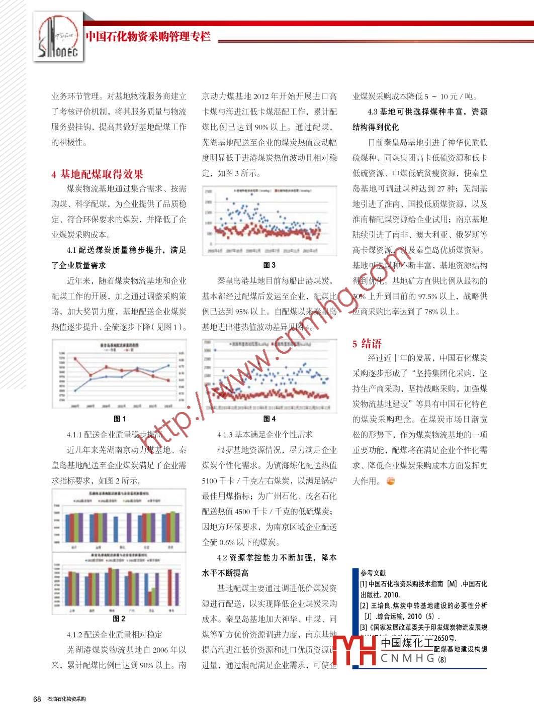 中國石化物資采購管理專欄lonec煤炭物流基地配煤做法及作用王丹海.中國石化集團公司物資裝備部北京100728摘要: 本文通過總結中國石化煤炭物流基地在開展配煤工作過程中的一系列做法,對配煤在企業(yè)保供、穩(wěn)定煤質、降本增效等方面發(fā)揮的作用進行了較詳細的論述。關鍵詞:物流基地;保供;降本增效0引言源的重要動力設備?;谑髽I(yè)的生從2004年開始,中國石化依托沿根據(jù)國家發(fā)改委《煤炭物流發(fā)展規(guī)產(chǎn)特點, 動力鍋爐必須“穩(wěn)定、連續(xù)”海、內(nèi)河港口先后建設了四個煤炭物流劃》,為發(fā)展現(xiàn)代煤炭物流,降低物流地提供熱源以滿足石化生產(chǎn)需要?;亍J徍禾课锪骰?004年投運,成本、增強煤炭穩(wěn)定供應能力,中央、1.2煤炭采購基本情況主要為南京周邊沿江企業(yè)提供動力煤,地方和企業(yè)不斷加大煤炭物流基礎設施2000年之前,中國石化煤炭采購以資 源渠道主要來自淮南、國投新集等徐投資力度,以集散、儲存、配煤等功能各下屬企業(yè)的分散采購為主,集中采購淮五礦。秦皇島港煤炭物流基地2008為主的煤炭物流基地快速發(fā)展。物流基率不足 1%。在煤炭供給緊張時,分散年投運, 主要為沿海企業(yè)提供動力煤,地通過主動選煤、按需購煤、科學配煤,采購可以發(fā)揮靈活高效優(yōu)勢,利用各種資源主要來自神華、 中煤、同煤等礦方可以有效控制入爐煤的發(fā)熱量、揮發(fā)分途徑獲取煤炭資源。這種采購行為存在在山西大同、 朔州地區(qū)的煤礦。南京港和硫分等重要煤質參數(shù),確保鍋爐運行供應商“多”、采購渠道“亂”、供應煤炭物流基地建于2011年,主要為南的經(jīng)濟性和安全性,幫助企業(yè)降本增效。鏈“長”、供應風險“大”、議價能力京周邊沿江 企業(yè)提供動力煤,資源主要自2004年開始,中國石化相繼建成了“差”、采購過程“不規(guī)范”等問題,來自秦皇島海進江資源以及進口資源。四個煤炭物流基地,在企業(yè)保供、穩(wěn)定無法保證企業(yè)煤炭 “安全、及時、經(jīng)濟”湛江港 煤炭物流基地建于2013年,主煤質、降本增效方面發(fā)揮了重要作用。供應,并會直接影響到各生產(chǎn)裝置的安要 為華南地區(qū)企業(yè)提供進口煤炭。全、穩(wěn)定、連續(xù)生產(chǎn)。為解決上述問題,1中國石化煤炭采購基本情況中國石化在煤炭采購中大力開展集團化2 基地資源和企業(yè)需求存在間煤炭是石化企業(yè)連續(xù)安全生產(chǎn)的第采購工作,加大直接與礦方采購力度和題 分析二血液,主要用作動力燃料和化工原料。戰(zhàn)略采購力度,建設煤炭物流基地。通2.1基地資源情況問題分析中國石化25家用煤企業(yè)分布在14個省過建設煤炭物流基地,集合了企業(yè)需求,四個煤炭物流基地儲備的煤炭煤質市,年消耗煤炭約占全國煤炭總需求量為實現(xiàn)集團化采購打 下了堅實的基礎。差異大,均不能直接給企業(yè)使用。的0.7%。13煤炭基地基本情況秦皇島基地目前共引進了27個煤1.1企業(yè)用煤基本情況目前國內(nèi)煤炭中轉基地建設主要有種, 主要為貧瘦煤、煙煤,各煤種之間中國石化鍋爐燃料為煤炭、渣油、三種情況:依托沿海港口建設煤炭中轉熱值、 全水、全硫差別較大,有的資源煉廠余氣以及石油焦,其中燃煤鍋爐占基地,為本區(qū)域提供煤炭儲存、 配煤、硫含量低,全水高;有的資源硫含量偏74%。企業(yè)的燃煤鍋爐主要為煤粉鍋爐中轉等服務;依托內(nèi)河港口建設煤炭中高( 1.3-1.8% ):有的資源熱值差別較大。中國煤化工和循環(huán)流化床鍋爐(CFB),用于發(fā)電、轉基地,提供煤炭陸水中轉、儲存、MHCNMHG主要為貧瘦產(chǎn)汽,是為煉油、化工生產(chǎn)提供動力資煤等服務;建設陸路的煤炭中轉基地。,HMN11心1品質差異大。來.66 石油石化物資采購源包括兩個部分,-是秦皇島移庫資源,定價, 效益核算,標準管理”的標準配(1 )不斷優(yōu)化資源結構,實現(xiàn)主動以山西、內(nèi)蒙資源為主;另-一個是進口煤流程, 滿足了企業(yè)煤質穩(wěn)定和鍋爐用購煤。 基地從長遠著眼,根據(jù)需求煤種,煤資源,以澳洲、南非.俄羅斯資源為主。煤需求, 為規(guī)范中國石化煤炭采購管理在制訂年度煤炭訂貨計劃時, 基地訂貨蕪湖基地進港煤炭煤質較相近,主發(fā)揮 了重要作用。就向戰(zhàn)略供應商、大礦傾斜;另外加大要為準南地區(qū)煙煤,但存在熱值波動大與戰(zhàn)略供應商的溝通協(xié)調力度,積極引的問題。;基地配煤主要方法和流程進神華、中煤、同煤、淮南等低硫優(yōu)價湛江港基地煤質與南京港相似,主為保證企業(yè)用煤,在基地建設投用適宜煤源。要是進口資源和北方港口資源。開始后,中國石化根據(jù)基地資源情況,(2 )制定配煤方案,實現(xiàn)按需配煤。2.2企業(yè)用煤質量問題分析利用港口設施,在基地實行科學配煤?;亟y(tǒng)一協(xié)調原煤進場,根據(jù)進場煤炭2.2.1企業(yè)用煤煤種雜、質量各不目 前中國石化煤炭物流基地年中轉煤炭資 源品質按需堆放,并繪制電子垛型圖,相同近1000 萬噸,其中動力煤配煤比例達對 場地煤炭質量結構進行電子標示,對為保證平穩(wěn)供熱,燃煤鍋爐用煤盡到 94%以上。場地質量結構情況做到心中有數(shù);在給量按照鍋爐設計煤種來選擇和采購煤3.1基地配煤三種方式企業(yè)配送