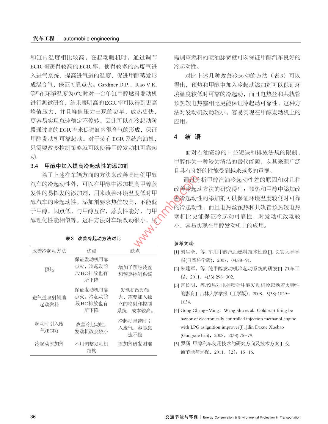 甲醇汽車?yán)淦饎有匝芯恐鞈c功,張夢,包偉,陶薇薇(長安大學(xué)汽車學(xué)院,陜西西安710064)摘要:甲醇的冷起動性是車用甲醇然料應(yīng)用中普遍存在的問題。本文針對這一問題,分析了甲醇發(fā)動機(jī)冷起動差的原因,闡述了當(dāng)前改善甲醇發(fā)動?xùn)i冷起動性的方法,通過對比分析得岀:預(yù)熱和甲醇中添加改善冷起動性的添加劑可以保證環(huán)境溫度較低時發(fā)動機(jī)可靠的冷起動性,與電熱塞預(yù)熱相比,電熱絲預(yù)熱和共軌管預(yù)熱甲酹發(fā)動?xùn)i冷起動可靠性好。關(guān)鍵詞:甲醇發(fā)動機(jī);冷起動;預(yù)熱中圖分類號:U469.7文獻(xiàn)標(biāo)識碼:ADOI:10.3969/isn.1673-6478201304.006Research of the cold start for methanol automobileZhu Qinggong, Zhang Meng, Bao Wei, Tao WeiweiSchool of Automobile Changan University, Shaanxi Xi'an 710064, China)Abstract: The cold start behavior of methanol is a common problem in the application of vehicle methanolfuel. In this thesis, in order to solve this problem, the clod start problem of methanol engine be analyzed, the methods of promoting the cold start of the methanol engine be discussed. Through the contrastanalysis we get the results: preheated and added additive to improve cold start behavior in methanol can ensure the cold start reliability of the engine when the environment temperature is low, compared with theglow-plug preheating, the cold start reliability of heating wire preheating and common rail pipe preheatingKey word: methanol engine; the cold start; preheating1概述的是電動汽車和天然氣汽車,電動汽車由于續(xù)駛里程短和電池壽命的影響目前還不能大力推廣使用目前,世界各國都在致力于保護(hù)環(huán)境,維護(hù)生天然氣汽車也是由于續(xù)駛里程短的原因,目前只用態(tài)平衡,把充分有效地開發(fā)利用自然資源作為本國于城市公交汽車和出租車上,而甲醇汽車不受續(xù)駛發(fā)展經(jīng)濟(jì)的重要戰(zhàn)略。面對石油資源的日益短缺和里程的限制,并且甲醇燃料本身含氧,在汽車發(fā)動排放法規(guī)的限制,世界各大汽車生產(chǎn)廠家也在不遺機(jī)中燃燒更加完全,效率高,排放污染少,辛烷值余力地硏究可替代石油的燃料。我國硏究應(yīng)用較多高,發(fā)動機(jī)抗爆震性能増強(qiáng),是一種能替代石油的作者簡介:朱慶功(1989-),男,碩士研究生,研究方向為發(fā)動機(jī)代用燃料。E-mail:331860273@ q9 con2013年第3期汽車工程| automobile engineering表1甲醇和汽油的理化性質(zhì)30產(chǎn)生項目甲醇汽油20起動容易化學(xué)式4~C12的10CH3OH起動困難烴化合物0分子量出溫度不能起動碳含量(質(zhì)量比%)氫含量(質(zhì)量比%)12.5氧含量(質(zhì)量比%)圖110%餾出溫度對汽油機(jī)性能的影響理論空燃比/(質(zhì)量比)14.9雷德蒸汽壓(37.8℃)/MPa限,造成起動困難。燃料蒸發(fā)性能的評價指標(biāo)是餾沸點/℃C64.5程和蒸汽壓,而燃料餾程中10%餾岀溫度標(biāo)志著它閃點/℃的起動性,圖1為燃料10%餾出溫度對發(fā)動機(jī)性能凝點/℃C的影響,甲醇的沸點為64.5℃,從圖中可以看出汽化潛熱/KJ當(dāng)環(huán)境溫度低于-10℃時,燃燒甲醇燃料發(fā)動機(jī)將燃料低熱值MJ·kg43.5會起動困難。研究法(RON)而且,甲醇的汽化潛熱為1109KJ/kg,而汽油值馬達(dá)法(MON)70~84的汽化潛熱只有310KJ/kg,甲醇的汽化潛熱為汽油的三倍多,蒸發(fā)時吸收的熱量多,導(dǎo)致發(fā)動機(jī)進(jìn)氣性能優(yōu)良的汽車燃料。道及氣缸的溫度急劇下降,新鮮充量中甲醇的蒸發(fā)甲醇是煤化工產(chǎn)業(yè)的下游產(chǎn)品之一,以一定比條件惡化。假設(shè)燃料蒸發(fā)吸收的熱量來自與之混合例添加在汽油中成為甲醇汽油。甲醇是結(jié)構(gòu)最簡單的空氣,燃料與空氣按照理論空燃比混合,混合氣的飽和一元醇,是一種無色、有酒精氣味的、有的溫度下降可表示為毒、易揮發(fā)而且易燃的液體,與水、乙醇以及其他q/(A/FX cp)有機(jī)溶劑能夠互溶,理化性能如表1所示。式中,q為燃料的汽化潛熱,A/F為燃料理論空燃發(fā)動機(jī)燃燒甲醇燃料時,由于甲醇的汽化潛熱比,c為常溫常壓下空氣的定壓比熱容為汽油的3倍多,甲醇燃料蒸發(fā)形成混合氣需要吸cn=1.004K/kg·K。收更多的熱量,會造成發(fā)動機(jī)進(jìn)氣溫度降低,在空通過計算,在不考慮混合氣壓縮條件下,可以氣溫度較低的寒冷地區(qū),當(dāng)發(fā)動?xùn)i燃燒髙比例甲醇得出理論空燃比下燃料完全蒸發(fā)時混合氣溫度的下汽油(通常為M85、M100)時,會造成發(fā)動機(jī)啟動降(表2),甲醇混合氣溫度下降172.59K,汽油混困難。合氣溫度下降只有21K,甲醇與空氣混合后,混合本文分析了高比例甲醇汽油發(fā)動機(jī)冷啟動困難氣溫度的下降,使甲醇的蒸發(fā)更加困難。的原因,參考國內(nèi)外有關(guān)研究成果、文獻(xiàn),闡述了同時,甲醇的閃點為11℃,而汽油的閃點只當(dāng)前改善高比例甲醇汽油冷起動性的方法,解決高比例甲醇汽油在推廣中存在的技術(shù)問題表2燃料完全蒸發(fā)混合氣溫度的下降值2高比例甲醇汽油冷起動問題燃然料汽油甲醇汽化潛熱/KJ·kg1109冷起動時,由于環(huán)境溫度低,燃料蒸發(fā)困難,理論空燃比使得形成的混合氣濃度過低,達(dá)不到燃料的著火極At/K21.00172.59交通節(jié)能與環(huán)保| Energy Conservation& Environmental Protection in Transportation汽車程| automobile engineering有-45℃,與汽油相比,由于低閃點使得甲醇不