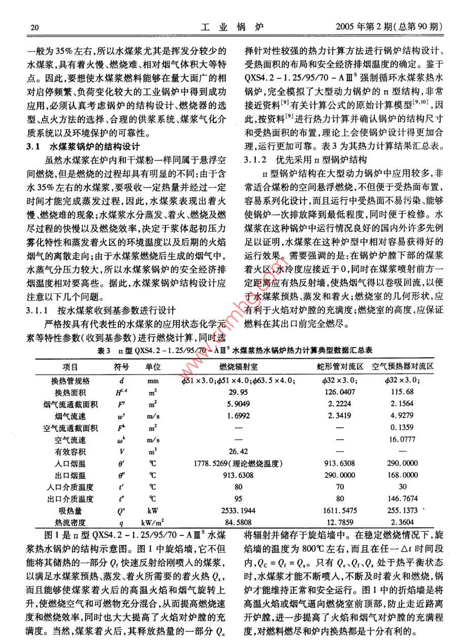 研究與開發(fā)·水煤漿及其在工業(yè)鍋爐中的應(yīng)用文章編號:10048774(2005)02-1707水煤漿及其在工業(yè)鍋爐中的應(yīng)用卜銀坤',王紹華2,汪景武3(1北京合鼎動力技術(shù)有限責任公司,北京10002;2.北京虹鼎基業(yè)科技發(fā)展有限公司,北京100012;3.北京煤炭設(shè)計研究院,北京100014)摘要:文章通過對n型QXS4.2-1.25/9570-AⅢ°水煤漿熱水鍋爐的設(shè)計實踐闡述了筆者對水煤漿有關(guān)特性參數(shù)的理解和確認原則,認為有效控制和利用水煤槳的特性參數(shù)對作者簡介:卜銀坤水煤漿成功應(yīng)用于工業(yè)鍋爐具有非同小可的影響提出了設(shè)計水煤漿工業(yè)鍋爐應(yīng)當注意的問畢業(yè)于西安交通大題,認為水煤漿將是一些工業(yè)鍋爐走向環(huán)保的捷徑。學(xué)鍋爐專業(yè),高級工關(guān)鍵詞:水煤漿;特性參數(shù);工業(yè)鍋爐;應(yīng)用程師。從事鍋爐、壓中圖分類號:TK229文獻標識碼:B力容器設(shè)計三十多年,擁有專利技術(shù)六Coal Water Mixture and its application項。現(xiàn)任北京合鼎in industrial boier動力技術(shù)有限責任公司總工,主要負責水煤漿工業(yè)鍋爐的BU Yin-kun', WANG Shao-hua, WANG Jing-wu'研究和開發(fā)。(1. Beijing Heding Power Technology Co, Ltd, Beijing 100012, China;2. Beijing Hongding Jiye Science and technology, Co, Ltd, Beijing 100012, China3. Beijing Coal Designing and Research Institute, Beijing 100014, ChinaAbstract: By practice of design QXS42-1 25/95/70-A coal water mixture fuel hot-water boiler: Set forthwriters understand and affirmative principle of characteristic parameter on coal water mixture; Think effective control and usecharacteristic parameter on coal water mixture, be there determining influence of succeeded application on coal water mixturein industrial boiler Put should notice question in design of coal water mixture industrial boiler; Think coal water mixture willbe a shortcut of industrial boiler bring environmental protectionKey words: coal water mixture; characteristic parameter; industrial boller; application前言率高、容易實現(xiàn)低排、環(huán)保要求,還可以替代油燃料。水煤漿作為一種潔凈煤燃料雖然問世已有近因此,推廣應(yīng)用水煤漿燃料,對于富煤貧油的我國經(jīng)百年的歷史,但是真正受到重視和發(fā)展的時間應(yīng)當算是20世紀70年代初。當時美國、瑞典、意大利、「數(shù)量和總設(shè)計能力均居世界第一位水煤漿已經(jīng)英國、日本和俄羅斯等國家投入大量的人力物力成為商品化的潔凈燃料。和財力,對水煤漿的制漿、貯運和燃燒技術(shù)進行了研水煤漿的制漿和燃燒技術(shù)雖然比較成熟,在究和開發(fā),并首先使水煤漿在一些電廠獲得了成功些電廠和工業(yè)爐窯中也獲得過成功應(yīng)用,但是在量應(yīng)用12。大面廣的中小型工業(yè)鍋爐中的應(yīng)用實例卻很少,而中國研究開發(fā)水煤漿技術(shù)始于20世紀80年代且存在一些有待改進和完善的技術(shù)問題。對此,初經(jīng)過20多年的努力,目前我國的水煤漿技術(shù)已筆者通過對n型QX42-1.25/95/70-AⅢ水煤經(jīng)達到國際先進水平。水煤漿具有成本低、燃燒效漿熱水鍋爐的系統(tǒng)設(shè)計實踐淺談對水煤漿及其在工業(yè)鍋爐中的應(yīng)用的認識,旨在進行技術(shù)交流。2水煤漿及其特性稿日期:20040工業(yè)鍋爐2005年第2期(總第90期)2.1水煤漿簡介于裝卸、貯存、管道輸送及霧化空間燃燒,可以廣泛水煤漿是將煤研磨(通常為濕法研磨)成一定應(yīng)用于工業(yè)爐窯、工業(yè)鍋爐及電站鍋爐中,其中超低粒度(平均粒度為50μm左右),與水按一定的質(zhì)量灰水煤漿還可以直接代替油燃料而應(yīng)用于柴油機和比例混合[煤:水=(65~70):(34~29)],再添加燃氣輪機。少量的添加劑(1%左右),經(jīng)過強力攪拌而形成的水煤漿一般由低灰高發(fā)熱量、高揮發(fā)分的原煤煤水兩相流漿體4。因為整個過程是在常溫下進或洗選精煤加工而成,不但燃燒效率高、節(jié)能和環(huán)行的,所以它不僅保持了煤炭原有的物理特性,而且保,而且價格低廉。水煤漿在燃料家族中的環(huán)保性、具有良好的流動性和穩(wěn)定性,能夠像燃料油那樣易經(jīng)濟性和政策支持性如表15。表1常用燃料的環(huán)保性、經(jīng)濟性及政策支持性(其中價格是按2000年北京地區(qū)市場價格)水煤漿標準煤重油輕柴油煤氣天然氣發(fā)熱量(M/kg、MJ/m3MkWh)20.9129.31392841.915.9135.593.60價格(元/kg元/Nm3元/kWh)0.353,200.47價格/單位熱值(元/M)0.020.010.080.060.050.13燃燒效率(%)98~9980-9098-999999環(huán)保達標性達標不達標達標達標達標達標政策支持性鼓勵限制不鼓勵不鼓勵不鼓勵鼓勵不鼓勵由表1可見:在等熱值條件下,價格從低往高的表2QXs4.2-1.2595/70-AⅢ水煤漿熱水鍋爐燃料依次為標準煤、水煤漿、重油、天然氣煤氣、輕水煤漿燃料收到基特性數(shù)據(jù)柴油、電;水煤漿是性價比較好的環(huán)保潔凈燃料。名稱符號單位依據(jù)數(shù)據(jù)2.2水煤漿的特性收到基氫H%2.16水煤漿的特性除了常規(guī)燃料中的碳(C)、氫收到基氧O%作為水煤漿的原煤,并視為設(shè)計552(H)、氧(O)、氮(N)、硫(S)、灰分(A)、水分(W)收到基氮N%用代表性燃料;0.55點(2)外,還應(yīng)當包括收到基硫5%2水煤漿濃度為%,水分0.82固體濃度、粒度、粘度和穩(wěn)定性。為了便于水煤漿燃到基An%為3%添加劑為13、數(shù)值來源為原煤成分之7.68燒計算從而合理進行鍋爐結(jié)構(gòu)