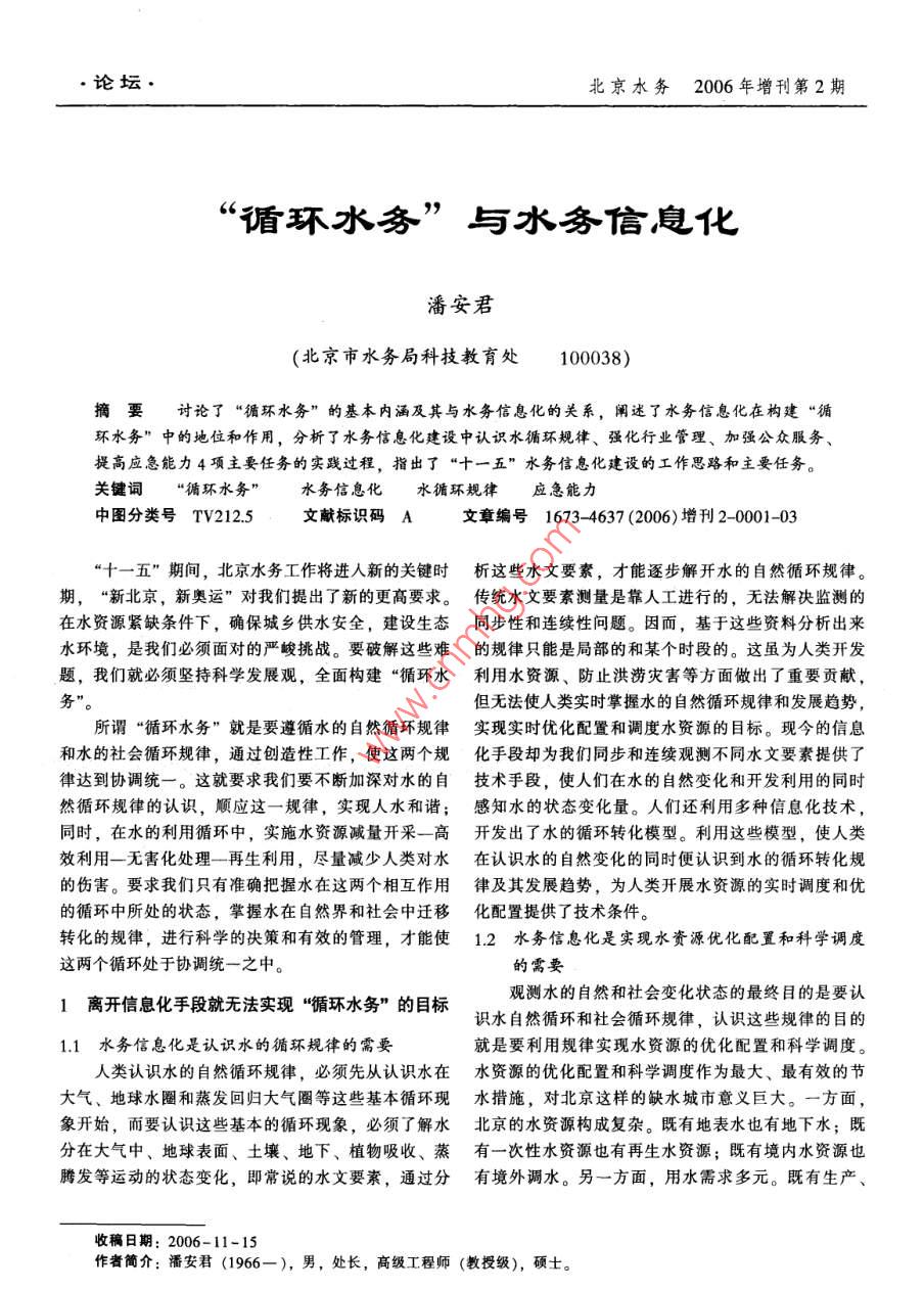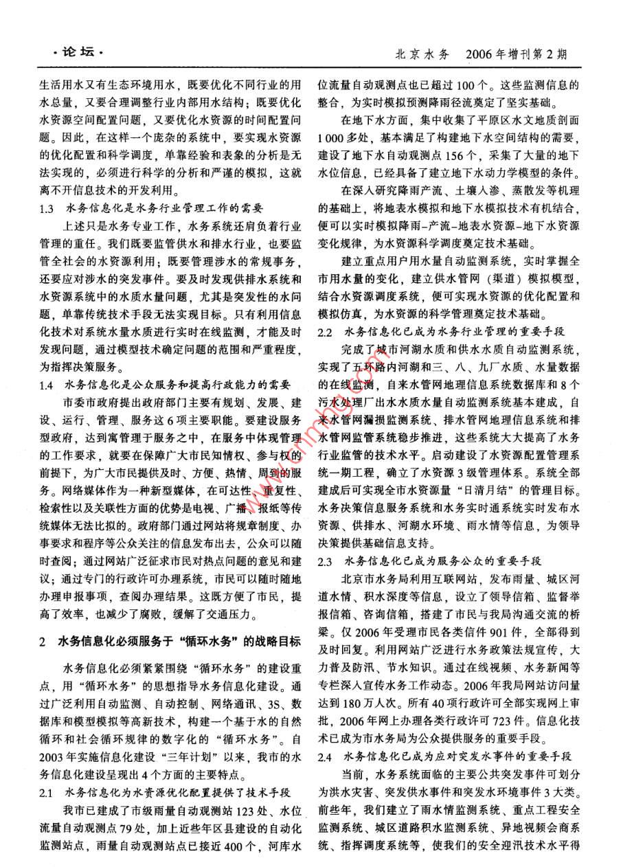 論壇北京水務(wù)2006年增刊第2期“循環(huán)水務(wù)”與水務(wù)信息化潘安君(北京市水務(wù)局科技教育處100038)摘要討論了“循環(huán)水務(wù)”的基本內(nèi)涵及其與水務(wù)信息化的關(guān)系,闡述了水務(wù)信息化在構(gòu)建“循環(huán)水務(wù)”中的地位和作用,分析了水務(wù)信息化建設(shè)中認(rèn)識水循環(huán)規(guī)律、強化行業(yè)管理、加強公眾服務(wù)、提高應(yīng)急能力4項主要任務(wù)的實踐過程,指出了“十一五”水務(wù)信息化建設(shè)的工作思路和主要任務(wù)。關(guān)鍵詞“循環(huán)水務(wù)”水務(wù)信息化水循環(huán)規(guī)律應(yīng)急能力中圖分類號TV212.5文獻(xiàn)標(biāo)識碼A文章編號1673-4637(2006)增刊2-0001-03十一五”期間,北京水務(wù)工作將進(jìn)人新的關(guān)鍵時析這些水文要素,才能逐步解開水的自然循環(huán)規(guī)律期,“新北京,新奧運”對我們提出了新的更高要求。傳統(tǒng)水文要素測量是靠人工進(jìn)行的,無法解決監(jiān)測的在水資源緊缺條件下,確保城鄉(xiāng)供水安全,建設(shè)生態(tài)同步性和連續(xù)性問題。因而,基于這些資料分析出來水環(huán)境,是我們必須面對的嚴(yán)峻挑戰(zhàn)。要破解這些難的規(guī)律只能是局部的和某個時段的。這雖為人類開發(fā)題,我們就必須堅持科學(xué)發(fā)展觀,全面構(gòu)建“循環(huán)水利用水資源、防止洪澇災(zāi)害等方面做出了重要貢獻(xiàn),務(wù)但無法使人類實時掌握水的自然循環(huán)規(guī)律和發(fā)展趨勢,所謂“循環(huán)水務(wù)”就是要遵循水的自然循環(huán)規(guī)律實現(xiàn)實時優(yōu)化配置和調(diào)度水資源的目標(biāo)?,F(xiàn)今的信息和水的社會循環(huán)規(guī)律,通過創(chuàng)造性工作,使這兩個規(guī)化手段卻為我們同步和連續(xù)觀測不同水文要素提供了律達(dá)到協(xié)調(diào)統(tǒng)一。這就要求我們要不斷加深對水的自技術(shù)手段,使人們在水的自然變化和開發(fā)利用的同時然循環(huán)規(guī)律的認(rèn)識,順應(yīng)這一規(guī)律,實現(xiàn)人水和諧;感知水的狀態(tài)變化量。人們還利用多種信息化技術(shù),同時,在水的利用循環(huán)中,實施水資源減量開采一高開發(fā)出了水的循環(huán)轉(zhuǎn)化模型。利用這些模型,使人類效利用一無害化處理一再生利用,盡量減少人類對水在認(rèn)識水的自然變化的同時便認(rèn)識到水的循環(huán)轉(zhuǎn)化規(guī)的傷害。要求我們只有準(zhǔn)確把握水在這兩個相互作用律及其發(fā)展趨勢,為人類開展水資源的實時調(diào)度和優(yōu)的循環(huán)中所處的狀態(tài),掌握水在自然界和社會中遷移化配置提供了技術(shù)條件轉(zhuǎn)化的規(guī)律,進(jìn)行科學(xué)的決策和有效的管理,才能使1.2水務(wù)信息化是實現(xiàn)水資源優(yōu)化配置和科學(xué)調(diào)度這兩個循環(huán)處于協(xié)調(diào)統(tǒng)一之中。的需要1離開信息化手段就無法實現(xiàn)“循環(huán)水務(wù)”的目標(biāo)觀測水的自然和社會變化狀態(tài)的最終目的是要認(rèn)識水自然循環(huán)和社會循環(huán)規(guī)律,認(rèn)識這些規(guī)律的目1.1水務(wù)信息化是認(rèn)識水的循環(huán)規(guī)律的需要就是要利用規(guī)律實現(xiàn)水資源的優(yōu)化配置和科學(xué)調(diào)度。人類認(rèn)識水的自然循環(huán)規(guī)律,必須先從認(rèn)識水在水資源的優(yōu)化配置和科學(xué)調(diào)度作為最大、最有效的節(jié)大氣、地球水圈和蒸發(fā)回歸大氣圈等這些基本循環(huán)現(xiàn)水措施,對北京這樣的缺水城市意義巨大。一方面象開始,而要認(rèn)識這些基本的循環(huán)現(xiàn)象,必須了解水北京的水資源構(gòu)成復(fù)雜。既有地表水也有地下水;既分在大氣中、地球表面、土壤、地下、植物吸收、蒸有一次性水資源也有再生水資源;既有境內(nèi)水資源也騰發(fā)等運動的狀態(tài)變化,即常說的水文要素,通過分有境外調(diào)水。另一方面,用水需求多元。既有生產(chǎn)收稿日期:2006-11-15作者簡介:潘安君(1966-),男,處長,高級工程師(教授級),碩士論壇·北京水務(wù)2006年增刊第2期生活用水又有生態(tài)環(huán)境用水,既要優(yōu)化不同行業(yè)的用位流量自動觀測點也已超過100個。這些監(jiān)測信息的水總量,又要合理調(diào)整行業(yè)內(nèi)部用水結(jié)構(gòu);既要優(yōu)化整合,為實時模擬預(yù)測降雨徑流奠定了堅實基礎(chǔ)。水資源空間配置問題,又要優(yōu)化水資源的時間配置問在地下水方面,集中收集了平原區(qū)水文地質(zhì)剖面題。因此,在這樣一個龐雜的系統(tǒng)中,要實現(xiàn)水資源1000多處,基本滿足了構(gòu)建地下水空間結(jié)構(gòu)的需要,的優(yōu)化配置和科學(xué)調(diào)度,單靠經(jīng)驗和表象的分析是無建設(shè)了地下水自動觀測點156個,采集了大量的地下法實現(xiàn)的,必須進(jìn)行科學(xué)的分析和嚴(yán)謹(jǐn)?shù)哪M,這就水位信息,已經(jīng)具備了建立地下水動力學(xué)模型的條件離不開信息技術(shù)的開發(fā)利用。在深入研究降雨產(chǎn)流、土壤人滲、蒸散發(fā)等機(jī)理1.3水務(wù)信息化是水務(wù)行業(yè)管理工作的需要的基礎(chǔ)上,將地表水模擬和地下水模擬技術(shù)有機(jī)結(jié)合,上述只是水