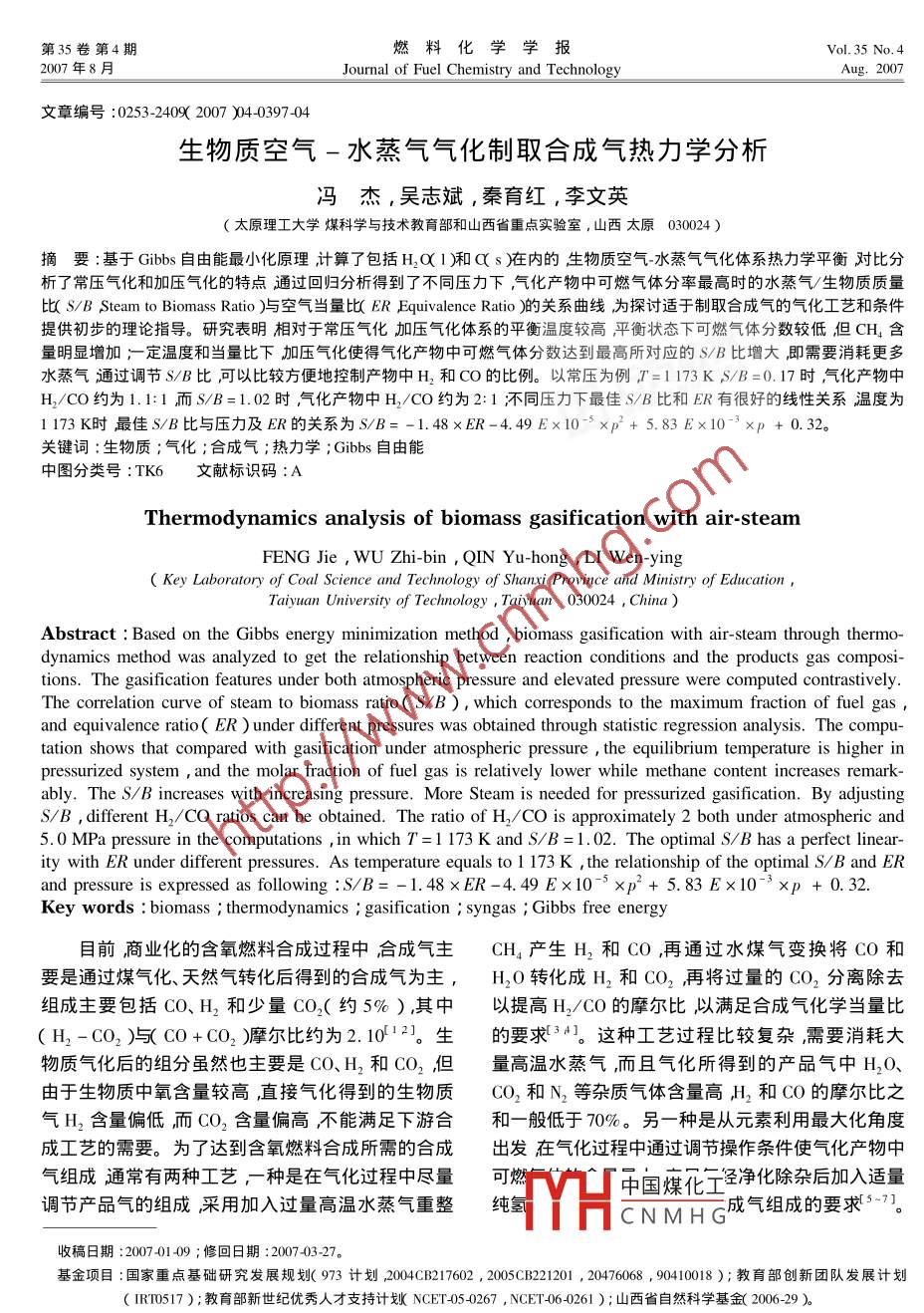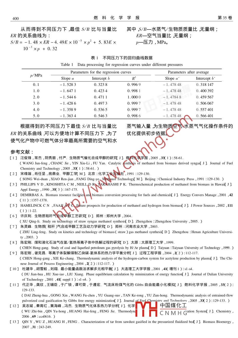 第35卷第4期燃料化學(xué)學(xué)報(bào)Vol 35 No 42007年8月Journal of Fuel Chemistry and TechnologyAug.2007文章編號:0253-24092007)4039704生物質(zhì)空氣-水蒸氣氣化制取合成氣熱力學(xué)分析馮杰,吳志斌,秦育紅,李文英太原理工大學(xué)煤科學(xué)與技術(shù)教育部和山西省重點(diǎn)實(shí)驗(yàn)室,山西太原030024)摘要:基于 Gibbs自由能最小化原理計(jì)算了包括H2Xl)和αs在內(nèi)的生物質(zhì)空氣水蒸氣氣化體系熱力學(xué)平衡對比分析了常壓氣化和加壓氣化的特點(diǎn)通過回歸分析得到了不同壓力下,氣化產(chǎn)物中可燃?xì)怏w分率最高時(shí)的水蒸氣/生物質(zhì)質(zhì)量(S/ B Steam to biomass ratio)與空氣當(dāng)量比 ER Equivalence Ratio)的關(guān)系曲線為探討適于制取合成氣的氣化工藝和條件提供初步的理論指導(dǎo)。研究表明相對于常壓氣化加壓氣化體系的平衡溫度較高平衡狀態(tài)下可燃?xì)怏w分?jǐn)?shù)較低但CH4含量眀顯增加冖定溫度和當(dāng)量比下加壓氣化使得氣化產(chǎn)物中可燃?xì)怏w分?jǐn)?shù)達(dá)到最高所對應(yīng)的SB比增大即需要消耗更多水蒸氣通過調(diào)節(jié)S/B比可以比較方便地控制產(chǎn)物中H2和CO的比例。以常壓為例r=1173K/B=0.17時(shí)氣化產(chǎn)物中H2CO約為1.1:1而S/B=1.02時(shí)氣化產(chǎn)物中H2/CO約為2:1不同壓力下最佳S/B比和ER有很好的線性關(guān)系溫度為1173K時(shí)最佳S/B比與壓力及ER的關(guān)系為S/B=-1.48×ER-4.49E×103×p2+5.83E×10-xp+0.32關(guān)鍵詞:生物質(zhì);氣化;合成氣;熱力學(xué); Gibbs自由能中圖分類號:TK6文獻(xiàn)標(biāo)識碼:AThermodynamics analysis of biomass gasification with air-steamFENG Jie, wU Zhi-bin, Qin Yu-hong, LI Wen-yingKey Laboratory of Coal Science and Technology of Shanxi Province and Ministry of EducationTaiyuan University of Technology, Taiyuan 030024, ChinaAbstract: Based on the Gibbs energy minimization method, biomass gasification with air-steam through thermo-dynamics method was analyzed to get the relationship between reaction conditions and the products gas compositions. The gasification features under both atmospheric pressure and elevated pressure were computed contrastivelyThe correlation curve of steam to biomass ratio( S/B), which corresponds to the maximum fraction of fuel gasand equivalence ratio ER )under different pressures was obtained through statistic regression analysis. The computation shows that compared with gasification under atmospheric pressure the equilibrium temperature is higher inpressurized system and the molar fraction of fuel gas is relatively lower while methane content increases remarkably. The S/B increases with increasing pressure. More Steam is needed for pressurized gasification. By adjustingS/B, different H,/CO ratios can be obtained. The ratio of H, /CO is approximately 2 both under atmospheric and5. 0 MPa pressure in the computations in which T=1 173 K and S/B=1. 02. The optimal S/B has a perfect linearity with ER under different pressures. As temperature equals to 1 173 K, the relationship of the optimal S/B and ERand pressure is expressed as folloS/B=-1.48×ER-4.49E×10×p2+5.83E×10?!羛+0.32Key words: biomass thermodynamics i gasification syngas Gibbs free energy目前商業(yè)化的含氧燃料合成過程中合成氣主CH4產(chǎn)生H2和CO,再通過水煤氣變換將CO和要是通過煤氣化、天然氣轉(zhuǎn)化后得到的合成氣為主,H2O轉(zhuǎn)化成H2和CO2再將過量的CO2分離除去組成主要包括CO、H2和少量CO2(約5%),其中以提高H2CO的摩爾比以滿足合成氣化學(xué)當(dāng)量比(H2-CO2)與CO+CO2)摩爾比約為2.10-12]。生的要求3。這種工藝過程比較復(fù)雜需要消耗大物質(zhì)氣化后的組分雖然也主要是CO、H2和CO2但量高溫水蒸氣,而且氣化所得到的產(chǎn)品氣中H2O由于生物質(zhì)中氧含量較高直接氣化得到的生物質(zhì)CO2和N2等雜質(zhì)氣體含量高H2和CO的摩爾比之氣H2含量偏低而CO2含量偏高不能滿足下游合和一般低于70%。另一種是從元素利用最大化角度成工藝的需要。為了達(dá)到含氧燃料合成所需的合成出發(fā)在氣化過程中通過調(diào)節(jié)操作條件使氣化產(chǎn)物中氣組成通常有兩種工藝,一種是在氣化過程中盡量可燃中國煤化工凈化除雜后加入適量調(diào)節(jié)產(chǎn)品氣的組成采用加入過量高溫水蒸氣重整純氫CNMHG成氣組成的要求收稿日期:2007401409;修回日期:200703-27。基金項(xiàng)目:國家重點(diǎn)基礎(chǔ)研究發(fā)展規(guī)劃(973計(jì)劃2004CB217602,2005CB221201,20476068,90410018);教育部創(chuàng)新團(tuán)隊(duì)發(fā)展計(jì)劃(IRI0517);教育部新世紀(jì)優(yōu)秀人才支持計(jì)劃NCET050267,NCET060261);山西省自然科學(xué)基金(200629作者療數(shù)據(jù)196),男,江蘇如暴人,博士,教授,有機(jī)化工專業(yè)。E,ml:fengjie@tyut.edu.cn燃料化學(xué)學(xué)報(bào)第35卷這種工藝相對簡單而且得到的氣化產(chǎn)品氣中可燃?xì)獗靖拍畛霭l(fā)運(yùn)用數(shù)學(xué)中的最優(yōu)化算法計(jì)算過程直體的含量高H,和CO的摩爾比之和可以達(dá)到80%接形成了成熟的算法并開發(fā)出了相應(yīng)的程序是目以上而CO2、H2O和CH4等體積分?jǐn)?shù)都低于2%N2前較為通用的計(jì)算方法體積分?jǐn)?shù)約為15%C和H的元素利用率高根據(jù)熱力學(xué)第二定律在一定的溫度和壓力下本研究從元素利用最大化角度出發(fā)計(jì)對生物質(zhì)封閉系統(tǒng)的一切可能過程都朝著熵增大的方向進(jìn)空氣-水蒸氣氣化反應(yīng)體系根據(jù)Gibs自由能最小化行極限時(s
