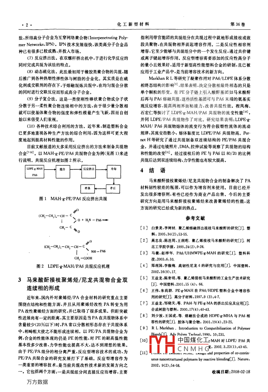 第36卷第9期化工新型材料VoL 36 No 9208年9月NEW CHEMICAL MATERIALS綜迷與專論馬來酸酐接枝聚烯烴/尼龍共混合金的研究進(jìn)展侯茂奇揣成智田世雄(天津科技大學(xué)材料科學(xué)與化學(xué)工程學(xué)院,天津300457)擠要概述了馬來酸酐接枝聚烯烴同尼龍共混合金的制備方法及目前最新的研究進(jìn)展關(guān)鍵詞馬來酸酐接枝聚烯烴,尼龍,共混合金Development of polyolefin grafting anhydride maleic acid /nylon blending alloyHou Maoqi Chuai Chengzhi Tian Shixiong(School of Material Science Chemical Engineering, Tianjin University of Science TechnologyTianjin 300457)Abstract The preparation and development of polyolefin grafting anhydride maleic acid/nylon blending alloy weretroducedKey words polyolefin-g-MAH, nylon, blending alloy目前,聚合物合金產(chǎn)業(yè)化已成為高分子材料工業(yè)的新產(chǎn)應(yīng)。研究人員最近通過球磨碾磨技術(shù)制備MAPP,考察了反業(yè)。馬來酸酐(MAH)可以接枝的聚合物很多,主要有應(yīng)時(shí)間、碾磨速率、循環(huán)碾磨方式、過氧化物的種類和濃度及EPR EPDM、PE、PP、ABS、SEBS,其中聚烯烴是馬來酸酐接馬來酸酐的濃度等因素。結(jié)果顯示,該MAPP主要含末端接枝改性中最常用的聚合物接枝方法有溶液法、熔融法、氣相枝型和橋式接枝型。與傳統(tǒng)的熔融混合方法相比,通過球磨法固相法輻照接枝等多種方法。尼龍(聚酰胺,PA)材料是碾磨方法得到的MAPP降解減緩相對(duì)分子質(zhì)量提高。這種在各個(gè)行業(yè)廣為使用的一種聚合物,其綜合性能較為優(yōu)良但新方法還具有較低的加工溫度及不溶解、能效高費(fèi)用低的優(yōu)韌性較差。隨著高分子材料高強(qiáng)超韌化的趨勢以及實(shí)際應(yīng)勢,因此,非常容易得到精制的產(chǎn)品用,對(duì)其韌性提出越來越高的要求,PA材料的低溫峽口沖擊2馬來酸酐接枝聚烯烴/尼龍共混物合金的強(qiáng)度迫切需要加以提高。國際上對(duì)于這個(gè)問題的研究一般是釆用彈性體增韌,可以更好的提高材料的韌性,但是解決好共制備混物組分之間的相容性問題十分關(guān)鍵。選用最多的增容劑是聚合物合金的制備技術(shù)發(fā)展迅速,主要的生產(chǎn)方法有以經(jīng)馬來酸酐接枝的聚合物,這種接枝反應(yīng)可以和共混過程下幾種:同時(shí)進(jìn)行也可以單獨(dú)進(jìn)行,相關(guān)的研究報(bào)道很多,廣泛地應(yīng)用(1)普通機(jī)械共混法。又稱物理混合法,其中包括粉料共于高分子共混物的增容上。同時(shí),現(xiàn)在的研究已不僅僅局限混溶液共混乳液共混、熔體共混。于用馬來酸酐接枝物改善PA的性能,國內(nèi)外也有文獻(xiàn)報(bào)道用(2)接枝共聚法。是聚合物單體b在聚合物A的主鏈上少量的PA來提高聚烯烴性能方面的研究。本文也將在這方發(fā)生聚合反應(yīng)的過程該法所制高分子合金仍是一個(gè)宏觀的面加以論述。物理共混聚合物體系。1馬來酸酐接枝聚烯烴的反應(yīng)方法(3)嵌段共聚法。該法嵌段共聚物的結(jié)構(gòu)必須科學(xué)設(shè)計(jì)和嚴(yán)格控制,才能獲得所期望的卓越性能其合成工藝比較特殊在PE接枝馬來酸酐的反應(yīng)中,常選用過氧化二異丙苯(4)多層乳液共聚法。該法可以非常有效的生成極微細(xì)DCP)或者過氧化苯甲酰(BPO)作為引發(fā)劑。BPO引發(fā)溫度的聚合物乳化粒子。較低,但是其價(jià)格昂貴;DCP價(jià)格低廉,考慮到經(jīng)濟(jì)因素一般(5)反應(yīng)增容共混法。當(dāng)兩種聚合物熱力學(xué)相容性不良選擇DCP作為引發(fā)劑。將它們進(jìn)行物理寸由于共混產(chǎn)物形態(tài)的不均勻,其性馬來酸酐接枝改性聚烯烴主要采用熔融接枝和溶液接枝能中國煤化工進(jìn)兩聚合物組分之間的兩種方法,此外國外也有文獻(xiàn)報(bào)道馬來酸酐接枝PP的新方相容CNMHG法。該方法借助于球磨碾磨馬來酸酐,在PP上進(jìn)行接枝反這秤刀是平代以后開發(fā)的一種特殊方基金項(xiàng)目:天津市自然基金資助項(xiàng)目(04361281)作者簡介侯茂奇男,主要研究方向:聚合物加工化工新型材料第36卷法,所得高分子合金為互穿網(wǎng)絡(luò)聚合物( Interpenetrating Poly指利用帶官能團(tuán)的共混組分在共混過程中就地形成接枝或嵌ner Networks,PN).PN技術(shù)發(fā)展很快該類高分子合金品段共聚物在共混物相界面起增容作用。二是反應(yīng)性相容劑種已有很多已較成熟,并投入市場增容,它至少能夠與共混組分中的一個(gè)發(fā)生反應(yīng),通過共價(jià)鍵(7)反應(yīng)擠出法。在雙螺桿擠出機(jī)中,于進(jìn)行化學(xué)反應(yīng)的或離子鍵起增容作用。反應(yīng)型增容需要添加的反應(yīng)性高分子同時(shí)完成共混為該法的特點(diǎn)的量小且效果好,適用于新型高性能塑料合金的研制,且已被(8)動(dòng)態(tài)硫化法。此法最初用于橡膠類聚合物的共混,隨應(yīng)用于工業(yè)產(chǎn)品中是當(dāng)前增容技術(shù)的新方向后推廣到各種熱塑性彈性體與樹脂的合金化。其實(shí)質(zhì)是在硫Markham r l等研究了凝聚作用對(duì)PA6/LDPE體系分散化劑或交聯(lián)劑的存在下,于熔融混煉共混中,在均勻混合分散相終態(tài)結(jié)構(gòu)的影響,結(jié)果表明,決定分散相最終相態(tài)的只是的同時(shí)進(jìn)行交聯(lián)反應(yīng)而形成高分子合金單個(gè)顆粒的形變。在PE分子鏈上引人酸酐基團(tuán