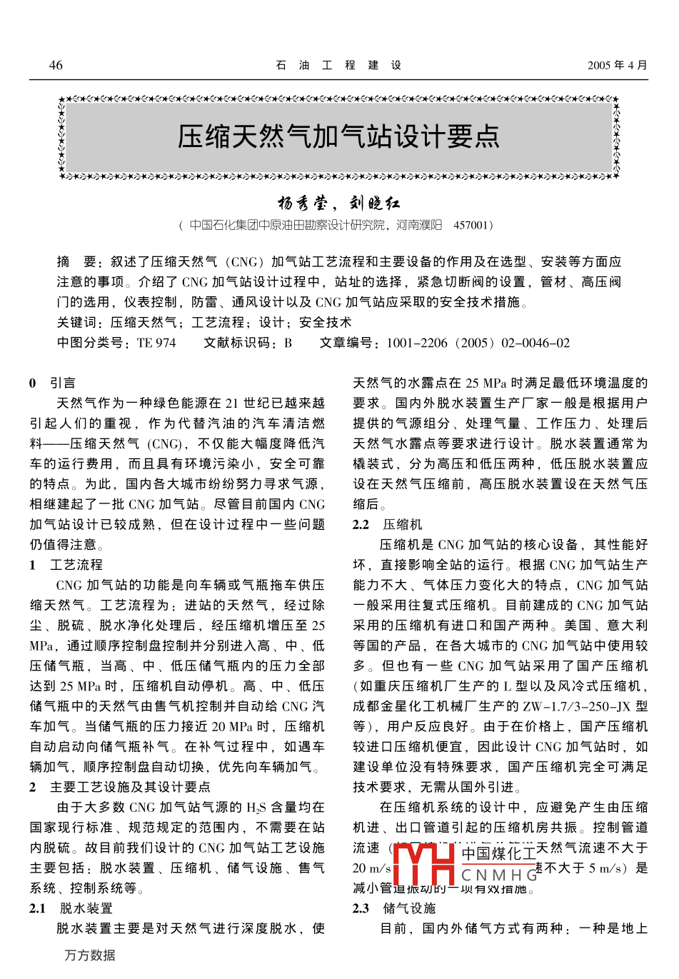 石油工程建設2005年4月壓縮天然氣加氣站設計要點刁憶憶憶憶公長長長長長長公長公長長長長k長小長長長k長長長乙長長小知刁長長長長長長楊秀瑩,劉曉紅(中國石化集團中原油田勘察設計硏究院,河南濮陽457001摘要:敘述了壓縮天然氣(CNG)加氣站工藝流程和主要設備的作用及在選型、安裝等方面應注意的事項。介紹了CNG加氣站設計過程中,站址的選擇,緊急切斷閥的設置,管材、高壓閥門的選用,儀表控制,防雷、通風設計以及CNG加氣站應采取的安全技術措施關鍵詞:壓縮天然氣;工藝流程;設計;安全技術中圖分類號:TE974文獻標識碼:B文章編號:1001-206(2005)02-0046-020引言天然氣的水露點在25MPa時滿足最低環(huán)境溫度的天然氣作為一種綠色能源在21世紀已越來越要求。國內外脫水裝置生產廠家一般是根據用戶引起人們的重視,作為代替汽油的汽車清潔燃提供的氣源組分、處理氣量、工作壓力、處理后料——壓縮天然氣(CNG),不僅能大幅度降低汽天然氣水露點等要求進行設計。脫水裝置通常為車的運行費用,而且具有環(huán)境污染小,安全可靠橇裝式,分為高壓和低壓兩種,低壓脫水裝置應的特點。為此,國內各大城市紛紛努力尋求氣源,設在天然氣壓縮前,高壓脫水裝置設在天然氣壓相繼建起了一批CNG加氣站。盡管目前國內CNG縮后。加氣站設計已較成熟,但在設計過程中一些問題2.2壓縮機仍值得注意。壓縮機是CNG加氣站的核心設備,其性能好1工藝流程壞,直接影響全站的運行。根據CNG加氣站生產CNG加氣站的功能是向車輛或氣瓶拖車供壓能力不大、氣體壓力變化大的特點,CNG加氣站縮天然氣。工藝流程為:進站的天然氣,經過除般采用往復式壓縮機。目前建成的CNG加氣站塵、脫硫、脫水凈化處理后,經壓縮機增壓至25采用的壓縮機有進口和國產兩種。美國、意大利MPa,通過順序控制盤控制并分別進入高、中、低等國的產品,在各大城市的CNG加氣站中使用較壓儲氣瓶,當高、中、低壓儲氣瓶內的壓力全部多。但也有一些CNG加氣站采用了國產壓縮機達到25MPa時,壓縮機自動停機。高、中、低壓(如重慶壓縮機廠生產的L型以及風冷式壓縮機,儲氣瓶中的天然氣由售氣機控制并自動給CNG汽成都金星化工機械廠生產的ZW-1.7/3-250-JX型車加氣。當儲氣瓶的壓力接近20MPa時,壓縮機等),用戶反應良好。由于在價格上,國產壓縮機自動啟動向儲氣瓶補氣。在補氣過程中,如遇車較進口壓縮機便宜,因此設計CNG加氣站時,如輛加氣,順序控制盤自動切換,優(yōu)先向車輛加氣。建設單位沒有特殊要求,國產壓縮機完全可滿足2主要工藝設施及其設計要點技術要求,無需從國外引進由于大多數CNG加氣站氣源的H2S含量均在在壓縮機系統的設計中,應避免產生由壓縮國家現行標準、規(guī)范規(guī)定的范圍內,不需要在站機進、岀口管道引起的壓縮杋房共振。控制管道內脫硫。故目前我們設計的CNG加氣站工藝設施流速中國煤化工天然氣流速不大于主要包括:脫水裝置、壓縮機、儲氣設施、售氣20m/sCNMHG不大于5m/s)是系統、控制系統等。減小管追振動的一壩伺效增池。21脫水裝置23儲氣設施脫水裝置主要是對天然氣進行深度脫水,使目前,國內外儲氣方式有兩種:一種是地上第31卷第楊秀瑩等:壓縮天然氣加氣站設計要點儲氣瓶儲氣,另一種是地下儲氣井儲氣。兩種儲由于壓縮后的天然氣管道具有壓力高、管徑氣方式各有利弊,應根據不同地區(qū)和具體工程小的特點,管道焊接比較困難,并且每道焊縫均綜合比較,選擇一種較好的儲氣方式。兩種儲氣須射線探傷,因此設計中,高壓管道的連接應采方式的特點如下用卡套式連接方式。(1)地上儲氣瓶儲氣。其特點是易制造,投3安全技術措施資少,維修方便。目前CNG加氣站大多采用這種(1)CNG加氣站站址選擇應符合當地的城鎮(zhèn)儲氣方式。但是在設計時要做好安全防范工作,規(guī)劃、環(huán)境保護和防火安全的要求。應處理好方儲氣瓶間應通風好、防火防爆,特別是要做好夏便加氣和不影響交通的關系。季儲氣瓶的降溫工作。在具體工程設計中應優(yōu)先(2)應在遠離作業(yè)區(qū)的天然氣進站管道上設選用大容積的儲氣瓶,因為,大容積儲氣瓶具有計緊急手動截斷閥,當發(fā)生火災或其他事故時占地面積小(總儲氣量相等時),瓶閥少,管道接值班人員可立即切斷氣源,防止事故的進一步擴少,安全性能高,施工安裝簡單,檢修方便,大壓力容器年檢簡單等優(yōu)點。缺點是工程投資較高。(3)增壓前天然氣管道應選用20鋼或具有同(2)地下儲氣井儲氣。地下儲氣井是利用鉆等性能以上的無縫鋼管,增壓后的天然氣管道應井套管制作的深80~200m的地下儲氣裝置,在采用不銹鋼管(Crl8Ni9)。閥門及附件的設計壓四川、上海等地采用較多。其特點是占地面積少,力應比最大工作壓力高10%,并且不應低于安全地上管道連接簡單,但是施工制作較困難,投資閥的定壓。大,并且儲氣井的鋼材及其外防腐問題尚未解決4)在壓縮天然氣的儲存區(qū)、壓縮區(qū)、加氣旦漏氣,不易維修,且高壓氣易串入地層區(qū)應設置可燃氣體檢測器,及時檢測到泄漏的可24售氣系統燃氣體。報警器應設計在控制室等經常有人值班售氣機按加氣槍的數量分為單槍和雙搶兩種。的場所,一旦發(fā)生報警,值班人員可以立即采取在設計中,對于儲氣設施只有一組或兩組的加氣控制措施。站應選擇一線進氣或二