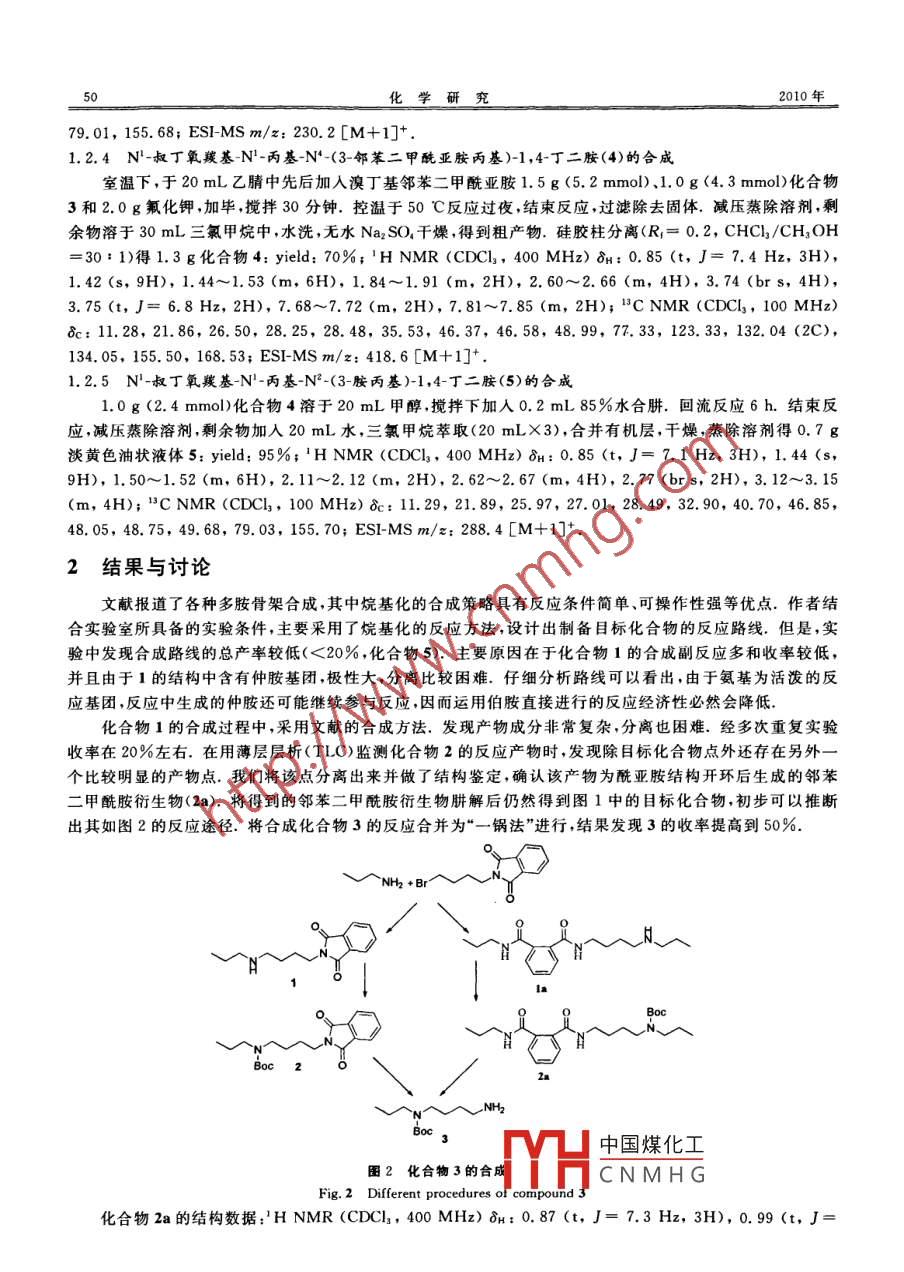 第21卷第4期化學(xué)研究中國科技核心期刊2010年7月CHEMICAL RESEARCHhxy@henu.edu.cnGabriel合成胺反應(yīng)的工藝改進王建紅,李騫,何麗華,甘瑩,王超杰,趙瑾河南大學(xué)河南省天然藥物與免疫工程重點實驗室,河南開封475004)摘要:采用經(jīng)典的 Gabriel反應(yīng)合成了直鏈型多胺骨架,并用H/CNMR,MS等方法確證了中間體以及目標(biāo)化合物的結(jié)構(gòu).研究表明,在實驗條件下, Gabriel反應(yīng)經(jīng)歷了新的反應(yīng)歷程;經(jīng)過工藝改進,建立了一條效率較高的工藝路線關(guān)鍵詞: Gabriel反應(yīng);多胺;合成;工藝改進中圖分類號:O621.3文獻標(biāo)識碼:A文章編號:1008-1011(2010)04-0048-04Modification of Process for Synthesizing polyaminevia gabriel reactionWANG Jian-hong, LI Qian, HE Li-hua, GAn Ying, WANG Chao-jie, ZHAo JiKey Laboratory of Natural Medicines and Immunoengineering, Henan University, Kai feng 475004, Henan, ChinAbstract: Classical Gabriel reaction was adopted to synthesize linear polyamine skeleton. Thestructure of intermidates and target compound were confirmed by means of nuclear magneticresonance spectroscopy(H/C NMR)and mass spectrometry (MS). Results indicate thatunder the present test conditions, a new reaction pathway is involved in the Gabriel reactionBy modifying the synthetic process, an efficient route to synthesizing polyamine was estab-lishedKeywords: Gabriel reaction; polyamine; synthesis; process modification多胺( polyamine)與細(xì)胞的分化和生長密切相關(guān),多胺片段常見于具有顯著生理活性的化合物結(jié)構(gòu)中1-2).直鏈型多胺骨架的合成有多種方法,文獻報道構(gòu)建直鏈型多胺骨架的方法主要有烷基化反應(yīng)、亞胺還原和邁克爾加成等3.由于氨/胺基化學(xué)反應(yīng)活性高,構(gòu)建鏈狀骨架的關(guān)鍵問題涉及對伯胺、仲胺的保護及脫保護策略,這無疑將增加合成的難度,也使得其合成方案多樣化Gabriel反應(yīng)是一種經(jīng)典的合成胺鏈的方法,也是合成鏈狀多胺骨架最常用的方案,具有反應(yīng)條件簡單、效率高等優(yōu)點適合用于不同鏈長的多胺骨架合成. Jays合成天然多胺化合物蜘蛛毒素時采用的路線運用Troc和Boc作為伯胺及仲胺保護基,重復(fù)使用 Gabriel反應(yīng)得到了線型多胺骨架.Sab采用Bz和Mts作為胺基保護基構(gòu)建多胺骨架.該路線用芐基保護的二胺為起始原料經(jīng) Gabriel合成胺反應(yīng)以較高的產(chǎn)率得到鏈狀骨架.其中的中間體繼續(xù)與烷基取代二胺原料反應(yīng)還可以制備出不對稱取代多胺類似物,是一條簡單而又高效的合成方法. Gardner51合成多胺骨架的方法則結(jié)合了烷基化和邁克爾加成方案這條路線也可以制備不同鏈長的多胺骨架.此外,文獻報道的路線還有 Mitsunobu反應(yīng)和固相合成等方法,對于合成收稿日期:2010-04-06.作者簡介:國家自然科學(xué)基金資助項目(20872027,90913001);河南省科技中國煤化工);河南大學(xué)省部共建資助項目(SBGJ905I8)CNMHG作者簡介:王建紅(1971-),男,講師,從事有機化學(xué)及藥物化學(xué)研究,E-mail:hay@henu.edu.cn‘通訊聯(lián)系人王建紅等: Gabriel合成胺反應(yīng)的工藝改進各種特殊結(jié)構(gòu)的多胺鏈具有各自的適用性1實驗部分為了合成不同結(jié)構(gòu)的多胺骨架,作者在文獻方法的基礎(chǔ)上),采用經(jīng)典的 Gabriel反應(yīng)制備多胺,選取Boc作為氨基保護基團設(shè)計以下路線合成目標(biāo)化合物(圖1)NH?+BBoc 2Reagents and conditions: (a)K, COa, CH, CN,r t. (b)Boc?O, CHCl,/CH3 OH, r t :(c)Hz NNH2H20.CaHsOH, reflux, 3 h:(d) N-bromoalkylphthalimide, K2 CO3, CH, CN,(e)H2 NNHzH2O, C,HsOH, reflux圖1目標(biāo)化合物的合成路線Fig. 1 The synthetic route of target compound1.1主要儀器WFH-204B型手提式紫外燈(上海精科實業(yè)有限公司);EM-360L型核磁共振儀; Esquire3000型LCS質(zhì)譜儀1.2合成N丙基-胺丁基鄰苯二甲酰亞胺(1)的合成室溫下,于20mL乙腈中先后加入溴丁基鄰苯二甲酰亞胺1.6g(5.6mmol)、正丙胺0.7mL(8.4mmol)和3.0g氟化鉀,攪拌30min.控溫于40℃反應(yīng)4h,結(jié)束反應(yīng),過濾除去固體.減壓蒸除溶劑,剩余物溶于30mL三氯甲烷中,水洗,無水Na2SO干燥,得到粗產(chǎn)物,硅膠柱分離(R;=0.2cHCl3CH3OH=20:1)得0.5g化合物1: yield:36%;HNMR(CDCl3,400MHz)bH:0.79(t,J=7.4Hz,3H),1.37~1.50(m,4H),1.57~1.65(m,2H),2,47(t,J=7,4Hz,2H),2.56(t,J=7.3Hz,2H),3.59(t,J=7.1Hz,2H),7.58~7.61(m,2H),7.69~7.73(m,2H);ESI-MS m/z:261.2[M+1]+1.2.2N-叔丁氧羰基-N-丙基-胺丁基鄰苯二甲酰亞胺(2)的合成室溫下,3.0g(12.2mmol)化合物1溶于20 mL TEA/CH3OH(10%)混合溶劑中,攪拌下,滴加N叔丁氧羰基甲酸酐(5.3g,24.4mmol)的甲醇溶液(10mL).滴畢,反應(yīng)過夜.減壓蒸除溶劑,剩余物溶于30mL三氯甲烷中,水洗,無水Na2SO4干燥.硅膠柱分離(R1=0.35,CHCl2/CH3OH=60:1)得3.7g無色油狀液體2: yield:85%;HNMR(CDCl3,400MHz)bn:0.85(t,J=7.4Hz,3H),1.42(s,9H)1.45~1.59(m,4H),1.62~1.69(m,2H),3.10(t,J=7.1Hz,2H),3.19(t,J=6.7Hz,2H),3.70(t,J=6.9Hz,2H),7.70~7.72(m,2H),7.83~7.85(m,2H);1CNMR(CDCl,400MHz)be:11.24,21.67,23.29,25.99,28.34,28.45,37.68,46.47,48.79,79.08,123.19,132.13,133.90155.52,168.39; ESI-MS m/z:361.2[M+1]+1.2.3N-叔丁氧羰基N-丙基-1,4-丁二胺(3)的合成2.0g(5.6mmol)化合物2溶于30mL甲醇,攪拌下加入0.5mL85%水合肼.回流反應(yīng)6h.結(jié)束反應(yīng),減壓蒸除溶劑,剩余物加入20mL水,三氯甲烷萃取(20mL×3),合并有機層,干燥,蒸除溶劑得1.3g淡黃色油狀液體3: yield:100%;HNMR(CDCl3,400MHz)bH:0.87(t,J=7.3Hz,3H),1.45(s9H),1.49~1.53(m,4H),1.65~1.70(m,2H),2.71(中國煤化工;(brs,4H);lCNMR(CDCl3,400MHz)bc:11.28,21.45
