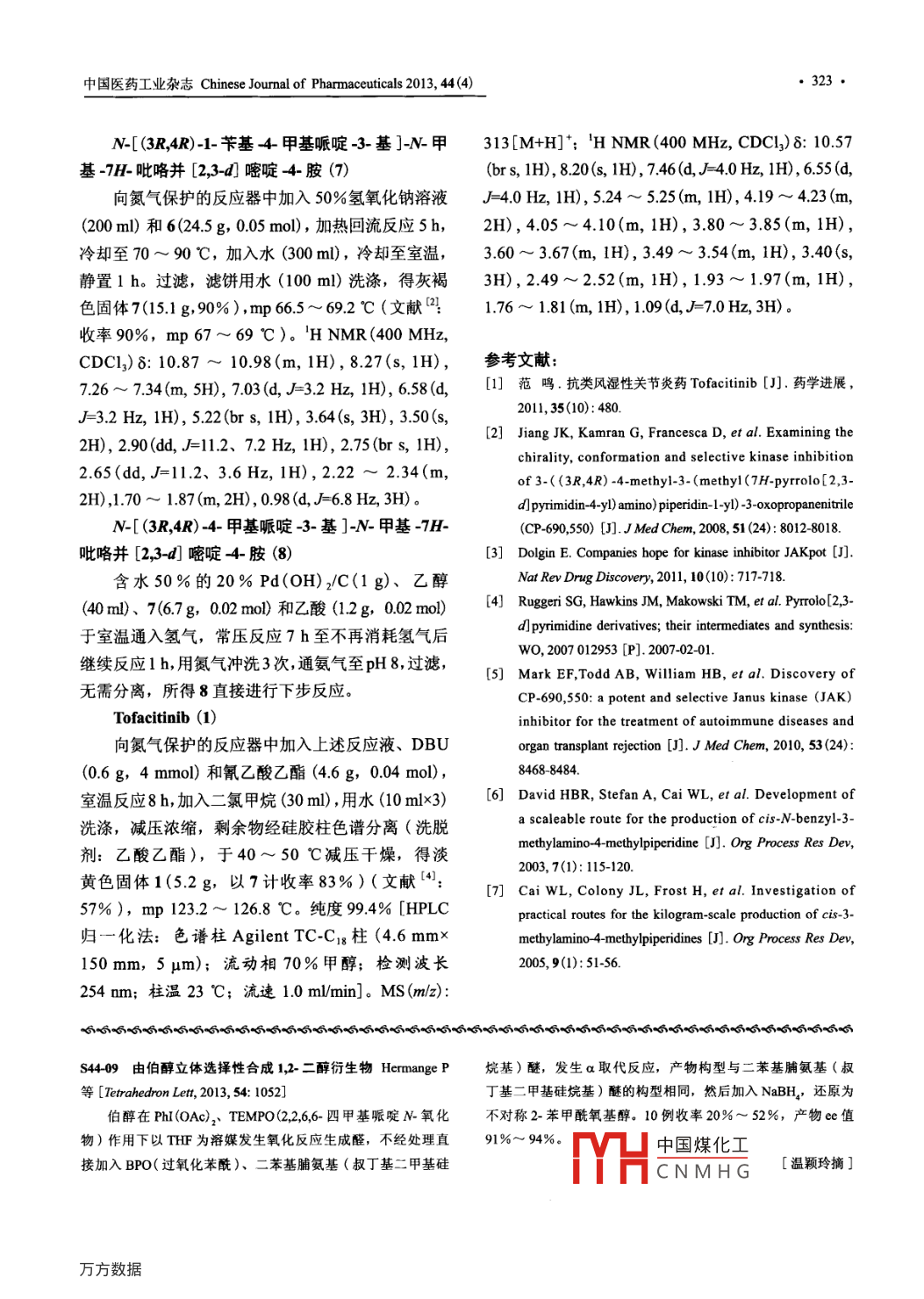 中國醫(yī)藥工業(yè)雜志Chinese Journal of Pharmaceuticals 2013, 44(4)●321●6化學(xué)藥物與合成技術(shù)Tofacitinib的合成張仲奎,匡春香*(同濟(jì)大學(xué)化學(xué)系,上海200092)摘要: 4- 氣-7H-吡咯并[2,3-dJ] 嘧啶(2) 經(jīng)保護(hù)、取代、脫保護(hù)得到N-[(3R,4R)-1-芐基4甲基哌啶.3-基]-N-甲基-7H-吡咯并[2,3-d]嘧啶-4-胺(7),7脫芐基后無需分離,直接與氰乙酸乙酯縮合得到抗類風(fēng)濕性關(guān)節(jié)炎藥tofacitib,總收率約57% (以2計(jì)),純度99.4%。關(guān)鍵詞: tfacitinib; JAK 抑制劑;抗類風(fēng)濕性關(guān)節(jié)炎藥:合成中圖分類號: R971*.1文獻(xiàn)標(biāo)志碼: A文章編號: 100 8255 (2013)04-0321-03Synthesis of TofacitinibZHANG Zhongkui, KUANG Chunxiang*(Dept. ofChemistry, Tongji University. Shanghai 20092)ABSTRACT: Tofacitinib, an anti-rheumatoid arthritis drug, was synthesized from N-[ (3R,4R)-1-benzyl-4-methylpiperidin-3-yl]-N-methy1-7H- pyrrolo[2,3-d]pyrimidin-4 amine(7) by removing the benzyl group and condensingwith ethyl cyanoacetate in one-pot synthesis. The intermediate 7 could be obtained from 4-chloro-7H pyrrolo[2,3-dJpyrimidine (2) by protection, substitution and deprotection. The total yield of tofacitinib was about 57% (based oncompound 2) with purity of 99.4%.Key Words: tofacitinib; JAK inhibitor; anti-rheumatoid arthritis drug; synthesisTofacitinib(1),化學(xué)名為[ (3R,4R)-1-氰乙酰間體的合成[6.]。文獻(xiàn)[4] 用對甲苯磺酰氯(3)對4-基-4-甲基哌啶-3-基]-N-甲基-7H-吡咯并[2,3-d]-氯-7H-吡咯并[2,3-d]嘧啶(2) 進(jìn)行保護(hù)得到4-嘧啶-4-胺,是由輝瑞公司研發(fā)的抗類風(fēng)濕性關(guān)節(jié)氯-7-對甲苯磺?;量┎2,3-d] 嘧啶(4), 4炎口服JAK抑制劑012,目前已完成I1期臨床研究。與 5進(jìn)行取代反應(yīng)制得N-[(3R,4R)-1-芐基-4-1系第一代口服治療類風(fēng)濕性關(guān)節(jié)炎藥物3),同時(shí)甲基哌啶-3-基]-N-甲基-7-對甲苯磺酰基吡咯也可治療自身免疫性疾病和器官移植排斥。并[2,3-d]嘧啶-4-胺(6),6經(jīng)兩步脫保護(hù)得到1的合成路線報(bào)道較少[4.s],且多集中在1.芐N-[ (3R,4R) -4-甲基哌啶-3-基]-N-甲基-7H-吡咯基-4-甲基-3-甲胺基哌啶二鹽酸鹽(5)及類似中并[2,3-d]嘧啶-4-胺(8),8與氰乙酸乙酯反應(yīng)得到1,總收率約38%。收稿日期: 2012-12-03本研究對合成工藝進(jìn)行了如下改進(jìn)。制備4時(shí),基金項(xiàng)目:國家自然科學(xué)基金項(xiàng)目(21272174)、上海市生物醫(yī)藥重將3和2投料比由9 : 16改為2 : 1;延長低溫反.點(diǎn)項(xiàng)目(08431902700)作者簡介:張仲奎(1987-),男,碩士研究生,專業(yè)方向:有機(jī)合應(yīng)時(shí)間,收率與文獻(xiàn)[4]相當(dāng),成本降低。制備6時(shí),通信聯(lián)系人:匡春香(1964-), 男,教授,從事新藥分子設(shè)計(jì)與合將4和5的投料比由2 : 1變?yōu)?.2 : 1,收率為成、過渡金屬的催化與合成。86% (文獻(xiàn)中國煤化工文獻(xiàn)[4) 用異Tel: 021-65983191Email: kuangcx@#edu.cn丙醇-水(5:MYHCNMHG間長且條件苛322 ●中國醫(yī)藥工業(yè)雜志Chinese Joumal of Pharmaceuticals 2013, 44(4)刻,后處理較麻煩;本研究改用乙醇做溶劑,室溫8.05 (d, J=8.4 Hz, 2H), 7.47(d, J=8.4 Hz, 2H), 6.96(d,8h即可完成,過濾后直接進(jìn)行下步反應(yīng),操作簡J=4.0 Hz, 1H), 2.37(s, 3H)?;V苽?時(shí),文獻(xiàn)(4) 用三乙胺做催化劑,收率N-[ (3R,4R)-1-芐基4-甲基哌啶-3-基]-N-甲僅65%;本研究改用1,8-二氮雜=環(huán)[5.4.0] 十- -基-7-對甲苯磺?;量┎2,3-d] 嘧啶-4-胺(6)碳-7-烯(DBU),以N-[(3R,4R)-1-芐基-4-甲基將4(18.5 g, 0.06 mol)、5( 按文獻(xiàn)(61制得,哌啶-3-基]-N-甲基-7H-吡咯并[2,3-d]- 嘧啶-純度≥98.5%,14.6g, 0.05 mol)、碳酸鉀(20.7 g,4-胺(7)計(jì)收率達(dá)83%。改進(jìn)后的總收率提高至0.15 mol)和水(150 m1)加至氮?dú)獗Wo(hù)的反應(yīng)器中, .57%,1 的合成路線見圖1。加熱回流反應(yīng)10h。冷卻至45~55 C,加入乙腈實(shí)驗(yàn)部分(30 ml),保溫1 h后冷卻至室溫?cái)嚢? h,過濾,4-氯-7-對甲苯磺?;量┎2,3-d] 嘧啶(4)濾液用水(50 m1)洗滌,干燥得白色固體6(21.1 g,氮?dú)獗Wo(hù)下將丙酮(100 ml)、3(38.1g, 0.2 mol)86% ), mp 181.2~ 183.5 C (文獻(xiàn)[41:收率和2(15.4g,0.1 mol)冷卻至-5~5 C, 5 C以82%,mp 181.7~ 184.4 C)。'H NMR (400 MHz,下加入2.5 mol/L氫氧化鈉溶液(100 ml),升至CDCI,) 8: 8.36(s, lH), 8.07 (d, J=8.0 Hz, 2H), 7.44(d,室溫?cái)嚢?h。過濾,濾餅用丙酮-水(1 : 1)洗J-4.4 Hz, 2H), 7.24 ~ 7.37(m, 7H), 6.67 ~ 6.68 (m,滌,于40~ 50 C減壓干燥,得白色固體4(27.4g,1H), 5.14(brs, 1H), 3.45 ~ 3.57(m, 5H), 2.74~89% ),mp 139.4~ 146.5 C (文獻(xiàn)[4):收率2.83 (m, 2H), 2.56~ 2.58(m, 1H), 2.39(s, 3H),90%,mp 140.2~ 147.7 C)。'H NMR (400 MHz,2.31 ~ 2.33 (m, 1H), 2.13(brs, 1H), 1.65~ 1.74(m,DMSO-d}) 8: 8.83(s, 1H), 8.13(d, J=4.0 Hz, 1H),2H), 0.91 (d, J=7.2 Hz, 3H)。C1NaOHHzC-SO2C1(CH)2CO, -S~5CHyyCH3H,,CHCH3550%NaOHK2CO, H2O,回澆回流CH,H2, Pd(OH)2CHNNCAcOH, EtOH,室溫8中國煤化工圖11 的合成路線MHCNMHG中國醫(yī)藥工業(yè)雜志Chinese Journal of Pharmaceuticals 2013, 44(4)●323●N-[ (3R,4R)-1-芐基4甲基哌啶-3-基]-N-甲313[M+H]*; 'H NMR (400 MHz, CDCl,)8: 10.57基-7H-吡咯并[2,3-d] 嘧啶-4-胺(7)(brs, 1H), 8.20(s, 1H), 7.46(d,J=4.0 Hz, 1H), 6.55 (d,向氮?dú)獗Wo(hù)的反應(yīng)器中加入50%氫氧化鈉溶液J= -4.0Hz, 1H), 5.24~ 5.25 (m, 1H), 4.19 ~ 4.23 (m,(200 ml)和6(24.5 g, 0.05 mol),加熱回流反應(yīng)5 h,2H), 4.05 ~4.10(m, 1H), 3.80~ 3.85 (m, 1H) ,冷卻至70~90C,加入水(300ml),冷卻至室溫,3.60 ~ 3.67(m, 1H), 3.49 ~ 3.54(m, 1H), 3.40(s,靜置1 h。過濾,濾餅用水(100 ml)洗滌,得灰褐3H), 2.49~ 2.52(m, 1H), 1.93~ 1.97(m, 1H),色固體7(15.1 g, 90%),mp 66.5~6