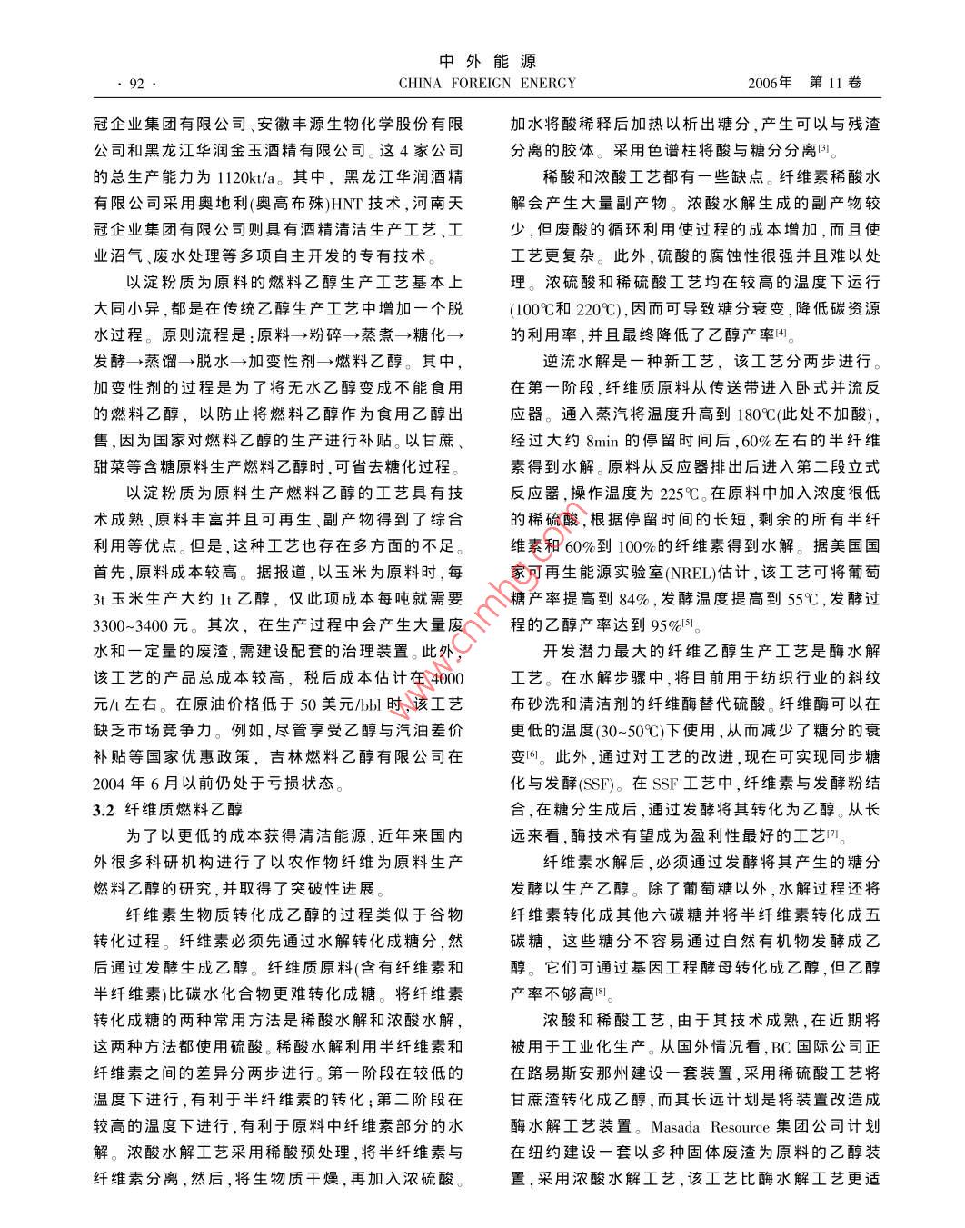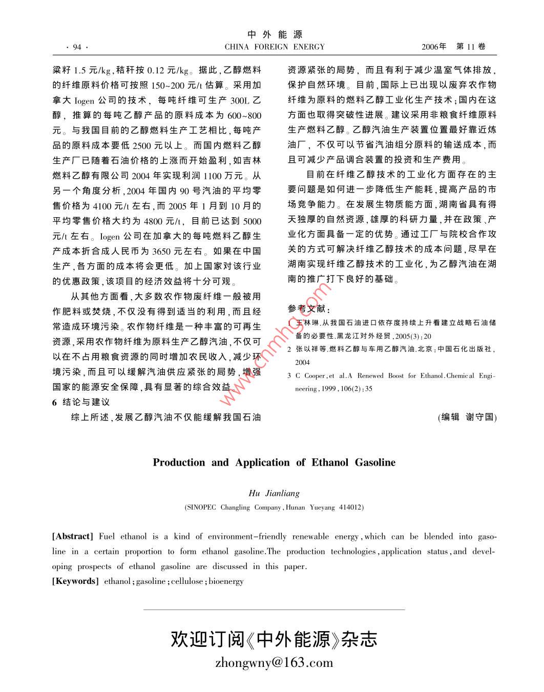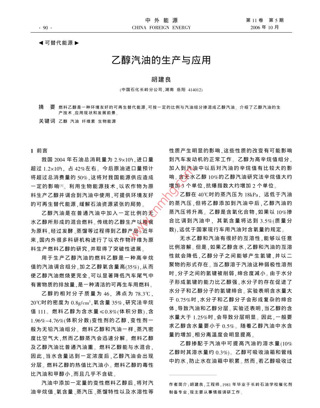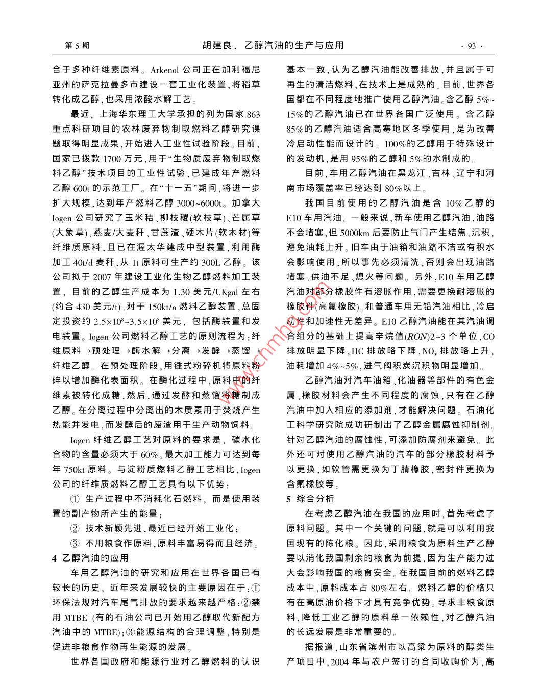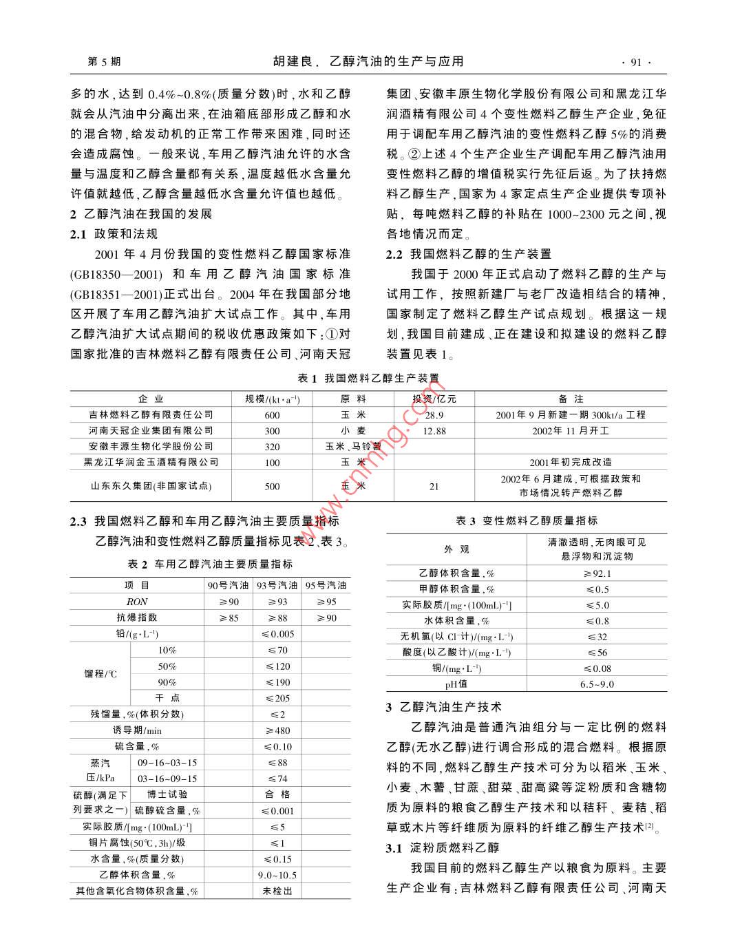 中外能源第11卷第5期90CHINA FOREIGN ENERGY2006年10月←可替代能源p乙醇汽油的生產(chǎn)與應(yīng)用胡建良(中國石化長嶺分公司,湖南岳陽414012)摘要燃料乙醇是一種環(huán)境友好的可再生替代能源,可按一定的比例與汽油組分摻混成乙醇汽油。介紹了乙醇汽油的生產(chǎn)技術(shù)、應(yīng)用現(xiàn)狀和發(fā)展前景關(guān)鍵詞乙醇汽油纖維素生物能源1前言性質(zhì)產(chǎn)生明顯的影響,這些性質(zhì)的改變有可能影響我國2004年石油總消耗量為2.9×10%,進(jìn)口量到汽車發(fā)動(dòng)機(jī)的正常工作。乙醇為高辛烷值組分超過1.2×10,占42%左右。今后原油進(jìn)口量預(yù)計(jì)加入到汽油中以后對(duì)汽油的辛烷值有比較大的影將超過總消費(fèi)量的50%,這將對(duì)我國能源供應(yīng)造成響。含無水乙醇10%的乙醇汽油研究法辛烷值大約定的影響。利用生物能源技術(shù),以農(nóng)作物為原增加3個(gè)單位,抗爆指數(shù)大約增加2個(gè)單位。料生產(chǎn)乙醇并調(diào)合到汽油中使用.可提供環(huán)境友好乙醇在40℃時(shí)的蒸汽壓為18kPa,遠(yuǎn)低于汽油的可再生替代能源,緩解石油資源緊張的局勢的蒸汽壓,但將乙醇添加到汽油中后,乙醇汽油的乙醇汽油是在普通汽油中加入一定比例的無蒸汽壓將升高。乙醇是含氧化合物,如果以10%摻水乙醇所形成的混合燃料。傳統(tǒng)的乙醇生產(chǎn)以糧食合比調(diào)到汽油中,其氧含量將達(dá)到35%(質(zhì)量分為原料,經(jīng)過發(fā)酵蒸餾等過程得到乙醇產(chǎn)品。近年數(shù),遠(yuǎn)優(yōu)于國家現(xiàn)行車用汽油對(duì)含氧量的規(guī)定來,國內(nèi)外很多科研機(jī)構(gòu)進(jìn)行了以農(nóng)作物纖維為原無水乙醇和汽油有很好的互溶性,能夠以任意料生產(chǎn)燃料乙醇的研究,并取得了突破性進(jìn)展。比例溶解。但是,如果乙醇含水,乙醇和汽油的互溶用于生產(chǎn)乙醇汽油的燃料乙醇是一種高辛烷性就會(huì)降低,乙醇分子之間能夠產(chǎn)生氫鍵,并以二值的汽油調(diào)合組分,加之乙醇氧含量高(35%,從而聚物的形式存在。當(dāng)乙醇溶于汽油這種弱極性洛劑使乙醇汽油燃燒更完全,可以顯著降低汽車尾氣中時(shí),分子之間的氫鍵被削弱,締合度減小。由于水分有害物質(zhì)的排放量,是一種清潔的可再生車用燃料子形成氫鍵的能力比乙醇強(qiáng),水分子的存在促進(jìn)了乙醇的相對(duì)分子質(zhì)量為46,沸點(diǎn)為783℃,水分子和乙醇分子的氫鍵締合。實(shí)驗(yàn)表明含水量大20℃時(shí)的密度為0.8g/cm3,氧含量35%,研究法辛烷于0.75%時(shí),水分子和乙醇分子會(huì)形成復(fù)雜的締合值11燃料乙醇為含水量≤0.8%(體積分?jǐn)?shù))、含體,導(dǎo)致汽油和乙醇分層。實(shí)驗(yàn)還表明,當(dāng)乙醇的含1.%6%~4.76%(體積分?jǐn)?shù))變性劑的乙醇,變性劑水量大于1.25%時(shí),會(huì)導(dǎo)致分層明顯。因此,一般要般為無鉛汽油組分。燃料乙醇和汽油一樣,蒸汽密求乙醇含水量要小于0.5%。隨著乙醇汽油中水含度比空氣大,然而乙醇蒸汽會(huì)迅速分解。燃料乙醇量的增加,相分離溫度會(huì)明顯提高。及乙醇汽油比普通汽油重。燃料乙醇能與水混合乙醇摻配于汽油中可提高汽油的溶水量(10%因此,當(dāng)水含量達(dá)到一定濃度后,乙醇汽油會(huì)出現(xiàn)乙醇時(shí)其溶水量約0.3%)。乙醇可吸收油箱和管線分層。燃料乙醇的熱值比汽油小。燃料乙醇的毒性中的水,防止水在油箱中積累。然而,若乙醇吸收過比汽油和甲醇小,而且?guī)缀醪缓蚱椭刑砑右欢康淖冃匀剂弦掖己?將對(duì)汽作者簡介:胡建良,工程師,1981年畢業(yè)于長嶺石油學(xué)校催化劑油辛烷值、氧含量、蒸汽壓、蒸餾特性以及水溶性等制備專業(yè),現(xiàn)主要從事情報(bào)調(diào)研工作第5期胡建良.乙醇汽油的生產(chǎn)與應(yīng)用91多的水,達(dá)到0.4%~0.8%(質(zhì)量分?jǐn)?shù))時(shí),水和乙醇集團(tuán)、安徽豐原生物化學(xué)股份有限公司和黑龍江華就會(huì)從汽油中分離出來,在油箱底部形成乙醇和水潤酒精有限公司4個(gè)變性燃料乙醇生產(chǎn)企業(yè),免征的混合物,給發(fā)動(dòng)機(jī)的正常工作帶來困難,同時(shí)還用于調(diào)配車用乙醇汽油的變性燃料乙醇5%的消費(fèi)會(huì)造成腐蝕。一般來說,車用乙醇汽油允許的水含稅。②上述4個(gè)生產(chǎn)企業(yè)生產(chǎn)調(diào)配車用乙醇汽油用量與溫度和乙醇含量都有關(guān)系,溫度越低水含量允變性燃料乙醇的増值稅實(shí)行先征后返。為了扶持燃許值就越低,乙醇含量越低水含量允許值也越低。料乙醇生產(chǎn),國家為4家定點(diǎn)生產(chǎn)企業(yè)提供專項(xiàng)補(bǔ)2乙醇汽油在我國的發(fā)展貼,每噸燃料乙醇的補(bǔ)貼在1000~2300元之間,視2,1政策和法規(guī)各地情況而定200Ⅰ年4月份我國的變性燃料乙醇國家標(biāo)準(zhǔn)2.2我國燃料乙醇的生產(chǎn)裝置(GB18350-2001)和車用乙醇汽油國家標(biāo)準(zhǔn)我國于2000年正式啟動(dòng)了燃料乙醇的生產(chǎn)與(GB18351-2001)正式出臺(tái)。2004年在我國部分地試用工作,按照新建廠與老廠改造相結(jié)合的精神區(qū)開展了車用乙醇汽油擴(kuò)大試點(diǎn)工作。其中,車用國家制定了燃料乙醇生產(chǎn)試點(diǎn)規(guī)劃。根據(jù)這一規(guī)乙醇汽油擴(kuò)大試點(diǎn)期間的稅收優(yōu)