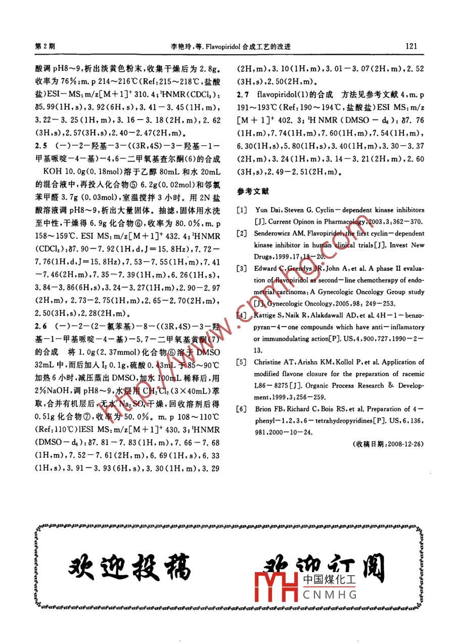 2009年第25卷第2期VoL25No.22009JOURNAL OF BAOTOU MEDICAL COLLEGE119Flavopiridol合成工藝的改進李艷玲12方浩2徐文方2(1.包頭醫(yī)學(xué)院藥學(xué)系,內(nèi)蒙古包頭014060;2.山東大學(xué)藥學(xué)院)摘要目的:改進 Flavopiridol的合成工藝。方法:以1-甲基-4-(24,6-三甲氧基)-1,2,3,6-四氫吡啶為原料,利用Dlon反應(yīng)制得環(huán)氧而后經(jīng)AH1還原制得 Flavopiridol的關(guān)鍵中間體3-哌啶醇,后經(jīng)拆分、?;?、選擇性脫甲基、羥醛縮合、查爾酮氧化關(guān)環(huán)、脫甲基制得 Flavopiridol,結(jié)果:目標化合物經(jīng)H-NMR、質(zhì)譜確證;總收率為11.8%比文獻報道的收率提高4.8%。結(jié)論:改進后的方法不僅條件溫和、反應(yīng)的立體選擇性大為提高,而且操作簡關(guān)鍵詞 Dalton反應(yīng);AlH2還原;查爾酮路線mprovement in Synthetic Technology of FlavopiridolLI Yanling FANG Hao, XU Wenfan(1. Department of Pharmacy, Baotou Medical College, Baotou 014000, China;2. School of Pharmacy, Shandong University)Abstract Objective To improve the synthetic technology of flavopiridol. Methods: Dalton reaction was employedproduce the synthesis of expoxide from 1-methyl-4-(2, 4, 6-trimethoxyphenyl)-1, 2, 3,6-tetrahydropyridine, thenkey intermediate of flavopiridol-piperidol was got by means of AlH, reduction of expoxide finally, flavopiridol was pre-ared via acylation, selective demethylation, adol consendation, chalcone closure, demethylation. Results: The structure oftarget compound was confirmed by 'H-NMR. ms and the overall yield was 11. 8%. Compared with that reported in theliterature,the overall yield was increased by 4.8%. Conclusion: This synthetic process is suitable for the preparation ofmultigram quantities by its convenient operation, mild reaction conditions and higher stereoselectivity. This method habeen reported at home.Key words Dalton reaction; AlH, reduction: Chalcone route細胞周期蛋白依賴激酶(CDKs)是一類依賴 cylin酮用硼氫化鈉還原上述酮后得到順式醇和反式醇的的絲/蘇氨酸蛋白激酶在細胞周期的調(diào)控中起重要作混合物,用重結(jié)晶法分離出順式醇中間體④,拆分后經(jīng)用由于其功能失調(diào)和腫瘤發(fā)生之間的密切關(guān)系已使過量BF3-OEt催化、醋酐?;瑫r脫去乙?;徫黄湟种苿┑难芯砍蔀槟壳翱鼓[瘤藥物研究與開發(fā)的熱甲氧基的甲基得到中間體酚⑤,以該酚為原料,專利都點之一, Flavopiridol是第一個進入臨床試驗的采用B-二酮法制得甲氧黃酮其中B一二酮法又包括CDK抑制劑,化學(xué)結(jié)構(gòu)為黃酮最初來源于一種印度Aan- Robinson縮合以及 Baker- Venkataraman重植物 rohitukin,目前已可人工合成口2,研究表明排(,甲氧黃酮用鹽酸吡啶法脫去甲基后制得FaFlavopiridol對包括肺癌乳腺癌等的多種腫瘤細胞系 vopiridol本文作者以②為原料,在查閱相關(guān)文獻的均具有抗腫瘤活性而且可以抑制異種嫁接模型中胂基礎(chǔ)上0),將中間體④的合成作了改進方法如下:首瘤的生長先采用 Dalton反應(yīng)制得環(huán)氧③,而后利用氫化鋁還原1合成路線環(huán)氧③后接著用鋅粉一甲醇脫溴即制得中間體④,與有關(guān) Flavopiridol I的合成,僅在幾篇專利文獻中前面所述專利文獻的方法相比改進后的工藝不僅使有報道,主要步驟以圖1為例說明:將②經(jīng)硼氫化反應(yīng)產(chǎn)中國煤化工體選擇性直接得氧化反應(yīng)制得反式醇該醇經(jīng) swern氧化得到相應(yīng)的到順CNMH Gern氧化要求超低溫條件),操作簡單。與此同時,我們嘗試用查爾酮路基金項目:國家科技部863課題(2007AA02Z314)線完成了 Flavopiridol的關(guān)環(huán)反應(yīng)。 Flavopiridol合成120包頭醫(yī)學(xué)院學(xué)報第25卷路線見圖1。(1H,m),2.81-2.84(1H,m),2.49-2.54(1H,m),2.37-2.40(1H,m),2.28-2.31(3H,s),1,96-2.012.3(-)-(3R,4S)-1-甲基-4-(2,4,6-三甲氧基苯基)哌啶-3一醇(4)的合成在20℃,將3g四氫鋁鋰(0.080mol)加入50mL四氫呋喃中,于25℃將此混懸液攪拌4小時后靜置20小時,在0士1℃攪拌下,加2.7g無水氯化鋁,之后將溫度升高到20℃,將混合物攪拌15分鐘即得還原劑AH3。將上述AH3THF混懸液冷卻到0±1℃,并于此溫度加10g③(0.028mol)和60 mL THF,混合物攪拌2小時后緩慢加入100mL5%NaOH繼續(xù)攪拌1小時后溫度升高到圖1 Flavopiridol改進合成路線20℃,將所得到的膠胨狀物過濾濾液在減壓蒸餾下濃(a)(i) DMSo, H: O, CF3 COOH:(ii) NBS, Naz SOs縮至原體積一半,將150mL甲醇加入上述溶液中,在30% NaOH,(b)(i)AlH,, THF,(ii)50%KOH.攪拌此混合液的同時加入35mL50%KOH,而后加CH,OH, Zn(c)(i) BF3- OEt, Ace O, CHz Clz入10g鋅粉,混合物回流16小時后冷卻到20℃,抽濾(ii5%KOH, CH, OH:(d)10% KOH, Cr Hs Oh并用10mL無水甲醇洗滌濾液和洗滌液合并后減壓(e)l/DMSO/ H, SO i(D) pyridinium HCl濃縮,加入100mL去離子水并冷卻到0℃,攪拌1小2實驗部分熔點用RY-1熔點儀測定(溫度未經(jīng)校正)。核時抽濾,用10mL去離子水洗滌,干燥得6.08g化合物磁共振譜用 Bruker advance400,AP140型質(zhì)譜儀④,收率為76.0%,m,p122-123c(Ref:124125℃)。HNMR(CDCl3):86.16(2H,s),3.80核磁共振儀測定。所用試劑均為分析純。3.84(9H,s),3.35-3.39(1H,m),2.96-3.012.11一甲基-4-(2,4,6-三甲氧基)-1,2,3,6(2H,m),2.87-2.90(1H,m),2.31-2.34(3H,s),四氫吡啶(2)的合成方法見參考文獻[4],m.p1182.12-2.15(2H,m),2.01-2.07(2H,m)。~120℃(文獻為118~122℃),改用石油醚:乙酸乙酯將消旋的3一羥基哌啶醇9g(0.032mol)溶于(10:1)重結(jié)晶比文獻單純用石油醚效果好。HNMR30mL甲醇,加人用20mL甲醇溶解的(+)-二苯甲(CDC.):6.13(2H,s),5.55(1H,m),3.81(3H,),酰酒石酸12.6g(0.034mol),混合液加熱至沸騰