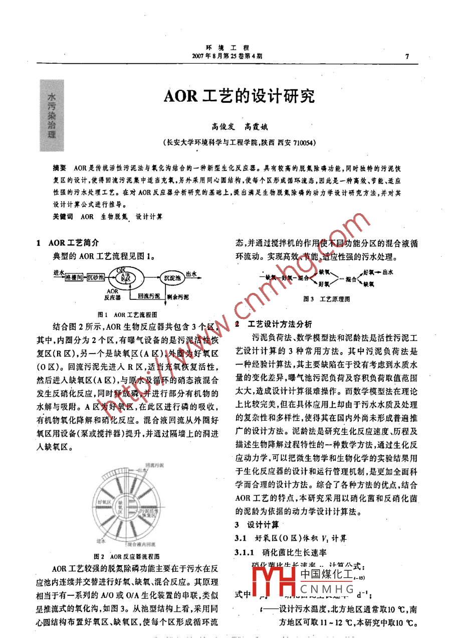 環(huán)境工程2007年8月第25卷第4期水污染治理一AOR工藝的設(shè)計(jì)研究高俊發(fā)高霞娥(長安大學(xué)環(huán)境科學(xué)與工程學(xué)院陜西西安70054)摘要AOR是傳統(tǒng)活性污泥法與氧化溝結(jié)合的一種新型生化反應(yīng)器。具有較高的脫氮除確功能,同時(shí)獨(dú)特的污泥恢復(fù)區(qū)的設(shè)計(jì),使得回流污泥集中適當(dāng)充氧,另外采用同心圓結(jié)構(gòu),使每個(gè)區(qū)形成環(huán)流態(tài),因此是一種高效、節(jié)能、適應(yīng)性撮的污水處理工藝。在對(duì)AOB瓦應(yīng)器分析研究的基礎(chǔ)上,提出滿足生物脫氮除的動(dòng)力學(xué)設(shè)計(jì)研究方法,并對(duì)其設(shè)計(jì)計(jì)算公式進(jìn)行推導(dǎo)。關(guān)鍵詞AOR生物脫氮設(shè)計(jì)計(jì)算1AOR工藝簡介態(tài),并通過攪拌機(jī)的作用使不同功能分區(qū)的混合液循典型的AOR工藝流程見圖1。環(huán)流動(dòng)。實(shí)現(xiàn)高效、節(jié)能、適應(yīng)性強(qiáng)的污水處理播間沉矽泡(餵“>-臺(tái)好氧一出水缺氧一好氧一混合反應(yīng)器L回流污泥剩余污泥圖3工藝原理圖圖1AOR工藝流程圖結(jié)合圖2所示,AOR生物反應(yīng)器共包含3個(gè)區(qū),2工藝設(shè)計(jì)方法分析其中,內(nèi)圈分為2個(gè)區(qū),有曝氣設(shè)備的是污泥活性恢污泥負(fù)荷法、數(shù)學(xué)模型法和泥齡法是活性污泥工復(fù)區(qū)(R區(qū)),另一個(gè)是缺氧區(qū)(A區(qū)),外圈為好氧區(qū)藝設(shè)計(jì)計(jì)算的3種常用方法。其中污泥負(fù)荷法是(0區(qū))?;亓魑勰嘞冗M(jìn)入R區(qū),適當(dāng)充氧恢復(fù)活性種經(jīng)驗(yàn)計(jì)算法,其主要缺陷在于沒有考慮到水質(zhì)水然后進(jìn)入缺氧區(qū)(A區(qū))與原水及循環(huán)的硝態(tài)液混合量的變化差異,曝氣池污泥負(fù)荷及容積負(fù)荷取值范圍發(fā)生反硝化反應(yīng)同時(shí)釋放磷并進(jìn)行部分有機(jī)物的太大造成設(shè)計(jì)計(jì)算很難操作。而數(shù)學(xué)模型法在理論水解與吸附。A區(qū)為好氧區(qū),在此區(qū)進(jìn)行磷的吸收,上比較完美但在具體應(yīng)用上卻由于污水水質(zhì)及處理有機(jī)物氧化降解和硝化反應(yīng)。混合液回流從外圈好的復(fù)雜性和多樣性使得其在國內(nèi)外尚未形成普遍推氧區(qū)用設(shè)備(泵或攪拌器)提升,并通過隔墻上的洞進(jìn)廣的設(shè)計(jì)方法。泥齡法是研究生化反應(yīng)速度歷程及入缺氧區(qū)。描述生物降解過程特性的一種數(shù)學(xué)方法,通過生化反應(yīng)動(dòng)力學(xué),可以把微生物學(xué)和生物化學(xué)的實(shí)驗(yàn)結(jié)果用回流污泥于生化反應(yīng)器的設(shè)計(jì)和運(yùn)行管理機(jī)制,是更加全面科學(xué)而合理的設(shè)計(jì)方法。綜合了各種方法的優(yōu)點(diǎn),結(jié)合AOR工藝的特點(diǎn),本研究采用以硝化菌和反硝化菌的泥齡為依據(jù)的動(dòng)力學(xué)設(shè)計(jì)計(jì)算法。3設(shè)計(jì)計(jì)算合液內(nèi)回流31好氧區(qū)(O區(qū))體積V計(jì)算圖2AOR反應(yīng)器流程圖3.11硝化菌比生長速率AOR工藝較強(qiáng)的脫氮除磷功能主要在于污水在反式應(yīng)池內(nèi)連續(xù)并交替進(jìn)行好氧、缺氧、混合反應(yīng)。其原理中國煤化工s相當(dāng)于有一系列的MO或OA生化裝置的串聯(lián),類似式中CNMHG呈推流式的氧化溝,如圖3。從池型結(jié)構(gòu)上看,采用同設(shè)計(jì)污水溫度,北方地區(qū)通常取10℃,南心圓結(jié)構(gòu)布置好氧區(qū)缺氡區(qū),使每個(gè)區(qū)形成循環(huán)流方地區(qū)可取11~12℃,本研究中取10℃環(huán)境工程2007年8月第25卷第4期312硝化菌泥齡θ——溫度系數(shù),隨具體條件而定,其數(shù)值在硝化菌泥齡0計(jì)算公式:1.06-1.15之間,可取θ=1.09。322出水硝酸鹽濃度計(jì)算F本工藝出水硝酸鹽濃度根據(jù)氮的物料平衡可以式中日—硝化菌設(shè)計(jì)泥齡d;得到一安全系數(shù),取值為15-25,一般設(shè)計(jì)進(jìn)水總氮量=反硝化氮量+微生物同化作用消中取為23;耗氮量+出水氮量1/}?!趸来芷赿即:QT=(r+R)QS∞2+0.05Q(S0-8)+QSm313污泥產(chǎn)率系數(shù)整理得:污泥產(chǎn)率系數(shù)Y計(jì)算公式TN-0.05(S。-S)6x+4)0.072x0.66Fr+R+rY=KxO式中Sm2出水硝酸鹽濃度其中:Fr=1.072TN——進(jìn)水總氮濃度mg/L;式中y——產(chǎn)率系數(shù)mg/mg;R—污泥回流比,一般為50%~100%;N——懸浮固體濃度mg/Lr—內(nèi)回流比,工程上通常采用200%~40%。F—溫度修正系數(shù);323反硝化過程所需要的水力停留時(shí)間S—硝化進(jìn)水中BOD3濃度mg/L反硝化過程所需要的水力停留時(shí)間HRT2計(jì)算一設(shè)計(jì)水溫,與前面的計(jì)算取相同數(shù)值;公式:K——系數(shù),一般取K=0.8~0.9。314硝化過程所需要的水力停留時(shí)間HRT2=硝化過程所需要的水力停留時(shí)間Hrn計(jì)算公式:式中HRT—反硝化過程所需要的水力停留時(shí)0.Y(S。-S)HRT間d;S—為缺氧區(qū)進(jìn)水中NO3-N濃度mg/L;式中HRT—硝化過程所需要的水力停留時(shí)間d;X,—好氧區(qū)內(nèi)污泥的濃度mgL,一般反缺氧區(qū)出水中NO3N濃度rgrL;X—反硝化池中污泥濃度mg/L應(yīng)器內(nèi)的污泥濃度為3000~32.4缺氧區(qū)體積500mg/L,本研究取3000mg/L;S.好氧區(qū)出水中BOD3濃度mgL缺氧區(qū)體積V2計(jì)算公式:31.5好氧區(qū)體積V2=HRT2·Q好氧區(qū)體積V1