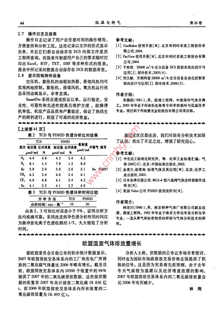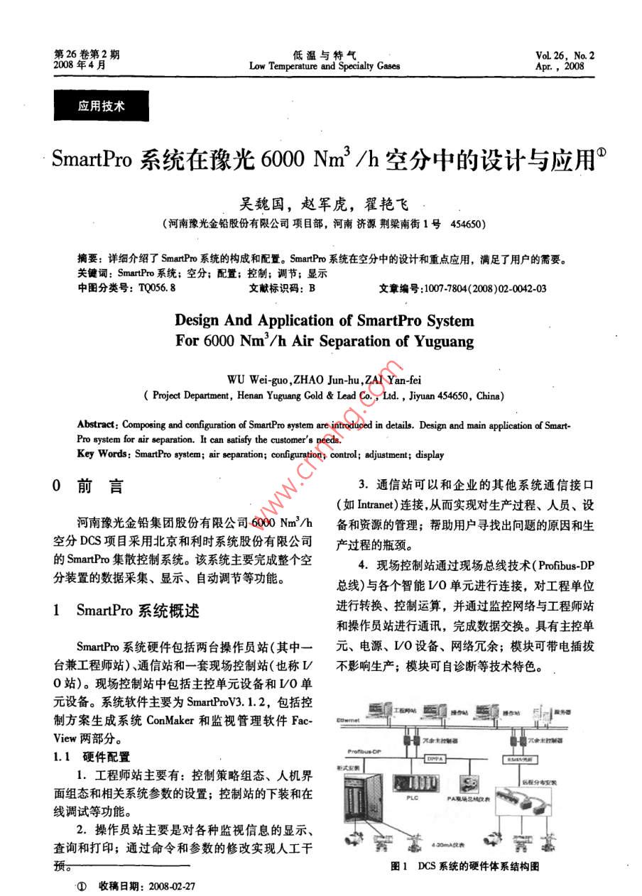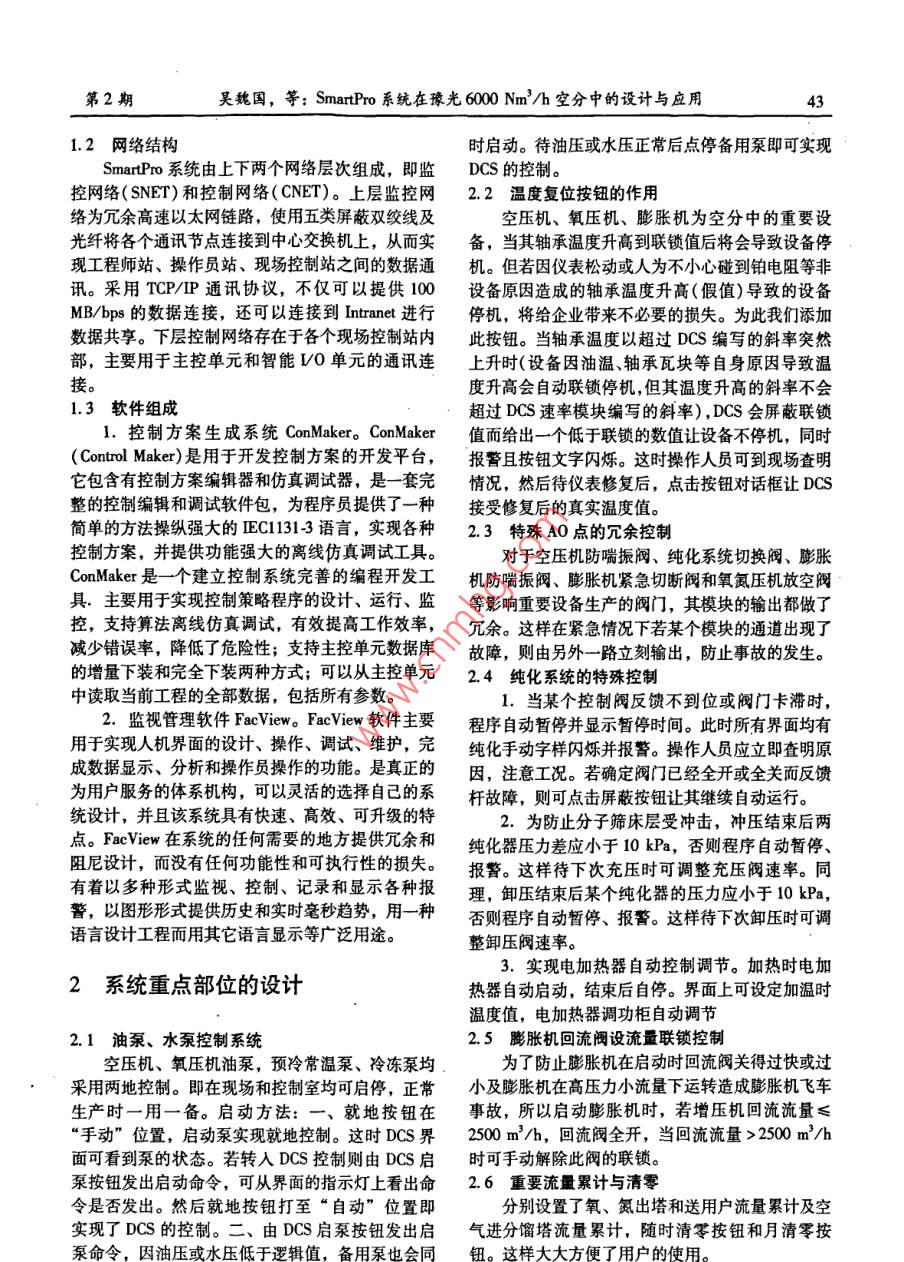 第26卷第2期低溫與特氣VoL 26. No. 22008年4月Low Temperature and Specialty GasesAp應(yīng)用技術(shù)Smart pro系統(tǒng)在豫光6000Nm3/h空分中的設(shè)計與應(yīng)用°吳魏國,趙軍虎,翟艷飛(河南豫光金鉛股份有限公司項目部,河南濟(jì)源荊梁南街1號454650)摘要:詳細(xì)介紹了 SmartPro系統(tǒng)的構(gòu)成和配置。 SmartPro系統(tǒng)在空分中的設(shè)計和重點應(yīng)用,滿足了用戶的需要。關(guān)鍵詞: Smart Pro系統(tǒng);空分;配置;控制;調(diào)節(jié);顯示中圖分類號:TQ06.8文獻(xiàn)標(biāo)識碼:B文章編號:10077804(2008)02-0042-03Design And Application of SmartPro SystemFor 6000 Nm/h Air Separation of YuguangWU Wei-guo, ZHAO Jun-hu, ZAI Yan-feiProject Department, Henan Yuguang Gold Lead Co, Ltd, Jiyuan 454650, China)Abstract: Composing and configuration of SmartPro system are introduced in details. Design and main application of Smart-Pro system for air separation. It can satisfy the customers needs.Key Words: SmartPro system; air separation; configuration; control; adjustment; display0前言3.通信站可以和企業(yè)的其他系統(tǒng)通信接口(如 intranet)連接,從而實現(xiàn)對生產(chǎn)過程、人員、設(shè)河南豫光金鉛集團(tuán)股份有限公司600Nm/h備和資源的管理;幫助用戶尋找出問題的原因和生空分DCS項目采用北京和利時系統(tǒng)股份有限公司產(chǎn)過程的瓶頸。的 Smartpro集散控制系統(tǒng)。該系統(tǒng)主要完成整個空4.現(xiàn)場控制站通過現(xiàn)場總線技術(shù)( Profibus-DP分裝置的數(shù)據(jù)采集、顯示、自動調(diào)節(jié)等功能??偩€)與各個智能LO單元進(jìn)行連接,對工程單位1 Smart Pro系統(tǒng)概述進(jìn)行轉(zhuǎn)換、控制運算,并通過監(jiān)控網(wǎng)絡(luò)與工程師站和操作員站進(jìn)行通訊,完成數(shù)據(jù)交換。具有主控單SmartPro系統(tǒng)硬件包括兩臺操作員站(其中一元、電源、LO設(shè)備、網(wǎng)絡(luò)冗余;模塊可帶電插拔臺兼工程師站)、通信站和一套現(xiàn)場控制站(也稱L不影響生產(chǎn);模塊可自診斷等技術(shù)特色。0站)?,F(xiàn)場控制站中包括主控單元設(shè)備和O單元設(shè)備。系統(tǒng)軟件主要為 SmartProv3.1.2,包括控制方案生成系統(tǒng) Con Maker和監(jiān)視管理軟件Fac-cmview兩部分。1.1硬件配置工程師站主要有:控制策略組態(tài)、人機(jī)界程分布裝面組態(tài)和相關(guān)系統(tǒng)參數(shù)的設(shè)置;控制站的下裝和在線調(diào)試等功能。2.操作員站主要是對各種監(jiān)視信息的顯示、查詢和打印;通過命令和參數(shù)的修改實現(xiàn)人工干預(yù)圖1DCS系統(tǒng)的硬件體系結(jié)構(gòu)①收稿日期:20080227第2期吳魏國,等: SmartPro系統(tǒng)在豫光6000Nm3/h空分中的設(shè)計與應(yīng)用1.2網(wǎng)絡(luò)結(jié)構(gòu)時啟動。待油壓或水壓正常后點停備用泵即可實現(xiàn)SmartPro系統(tǒng)由上下兩個網(wǎng)絡(luò)層次組成,即監(jiān)DCS的控制??鼐W(wǎng)絡(luò)(SNET)和控制網(wǎng)絡(luò)(CNET)。上層監(jiān)控網(wǎng)2.2溫度復(fù)位按鈕的作用絡(luò)為冗余高速以太網(wǎng)鏈路,使用五類屏蔽雙絞線及空壓機(jī)、氧壓機(jī)、膨脹機(jī)為空分中的重要設(shè)光纖將各個通訊節(jié)點連接到中心交換機(jī)上,從而實備,當(dāng)其軸承溫度升高到聯(lián)鎖值后將會導(dǎo)致設(shè)備停現(xiàn)工程師站、操作員站、現(xiàn)場控制站之間的數(shù)據(jù)通機(jī)。但若因儀表松動或人為不小心碰到鉑電阻等非訊。采用TP/P通訊協(xié)議,不僅可以提供100設(shè)備原因造成的軸承溫度升高(假值)導(dǎo)致的設(shè)備MB/bps的數(shù)據(jù)連接,還可以連接到 Intranet進(jìn)行停機(jī),將給企業(yè)帶來不必要的損失。為此我們添加數(shù)據(jù)共享。下層控制網(wǎng)絡(luò)存在于各個現(xiàn)場控制站內(nèi)此按鈕。當(dāng)軸承溫度以超過DCS編寫的斜率突然部,主要用于主控單元和智能O單元的通訊連上升時(設(shè)備因油溫軸承瓦塊等自身原因?qū)е聹亟佣壬邥詣勇?lián)鎖停機(jī),但其溫度升高的斜率不會1.3軟件組成超過DCS速率模塊編寫的斜率),DCS會屏蔽聯(lián)鎖1.控制方案生成系統(tǒng) ConMaker, Con Maker值而給出一個低于聯(lián)鎖的數(shù)值讓設(shè)備不停機(jī),同時( Control Maker)是用于開發(fā)控制方案的開發(fā)平臺,報警且按鈕文字閃爍。這時操作人員可到現(xiàn)場查明它包含有控制方案編輯器和仿真調(diào)試器,是一套完情況,然后待儀表修復(fù)后,點擊按鈕對話框讓DCS整的控制編輯和調(diào)試軟件包,為程序員提供了一種接受修復(fù)后的真實溫度值。簡單的方法操縱強大的C1313語言,實現(xiàn)各種2.3特殊AO點的冗余控制控制方案,并提供功能強大的離線仿真調(diào)試工具。對于空壓機(jī)防喘振閥、純化系統(tǒng)切換閥、膨脹Con Maker是一個建立控制系統(tǒng)完善的編程開發(fā)工機(jī)防喘振閥、膨脹機(jī)緊急切斷閥和氧氮壓機(jī)放空閥具.主要用于實現(xiàn)控制策略程序的設(shè)計、運行、監(jiān)等影響重要設(shè)備生產(chǎn)的閥門,其模塊的輸出都做了控,支持算法離線仿真調(diào)試,有效提高工作效率,冗余。這樣在緊急情況下若某個模塊的通道出現(xiàn)了減少錯誤率,降低了危險性;支持主控單元數(shù)據(jù)庫故障,則由另外一路立刻輸出,防止事故的發(fā)生。的增量下裝和完全下裝兩種方式;可以從