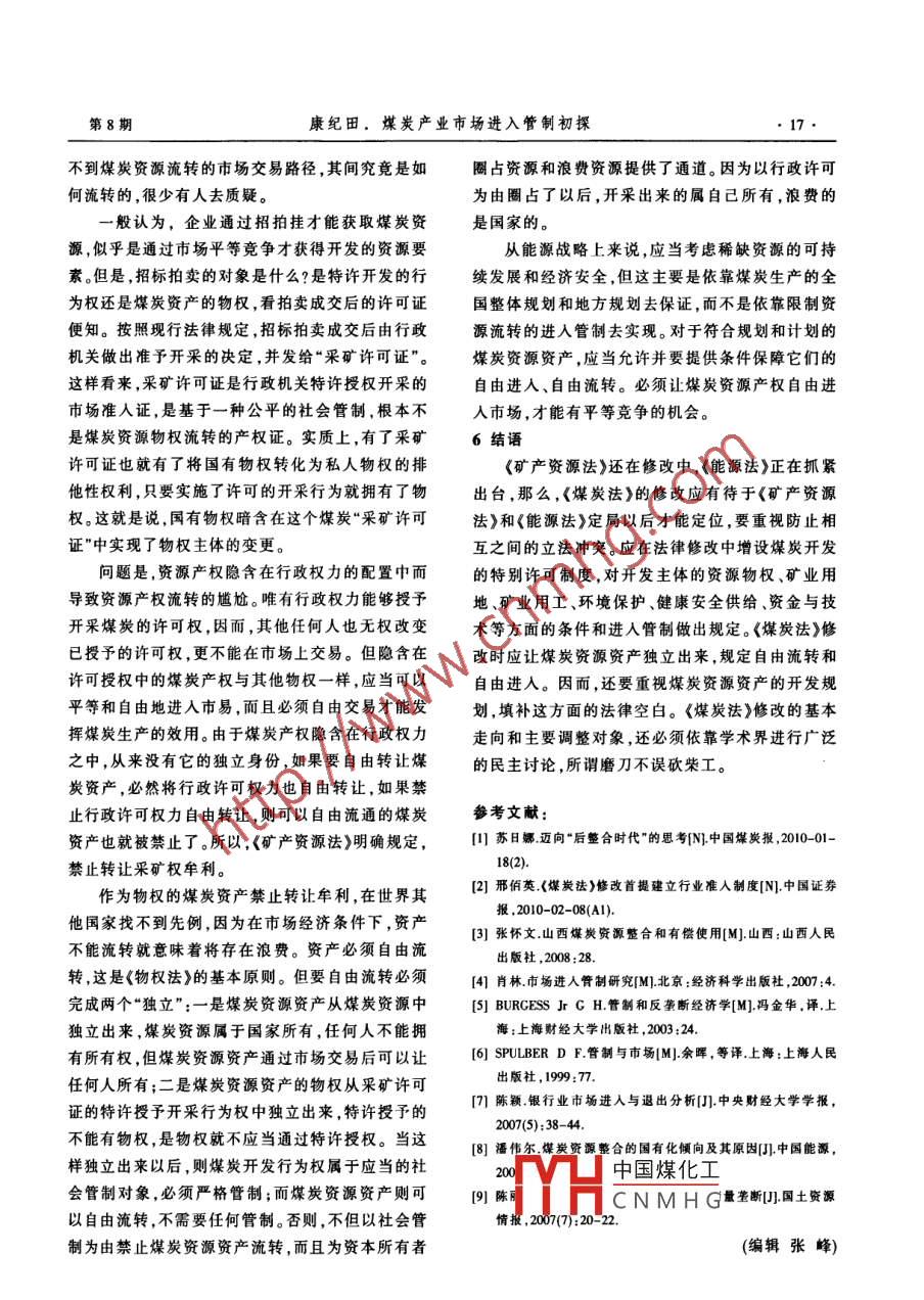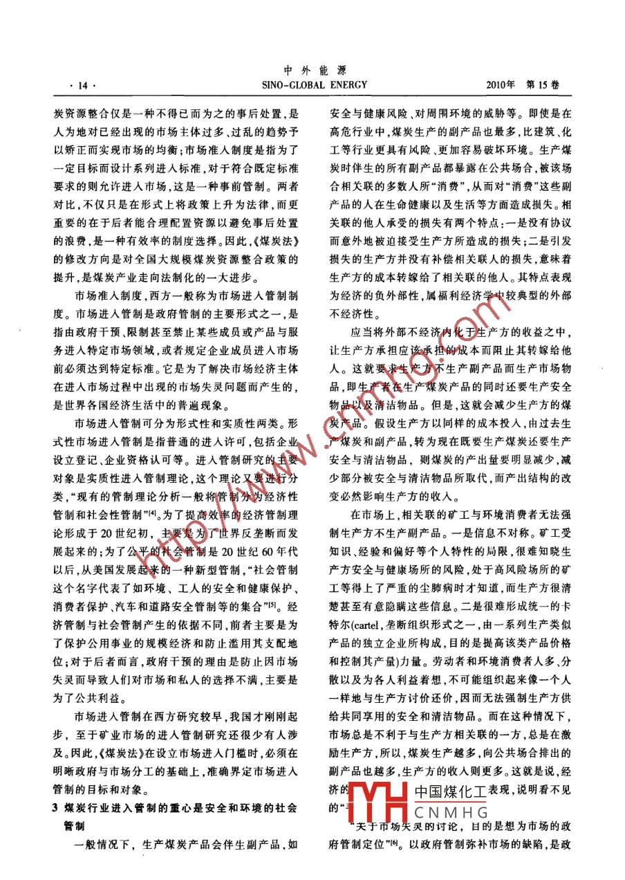中外能源第8期SINO-GLOBAL ENERGY●13●煤炭產(chǎn)業(yè)市場進(jìn)入管制初探康紀(jì)田(湖南婁底行政學(xué)院,湖南婁底417000.摘要自2005年以來,在全國開展了大規(guī)模的煤炭資源整合。與此同時.<煤炭法)進(jìn)入修改程序,修改的基本月的足將煤炭資源整合的成果用法律形式固定下來。2009年底,正在修改中的《煤炭法>首次提到建立行業(yè)準(zhǔn)人制度。煤炭資源整合僅是一種事后處置,應(yīng)當(dāng)由事前管制的市場準(zhǔn)入制度取代常態(tài)化的資源整合。市場進(jìn)入管制研究的主要對象是實質(zhì)性進(jìn)人管制理論,一般分為經(jīng)濟(jì)性臂制和社會性管制。<煤炭法)在設(shè)立市場進(jìn)入門檻時,必須在明晰政府與市場分T.的基礎(chǔ)上,準(zhǔn)確界定市場進(jìn)入管制的目標(biāo)和對象。煤炭行業(yè)表現(xiàn)為經(jīng)濟(jì)的負(fù)外部性,屬于市場失靈時的表現(xiàn)。煤炭行業(yè)進(jìn)入管制的重心應(yīng)是安全和環(huán)境的社會管制.是預(yù)防風(fēng)險和威脅發(fā)生的事前臂制.事中監(jiān)督與事后處置只能作為事前管制的輔助和連續(xù)狀態(tài),<煤炭法》的修改中應(yīng)設(shè)專章規(guī)定體現(xiàn)社會管制的特許權(quán)制度。煤炭行業(yè)不需要基于過度進(jìn)人的經(jīng)濟(jì)管制,其理由-是因信息缺乏而導(dǎo)致政府失靈;二是因資本優(yōu)勢而出現(xiàn)資源壟斷;三是因管制而滋生權(quán)力腐敗。對于符合規(guī)劃和計劃的煤炭資源資產(chǎn),應(yīng)當(dāng)允許其在流轉(zhuǎn)市場白由進(jìn)入。關(guān)鍵詞煤炭法資源整合市場進(jìn)入管制社會管制事前管制特許權(quán)制度自由流轉(zhuǎn)1前言整合的一個顯著效果,就在于將政府認(rèn)為多余的市我國煤炭產(chǎn)業(yè)政策在產(chǎn)業(yè)準(zhǔn)入方面對產(chǎn)業(yè)布場主體“趕出”了市場,達(dá)到政府證實為已是最優(yōu)市局、建設(shè)規(guī)模和技術(shù)標(biāo)準(zhǔn)、資源回收率、產(chǎn)業(yè)集中度場產(chǎn)業(yè)結(jié)構(gòu)為止。等做出了一些相關(guān)的規(guī)定。然而這些規(guī)定并不適應(yīng)就在煤炭資源整合政策出臺的同一年,已實施.我國目前發(fā)展方式轉(zhuǎn)型的時代要求一偏重于 以了10年的《煤炭法》進(jìn)入修改程序。修改的基本目提高市場經(jīng)濟(jì)效率為目標(biāo)而設(shè)置準(zhǔn)人制度,至于以的是將煤炭資源整合的成果用法律形式固定下來,社會公平為目的的市場準(zhǔn)人管制則顯得稀缺;由于因此當(dāng)時確定的《煤炭法》修改的基本方向與煤炭礦業(yè)制度相對遲滯(礦業(yè)也包括煤炭市場),已有的資源整合的主要目標(biāo)相吻合。到2009年底,“正在.市場準(zhǔn)人制度的操作性較差;多數(shù)制度處于政策層修改過程中的《煤炭法》首次提到建立行業(yè)準(zhǔn)人制面,沒有上升到法律的位階。因此,筆者借《煤炭法》度。預(yù)計煤炭行業(yè)具體的準(zhǔn)人標(biāo)準(zhǔn)將據(jù)此另行研究修改之際,對煤炭市場的進(jìn)入管制做些探討,以期設(shè)立。目前,我國煤炭行業(yè)尚未建立統(tǒng)一明確的行對煤炭產(chǎn)業(yè)政策調(diào)整提供參考。業(yè)準(zhǔn)人標(biāo)準(zhǔn)體系”121。2資源整合和煤炭立法催生市場進(jìn)入管制研究對于煤炭資源整合的政策,有學(xué)者曾強(qiáng)調(diào),大由于市場進(jìn)入一直是低門檻,從而造成了“多、規(guī)模的煤炭資源整合結(jié)束后,煤炭企業(yè)的資源整合小散”的煤炭開發(fā)局面,因此必須進(jìn)行煤炭資源整將進(jìn)入一種“常態(tài)啊。實際上,常態(tài)化的資源整合是合。自2005年發(fā)布《國務(wù)院關(guān)于預(yù)防煤礦生產(chǎn)安全不可取的,應(yīng)當(dāng)由市場準(zhǔn)人制度取代資源整合。煤事故的特別規(guī)定》以來,在全國開展了大規(guī)模的煤炭資源整合運動,確實取得了成效。例如山西省,到2007年6月30日,全省煤礦(井)由整合前的4389基金項中國煤化工金項目“依物杈二元"(編號:09YBB185)座減少為2730座,壓減比例達(dá)到38%;到2009年,MYHCNMHG又將礦井?dāng)?shù)減少到1053 座,將辦礦主體從2000多作者簡介:康紀(jì)田,湖南婁底行政學(xué)院法學(xué)制教授,課題負(fù)責(zé)家減少到130家,市場主體減少94%"。煤炭資源人,主要從事礦產(chǎn)資源法研究。E-mil:kjt8091@126.com中外能源●14●SINO-CLOBAL ENERGY2010年第15卷炭資源整合僅是一種不得已而為之的事后處置,是.安全與健康風(fēng)險、對周圍環(huán)境的威脅等。即使是在人為地對已經(jīng)出現(xiàn)的市場主體過多、過亂的趨勢予高危行業(yè)中,煤炭生產(chǎn)的副產(chǎn)品也最多,比建筑、化以矯正而實現(xiàn)市場的均衡;市場準(zhǔn)入制度是指為了工等行業(yè)更具有風(fēng)險、更加容易破壞環(huán)境。生產(chǎn)煤一定目標(biāo)而設(shè)計系列進(jìn)入標(biāo)準(zhǔn),對于符合既定標(biāo)準(zhǔn)炭時伴生的所有副產(chǎn)品都暴露在公共場合,被該場要求的則允許進(jìn)人市場,這是一種事前管制。兩者合相關(guān)聯(lián)的多數(shù)人所“消費”,從而對“消費”這些副對比,不僅只是在形式上將政策上升為法律,而更產(chǎn)品的人在生命健康以及生活等方面造成損失。相重要的在于后者能合理配置資源以避免事后處置關(guā