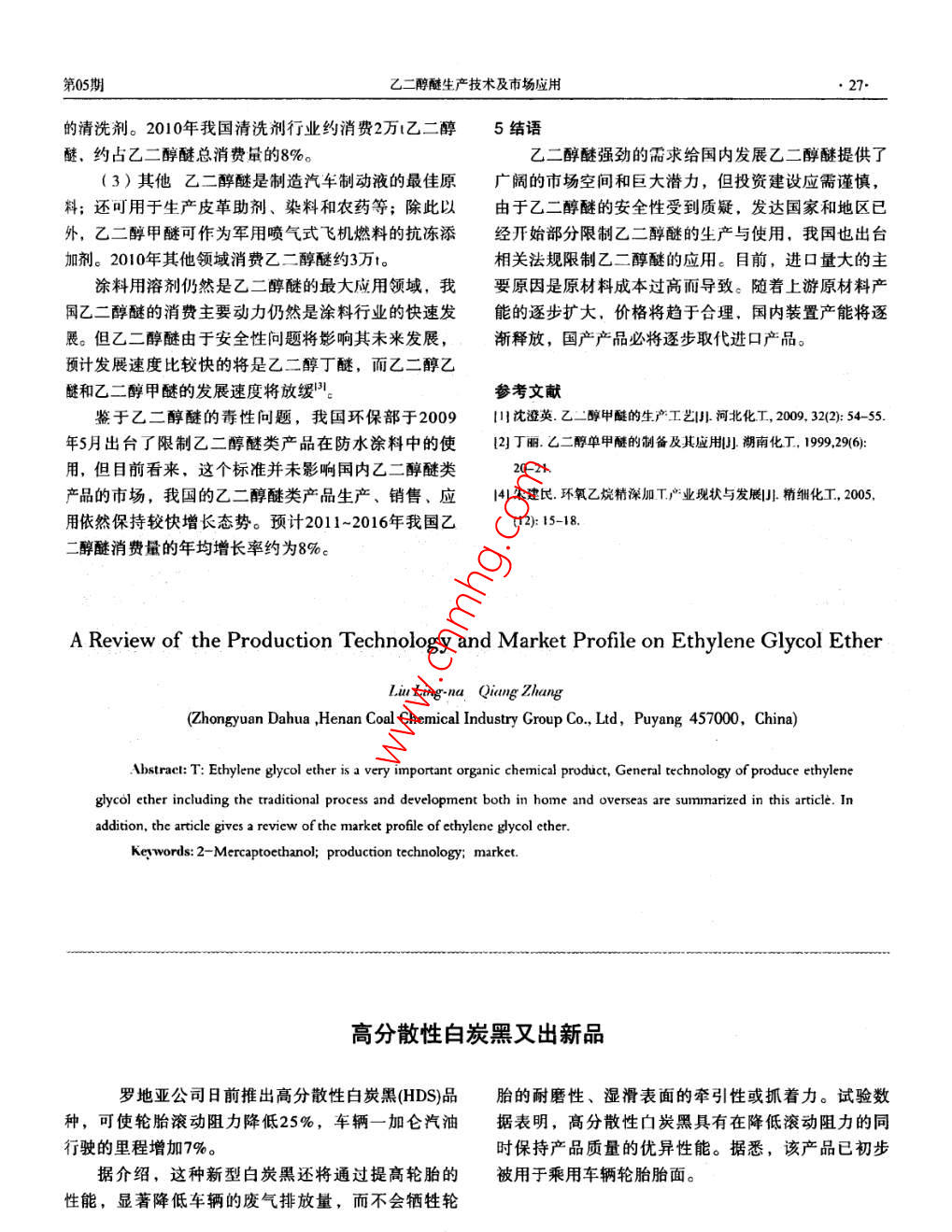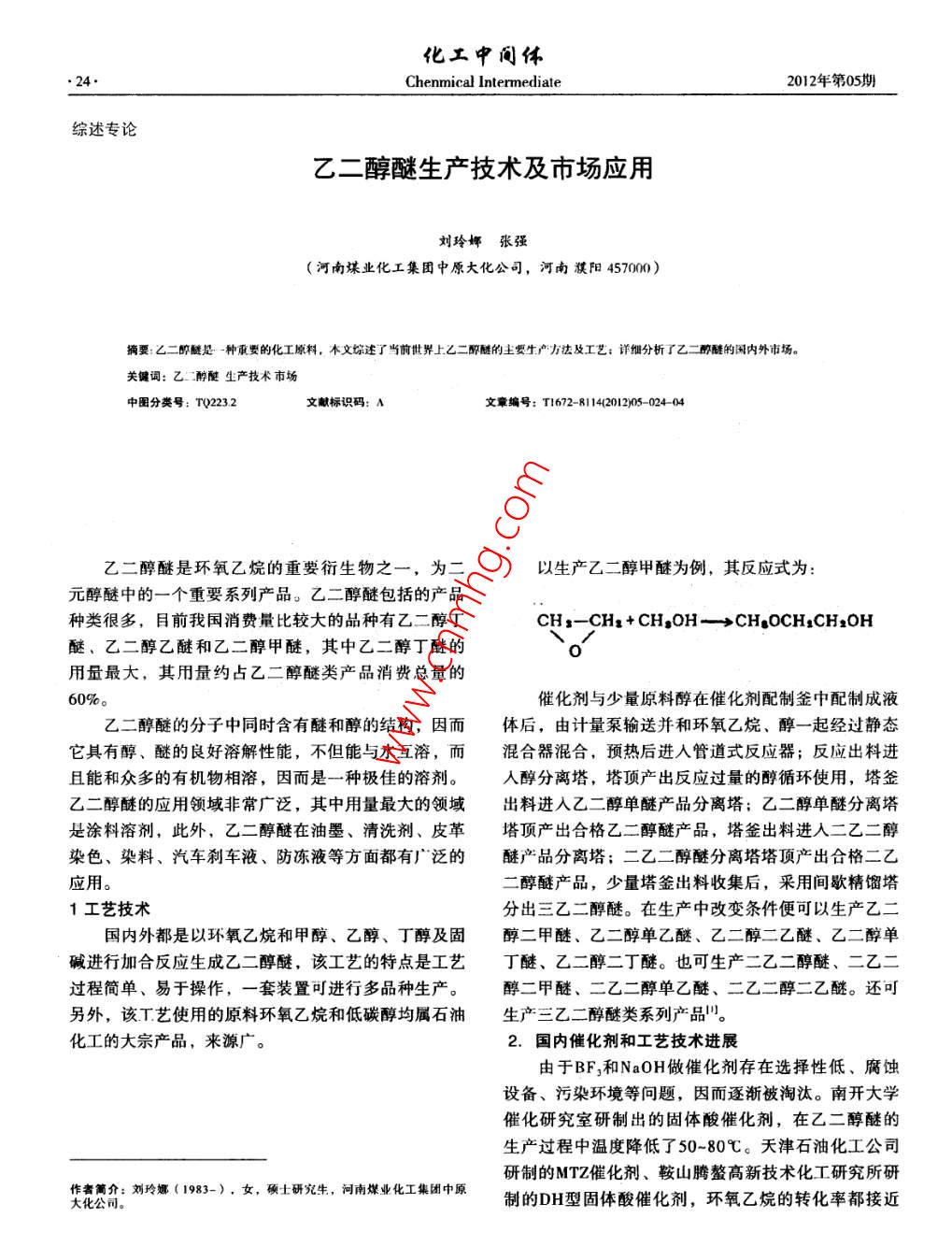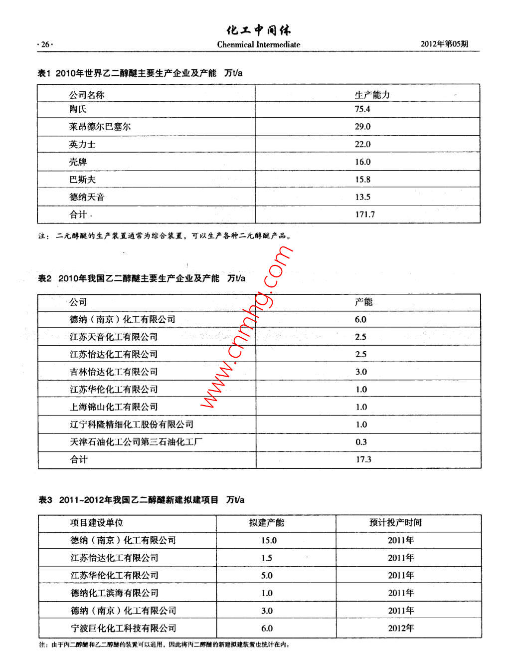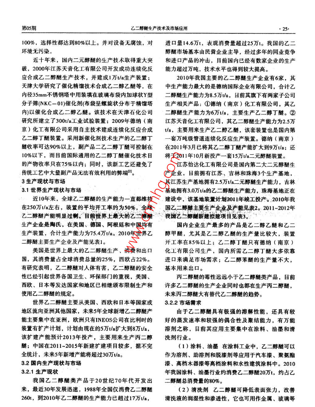 化工中間體24Chenmical Intermediate2012年第05期綜述專論乙二醇醚生產(chǎn)技術及市場應用劉玲娜張強(河南煤業(yè)化工集團中原大化公司,河南濮陽457000輛要:乙二醉醚是-種重要的化工原料,本文綜述了當前世界上乙二醉醚的主要生產(chǎn)方法及工藝;詳細分析了乙二醉醚的國內(nèi)外市場關鍵詞:乙醉酸生產(chǎn)技術市場中圖分類號:TQ223文章編號:T672-8114(201205-02404乙二醇醚是環(huán)氧乙烷的重要衍生物之一,為二以生產(chǎn)乙二醇甲醚為例,其反應式為元醇醚中的一個重要系列產(chǎn)品。乙二醇醚包括的產(chǎn)品種類很多,目前我國消費量比較大的品種有乙二醇丁cH-CH+CH3OH→ CHOCH CH生OH醚、乙二醇乙醚和乙二醇甲醚,其中乙二醇丁醚的用量最大,其用量約占乙二醇醚類產(chǎn)品消費總量的催化劑與少量原料醇在催化劑配制釜中配制成液乙二醇醚的分子中同時含有醚和醇的結構,因而體后,由計量泵輸送并和環(huán)氧乙烷、醇一起經(jīng)過靜態(tài)它具有醇、醚的良好溶解性能,不但能與水互溶,而混合器混合,預熱后進入管道式反應器;反應出料進且能和眾多的有機物相溶,因而是一種極佳的溶劑。人醇分離塔,塔頂產(chǎn)出反應過量的醇循環(huán)使用,塔釜乙二醇醚的應用領域非常廣泛,其中用量最大的領域出料進入乙二醇單醚產(chǎn)品分離塔;乙二醇單醚分離塔是涂料溶劑,此外,乙二醇醚在油墨、清洗劑、皮革塔頂產(chǎn)出合格乙二醇醚產(chǎn)品,塔釜出料進入二乙二醇染色、染料、汽車剎車液、防凍液等方面都有廣泛的醚產(chǎn)品分離塔;二乙二醇醚分離塔塔頂產(chǎn)出合格二乙應用。二醇醚產(chǎn)品,少量塔釜出料收集后,采用間歇精餾塔1工藝技術分出三乙二醇醚。在生產(chǎn)中改變條件便可以生產(chǎn)乙二國內(nèi)外都是以環(huán)氧乙烷和甲醇、乙醇、丁醇及固醇二甲醚、乙二醇單乙醚、乙二醇二乙醚、乙二醇單堿進行加合反應生成乙二醇醚,該工藝的特點是工藝丁醚、乙二醇二丁醚。也可生產(chǎn)二乙二醇醚、二乙二過程簡單、易于操作,一套裝置可進行多品種生產(chǎn)。醇二甲醚、二乙二醇單乙醚、二乙二醇二乙醚。還可另外,該工藝使用的原料環(huán)氧乙烷和低碳醇均屬石油生產(chǎn)三乙二醇醚類系列產(chǎn)品。化工的大宗產(chǎn)品,來源廣。2.國內(nèi)催化劑和工藝技術進展由于BF3和NaOH做催化劑存在選擇性低、腐蝕設備、污染環(huán)境等問題,因而逐漸被淘汰。南開大學催化研究室研制出的固體酸催化劑,在乙二醇醚的生產(chǎn)過程中溫度降低了50-80℃。天津石油化工公司研制的MTZ催化劑、鞍山騰螯高新技術化工研究所研作者簡介:劉玲娜(1983-),女,碩士研究生,河南煤業(yè)化工集團中原制的DH型固體酸催化劑,環(huán)氧乙烷的轉化率都接近大化公司。第05期乙二醇醚生產(chǎn)技術及市場應用5100%,選擇性都達到80%以上。并對設備無腐蝕,對進口量146萬t,表觀消費量超過25萬1。我國的乙二環(huán)境無污染醇醚市場基本由民營企業(yè)主導,經(jīng)過多年的同業(yè)競爭近十年來,國內(nèi)二元醇醚的生產(chǎn)技術取得重大突和進口產(chǎn)品的沖擊,目前國內(nèi)已經(jīng)有數(shù)家企業(yè)的生產(chǎn)破,2000年江蘇天音化工有限公司開發(fā)成功連續(xù)化反能力超過萬噸,技術水平也得到較大提高。應合成乙二醇醚生產(chǎn)技術,并建成1萬ta生產(chǎn)裝置;2010年我國主要的乙二醇醚生產(chǎn)企業(yè)有6家,其天津大學研究了催化精餾技術合成乙二醇乙醚等,在中生產(chǎn)能力最大的是德納國際企業(yè)有限公司,合計乙內(nèi)徑35mm不銹鋼塔中用裝填在玻璃布袋內(nèi)加球狀Y型二醇醚生產(chǎn)能力為85萬a,目前其旗下有兩家子公司分子篩(NKC-01)催化劑布袋呈螺旋狀分布于精餾塔生產(chǎn)相關產(chǎn)品:①德納(南京)化工有限公司,其乙內(nèi)以催化合成乙二醇乙醚。該技術在天津石化公司二醇醚生產(chǎn)能力為6萬咖a,主要生產(chǎn)乙二醇丁醚。②研究所建立了300a工業(yè)試驗裝置;2009年德納(南江蘇天音化工有限公司,其乙二醇醚生產(chǎn)能力為25萬京)化工有限公司采用自主技術建成連續(xù)化反應合成ta,主要用來生產(chǎn)乙二醇乙醚,該套裝置也是國內(nèi)第乙二醇丁醚裝置。采用新催化劑技術生產(chǎn)的乙二醇丁套萬噸級管道連續(xù)化反應生產(chǎn)裝置。德納(南京)醚收率可達90%以上,副產(chǎn)品二乙二醇丁醚可控制在在2011年3月已將其乙二醇丁醚產(chǎn)能擴大到9萬ta;還10%以下,而目前國際通用的乙二醇丁醚催化技術目將于2011年10月新投產(chǎn)一套15萬ua二元醇醚裝置的產(chǎn)物收率只在75%以內(nèi);同時,該新工藝還避免了江蘇怡達化工有限公司是國內(nèi)第二大二元醇醚生傳統(tǒng)工藝中大量副產(chǎn)品無法有效利用的弊端{。產(chǎn)企業(yè),目前擁有江蘇、吉林和珠海3個生產(chǎn)基地3生產(chǎn)現(xiàn)狀與市場其江蘇生產(chǎn)基地擁有25萬ta二元醇醚生產(chǎn)能力,吉林31世界生產(chǎn)現(xiàn)狀與市場基地擁有30萬ta的乙二醇醚生產(chǎn)能力,珠?;卣诮?0年來,全球乙二醇醚的生產(chǎn)能力一直都維持建設中,該基地裝置計劃201年峻工投產(chǎn)。2010年我在250萬a左右,裝置的平均開工率約為50%,全球國乙二醇酷主要生產(chǎn)企業(yè)及產(chǎn)能見表2020112012年乙二醇醚產(chǎn)能明顯